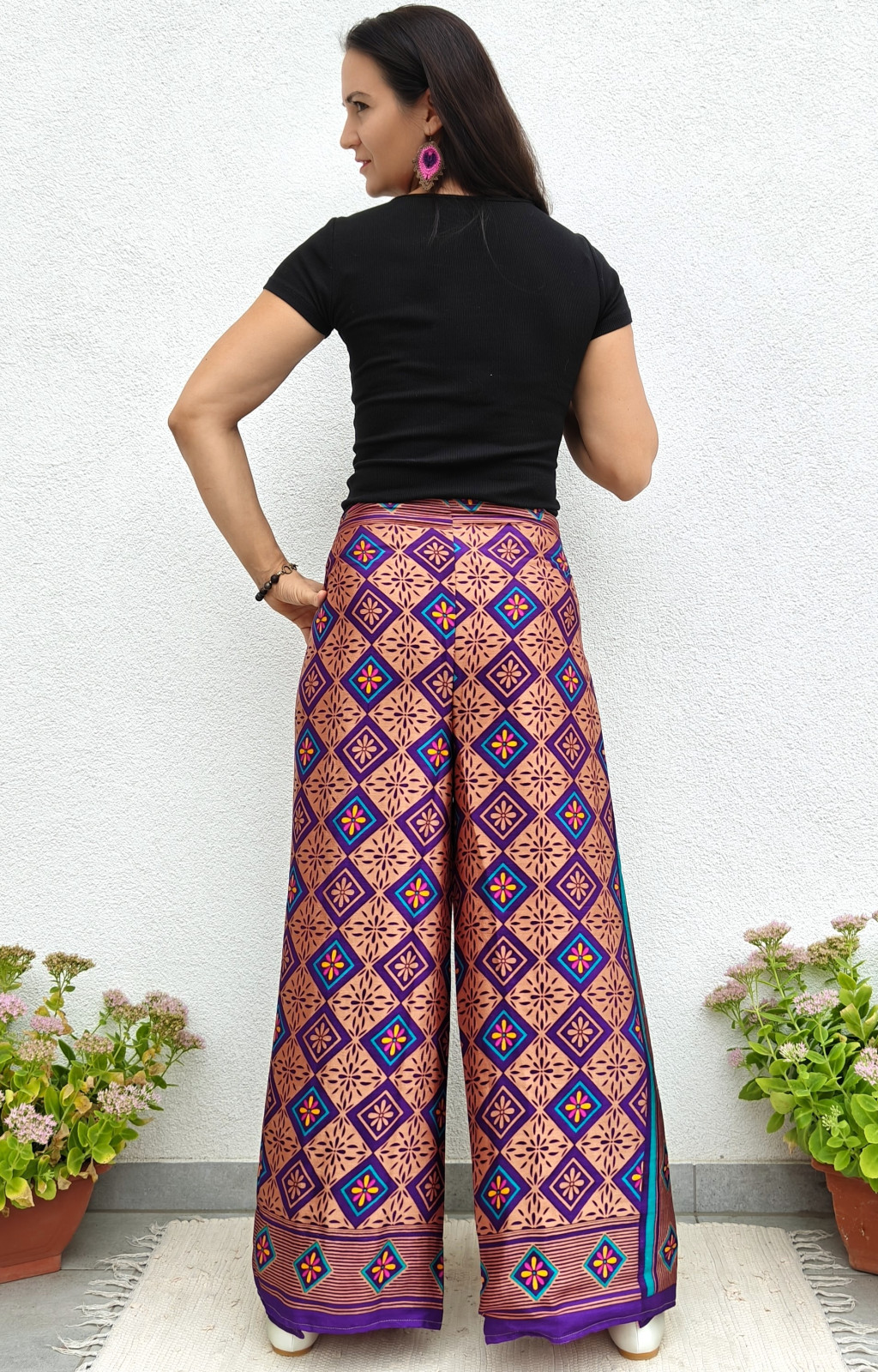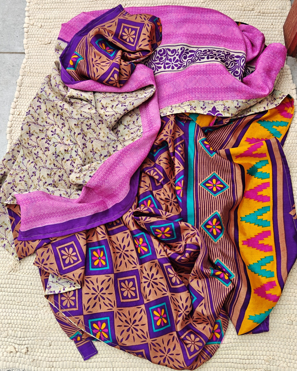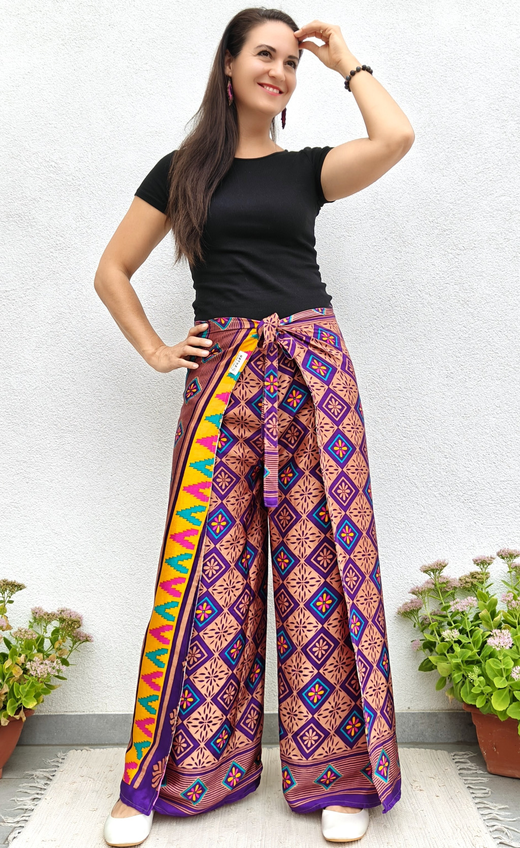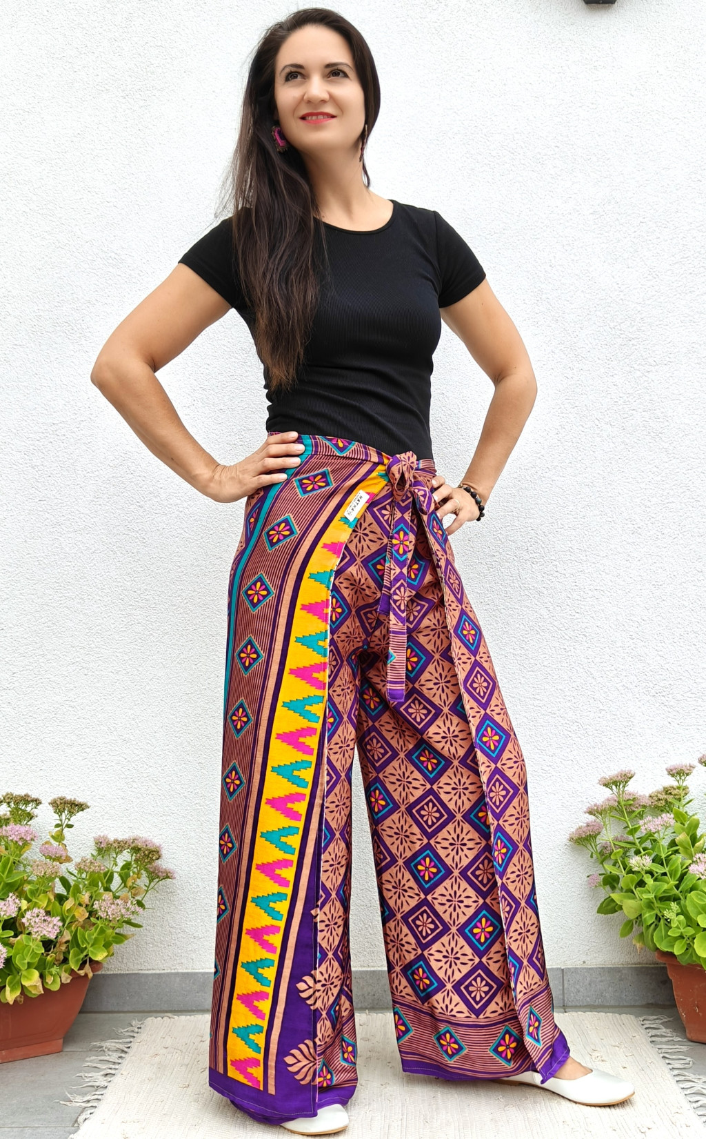 Lapnadrágjaink újrahasznosított szárikból készülnek Indiában. Két különböző csodás anyagot varrnak össze, így a külső és belső fele is hordható!