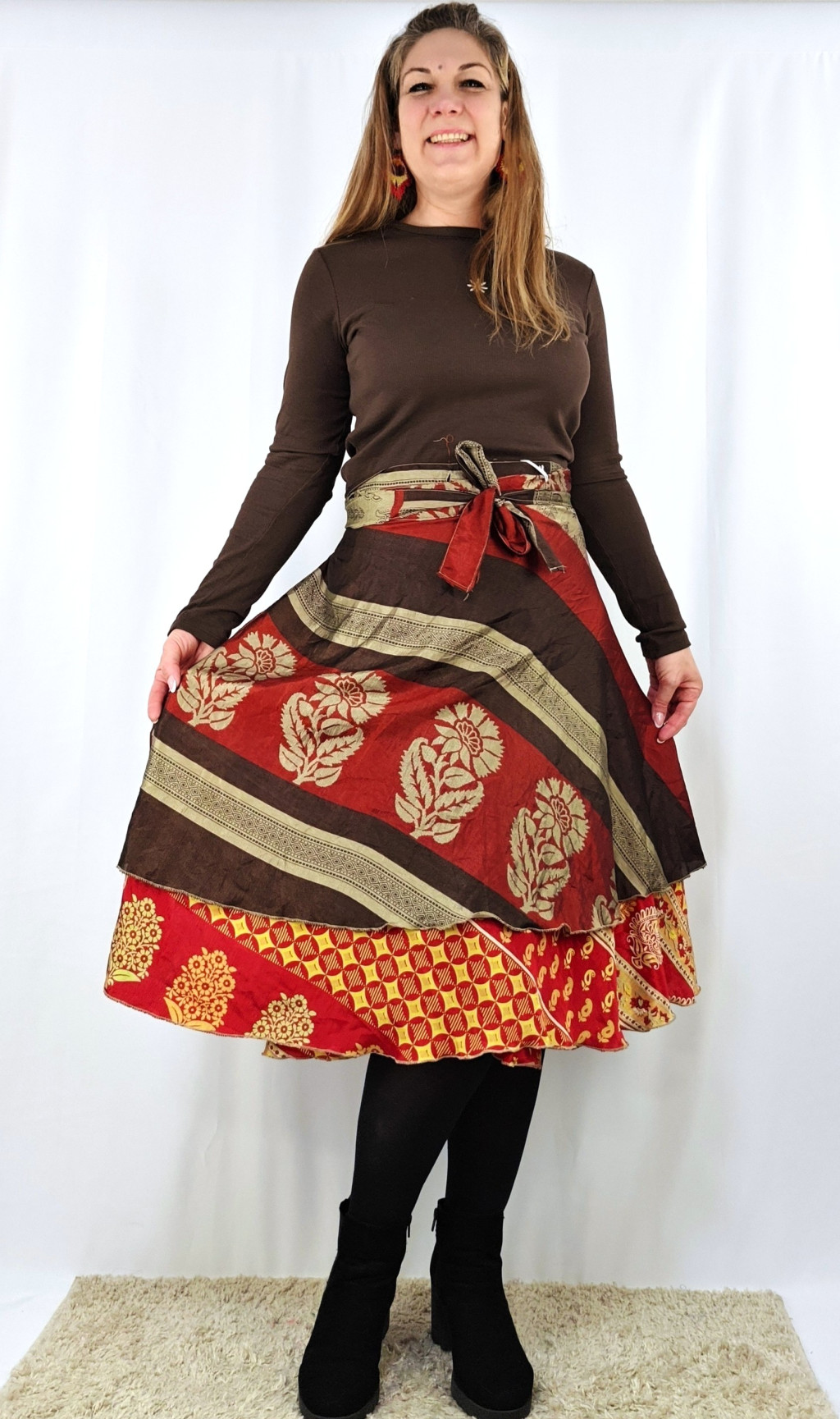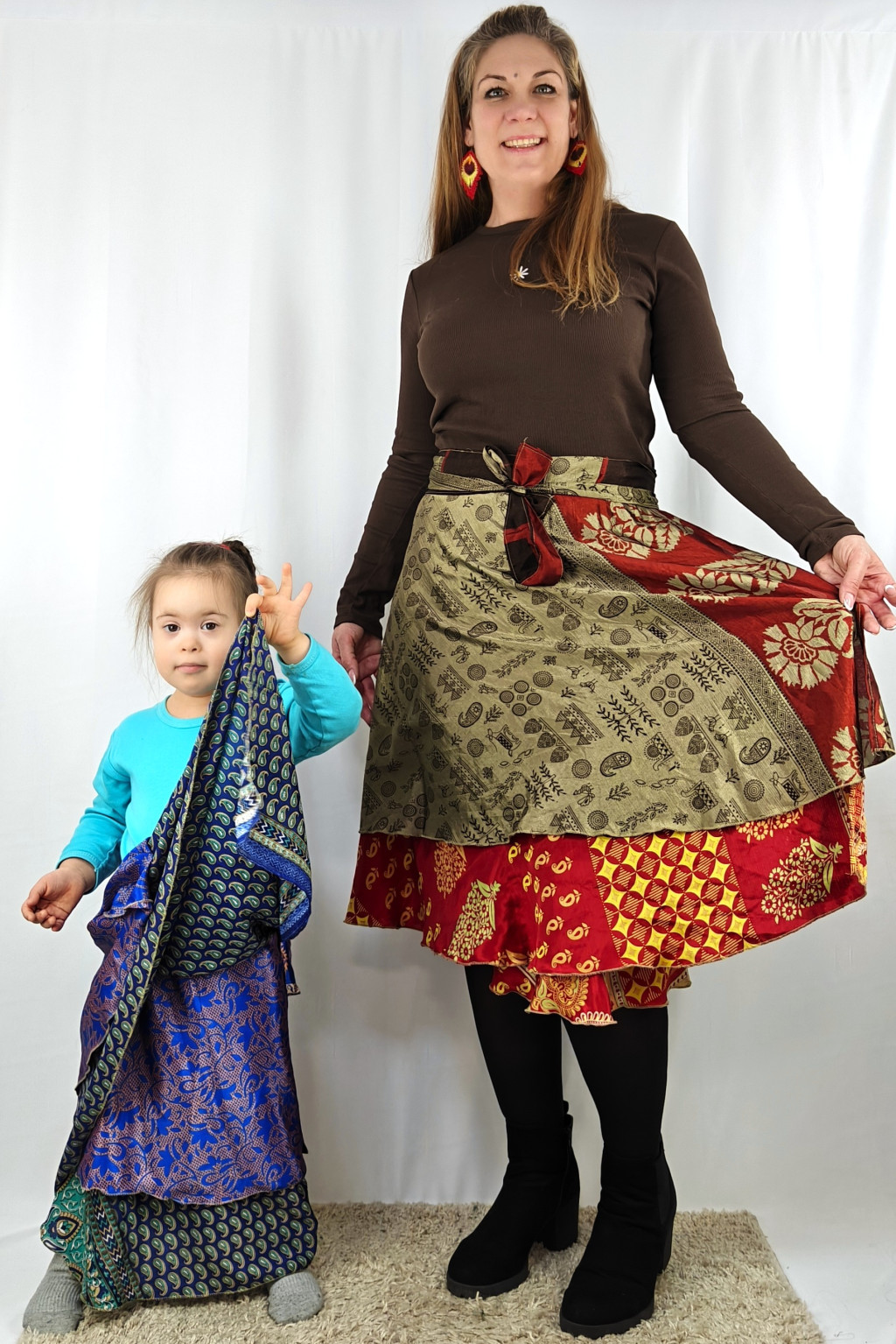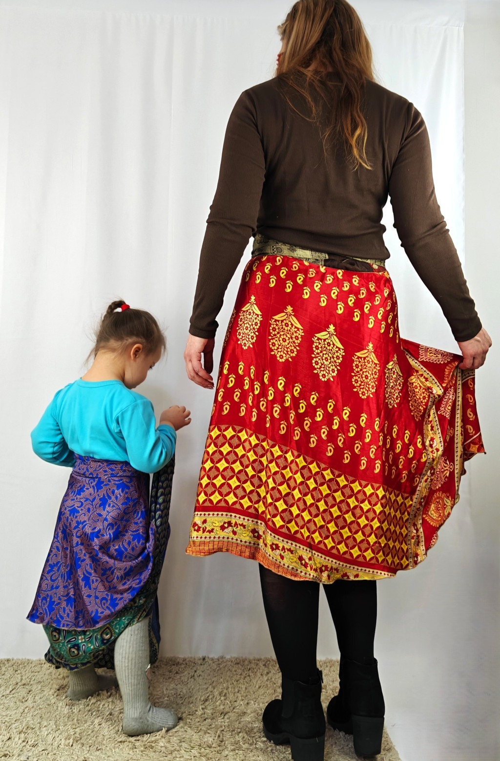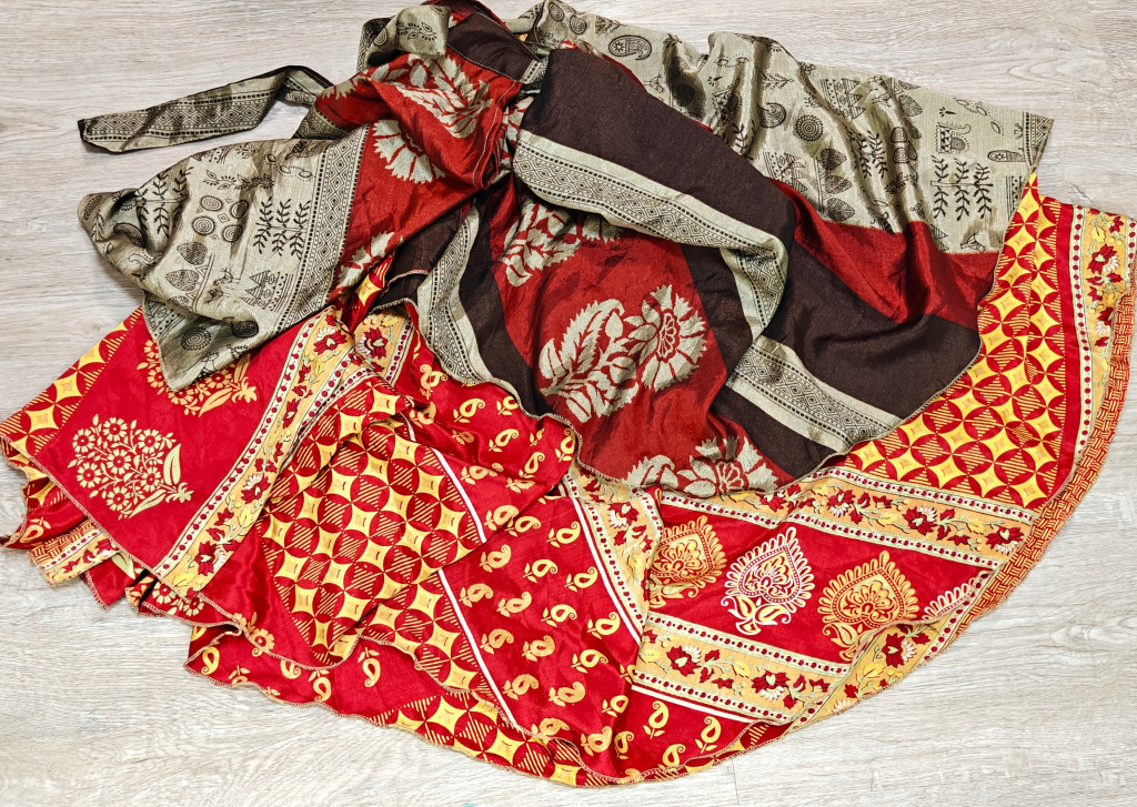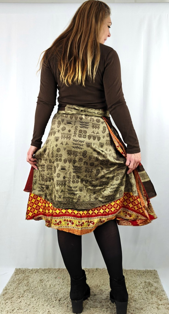 Lapszoknyáink újrahasznosított szárikból készülnek Indiában, egy hosszabb és egy rövidebb anyag derékban összevarrva! Két oldalú, kifordítható, mindkét oldala hordható, sokféleképpen köthető, variálható. Szoknyáinkból nincs két egyforma, mindegyikből csak EGY darab van, ha megtetszik, csapj le rá!