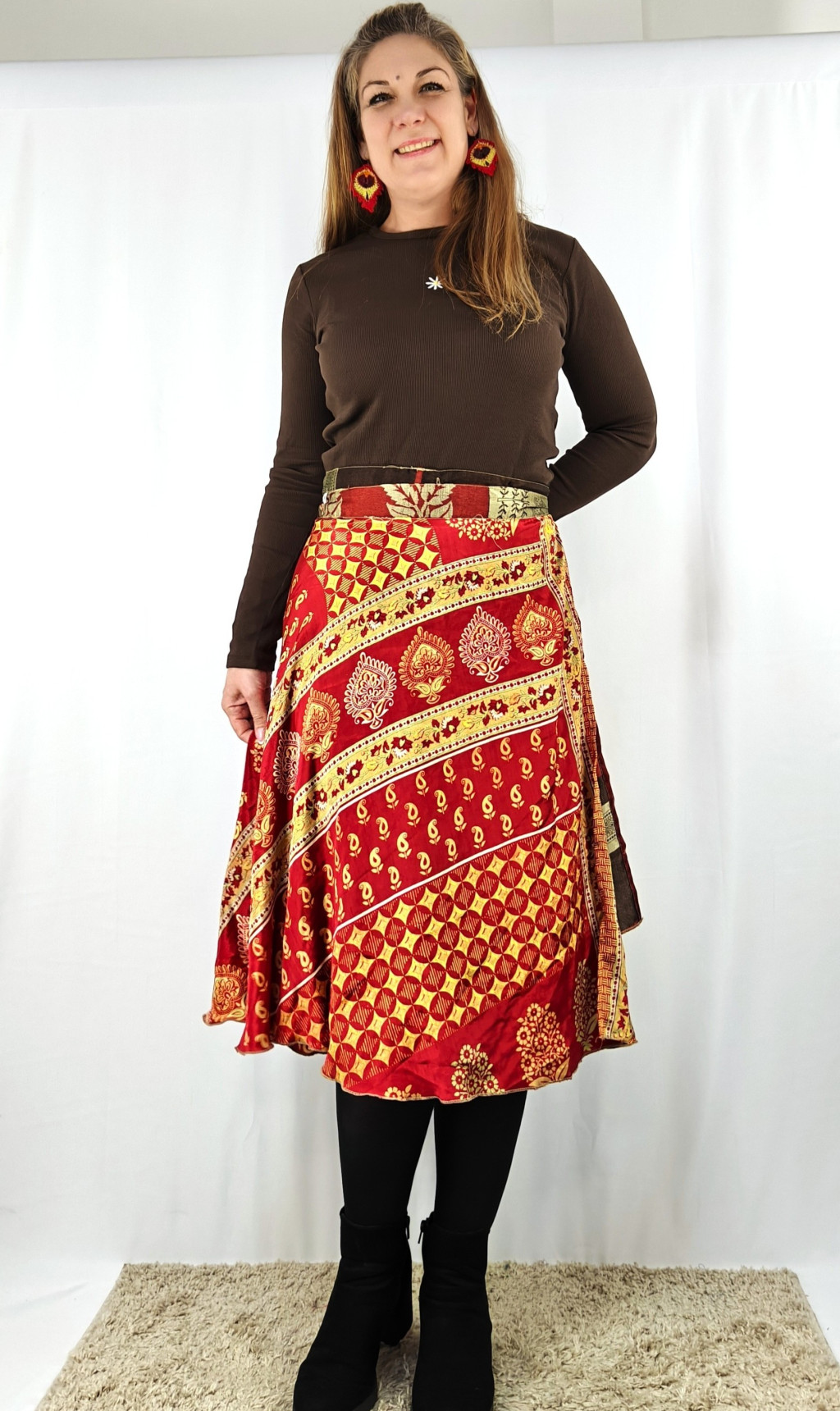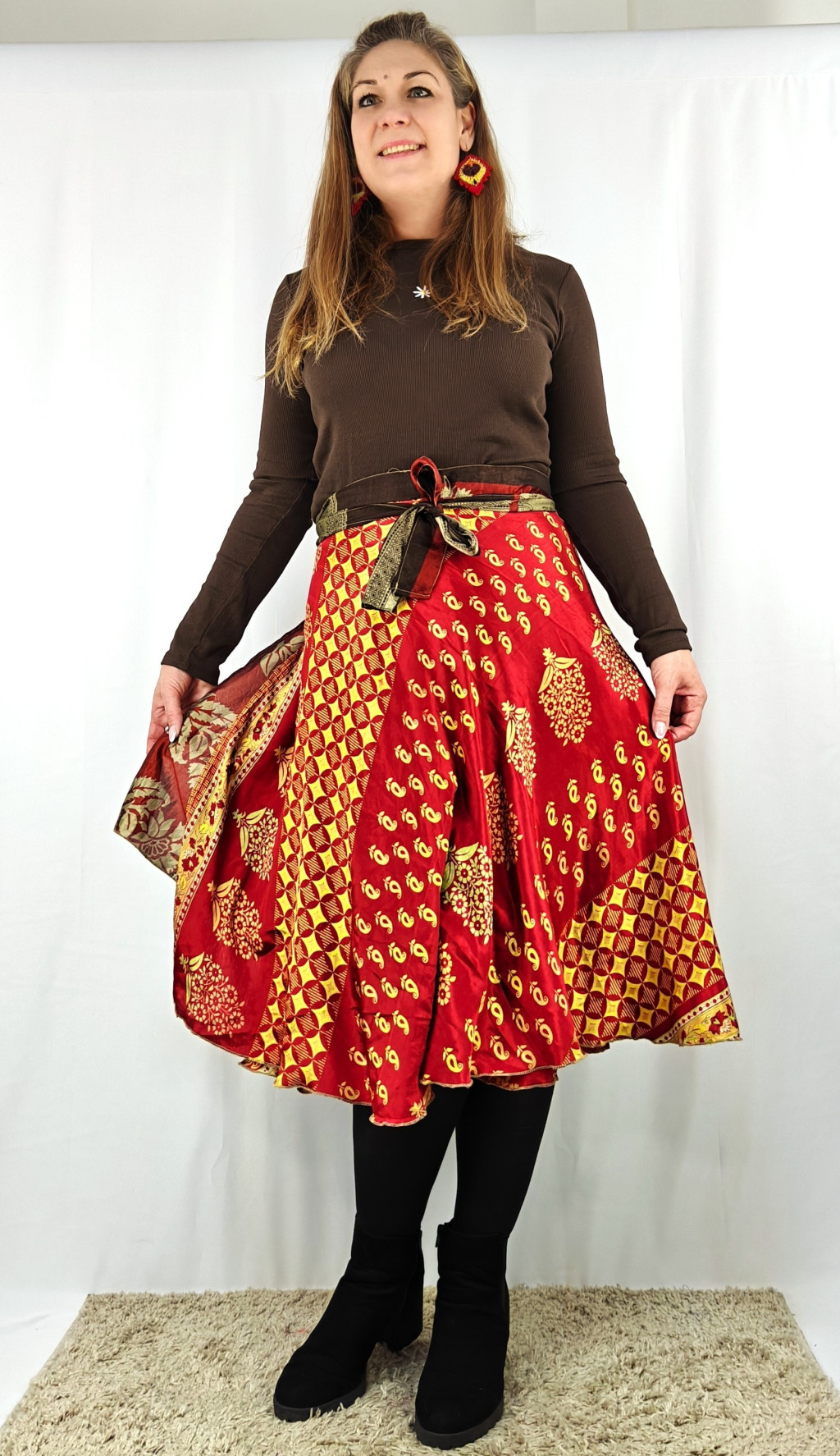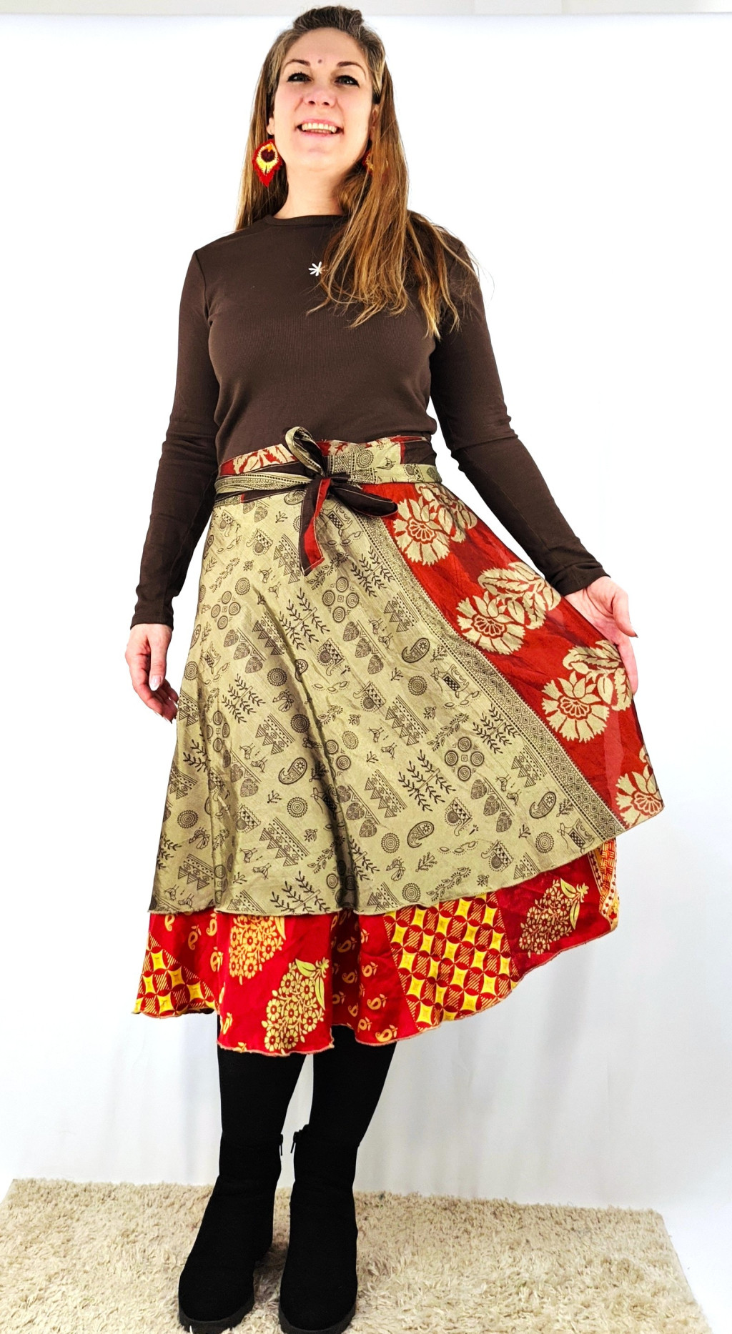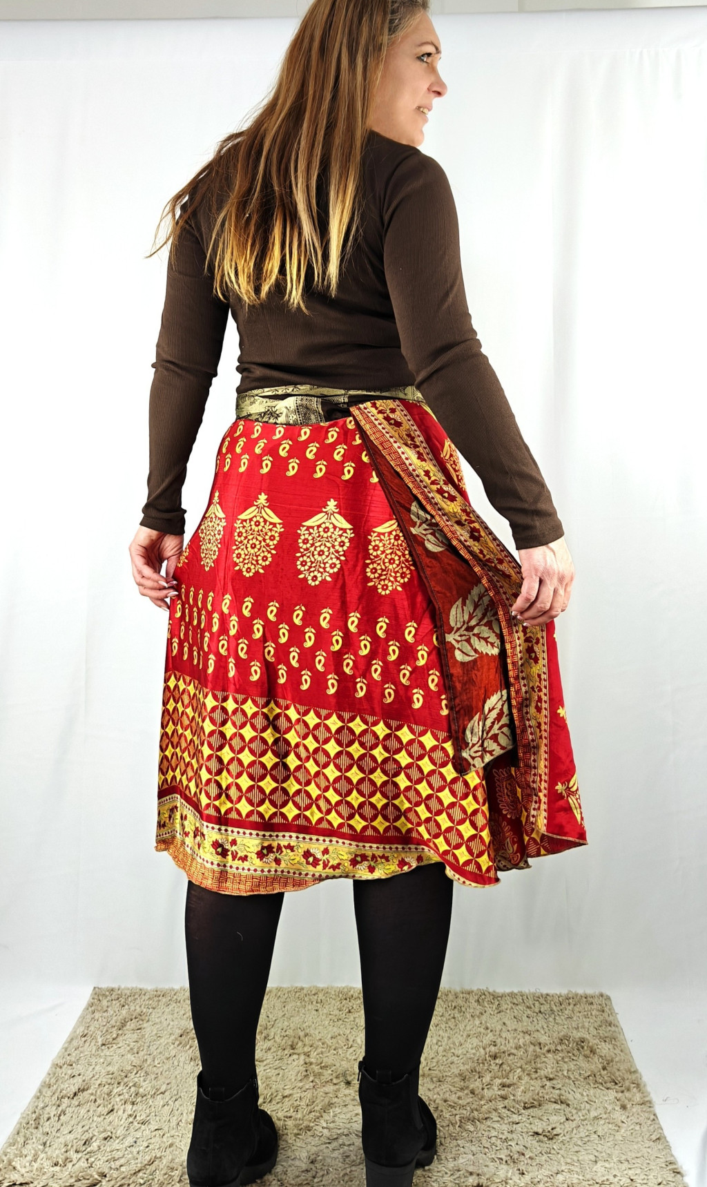 Lapszoknyáink újrahasznosított szárikból készülnek Indiában, egy hosszabb és egy rövidebb anyag derékban összevarrva! Két oldalú, kifordítható, mindkét oldala hordható, sokféleképpen köthető, variálható. Szoknyáinkból nincs két egyforma, mindegyikből csak EGY darab van, ha megtetszik, csapj le rá!