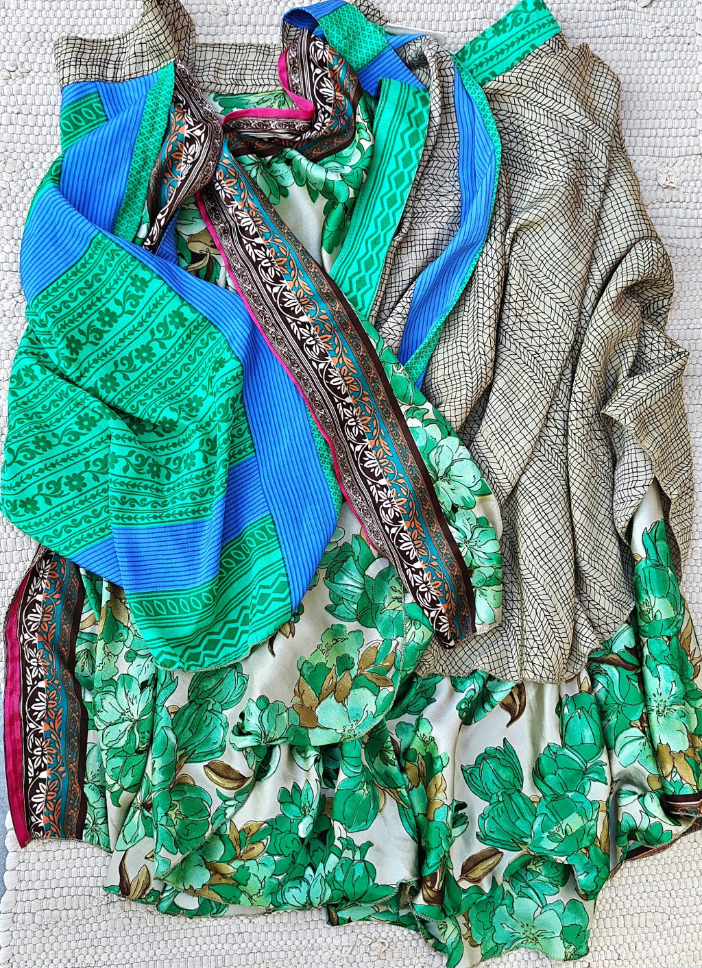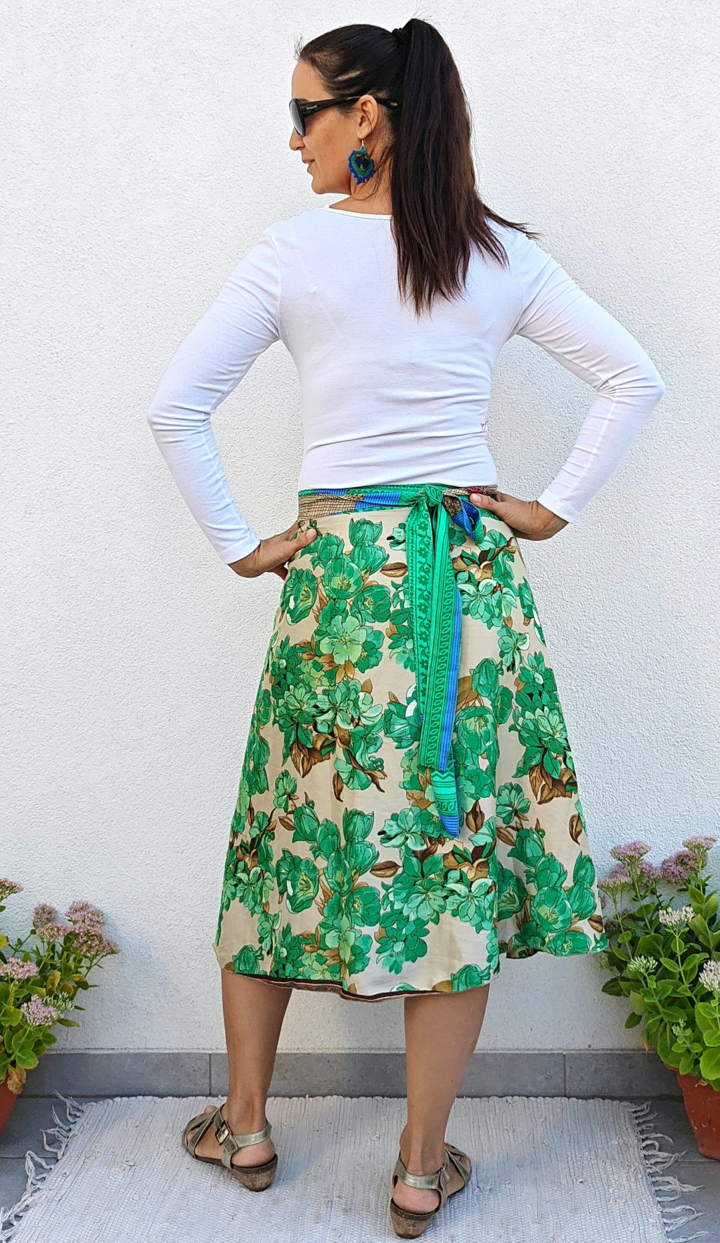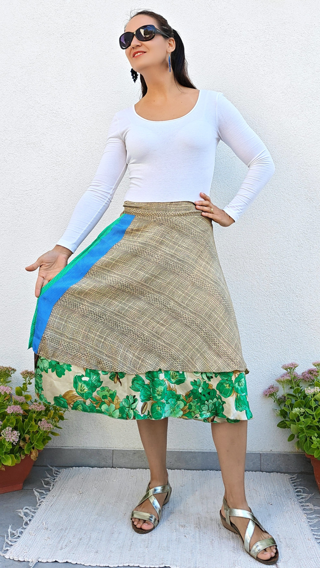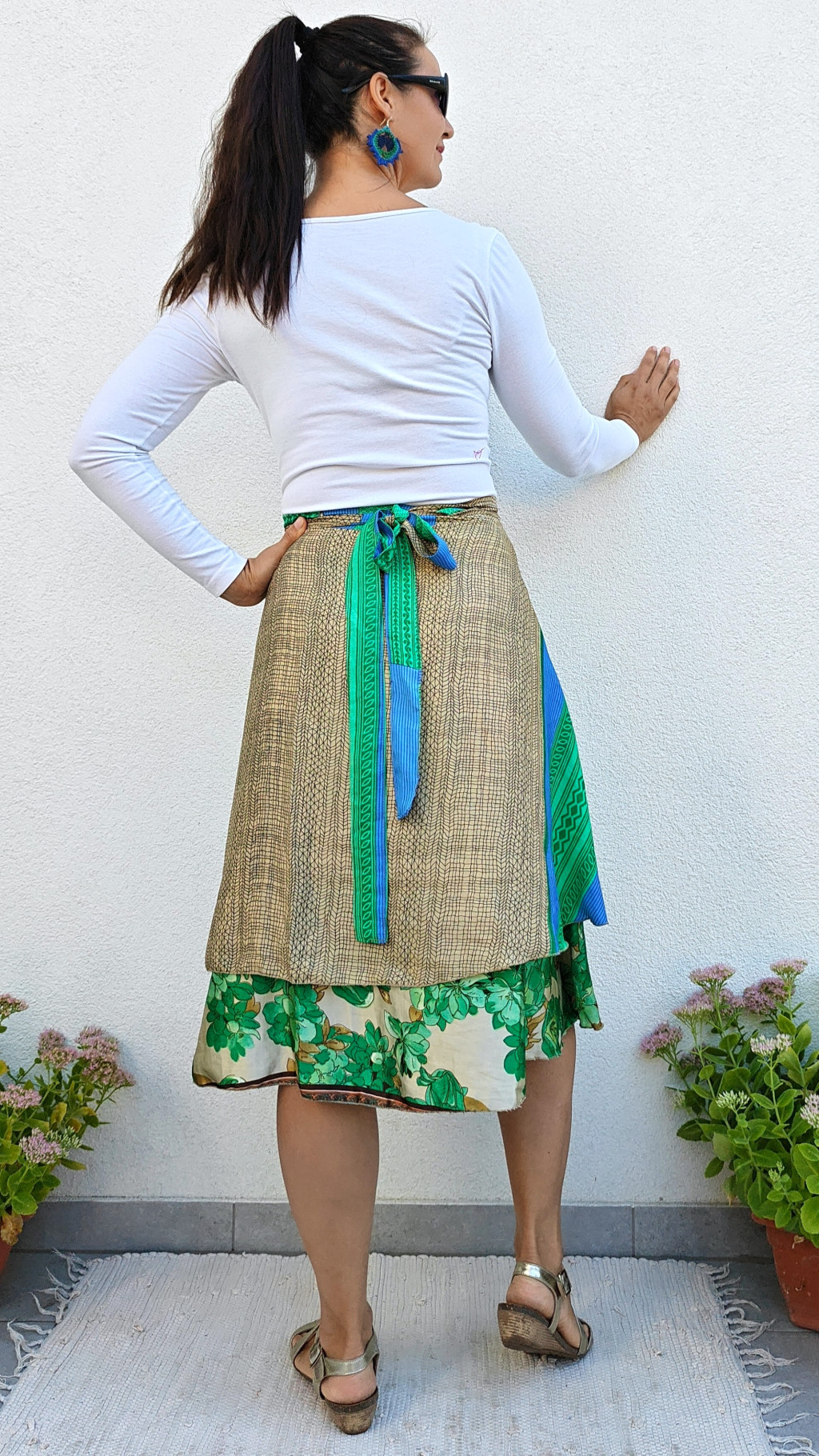 Lapszoknyáink újrahasznosított szárikból készülnek Indiában, egy hosszabb és egy rövidebb anyag derékban összevarrva! Két oldalú, kifordítható, mindkét oldala hordható, sokféleképpen köthető, variálható. Szoknyáinkból nincs két egyforma, mindegyikből csak EGY darab van, ha megtetszik, csapj le rá!