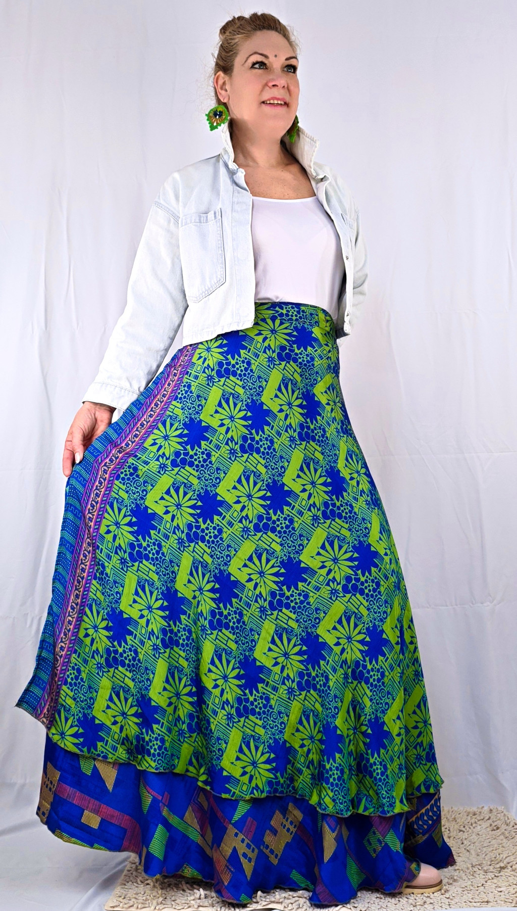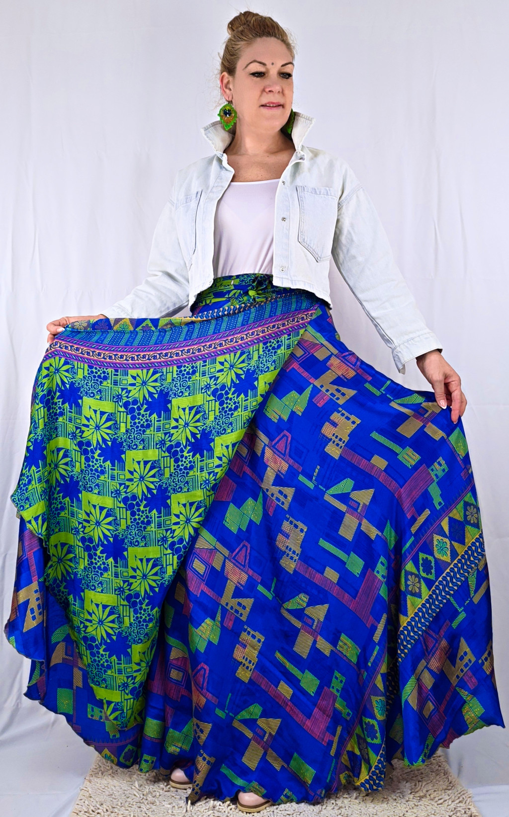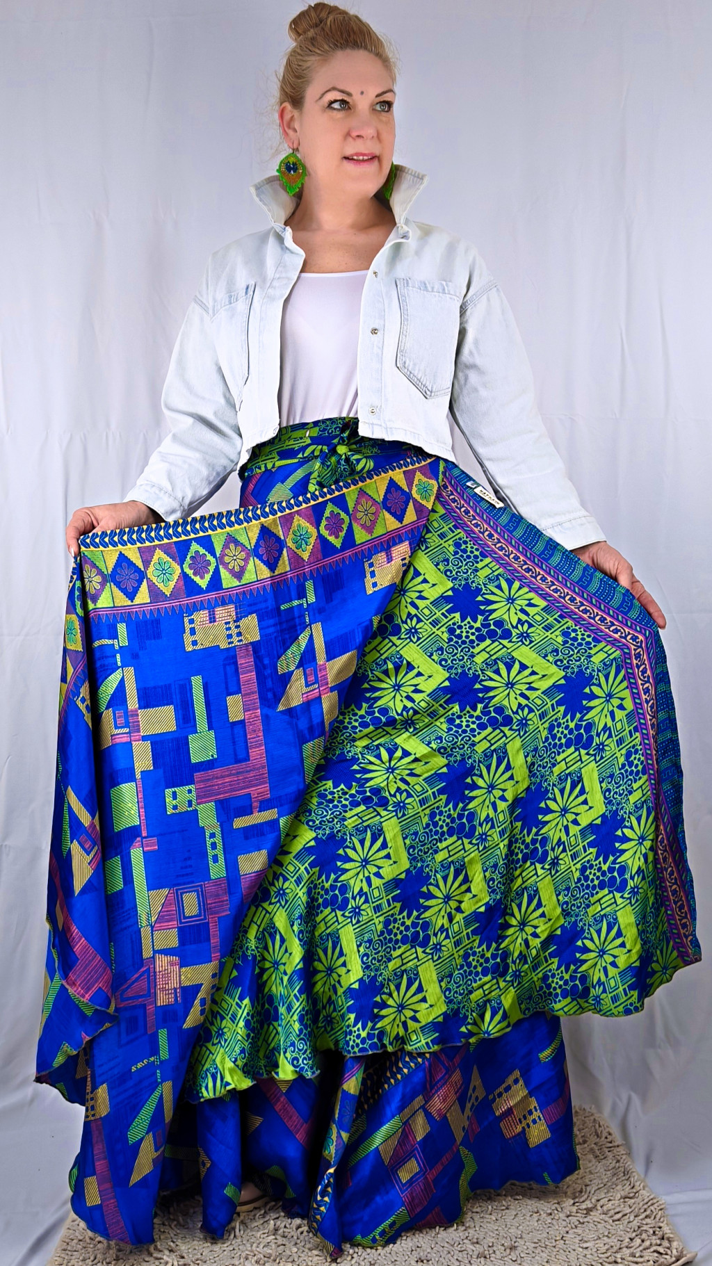 Lapszoknyáink újrahasznosított szárikból készülnek Indiában, egy hosszabb és egy rövidebb anyag derékban összevarrva! Két oldalú, kifordítható, mindkét oldala hordható, sokféleképpen köthető, variálható. Szoknyáinkból nincs két egyforma, mindegyikből csak EGY darab van, ha megtetszik, csapj le rá!