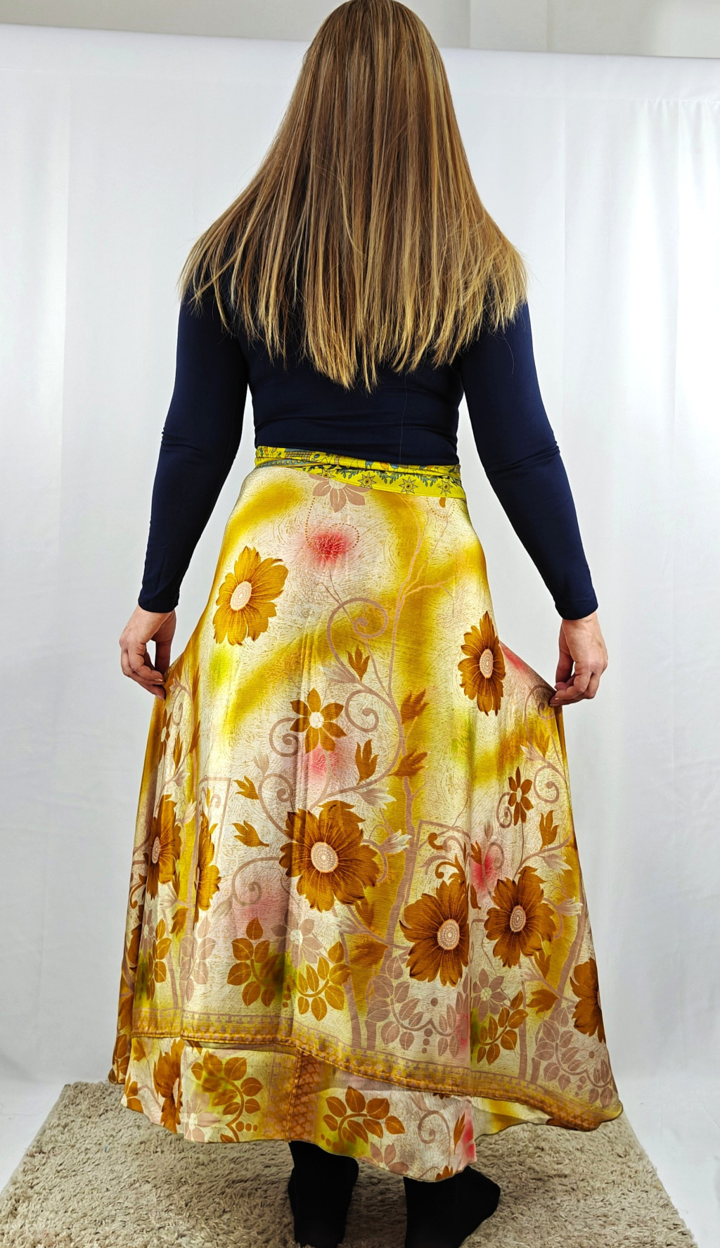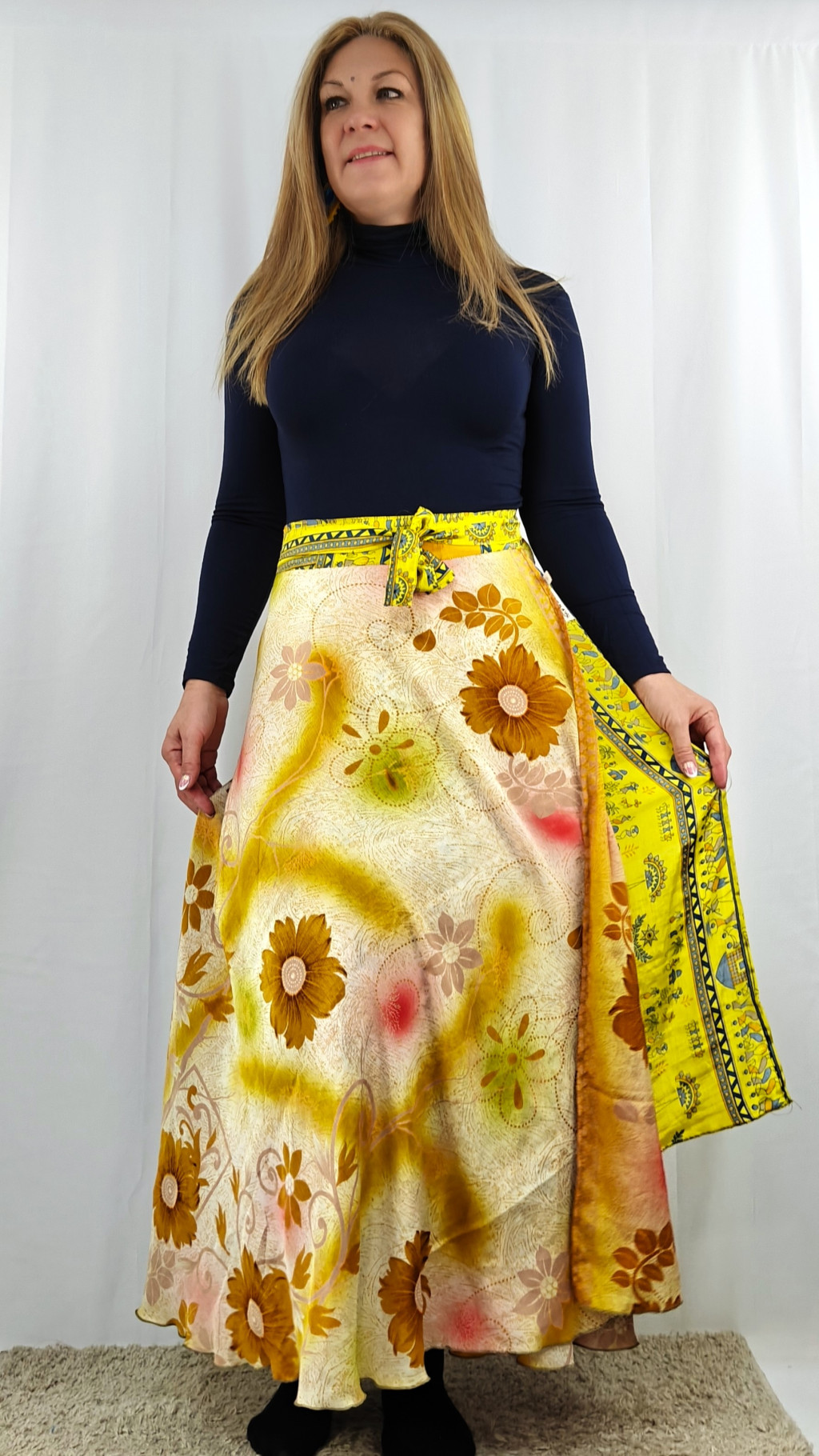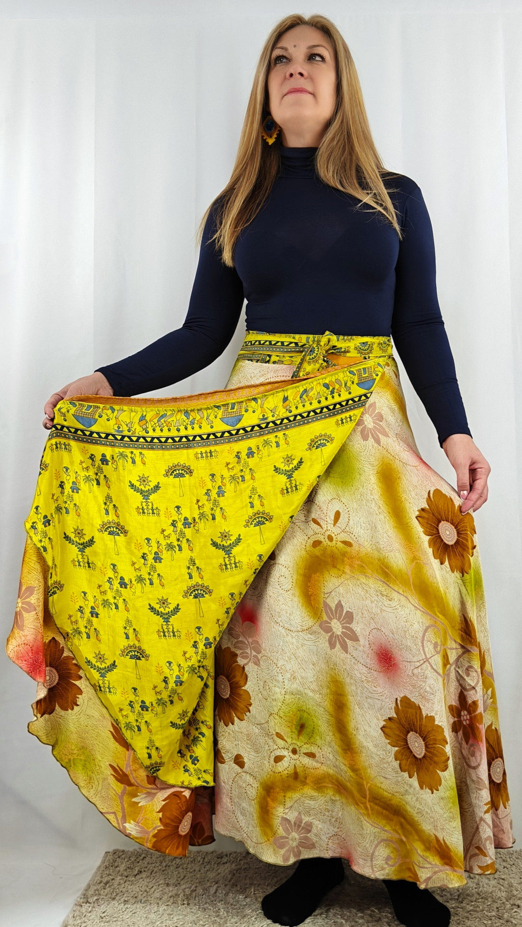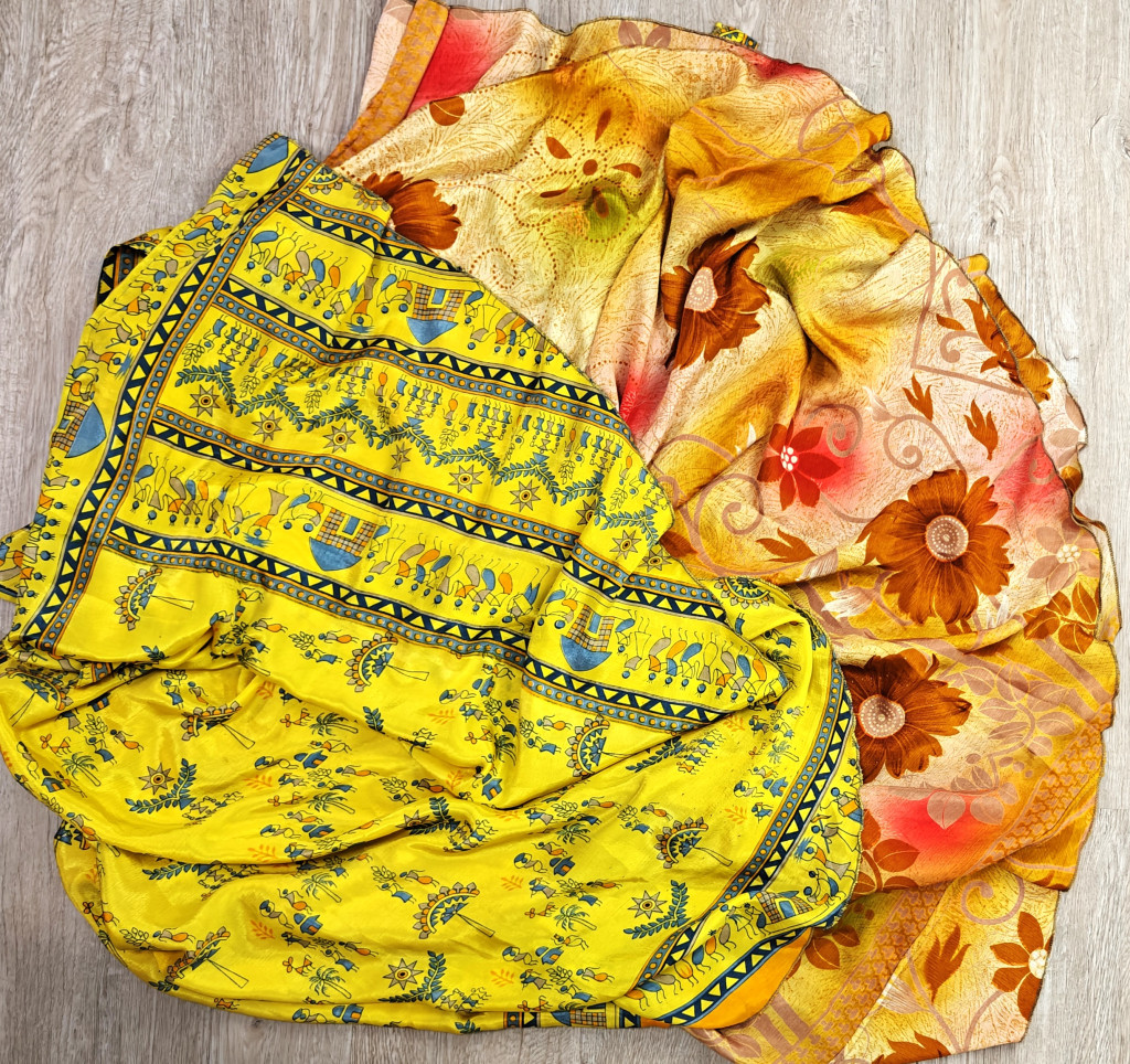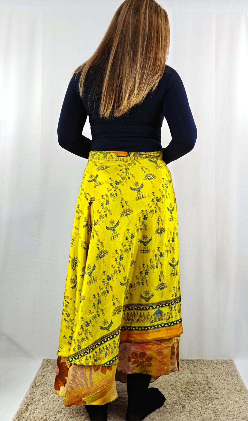 Lapszoknyáink újrahasznosított szárikból készülnek Indiában, egy hosszabb és egy rövidebb anyag derékban összevarrva! Két oldalú, kifordítható, mindkét oldala hordható, sokféleképpen köthető, variálható. Szoknyáinkból nincs két egyforma, mindegyikből csak EGY darab van, ha megtetszik, csapj le rá!