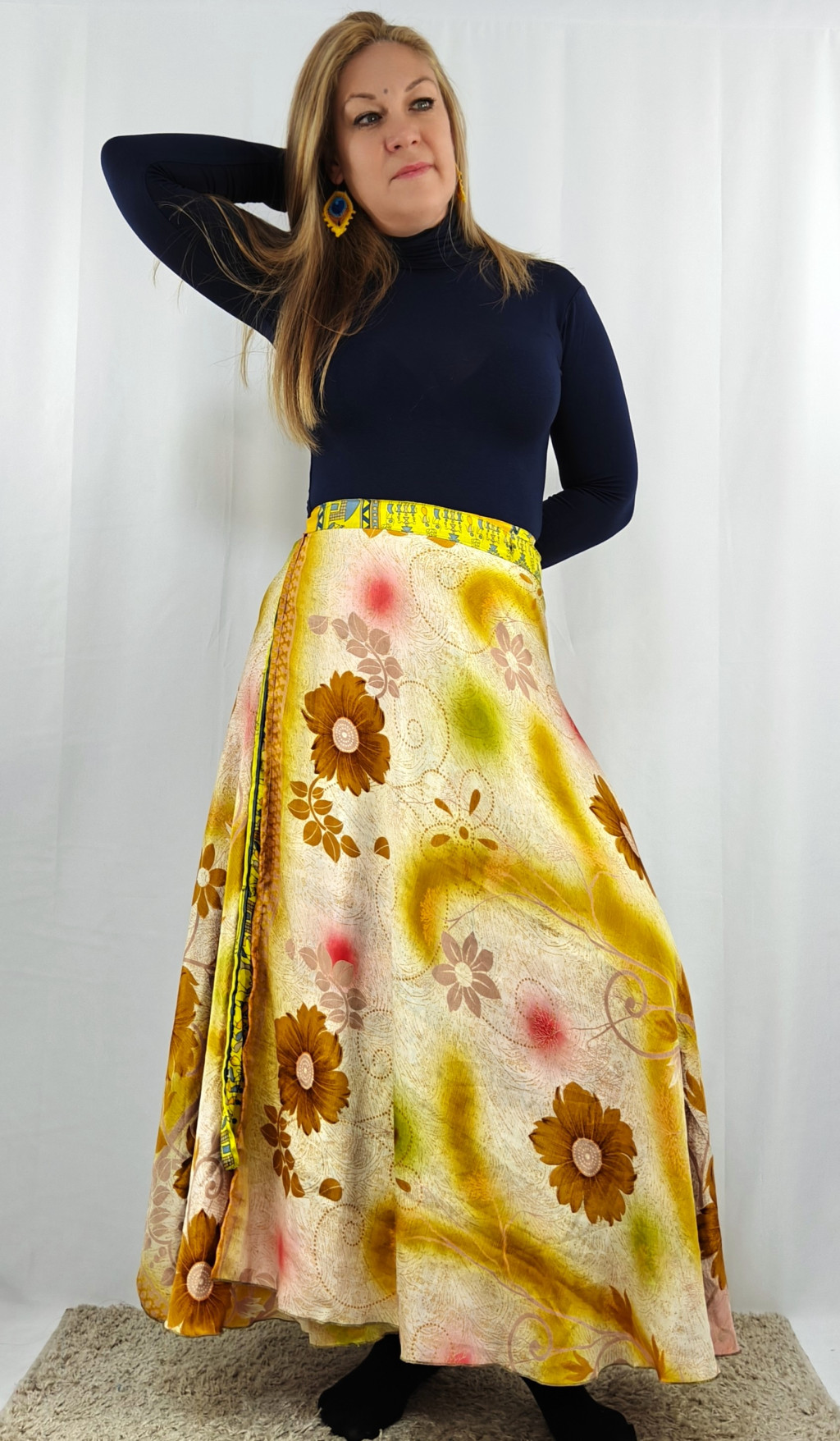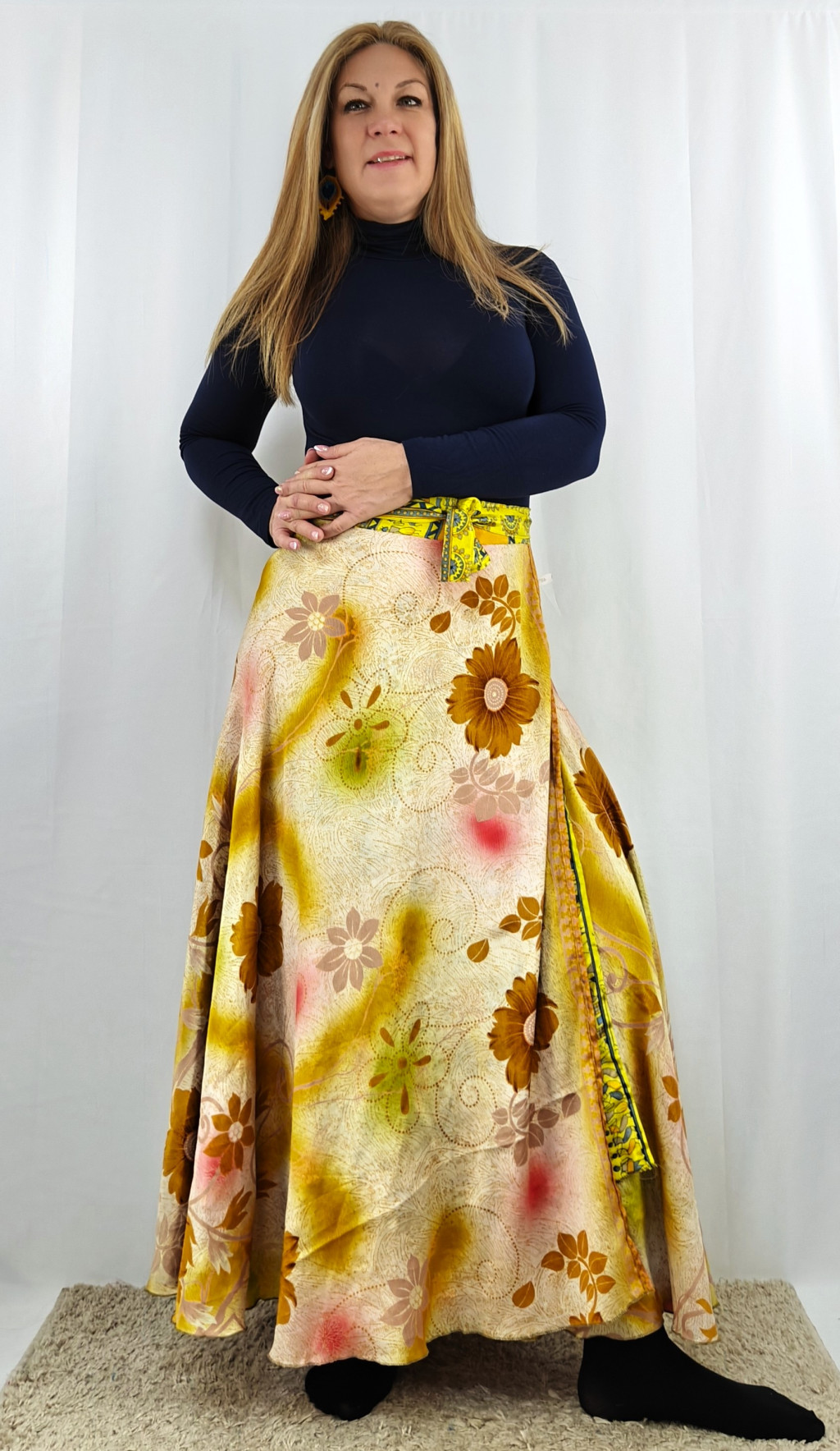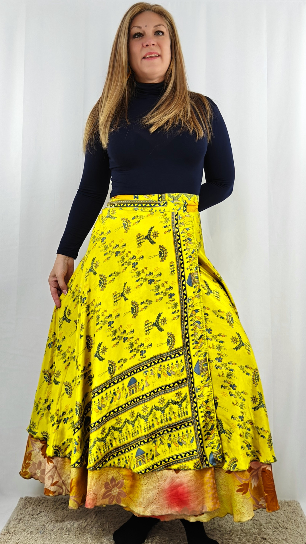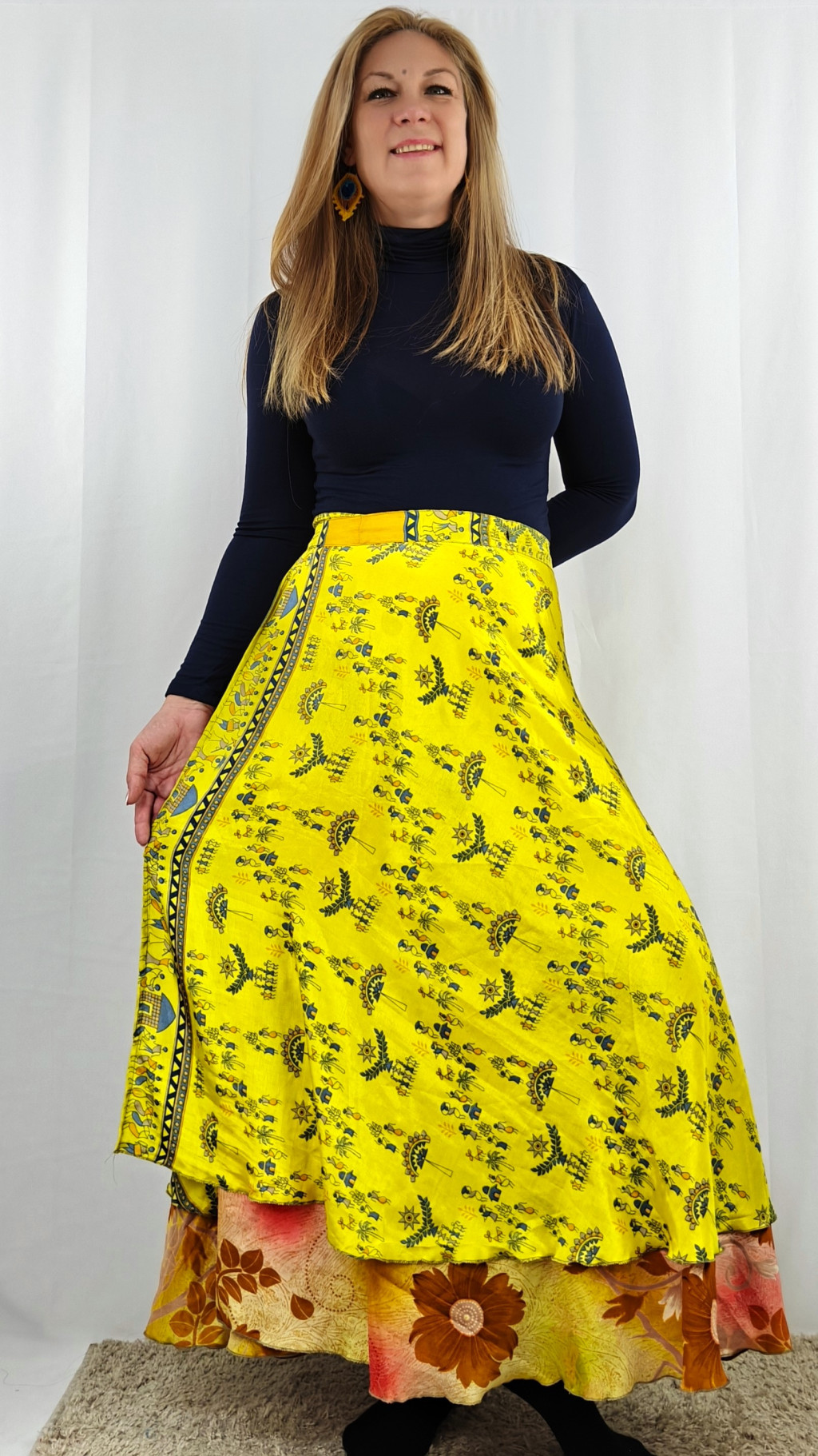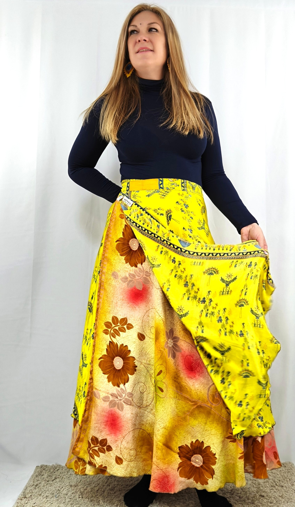 Lapszoknyáink újrahasznosított szárikból készülnek Indiában, egy hosszabb és egy rövidebb anyag derékban összevarrva! Két oldalú, kifordítható, mindkét oldala hordható, sokféleképpen köthető, variálható. Szoknyáinkból nincs két egyforma, mindegyikből csak EGY darab van, ha megtetszik, csapj le rá!