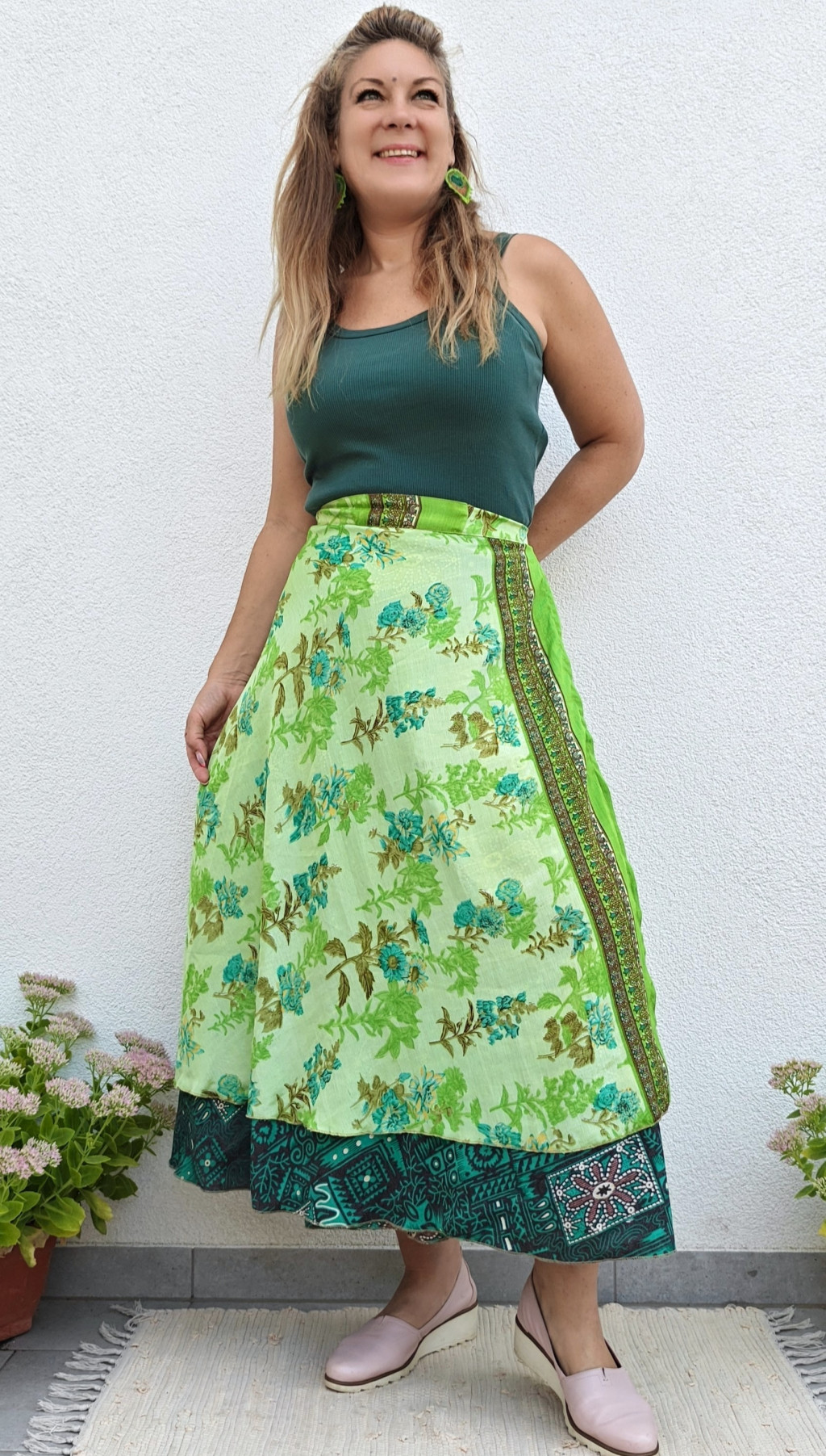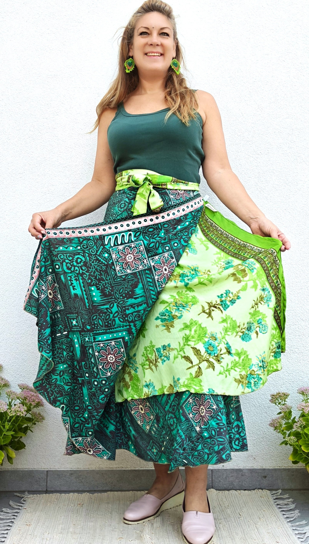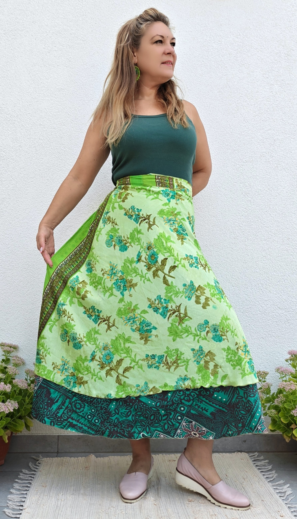 Lapszoknyáink újrahasznosított szárikból készülnek Indiában, egy hosszabb és egy rövidebb anyag derékban összevarrva! Két oldalú, kifordítható, mindkét oldala hordható, sokféleképpen köthető, variálható. Szoknyáinkból nincs két egyforma, mindegyikből csak EGY darab van, ha megtetszik, csapj le rá!