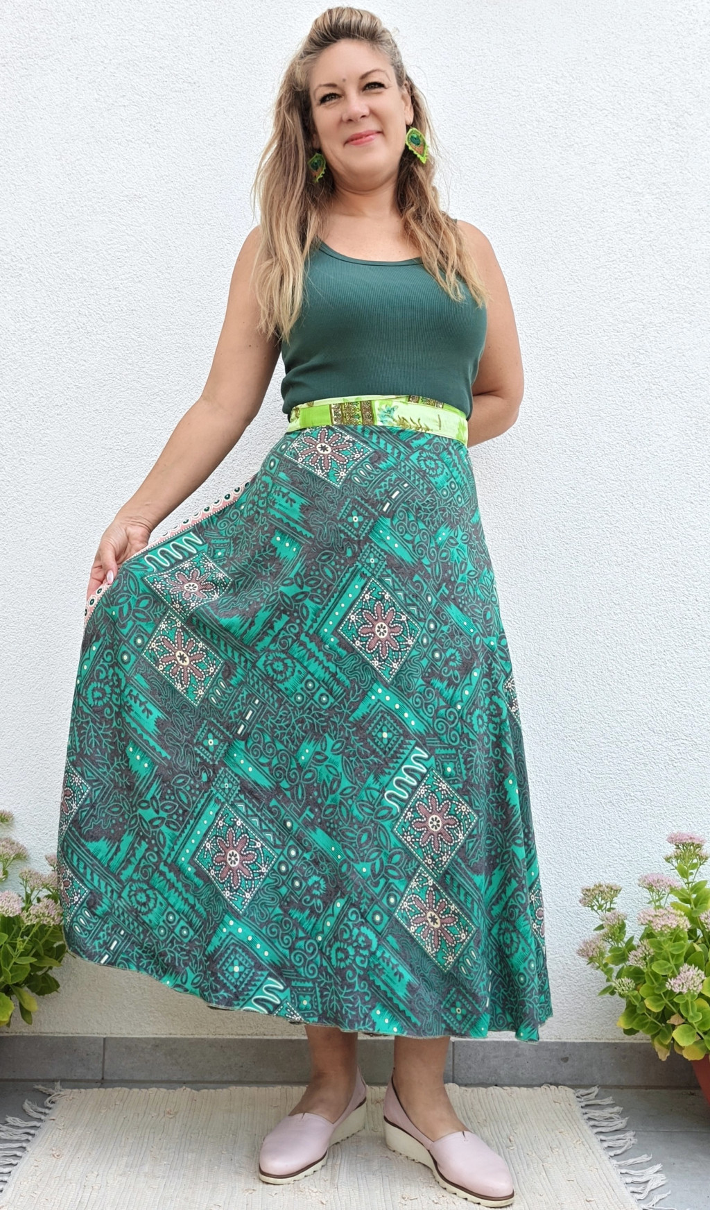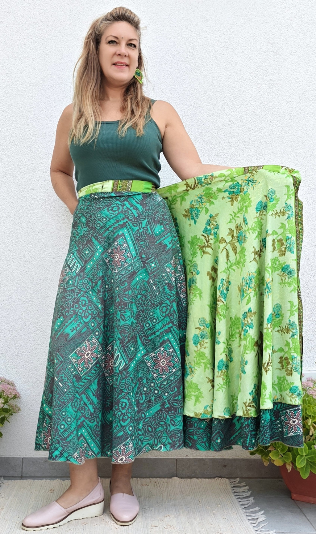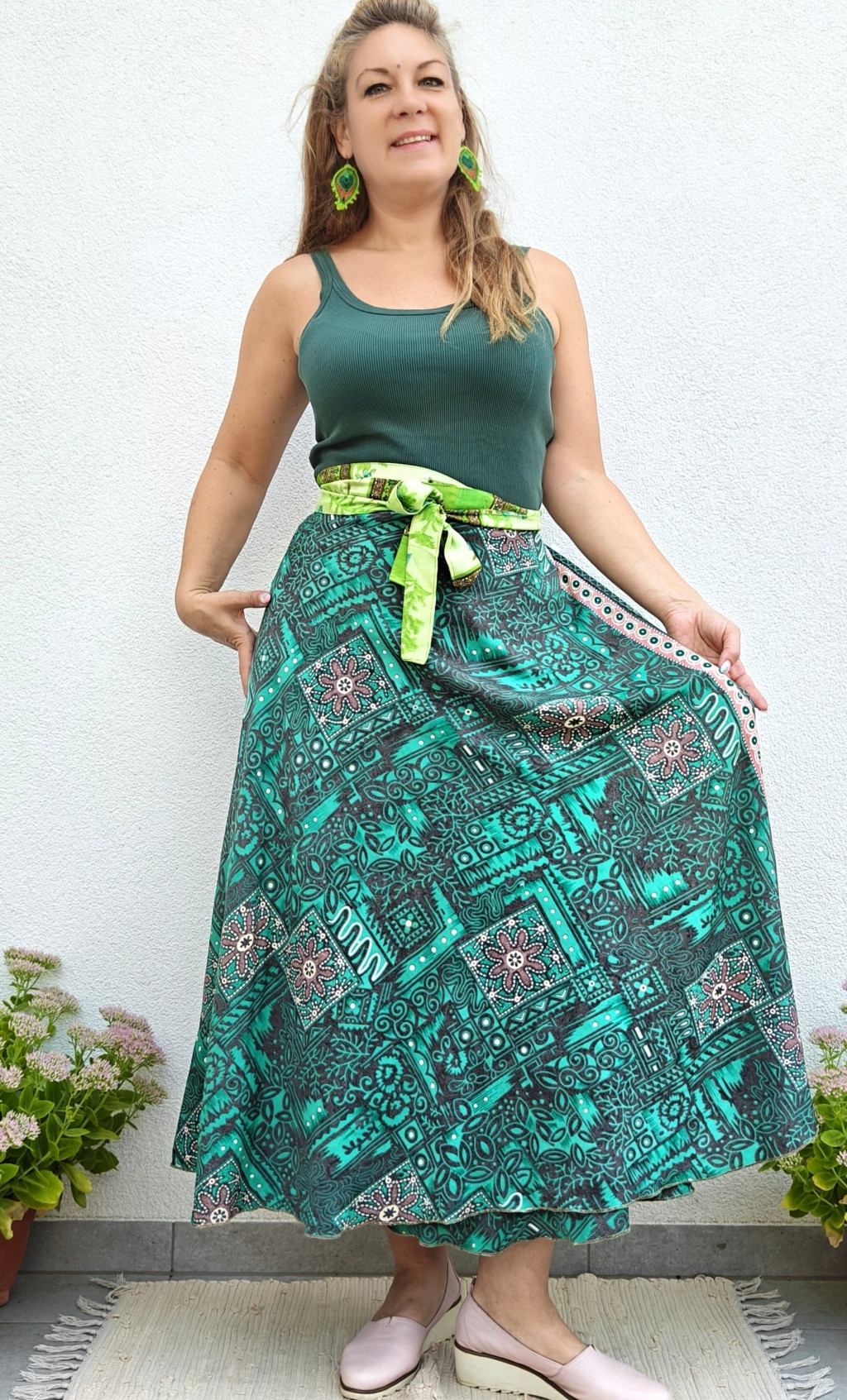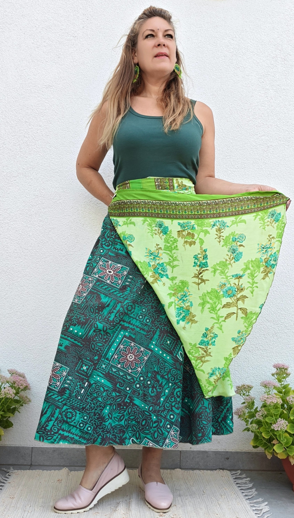 Lapszoknyáink újrahasznosított szárikból készülnek Indiában, egy hosszabb és egy rövidebb anyag derékban összevarrva! Két oldalú, kifordítható, mindkét oldala hordható, sokféleképpen köthető, variálható. Szoknyáinkból nincs két egyforma, mindegyikből csak EGY darab van, ha megtetszik, csapj le rá!