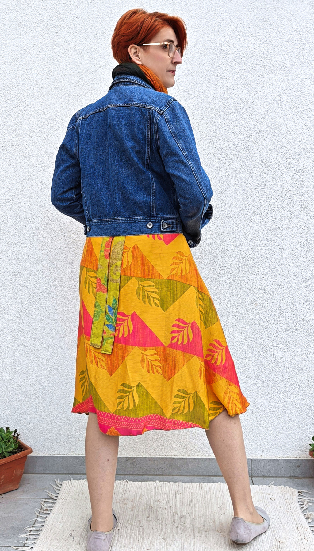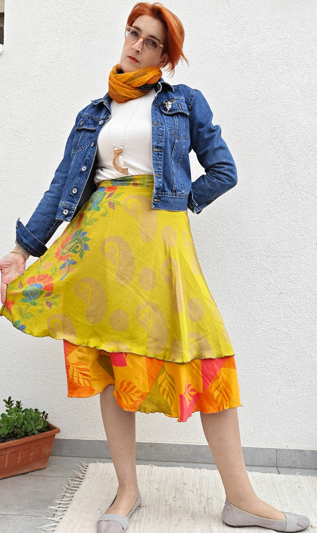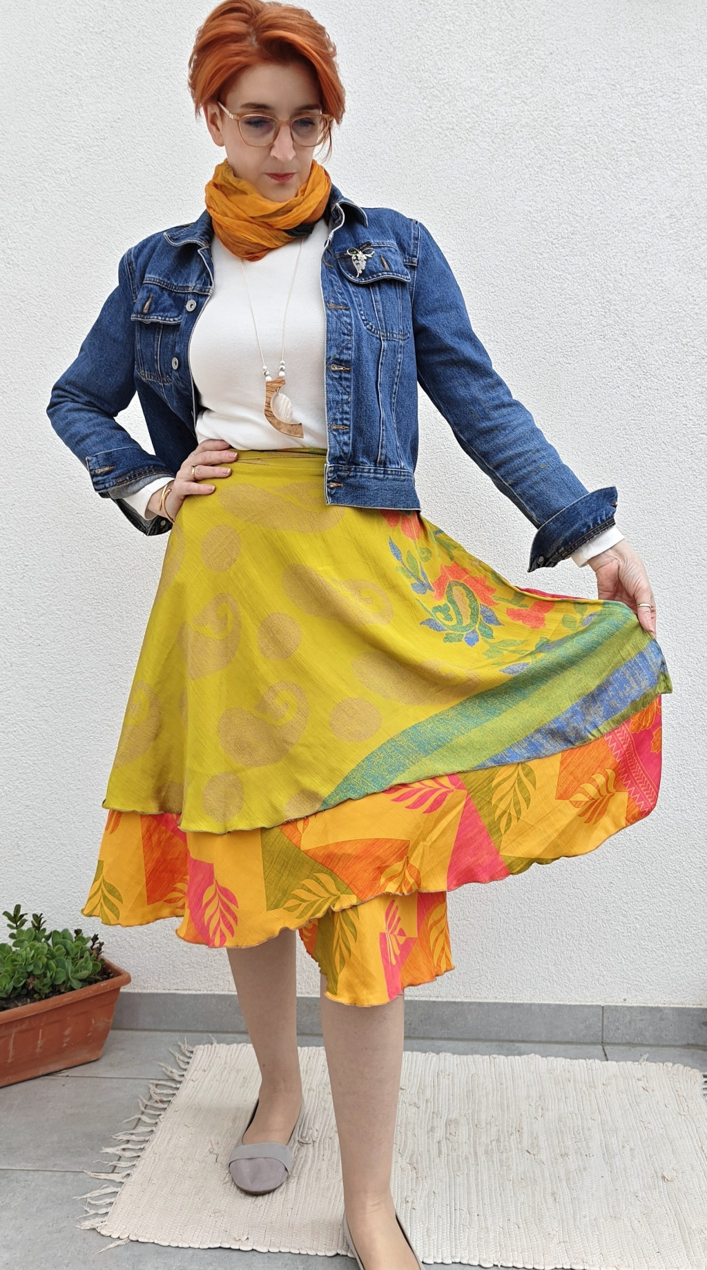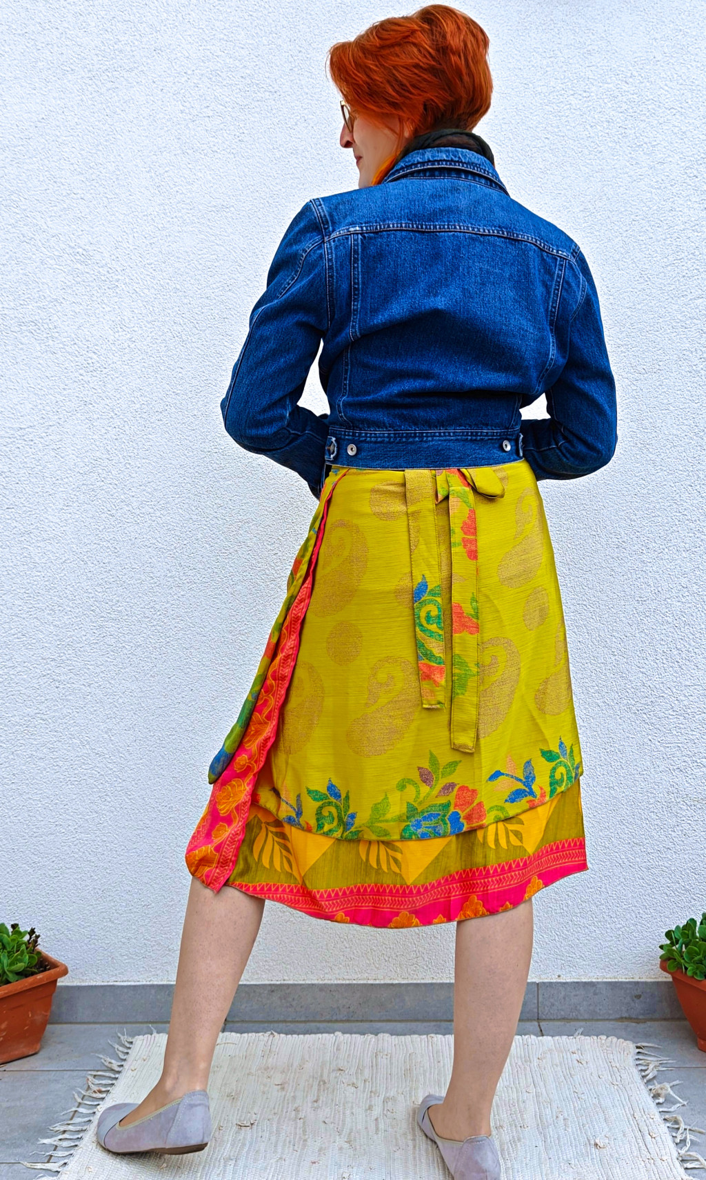 Lapszoknyáink újrahasznosított szárikból készülnek Indiában, egy hosszabb és egy rövidebb anyag derékban összevarrva! Két oldalú, kifordítható, mindkét oldala hordható, sokféleképpen köthető, variálható. Szoknyáinkból nincs két egyforma, mindegyikből csak EGY darab van, ha megtetszik, csapj le rá!