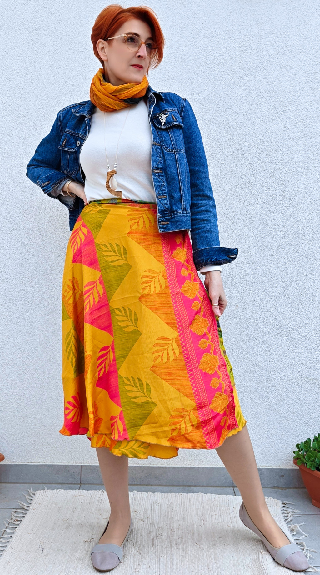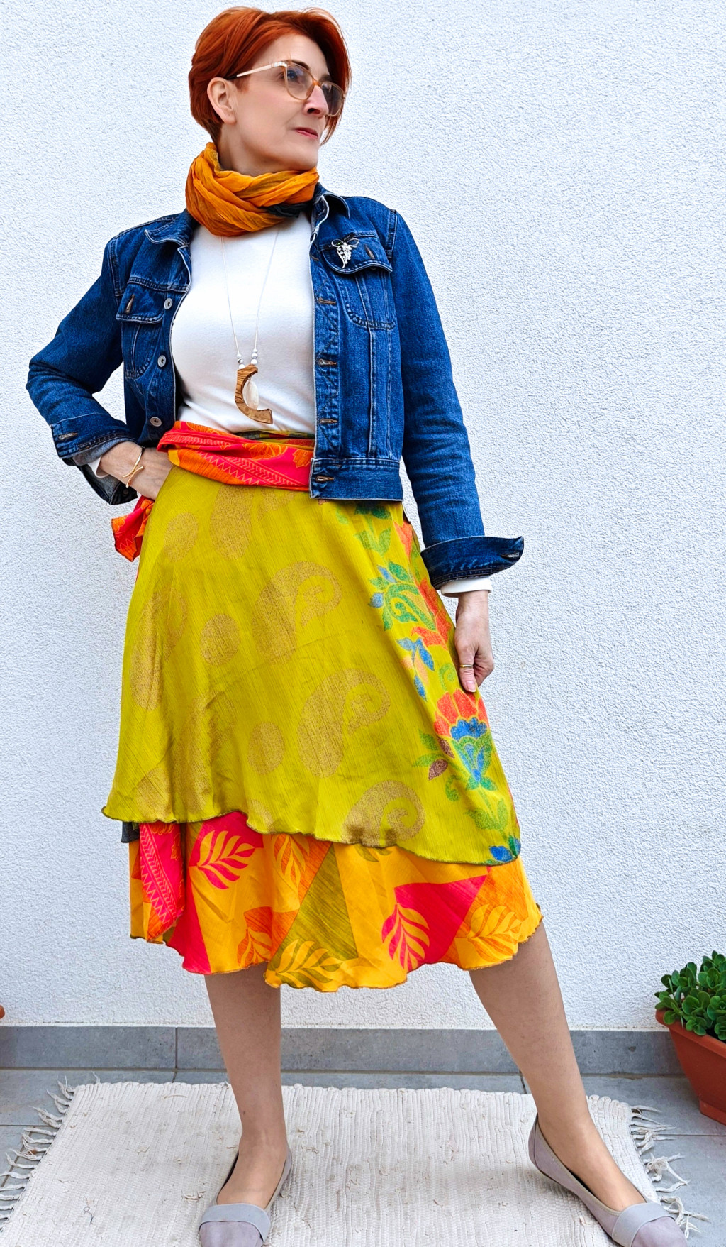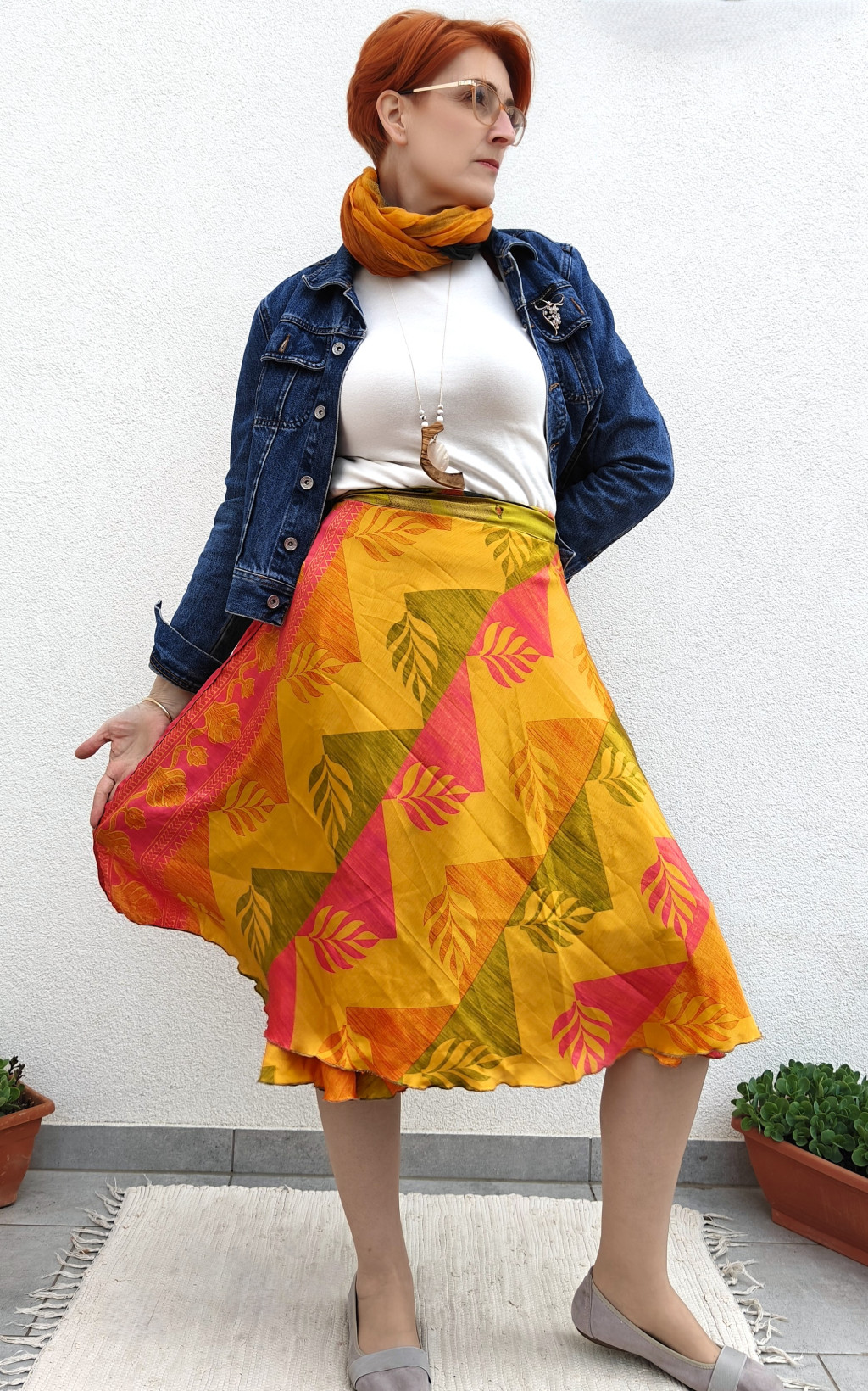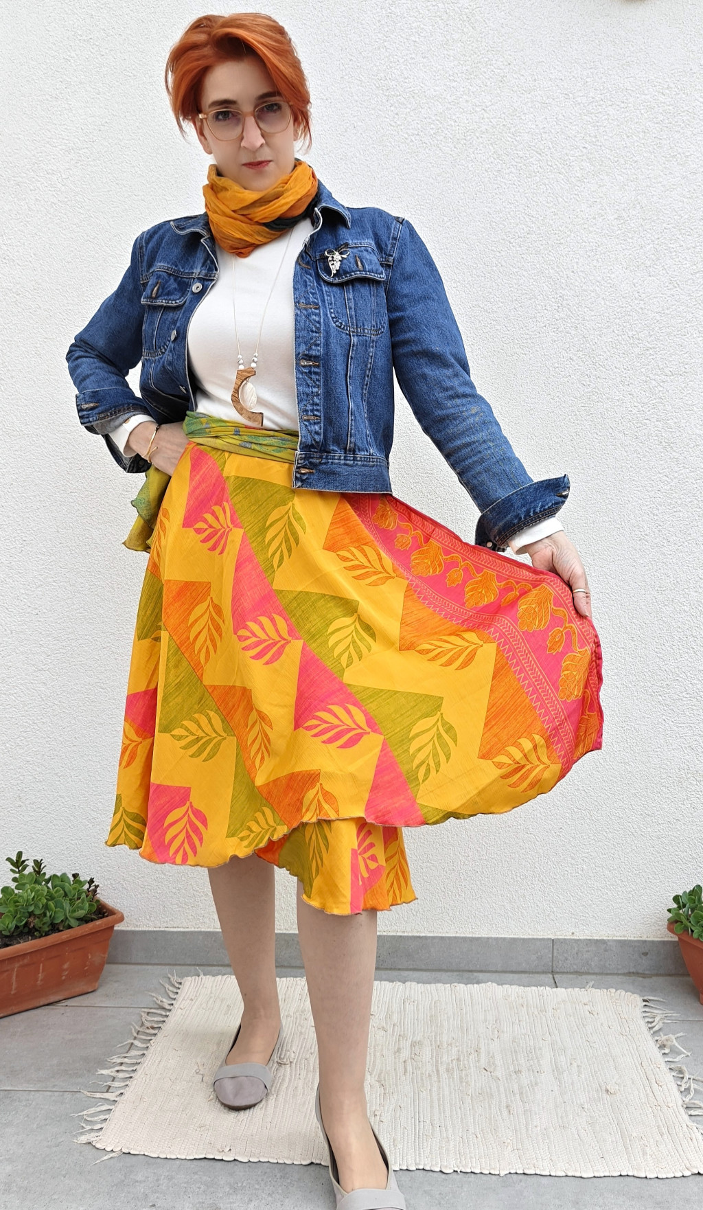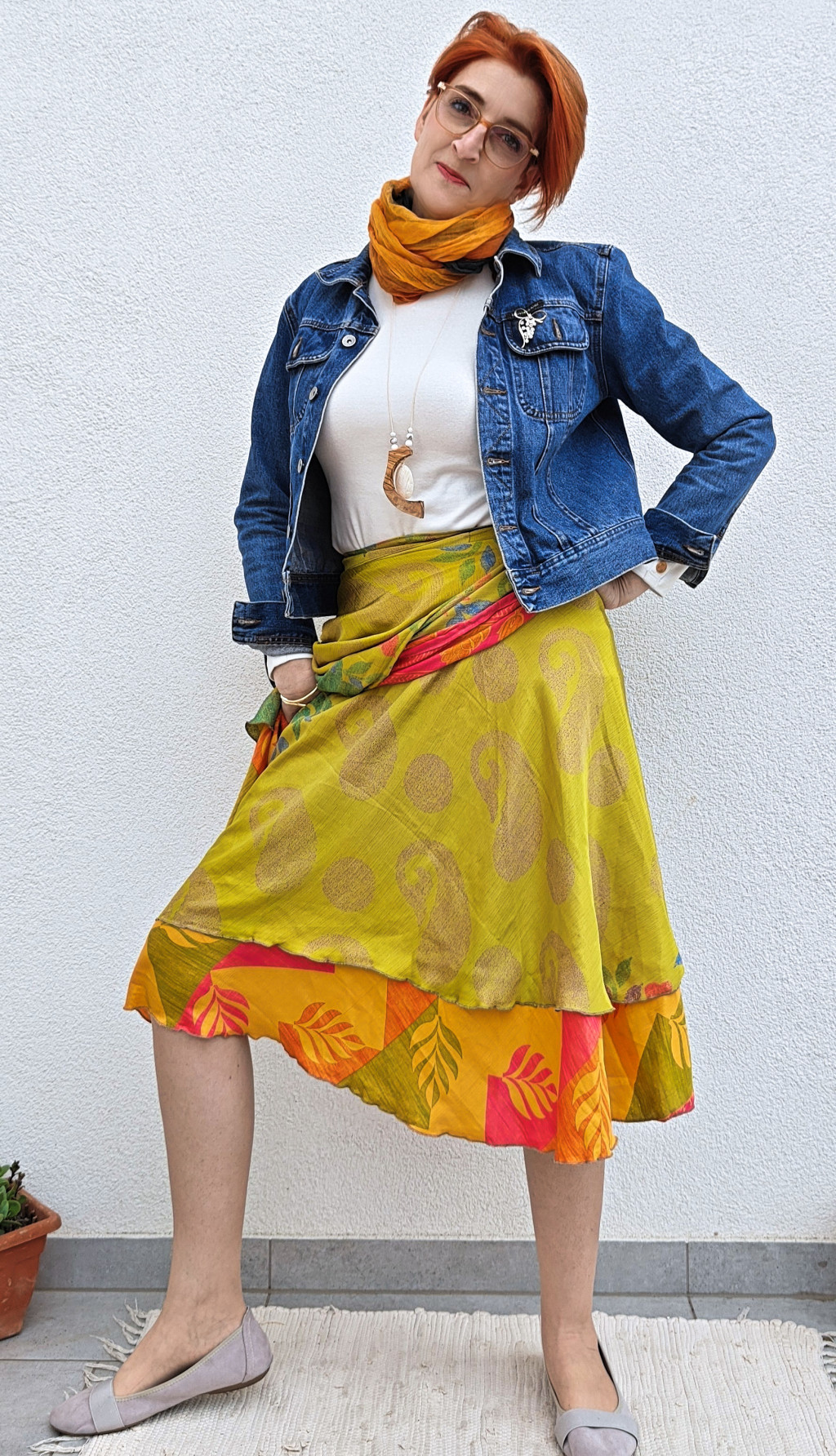 Lapszoknyáink újrahasznosított szárikból készülnek Indiában, egy hosszabb és egy rövidebb anyag derékban összevarrva! Két oldalú, kifordítható, mindkét oldala hordható, sokféleképpen köthető, variálható. Szoknyáinkból nincs két egyforma, mindegyikből csak EGY darab van, ha megtetszik, csapj le rá!