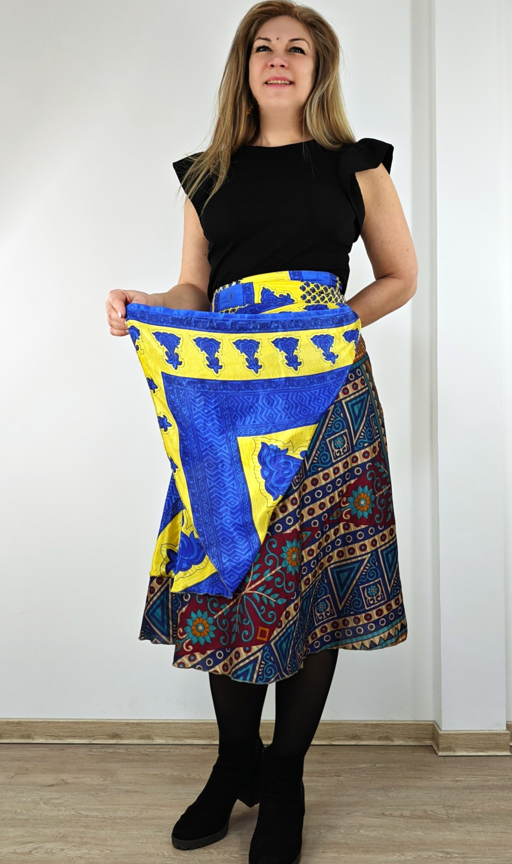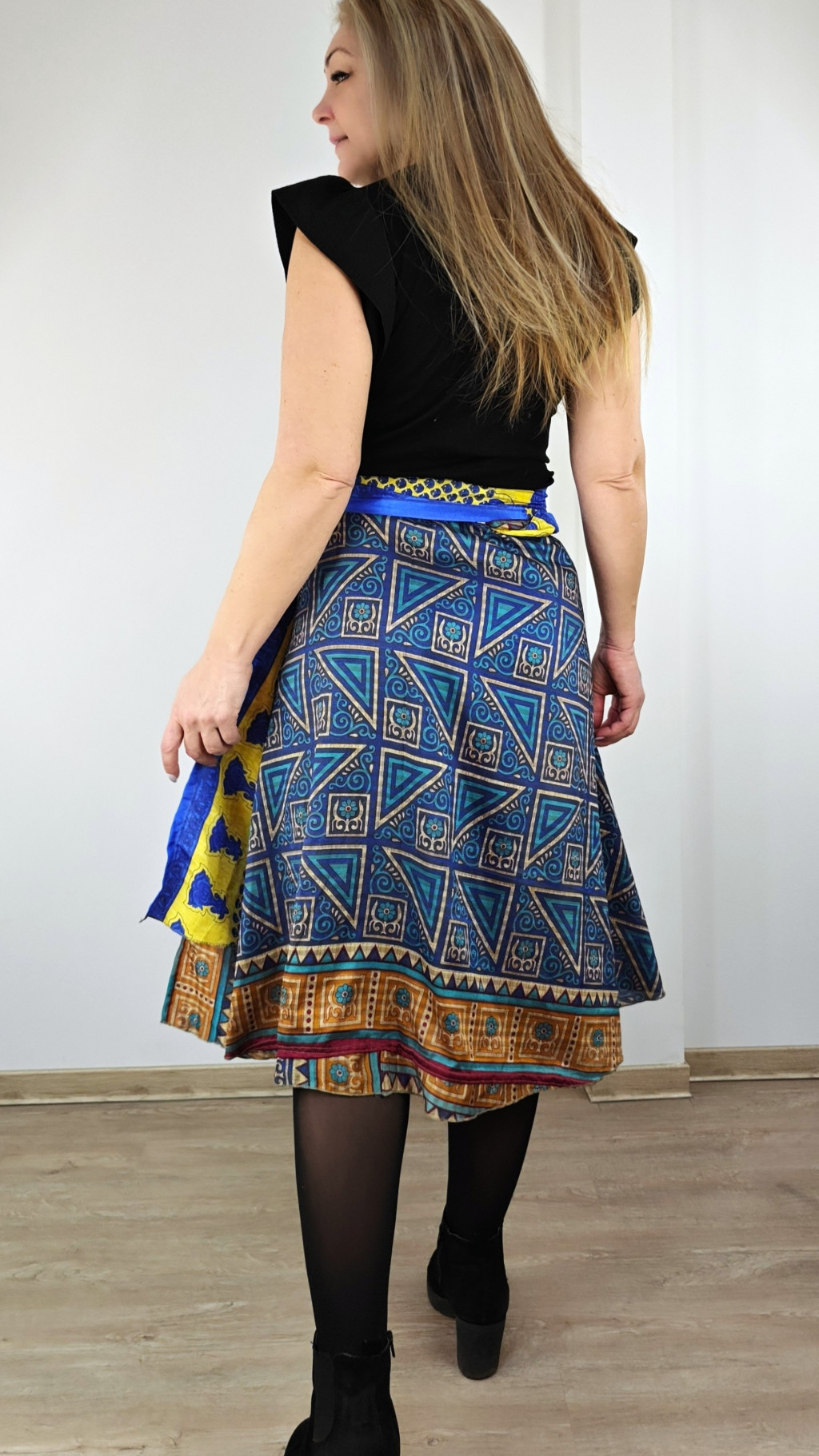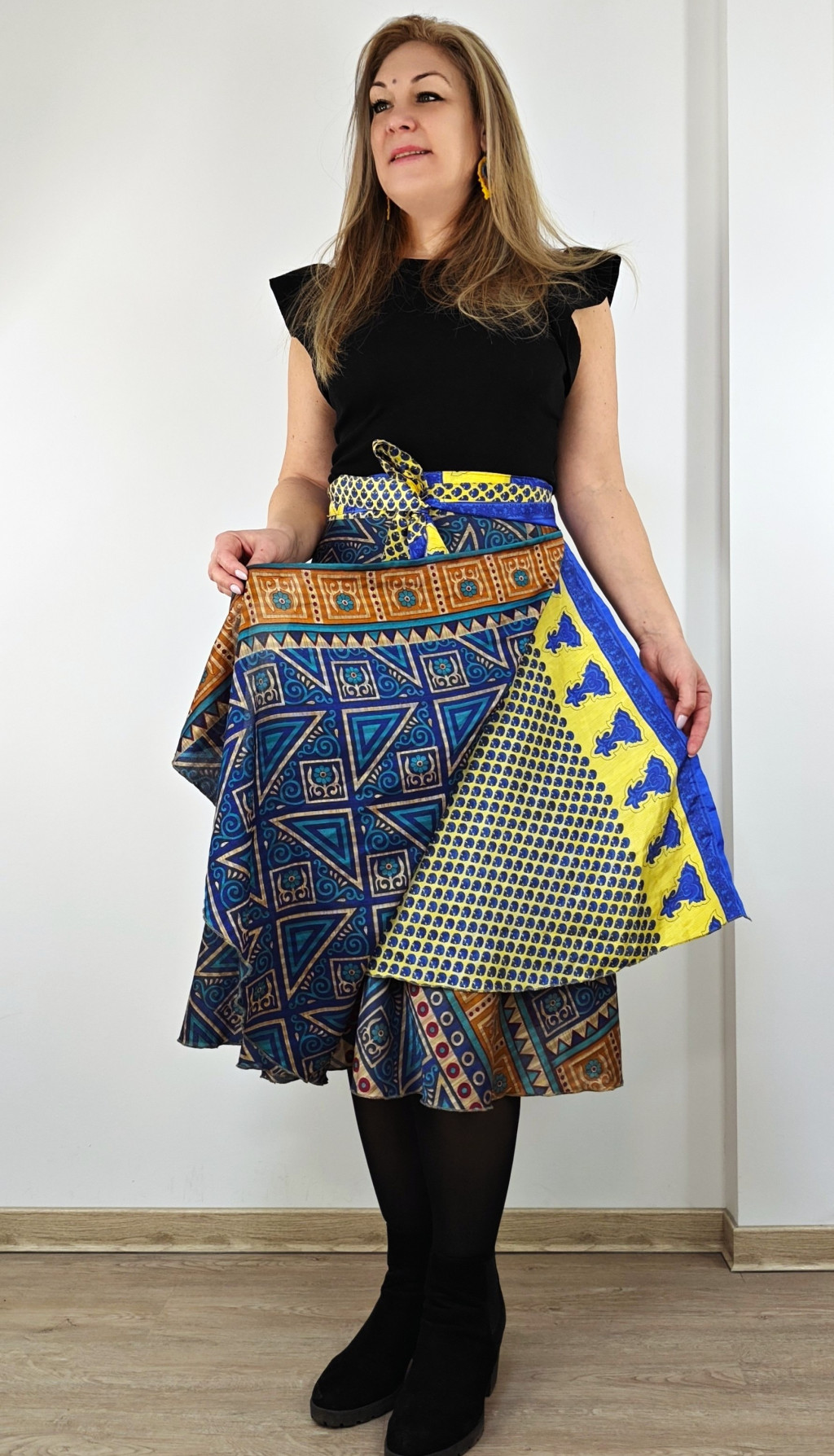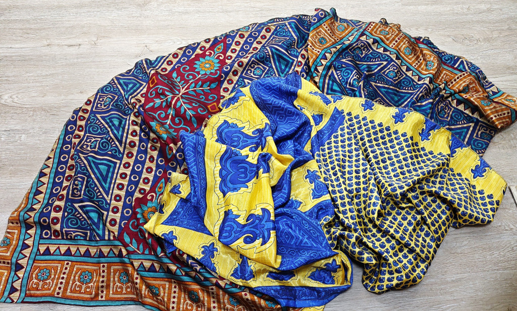 Lapszoknyáink újrahasznosított szárikból készülnek Indiában, egy hosszabb és egy rövidebb anyag derékban összevarrva! Két oldalú, kifordítható, mindkét oldala hordható, sokféleképpen köthető, variálható. Szoknyáinkból nincs két egyforma, mindegyikből csak EGY darab van, ha megtetszik, csapj le rá!