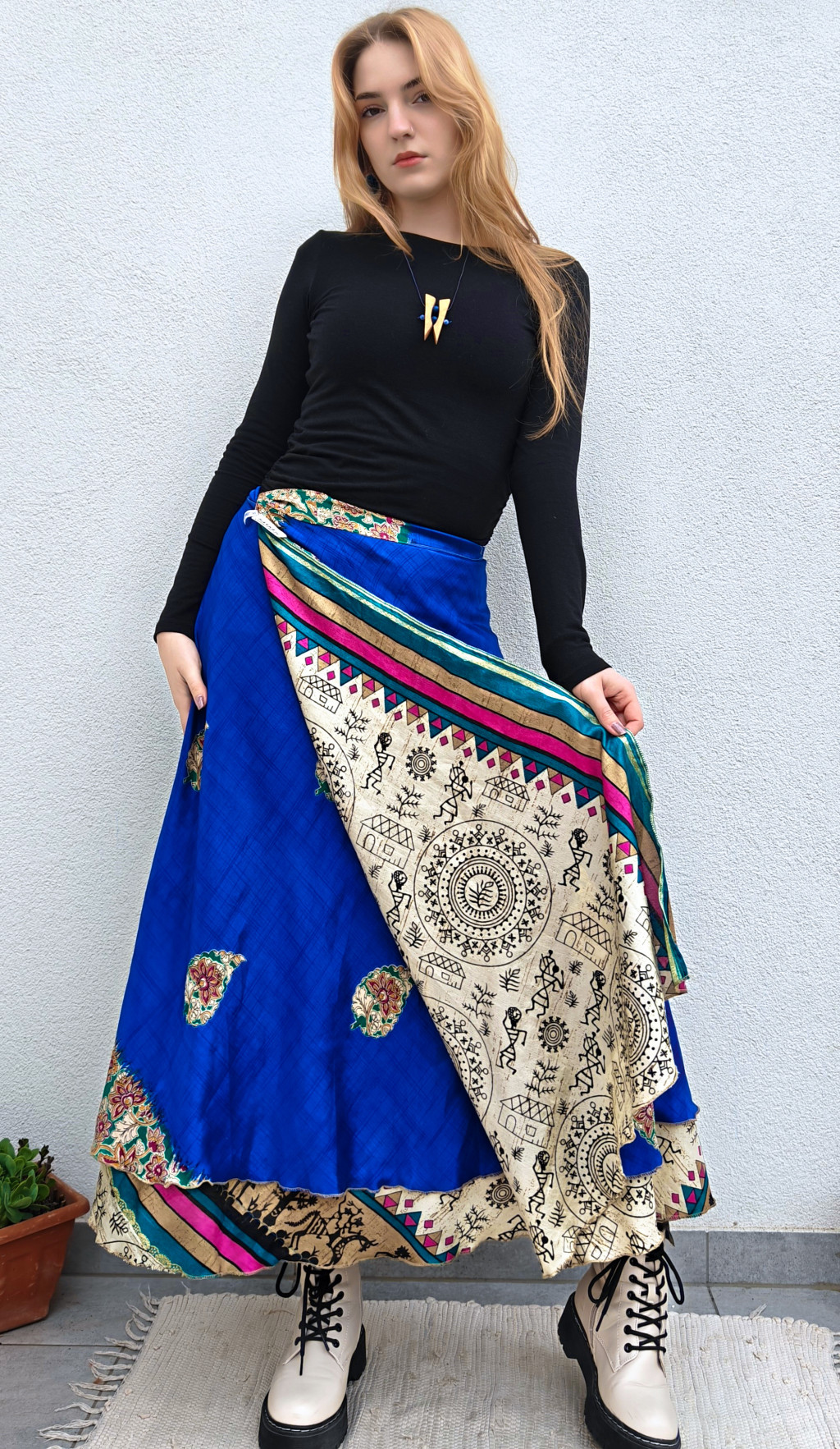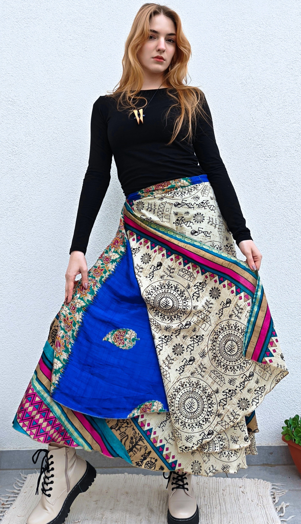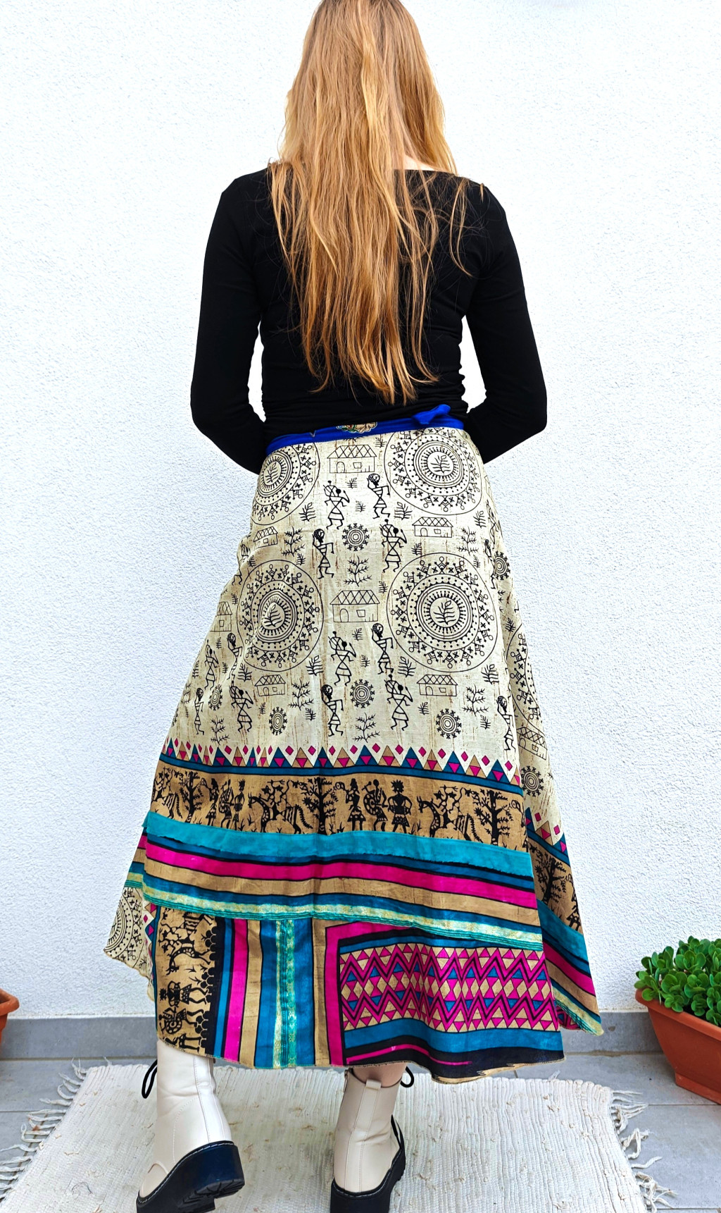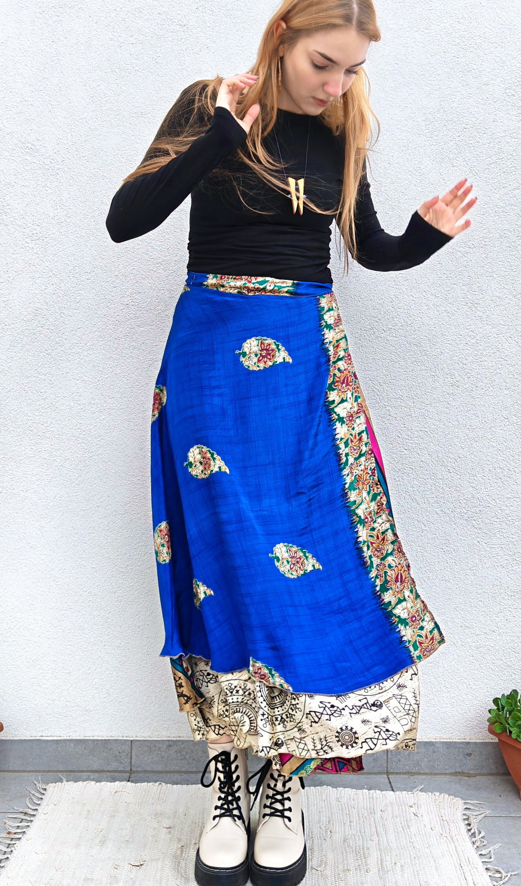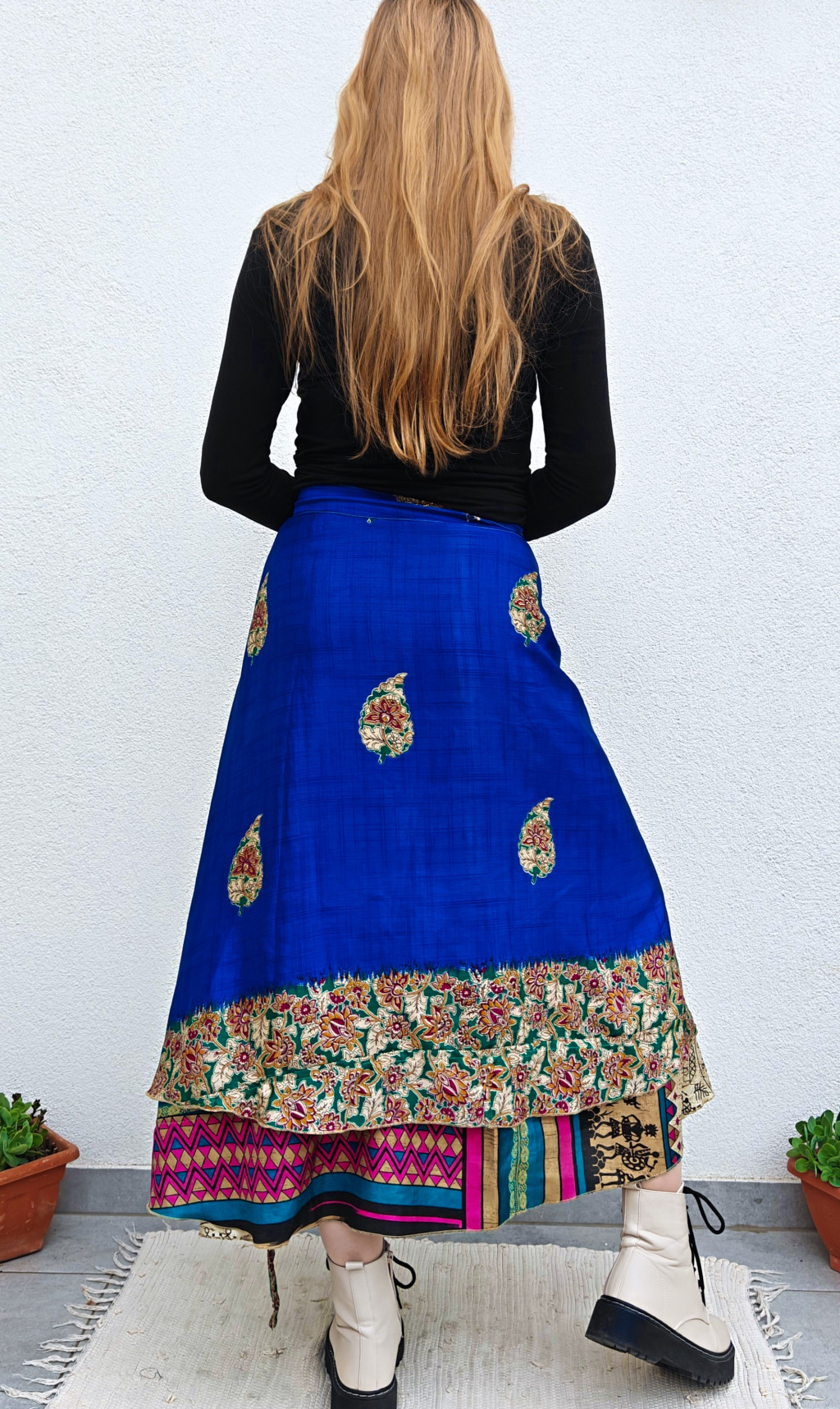 Lapszoknyáink újrahasznosított szárikból készülnek Indiában, egy hosszabb és egy rövidebb anyag derékban összevarrva! Két oldalú, kifordítható, mindkét oldala hordható, sokféleképpen köthető, variálható. Szoknyáinkból nincs két egyforma, mindegyikből csak EGY darab van, ha megtetszik, csapj le rá!