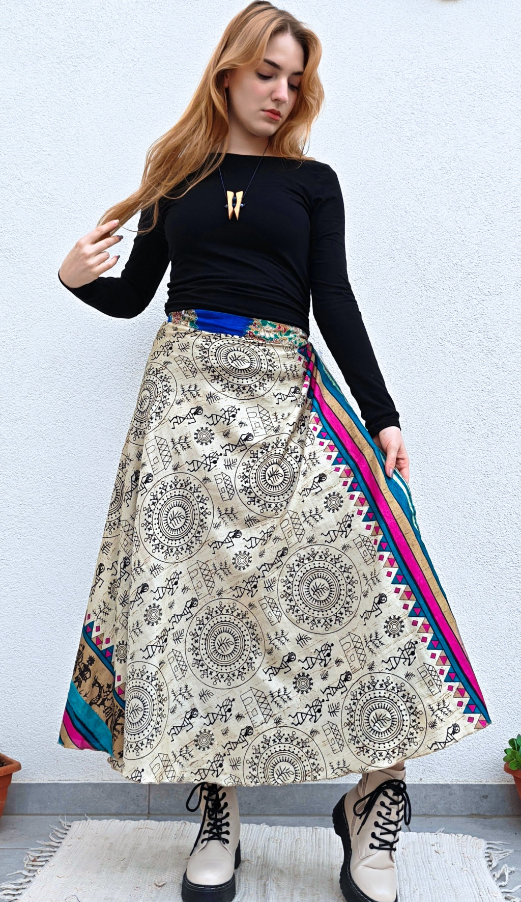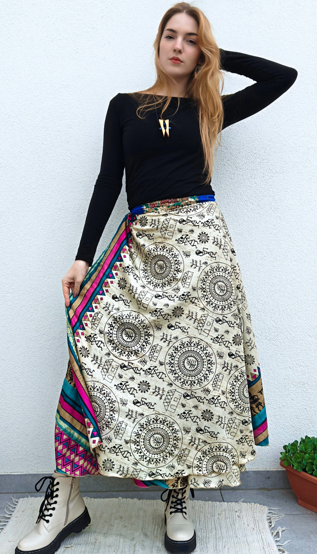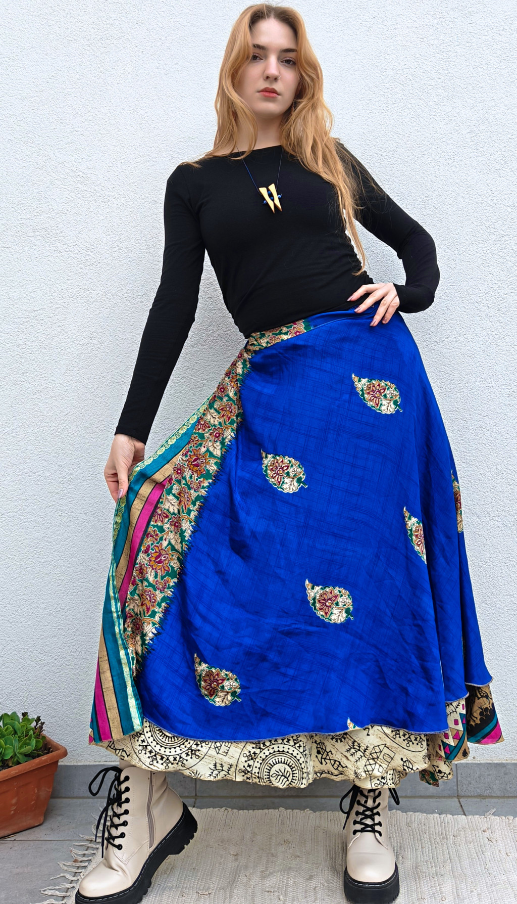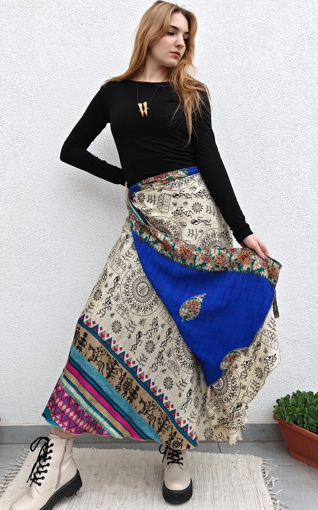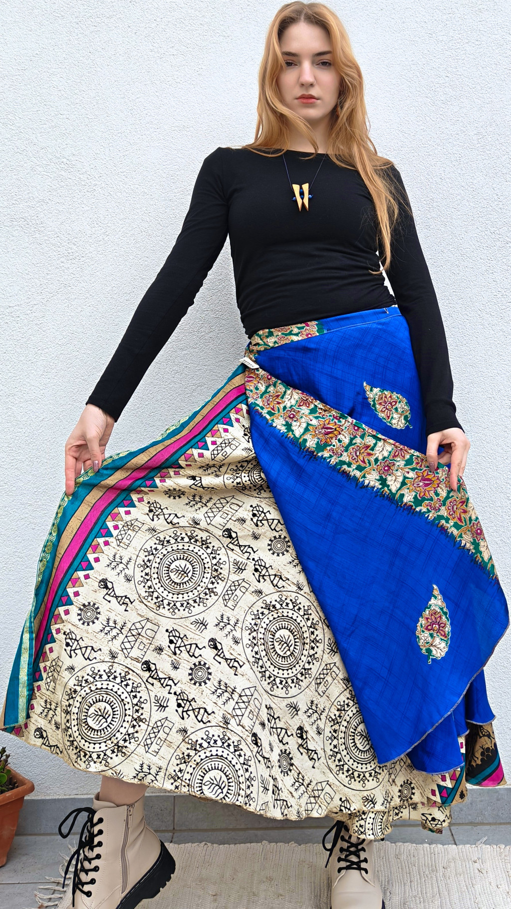 Lapszoknyáink újrahasznosított szárikból készülnek Indiában, egy hosszabb és egy rövidebb anyag derékban összevarrva! Két oldalú, kifordítható, mindkét oldala hordható, sokféleképpen köthető, variálható. Szoknyáinkból nincs két egyforma, mindegyikből csak EGY darab van, ha megtetszik, csapj le rá!