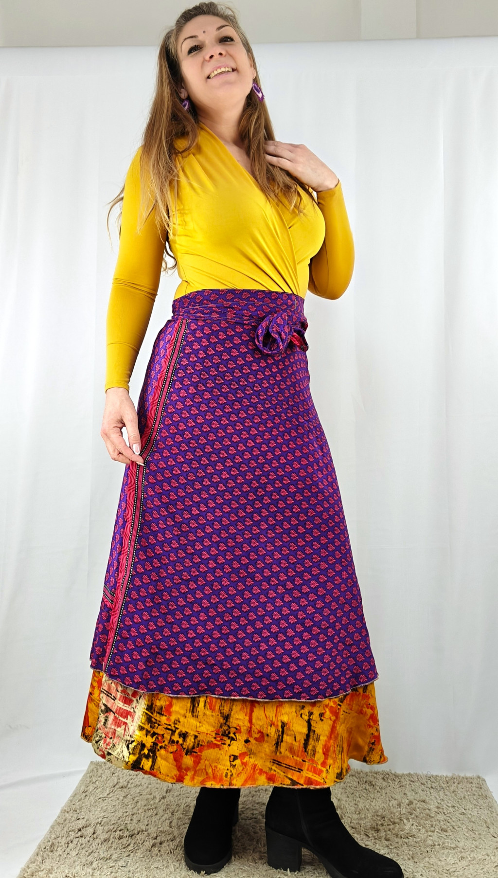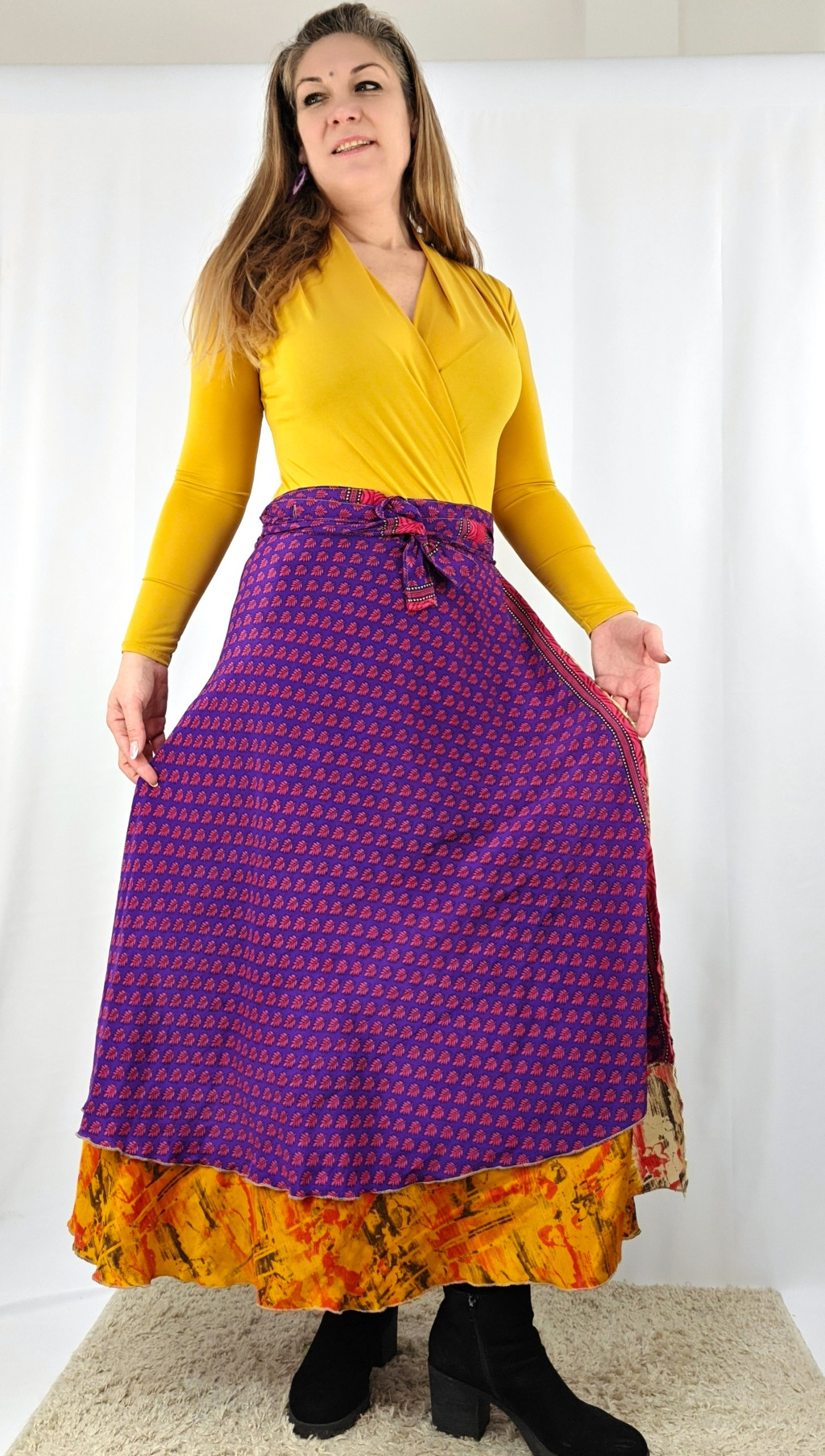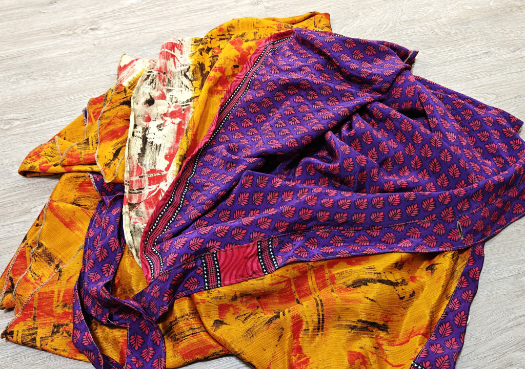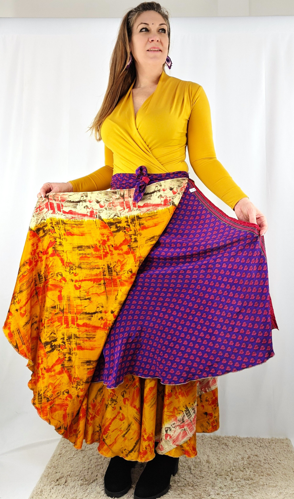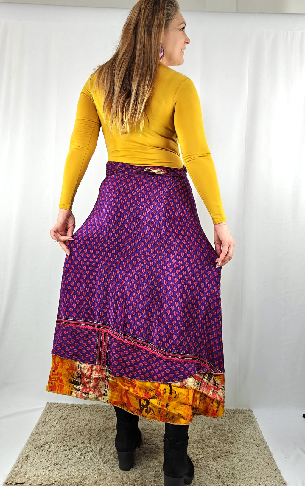 Lapszoknyáink újrahasznosított szárikból készülnek Indiában, egy hosszabb és egy rövidebb anyag derékban összevarrva! Két oldalú, kifordítható, mindkét oldala hordható, sokféleképpen köthető, variálható. Szoknyáinkból nincs két egyforma, mindegyikből csak EGY darab van, ha megtetszik, csapj le rá!