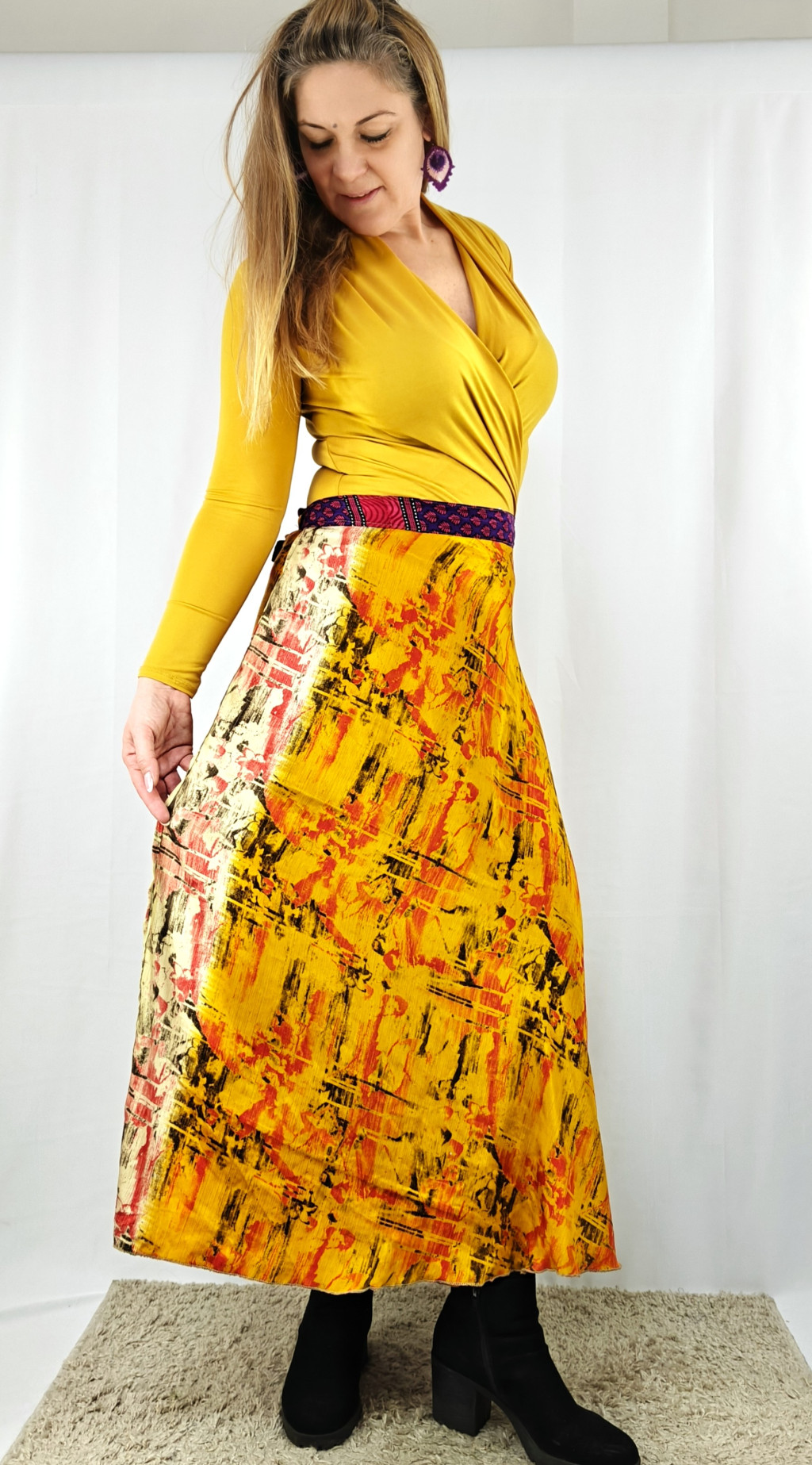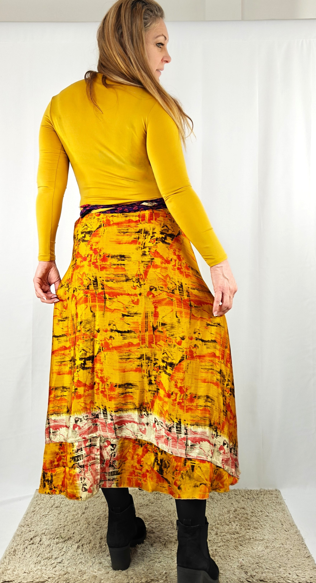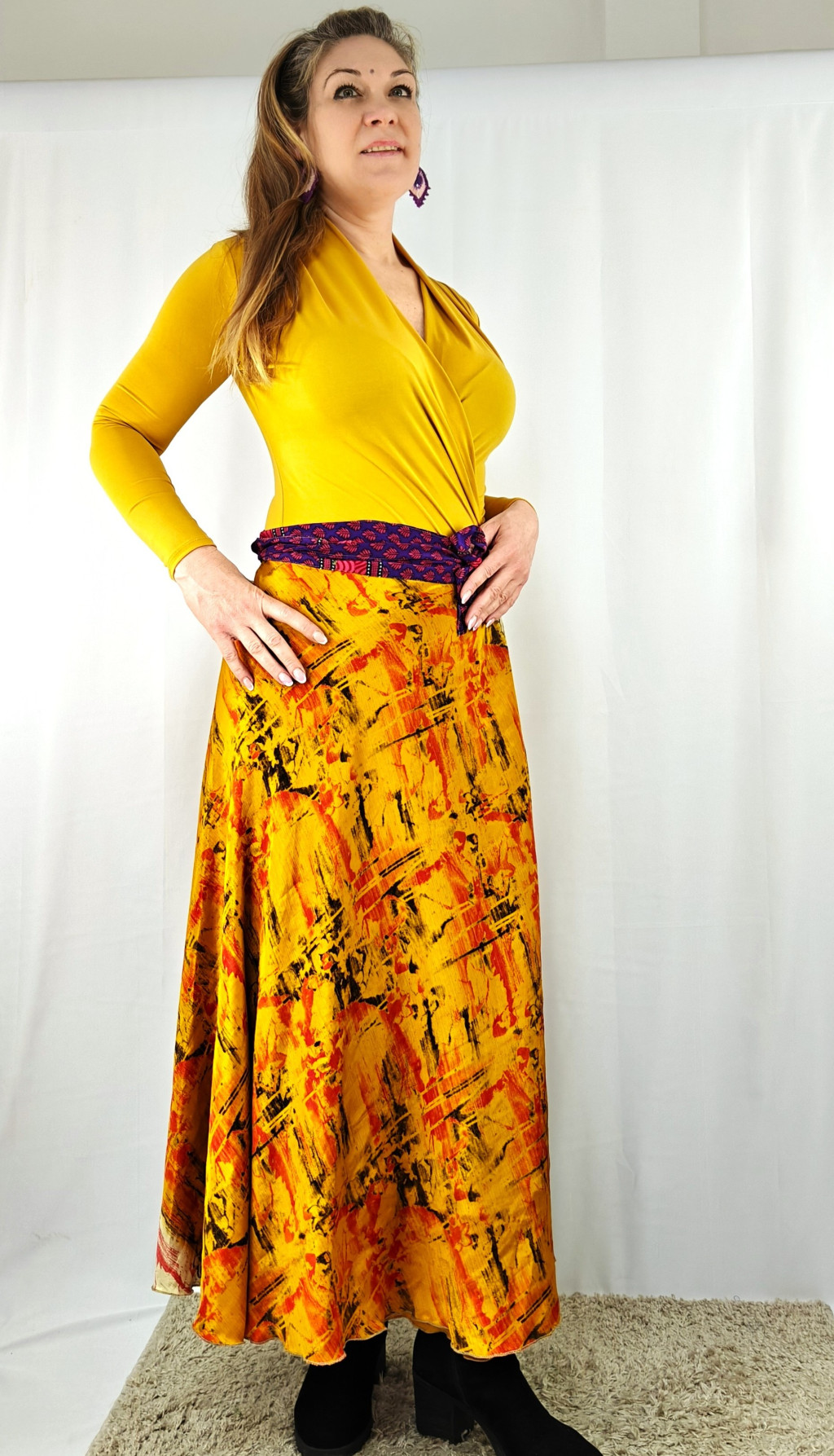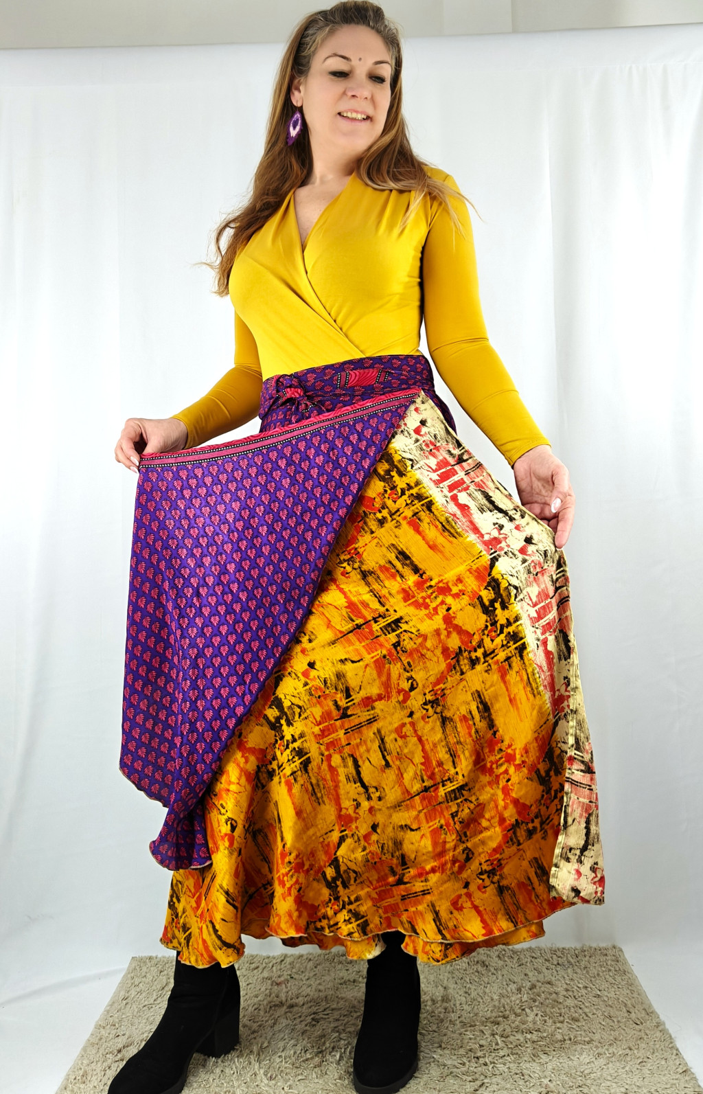 Lapszoknyáink újrahasznosított szárikból készülnek Indiában, egy hosszabb és egy rövidebb anyag derékban összevarrva! Két oldalú, kifordítható, mindkét oldala hordható, sokféleképpen köthető, variálható. Szoknyáinkból nincs két egyforma, mindegyikből csak EGY darab van, ha megtetszik, csapj le rá!