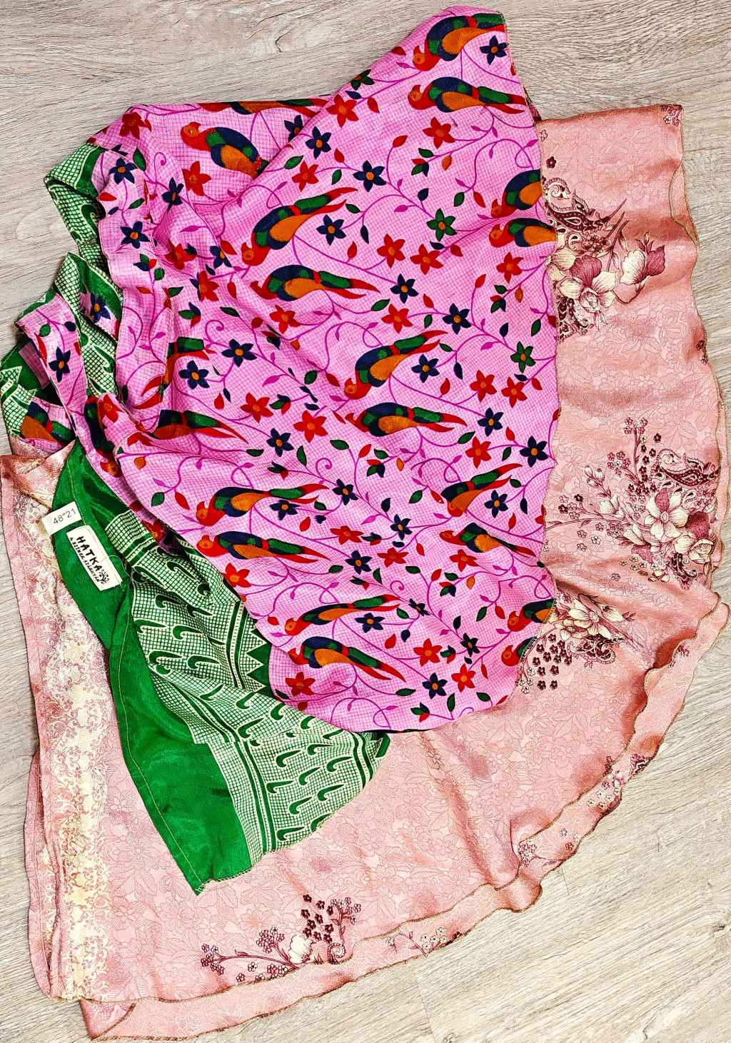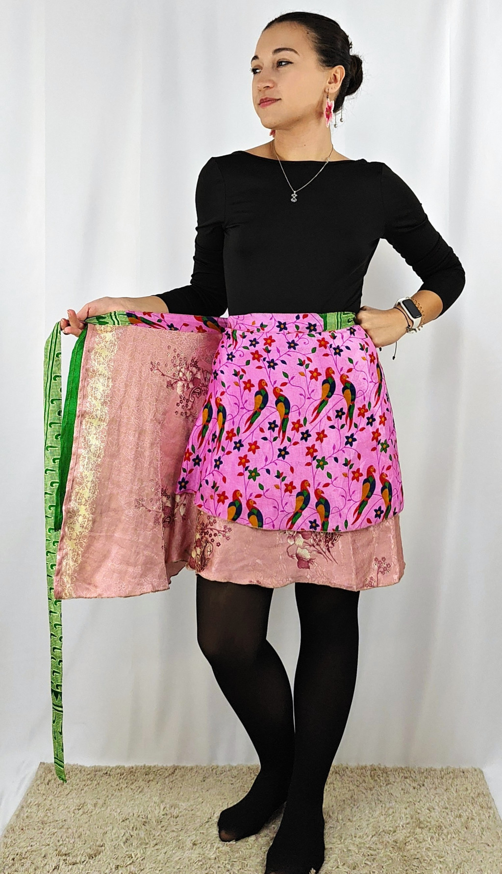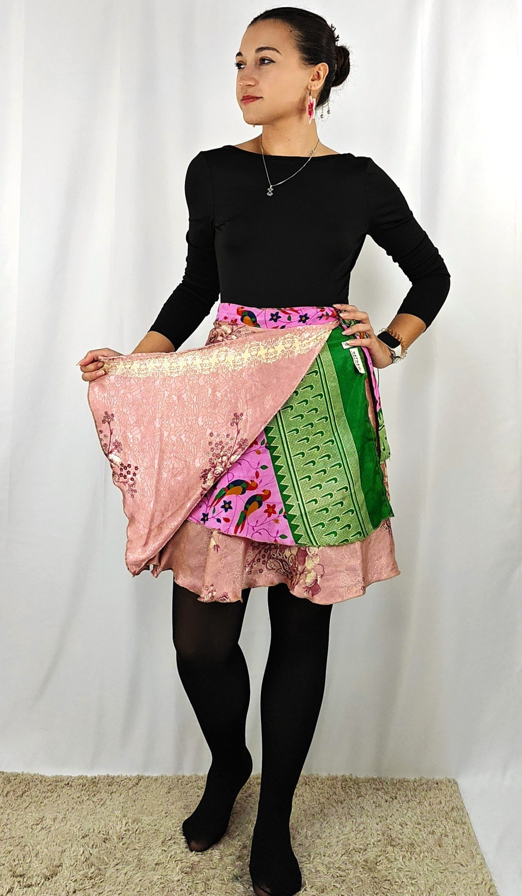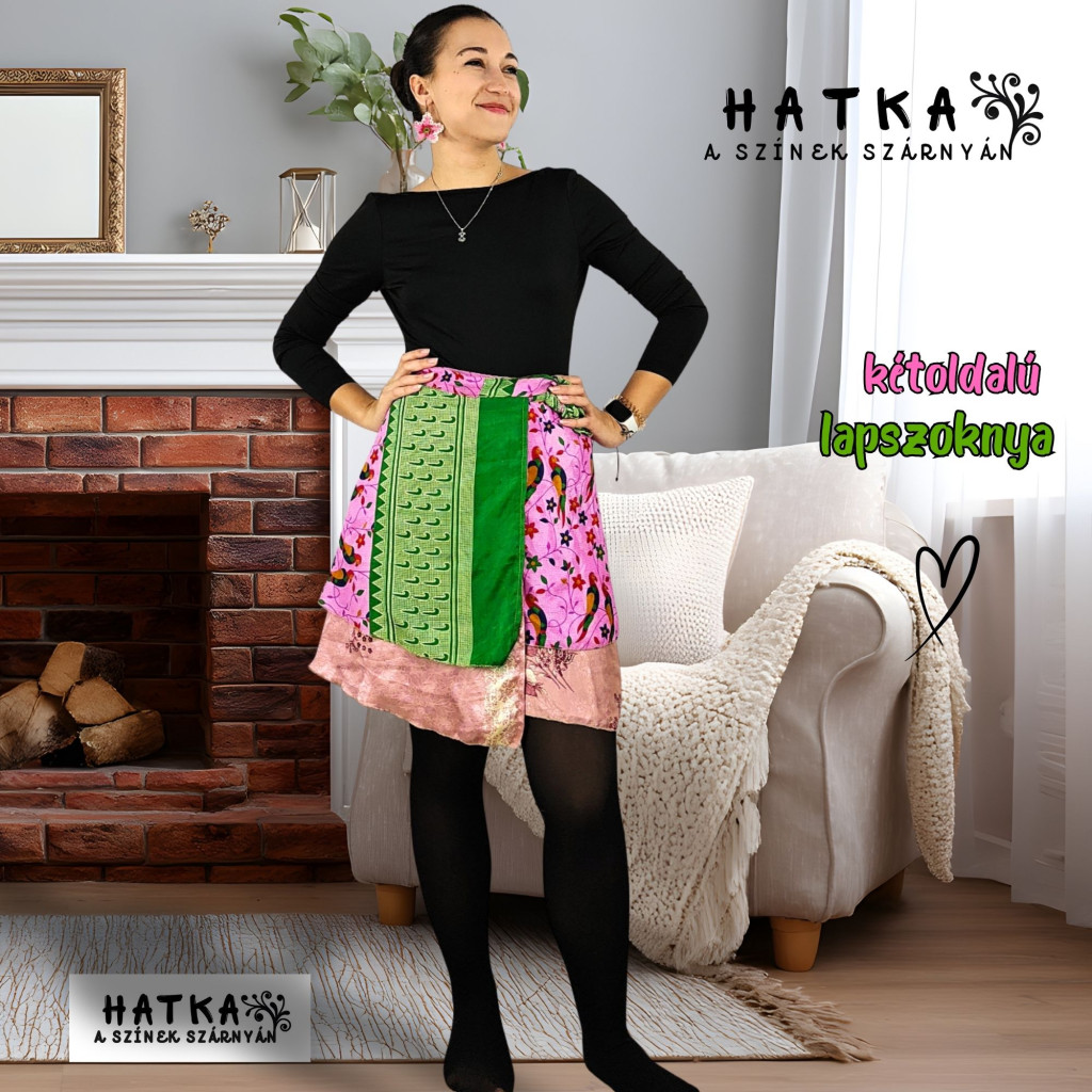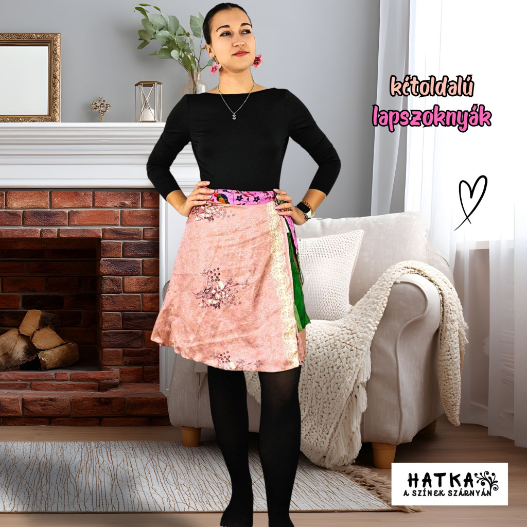 Lapszoknyáink újrahasznosított szárikból készülnek Indiában, egy hosszabb és egy rövidebb anyag derékban összevarrva! Két oldalú, kifordítható, mindkét oldala hordható, sokféleképpen köthető, variálható. Szoknyáinkból nincs két egyforma, mindegyikből csak EGY darab van, ha megtetszik, csapj le rá!