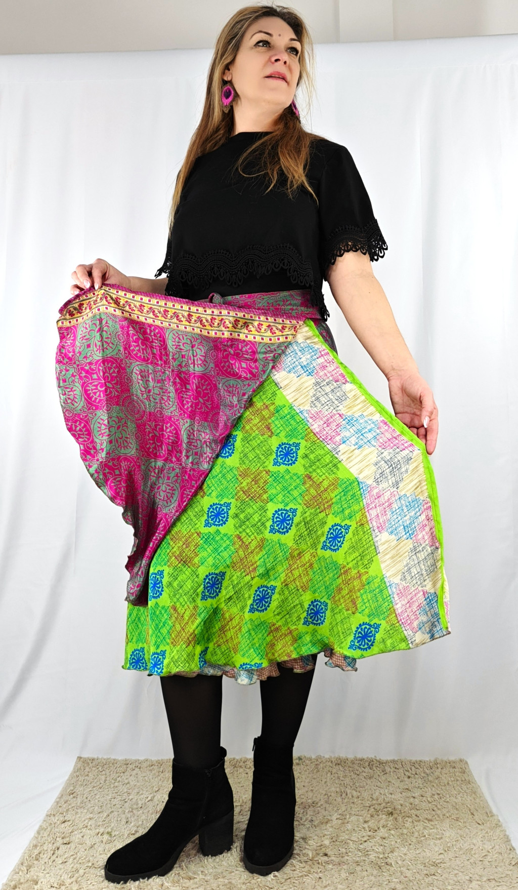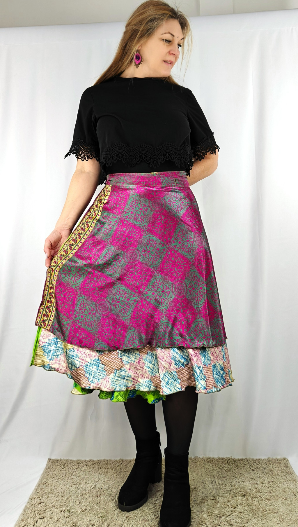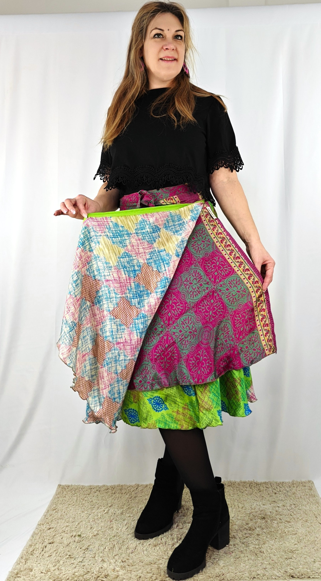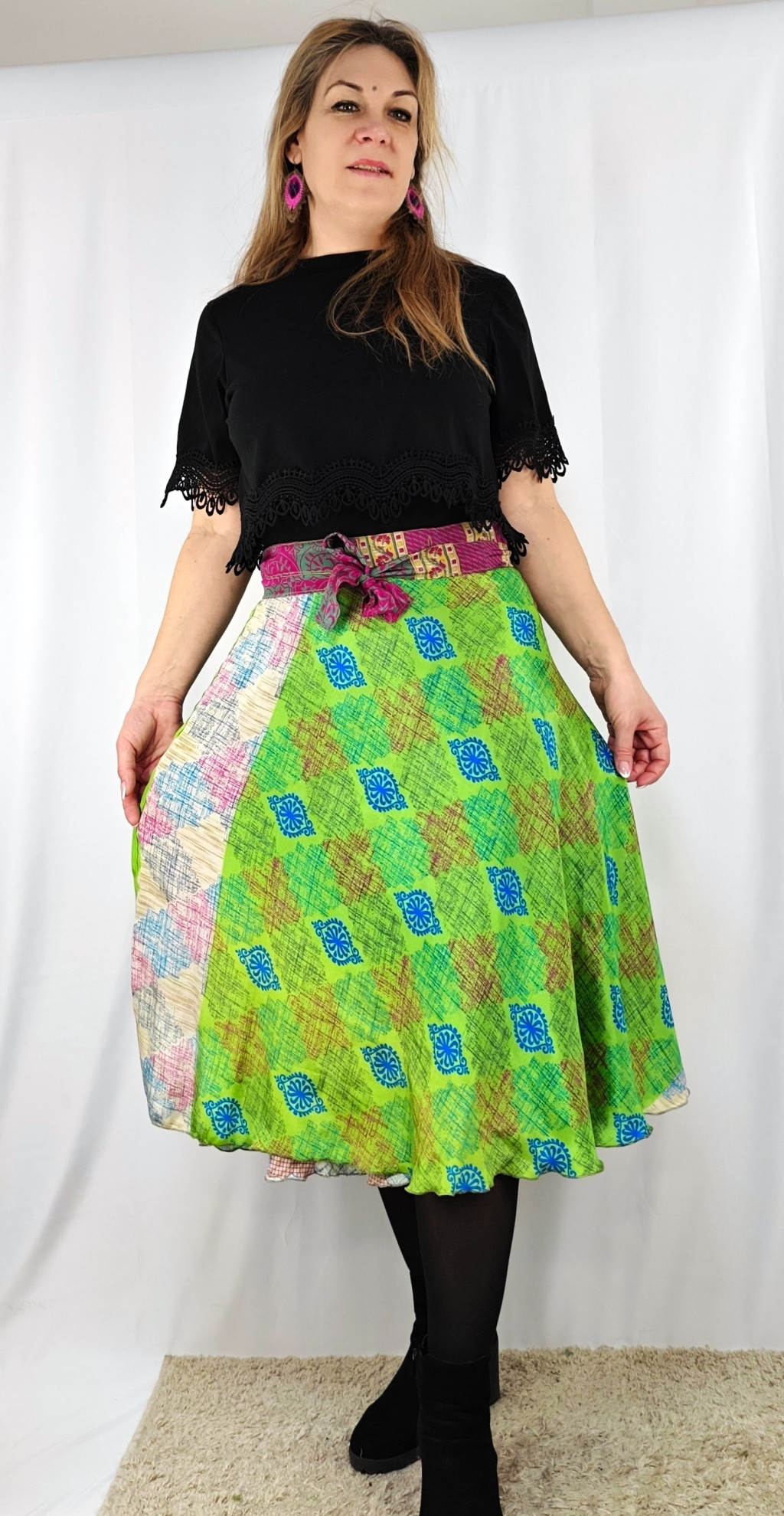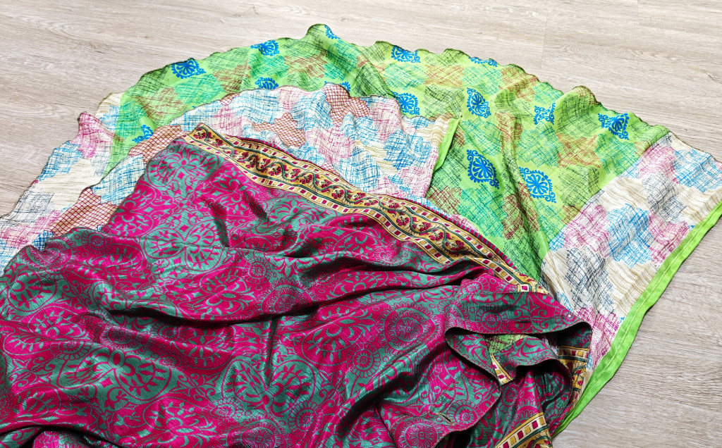 Lapszoknyáink újrahasznosított szárikból készülnek Indiában, egy hosszabb és egy rövidebb anyag derékban összevarrva! Két oldalú, kifordítható, mindkét oldala hordható, sokféleképpen köthető, variálható. Szoknyáinkból nincs két egyforma, mindegyikből csak EGY darab van, ha megtetszik, csapj le rá!