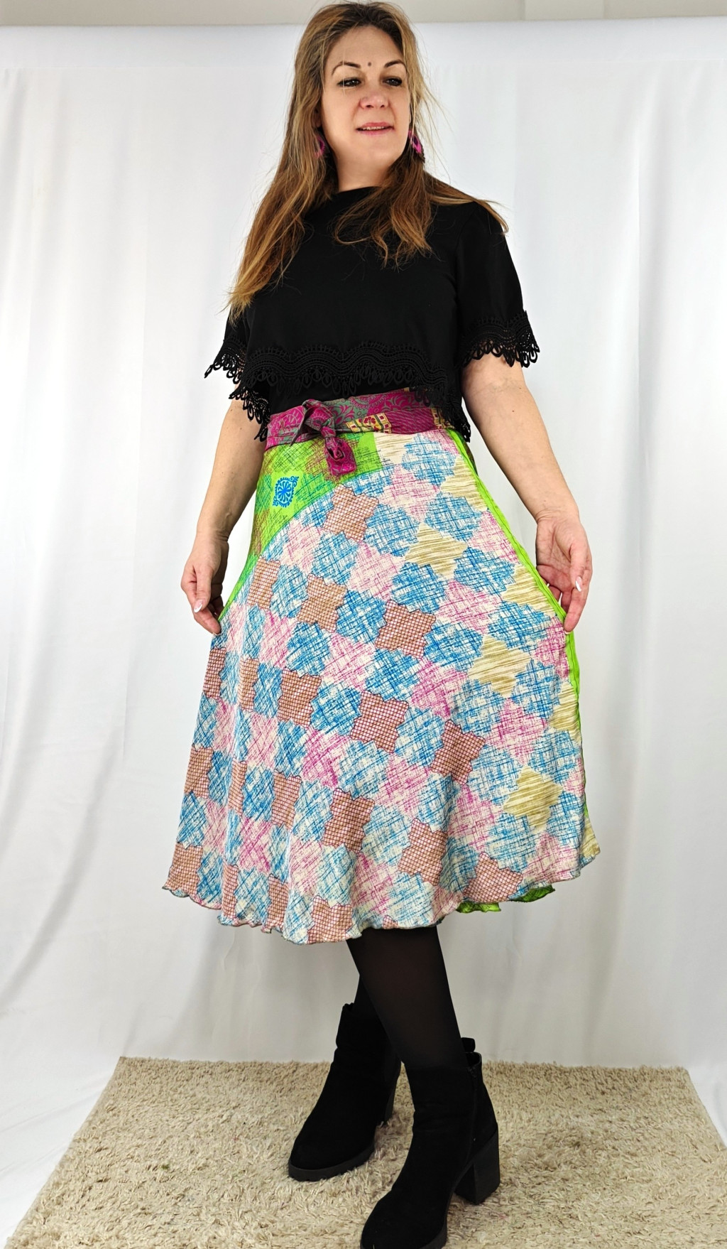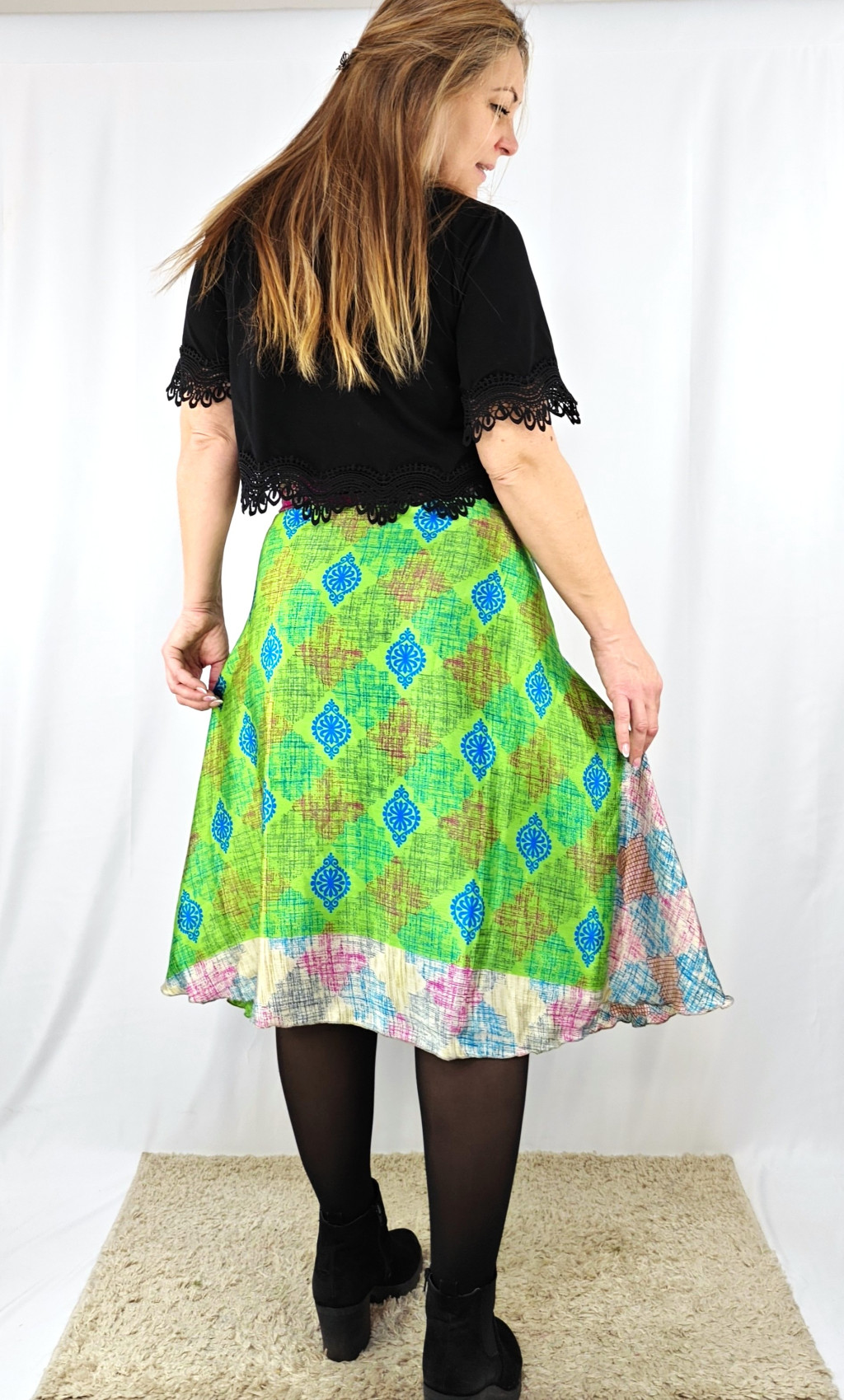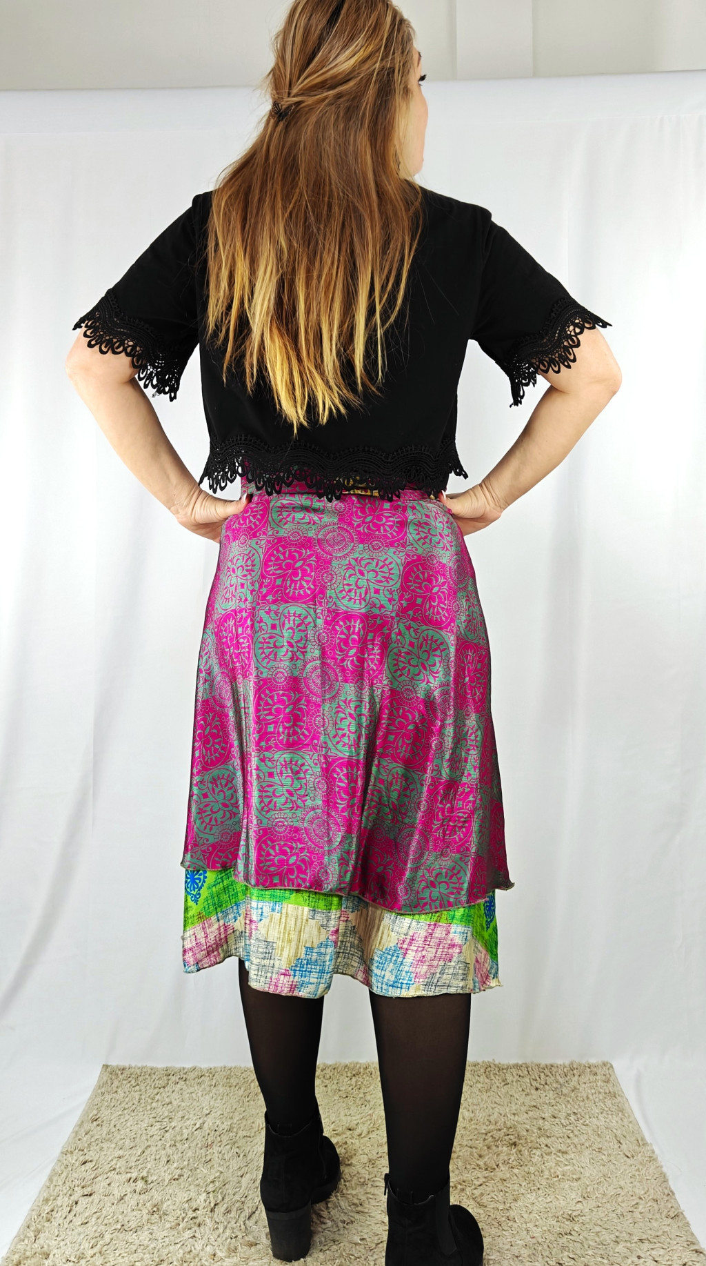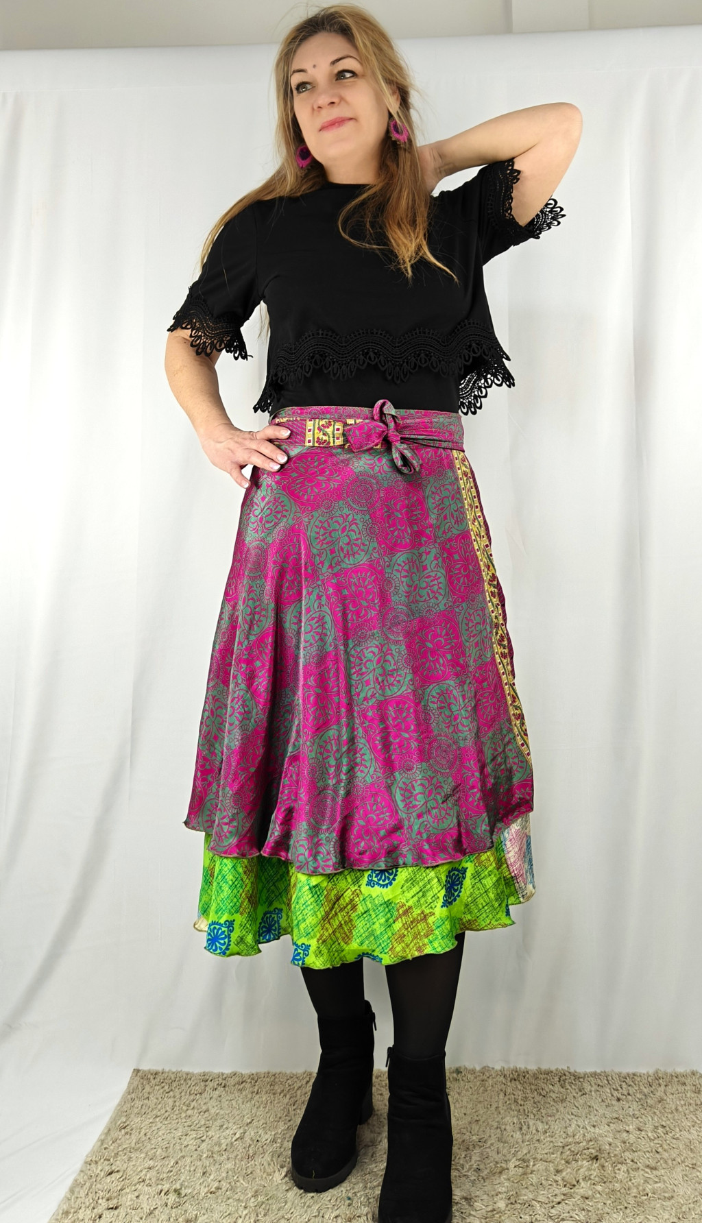 Lapszoknyáink újrahasznosított szárikból készülnek Indiában, egy hosszabb és egy rövidebb anyag derékban összevarrva! Két oldalú, kifordítható, mindkét oldala hordható, sokféleképpen köthető, variálható. Szoknyáinkból nincs két egyforma, mindegyikből csak EGY darab van, ha megtetszik, csapj le rá!