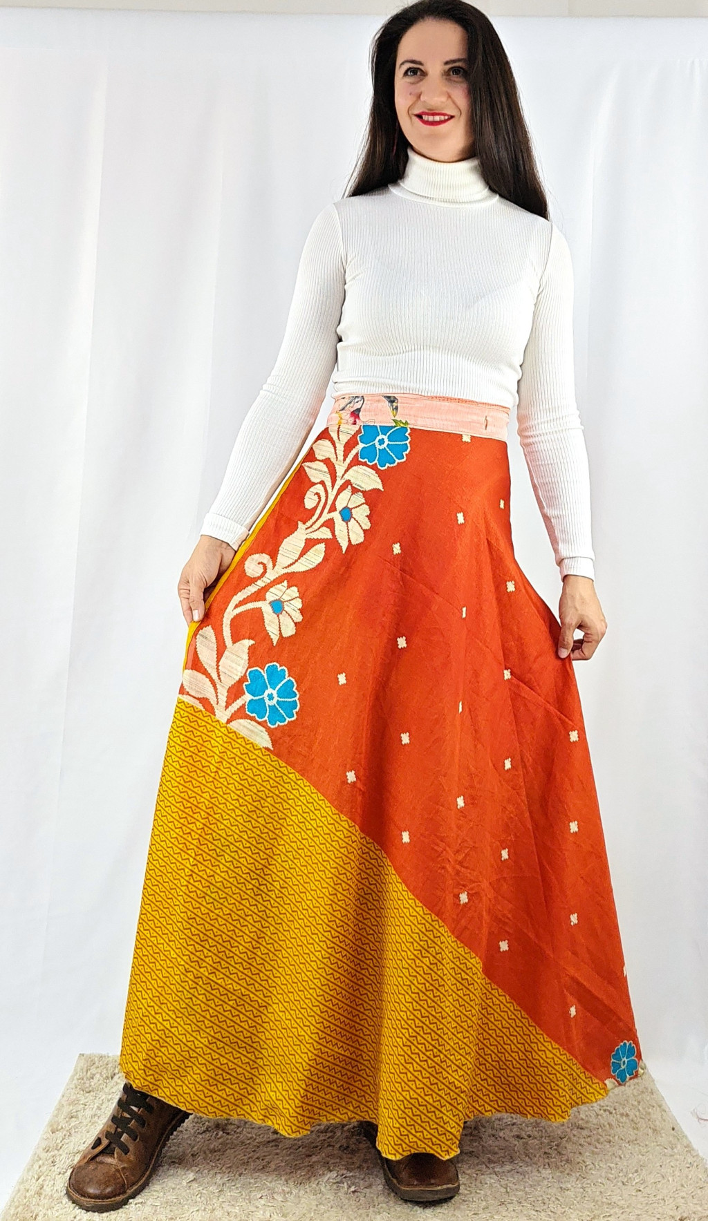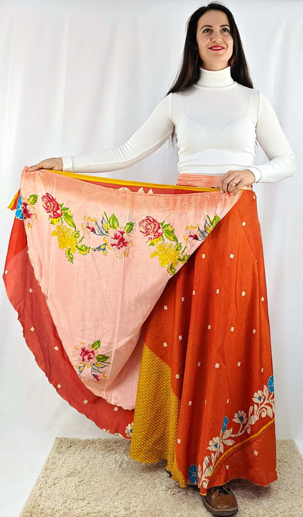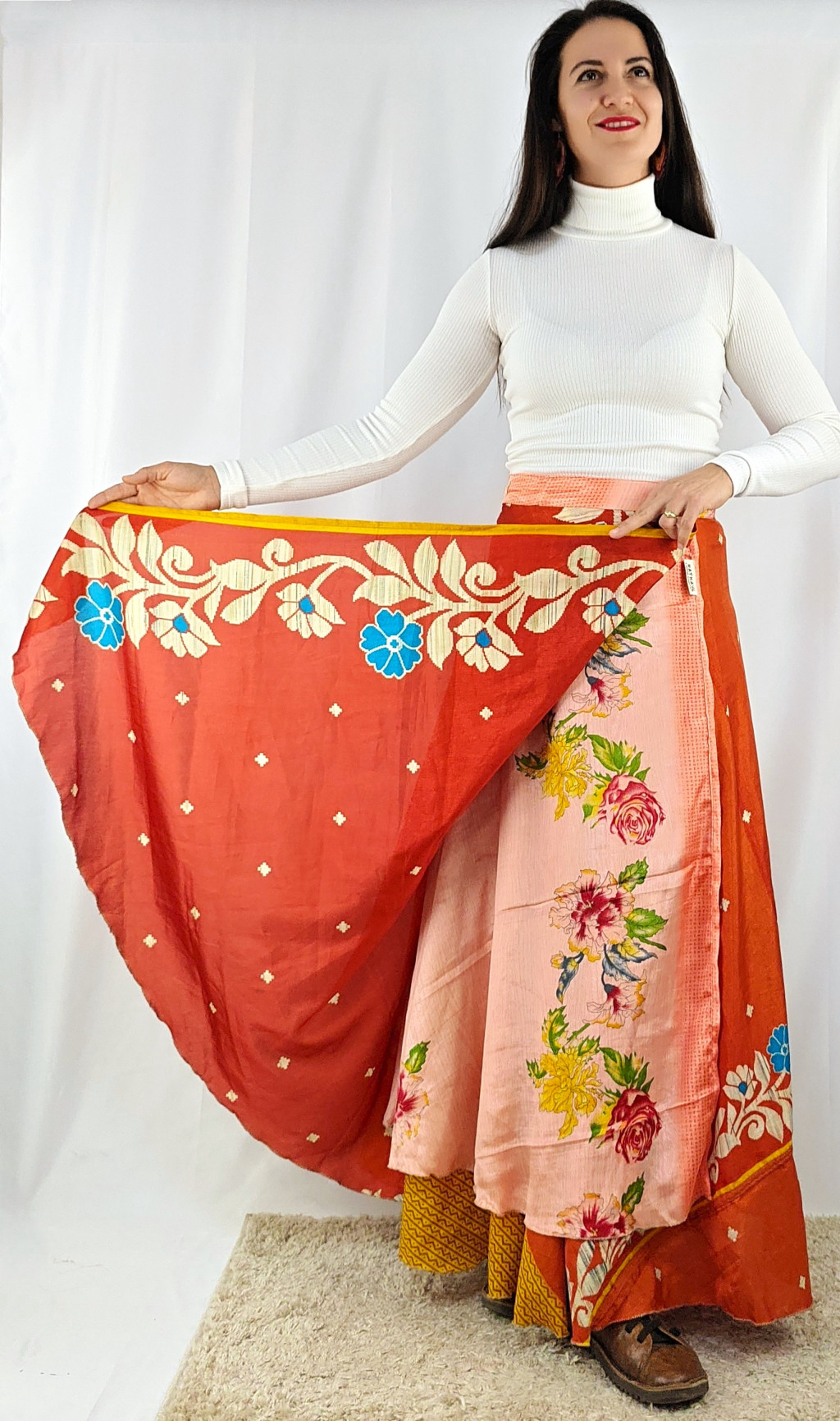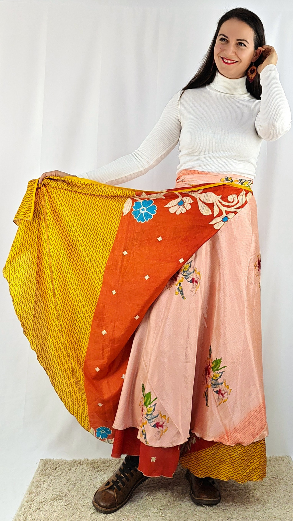 Lapszoknyáink újrahasznosított szárikból készülnek Indiában, egy hosszabb és egy rövidebb anyag derékban összevarrva! Két oldalú, kifordítható, mindkét oldala hordható, sokféleképpen köthető, variálható. Szoknyáinkból nincs két egyforma, mindegyikből csak EGY darab van, ha megtetszik, csapj le rá!