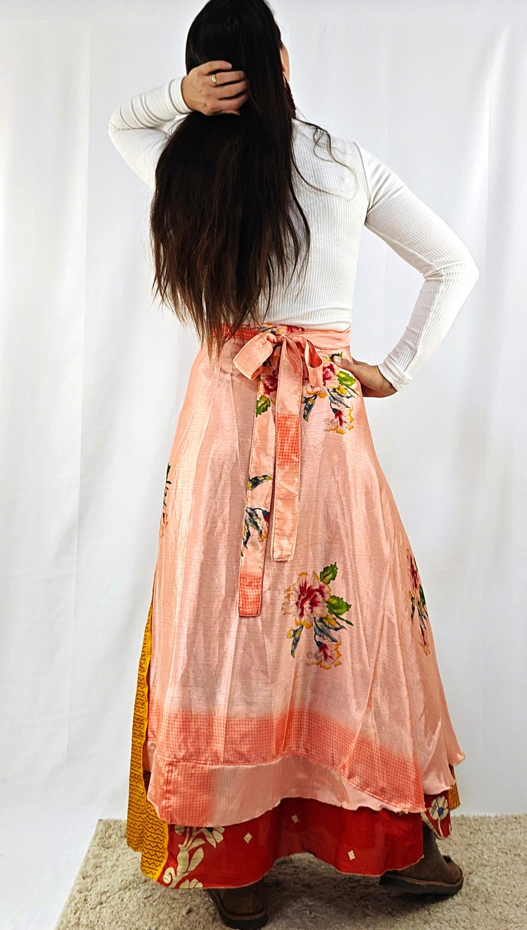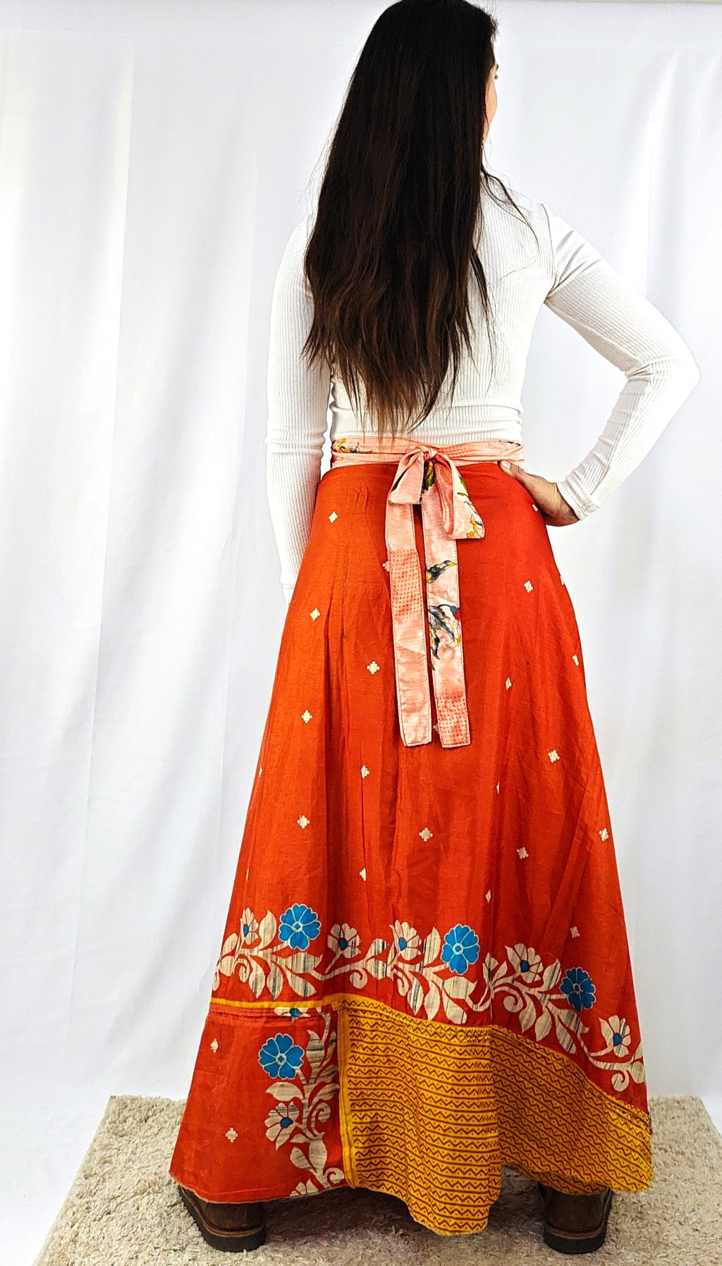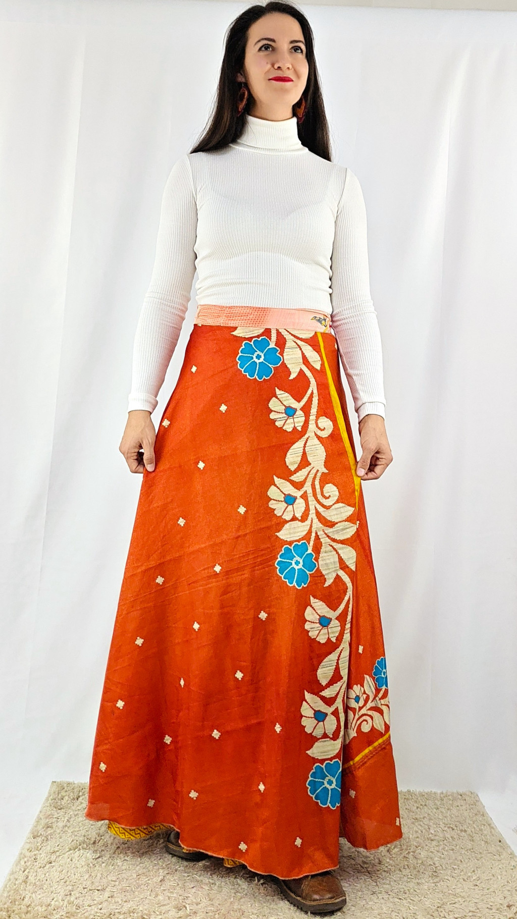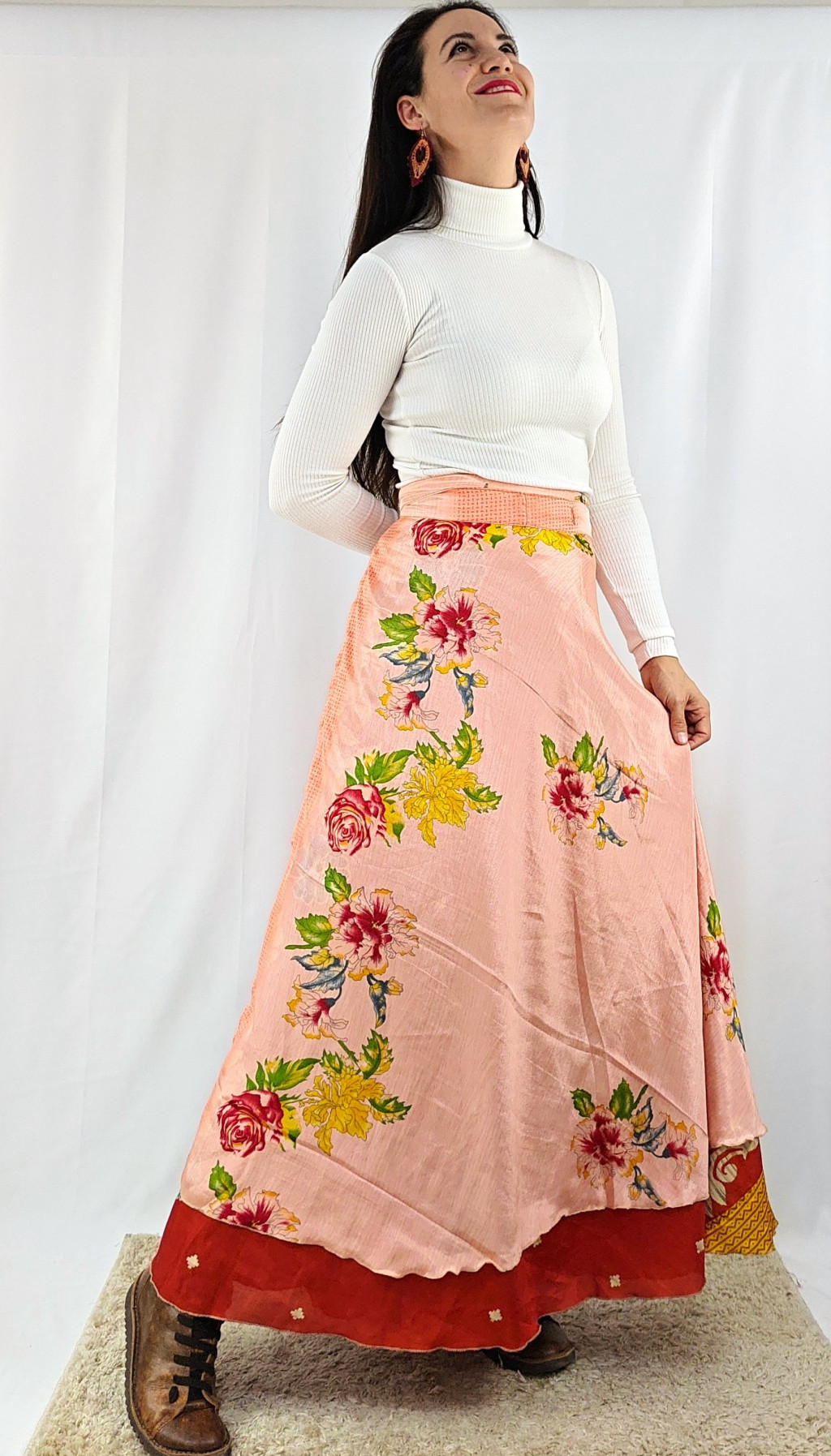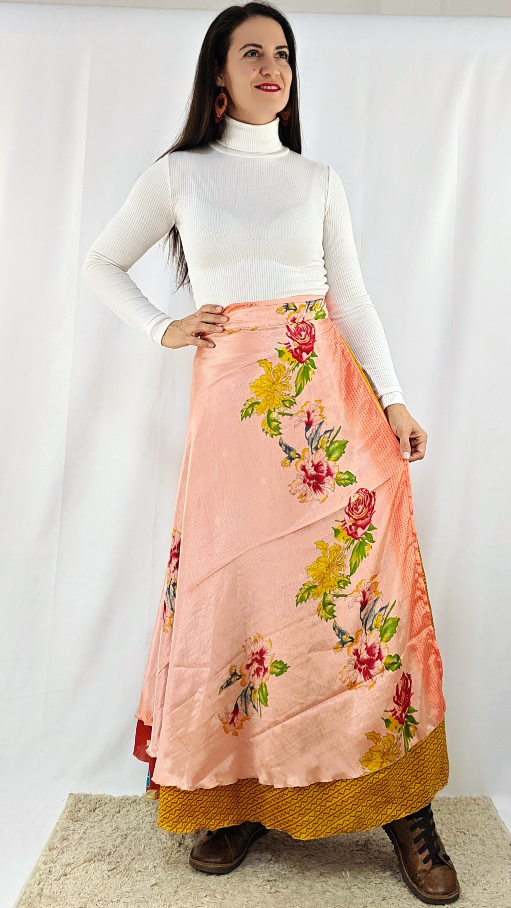 Lapszoknyáink újrahasznosított szárikból készülnek Indiában, egy hosszabb és egy rövidebb anyag derékban összevarrva! Két oldalú, kifordítható, mindkét oldala hordható, sokféleképpen köthető, variálható. Szoknyáinkból nincs két egyforma, mindegyikből csak EGY darab van, ha megtetszik, csapj le rá!