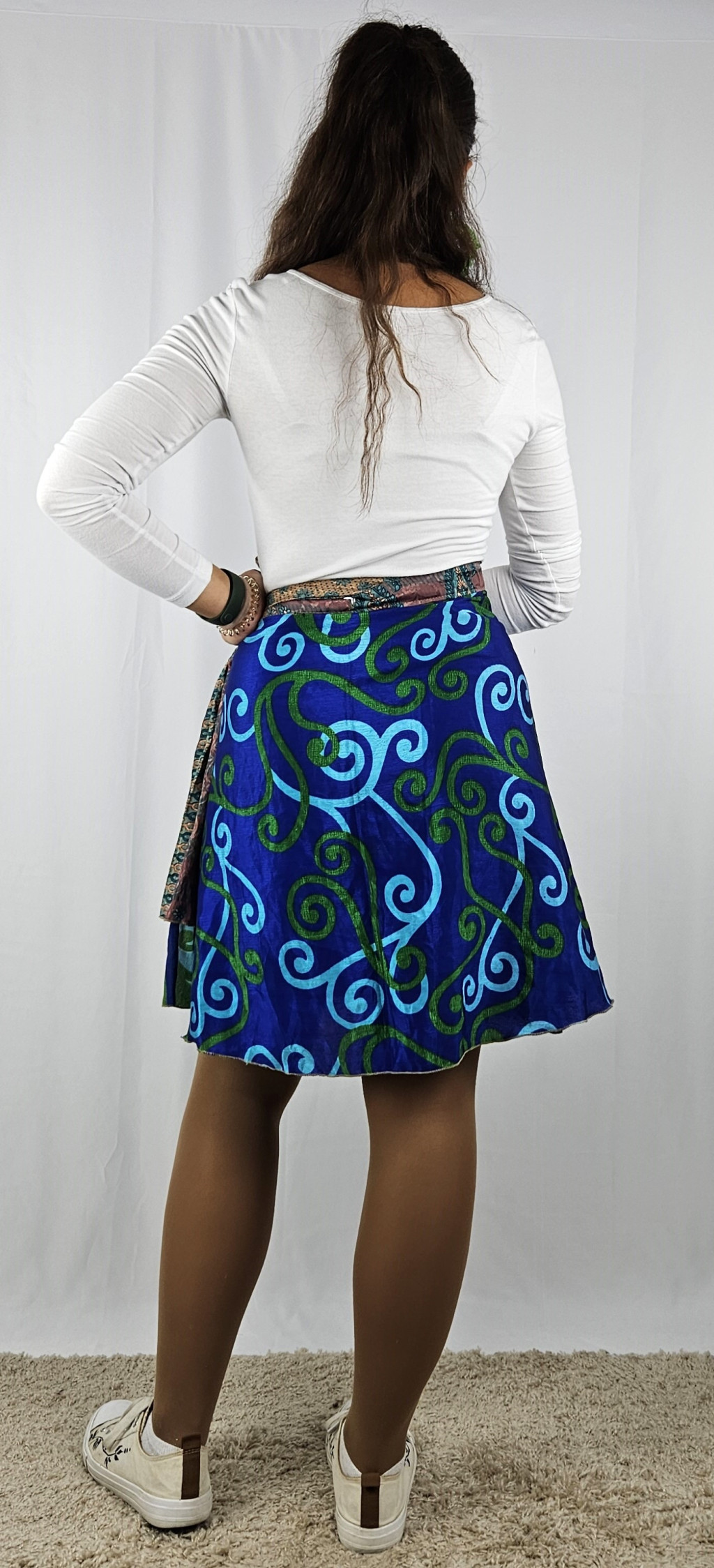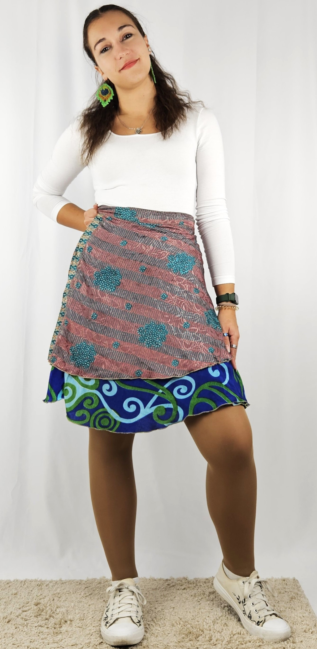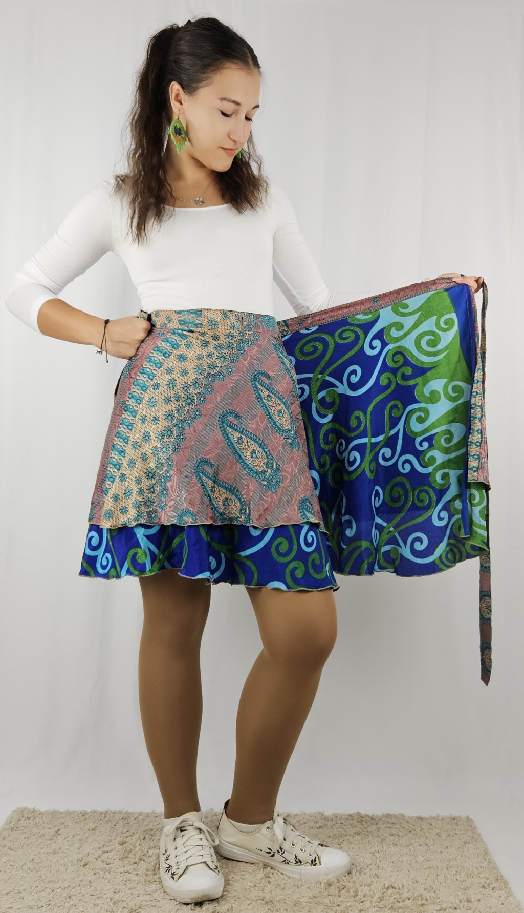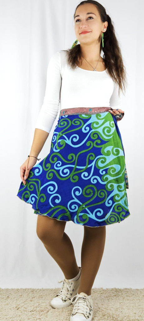 Lapszoknyáink újrahasznosított szárikból készülnek Indiában, egy hosszabb és egy rövidebb anyag derékban összevarrva! Kifordítható, mindkét oldala hordható, sokféleképpen köthető, variálható. Szoknyáinkból nincs két egyforma, mindegyikből csak EGY darab van, ha megtetszik, csapj le rá!