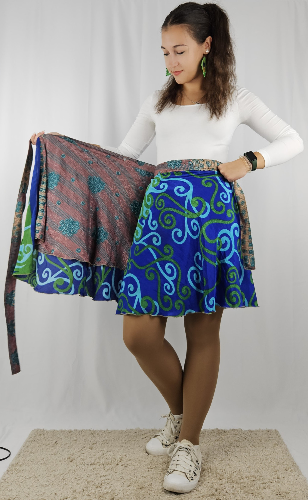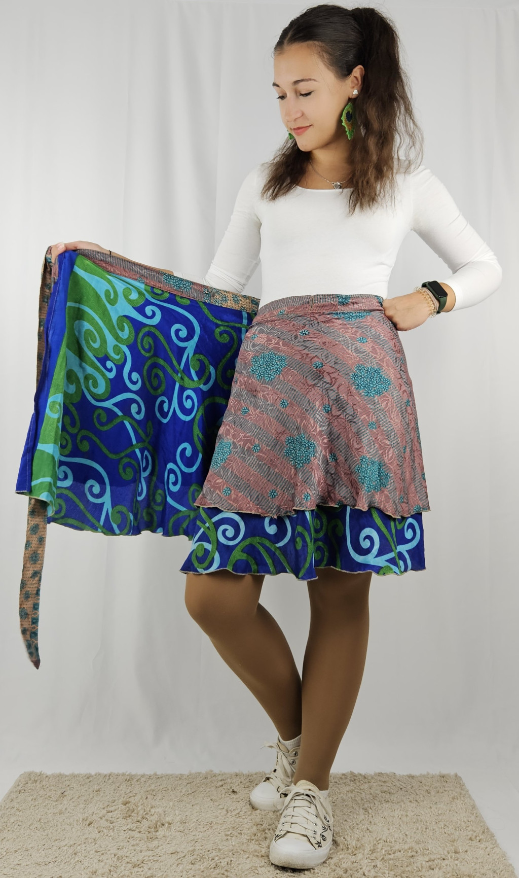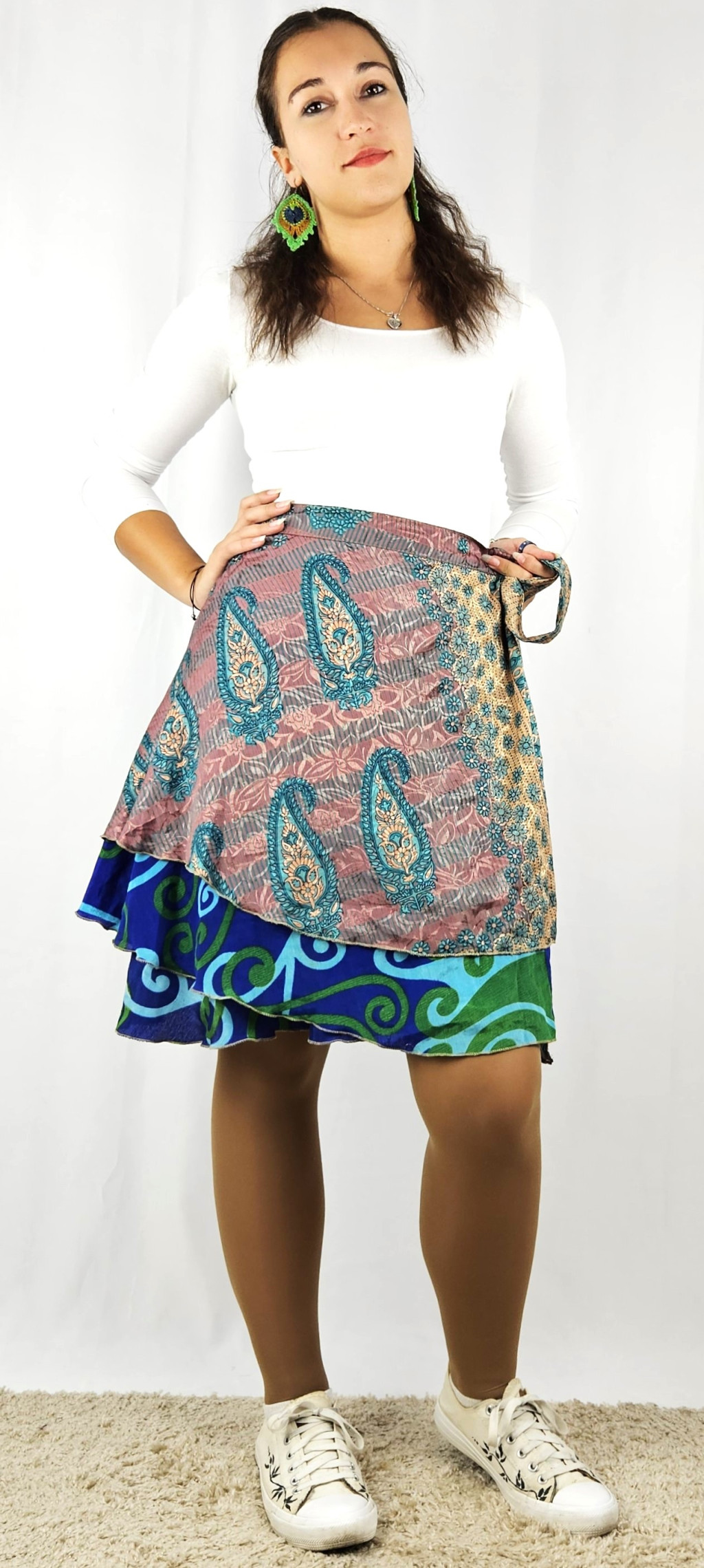 Lapszoknyáink újrahasznosított szárikból készülnek Indiában, egy hosszabb és egy rövidebb anyag derékban összevarrva! Kifordítható, mindkét oldala hordható, sokféleképpen köthető, variálható. Szoknyáinkból nincs két egyforma, mindegyikből csak EGY darab van, ha megtetszik, csapj le rá!