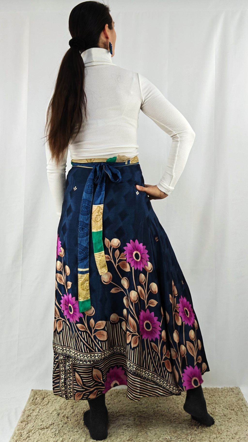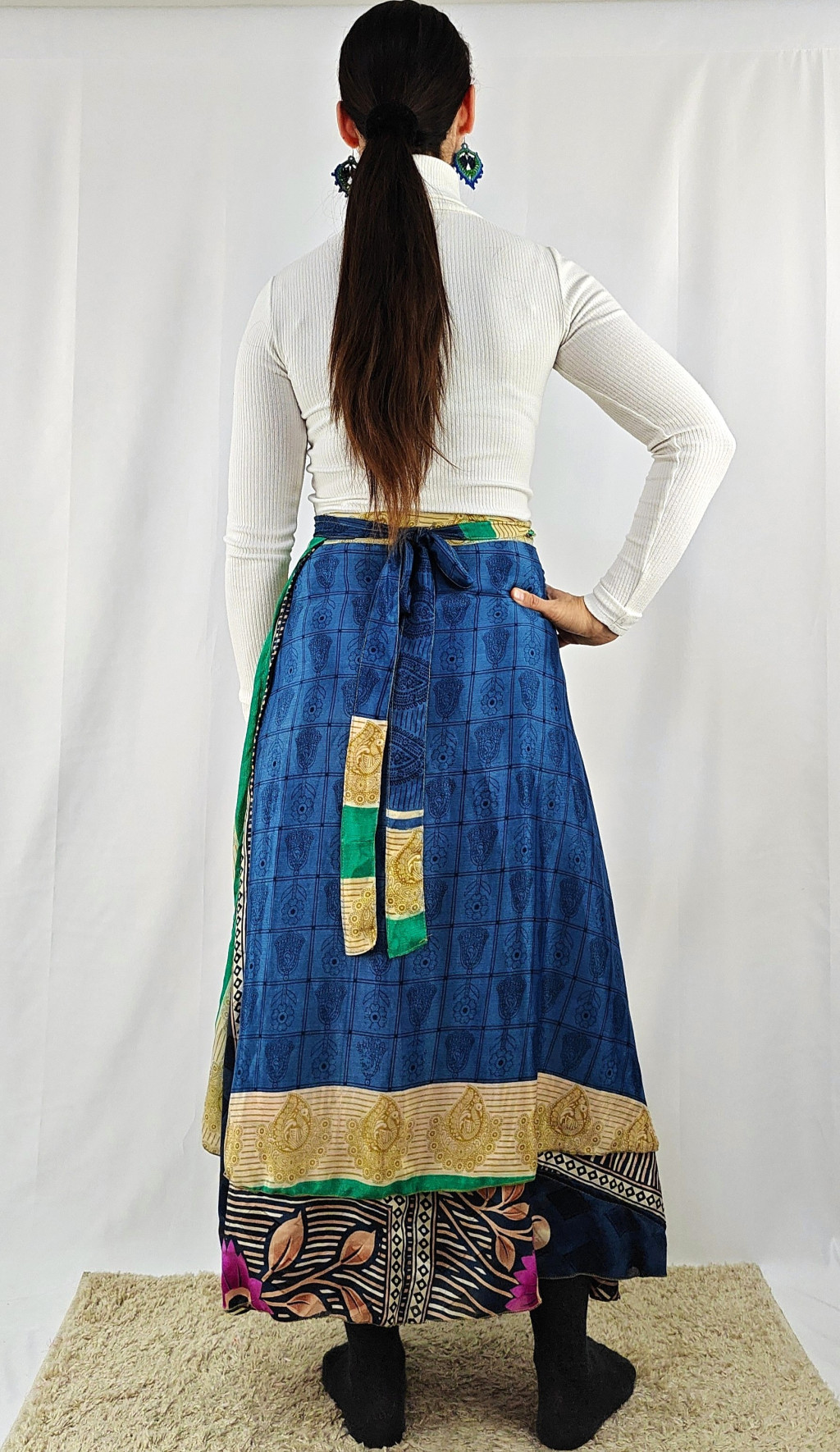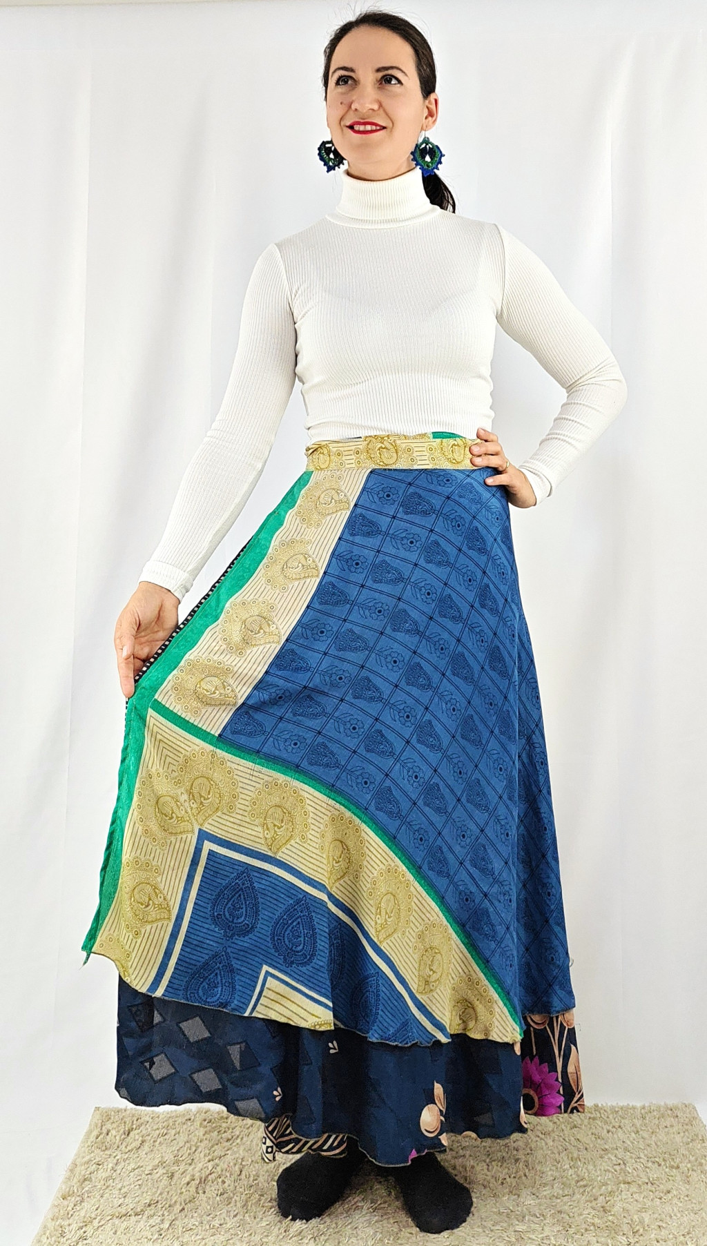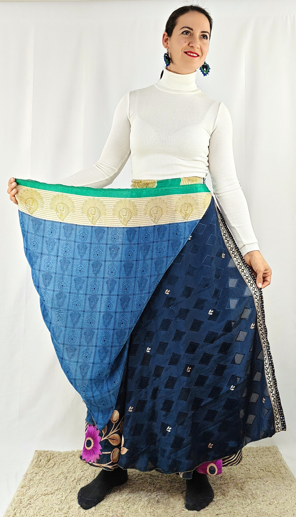 Lapszoknyáink újrahasznosított szárikból készülnek Indiában, egy hosszabb és egy rövidebb anyag derékban összevarrva! Két oldalú, kifordítható, mindkét oldala hordható, sokféleképpen köthető, variálható. Szoknyáinkból nincs két egyforma, mindegyikből csak EGY darab van, ha megtetszik, csapj le rá!
