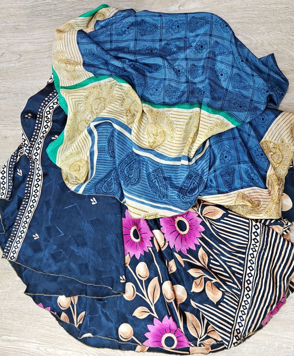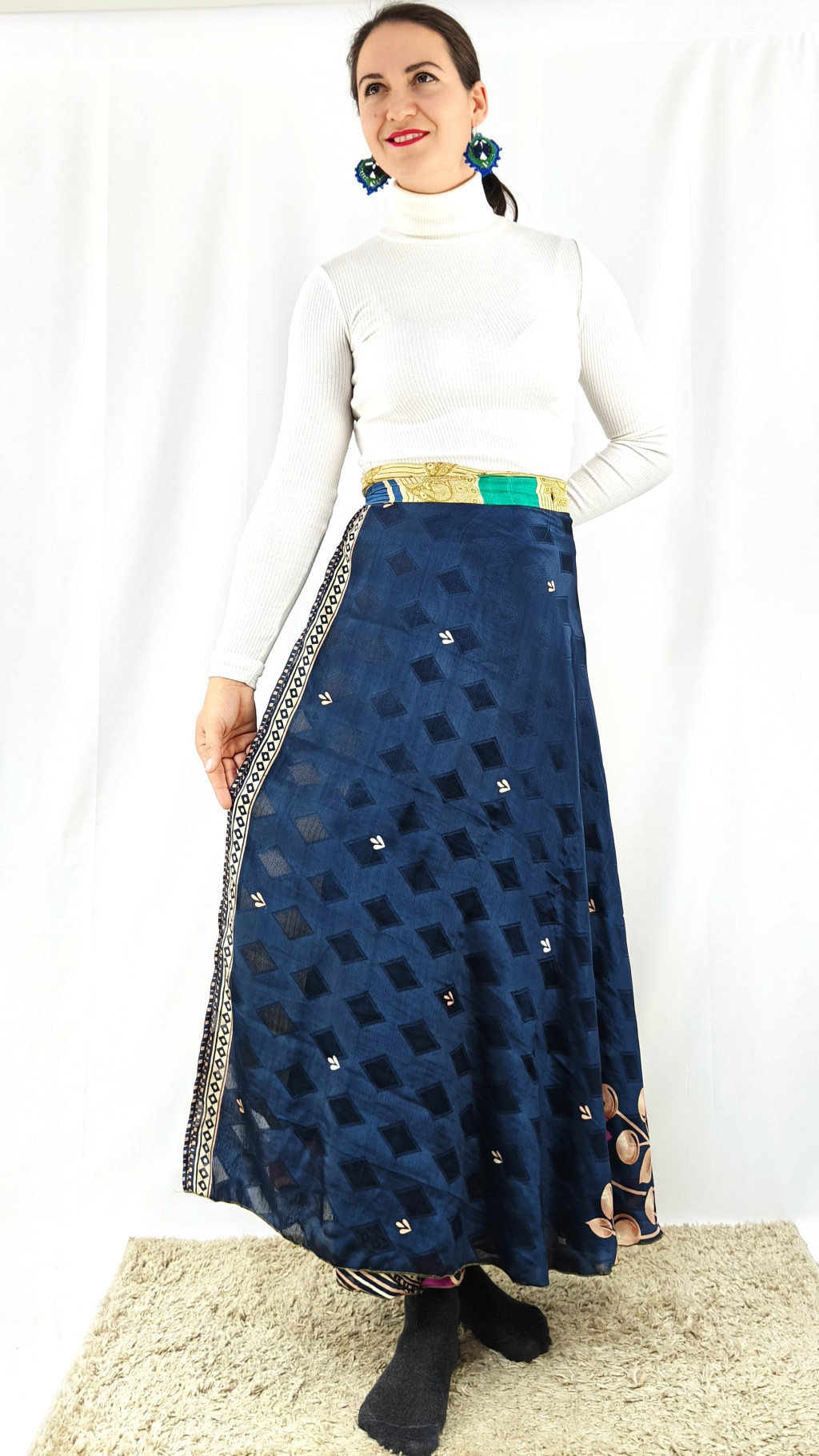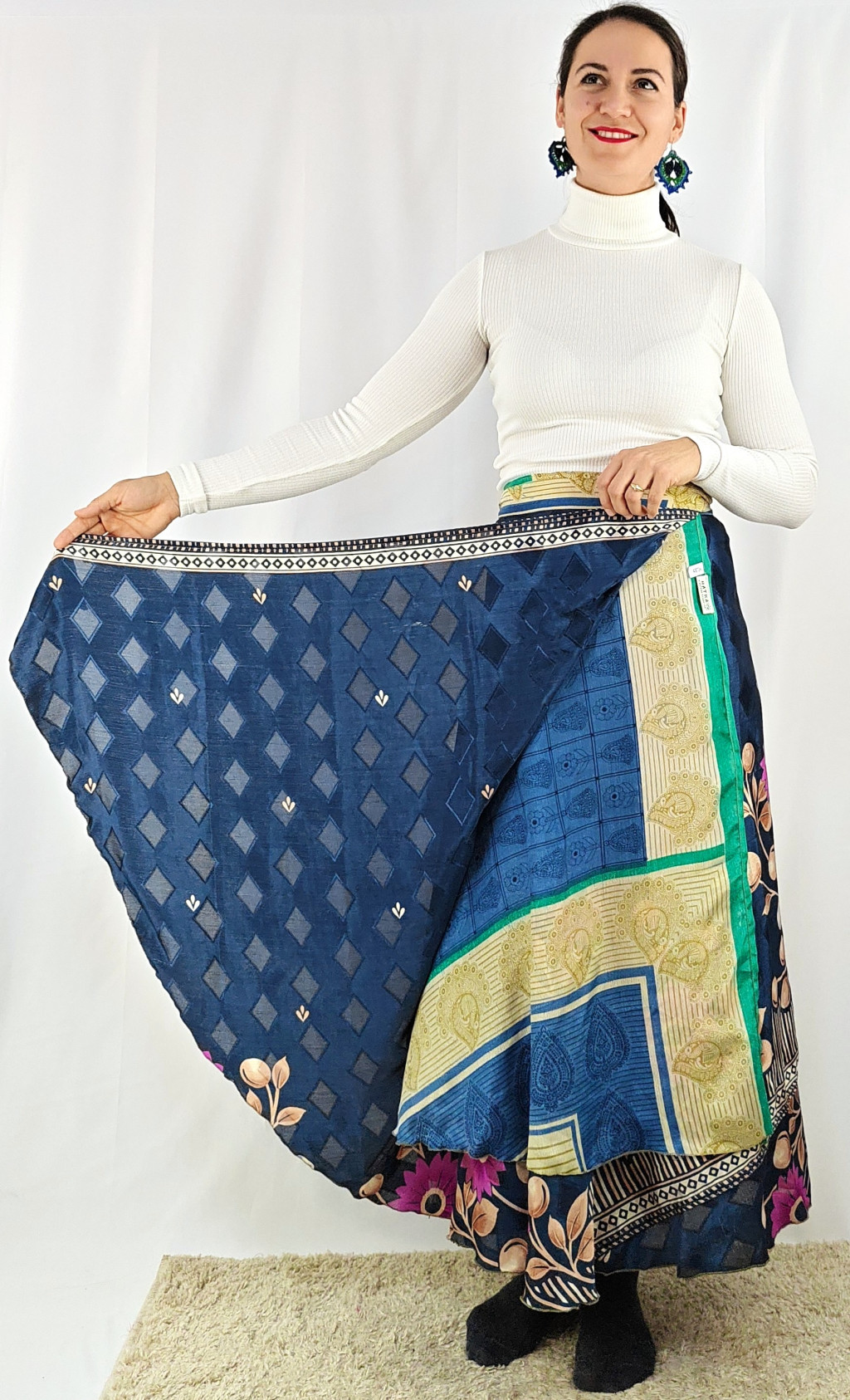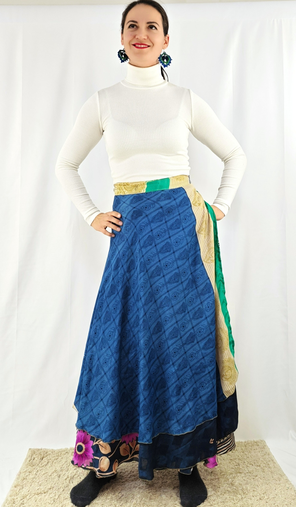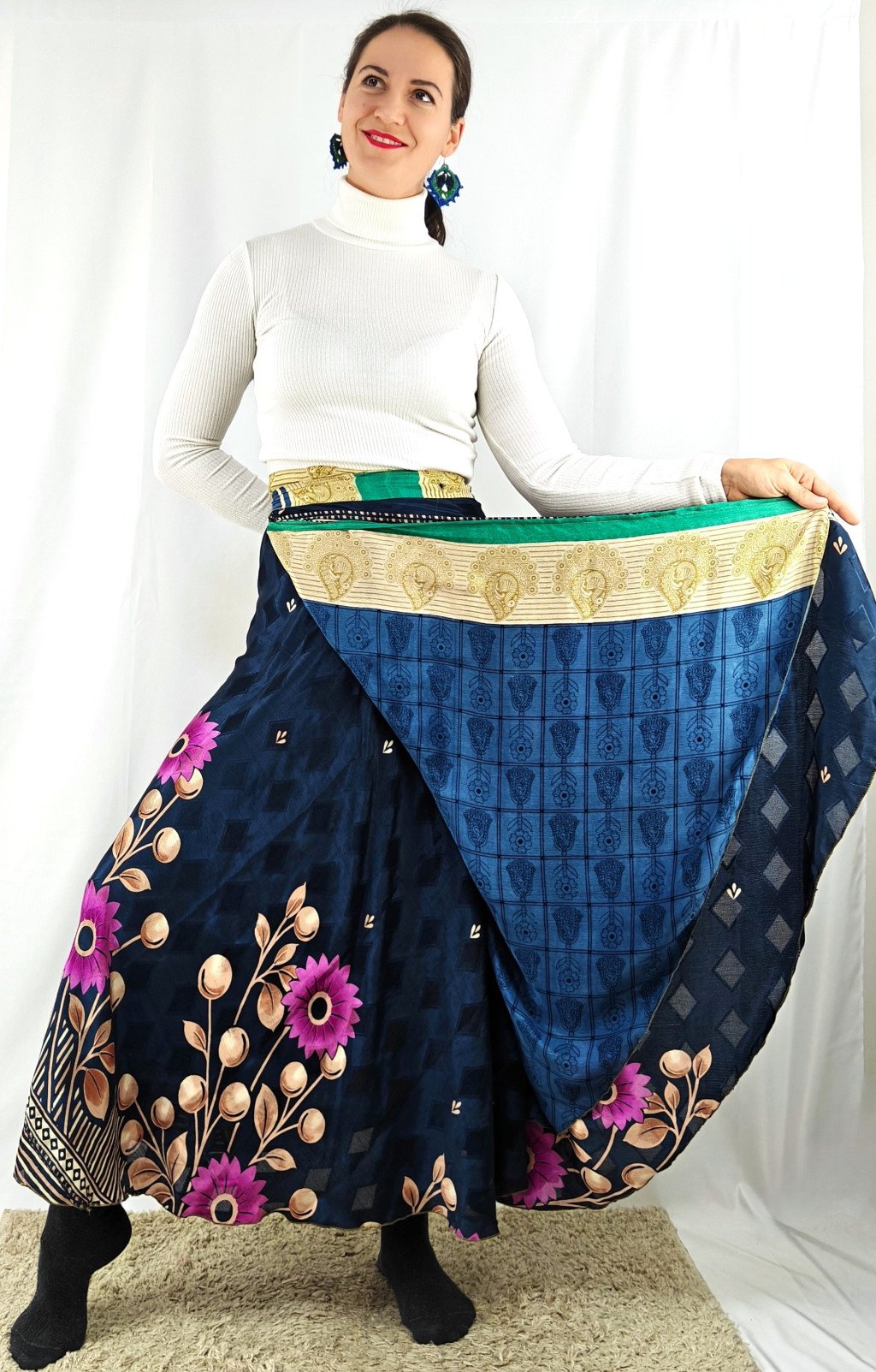 Lapszoknyáink újrahasznosított szárikból készülnek Indiában, egy hosszabb és egy rövidebb anyag derékban összevarrva! Két oldalú, kifordítható, mindkét oldala hordható, sokféleképpen köthető, variálható. Szoknyáinkból nincs két egyforma, mindegyikből csak EGY darab van, ha megtetszik, csapj le rá!