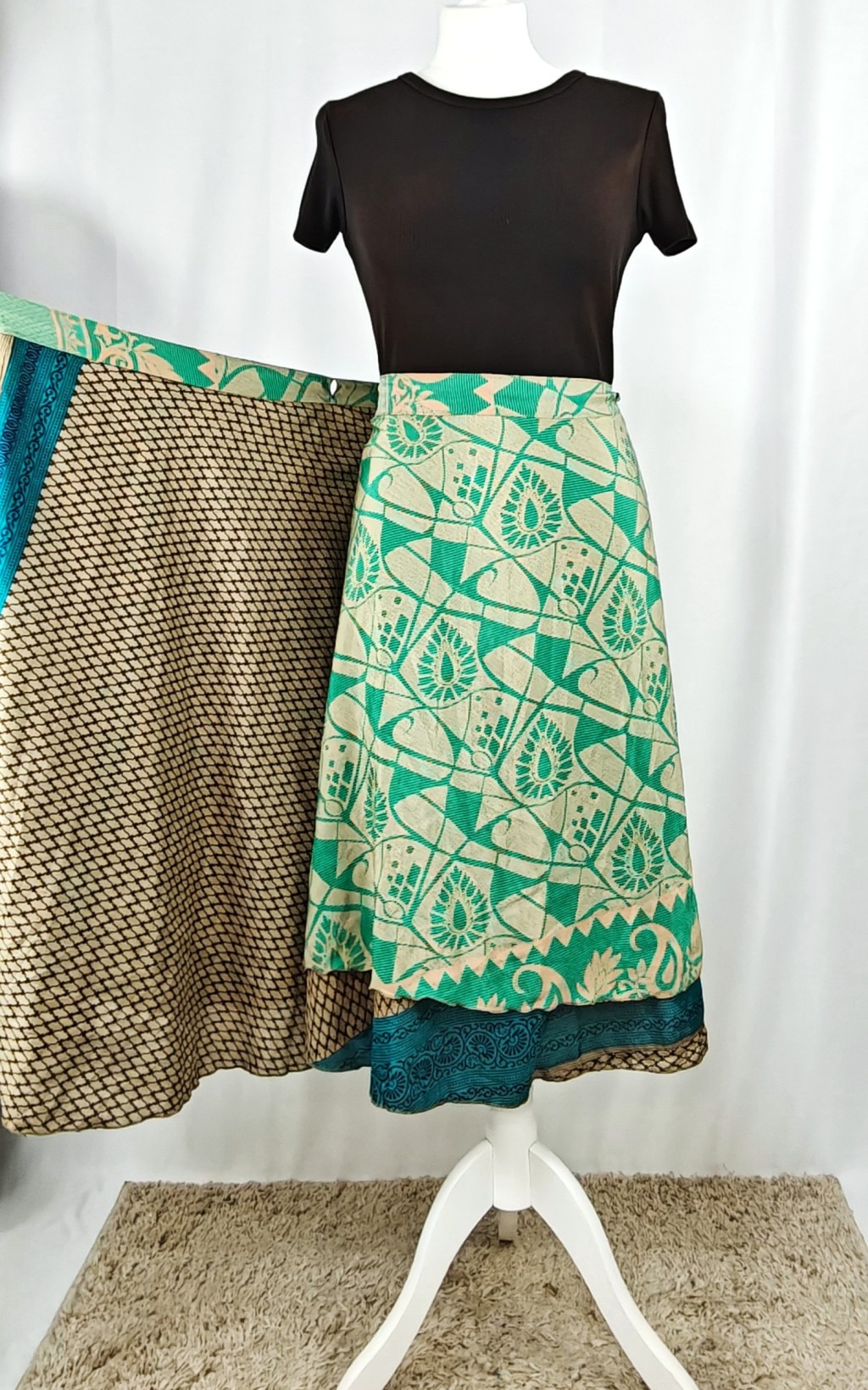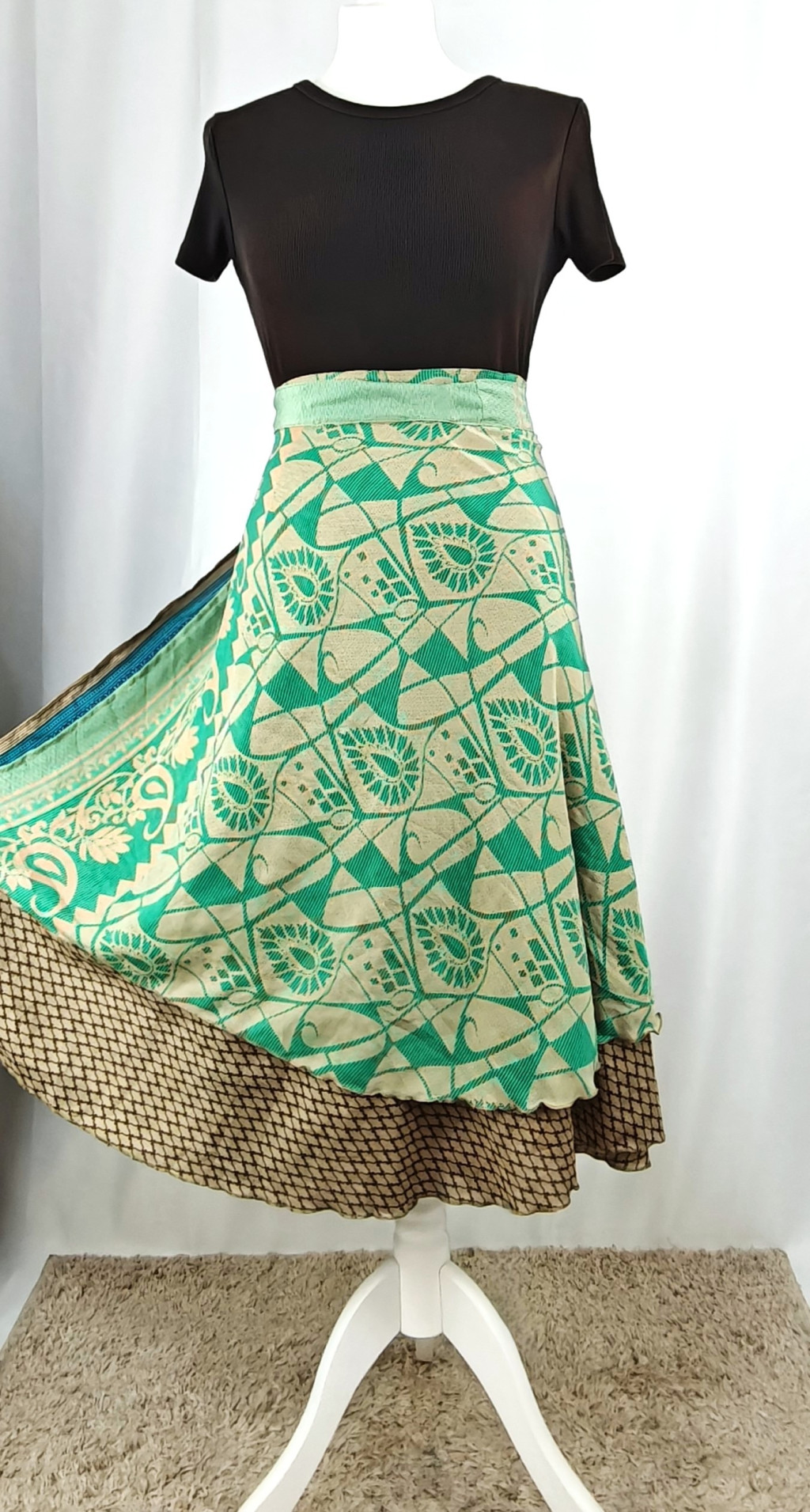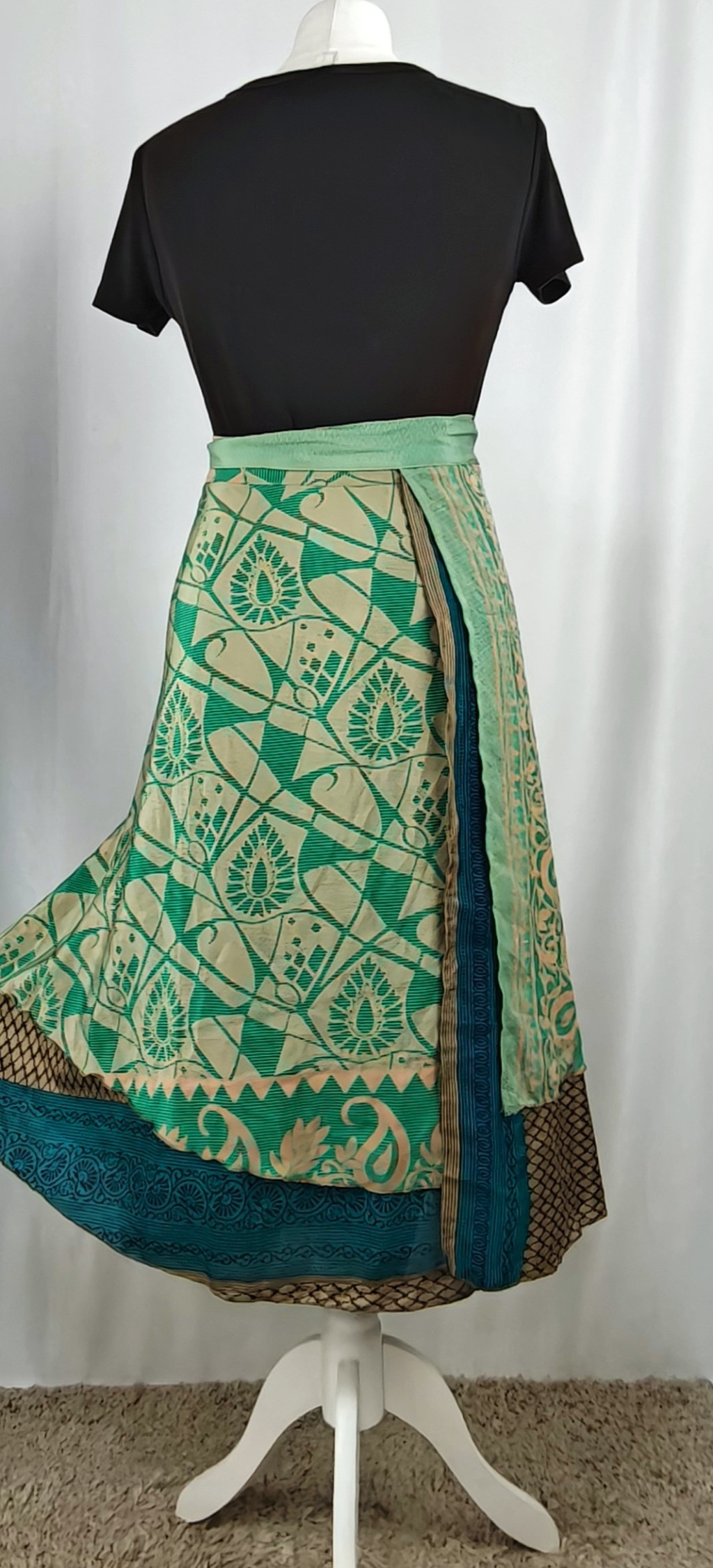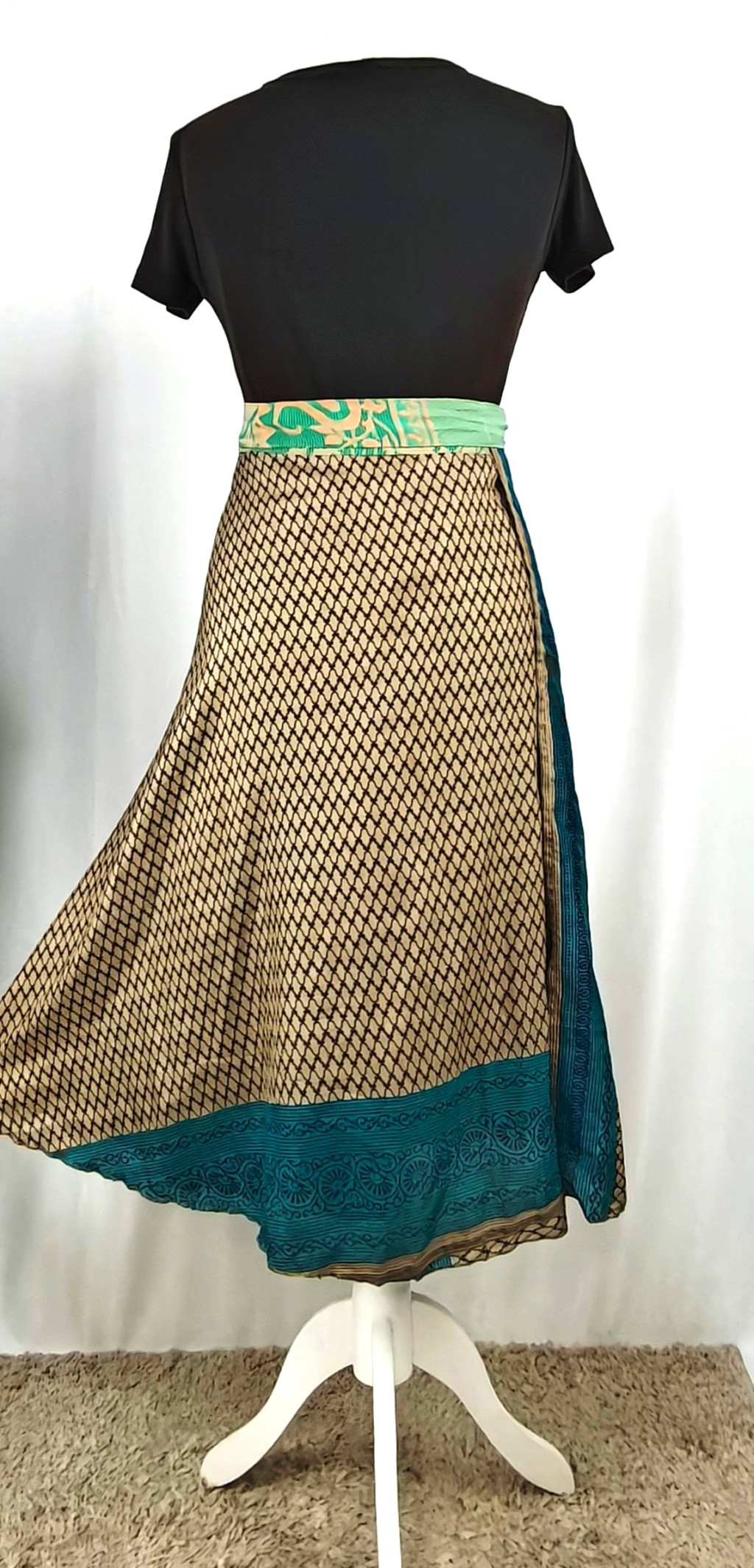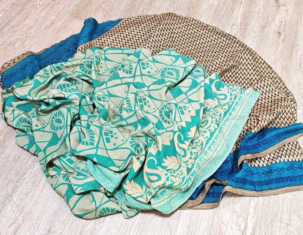 Lapszoknyáink újrahasznosított szárikból készülnek Indiában, egy hosszabb és egy rövidebb anyag derékban összevarrva! Két oldalú, kifordítható, mindkét oldala hordható, sokféleképpen köthető, variálható. Szoknyáinkból nincs két egyforma, mindegyikből csak EGY darab van, ha megtetszik, csapj le rá!