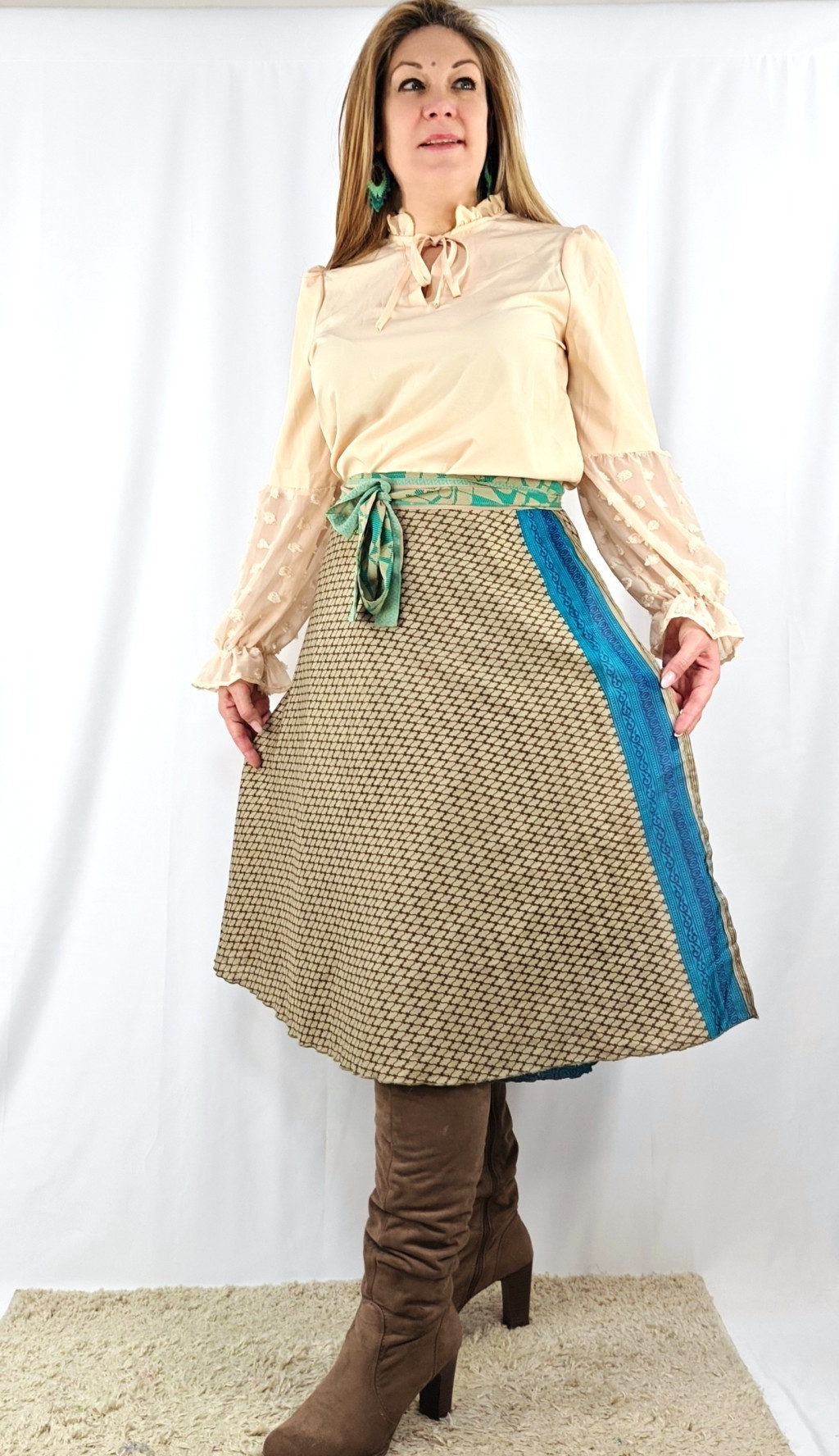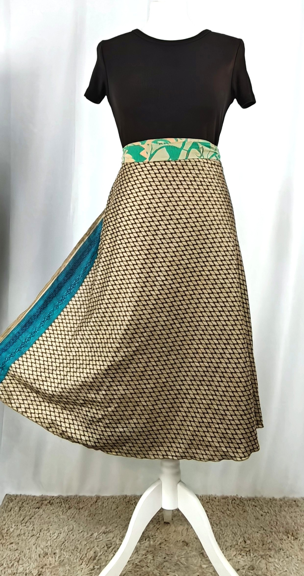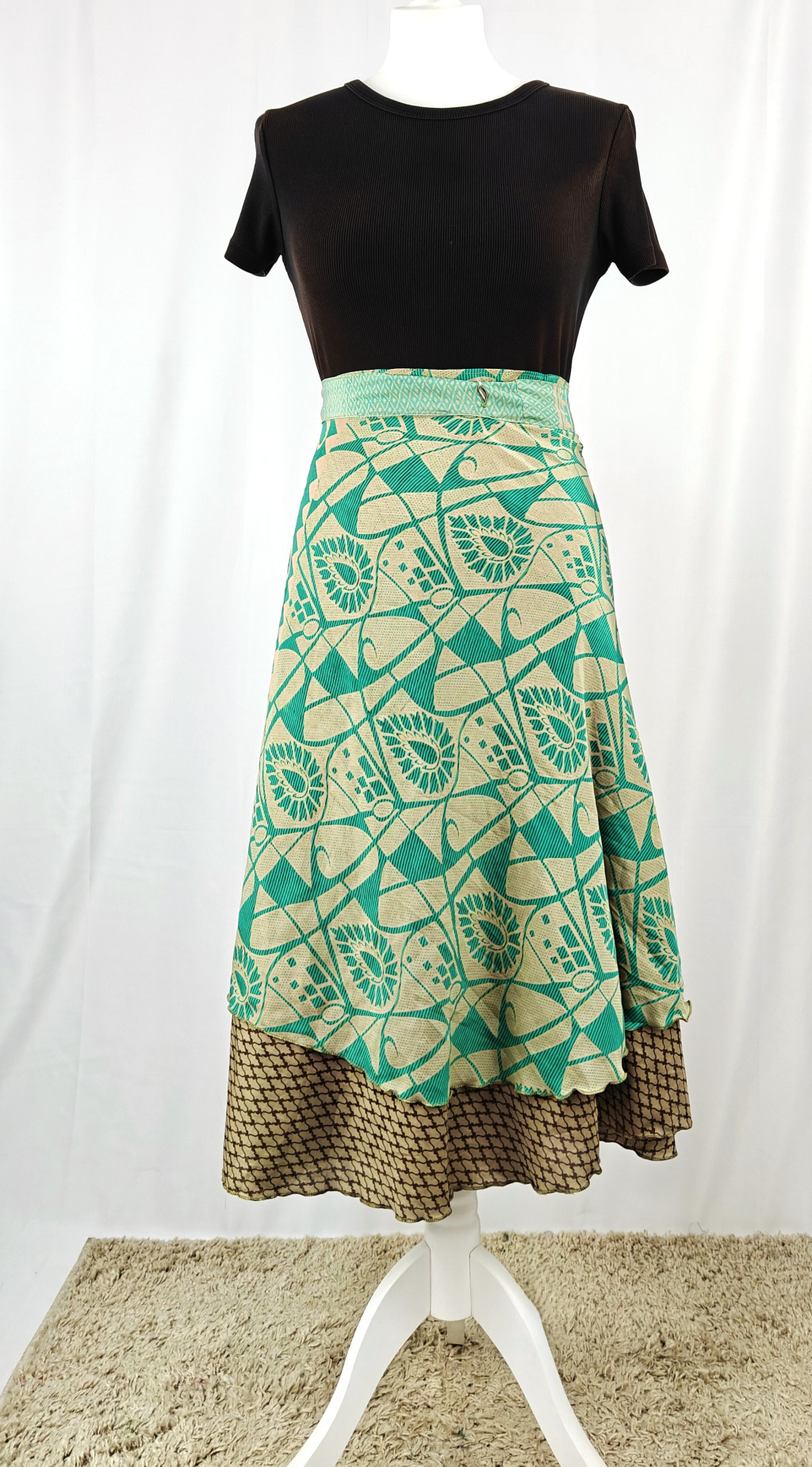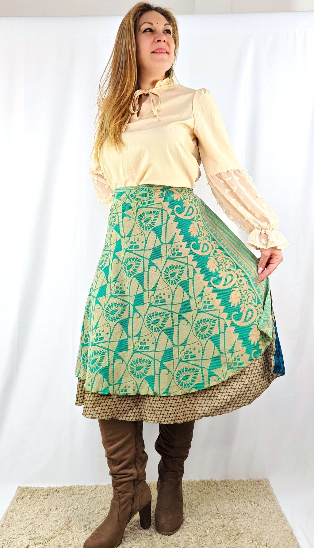 Lapszoknyáink újrahasznosított szárikból készülnek Indiában, egy hosszabb és egy rövidebb anyag derékban összevarrva! Két oldalú, kifordítható, mindkét oldala hordható, sokféleképpen köthető, variálható. Szoknyáinkból nincs két egyforma, mindegyikből csak EGY darab van, ha megtetszik, csapj le rá!