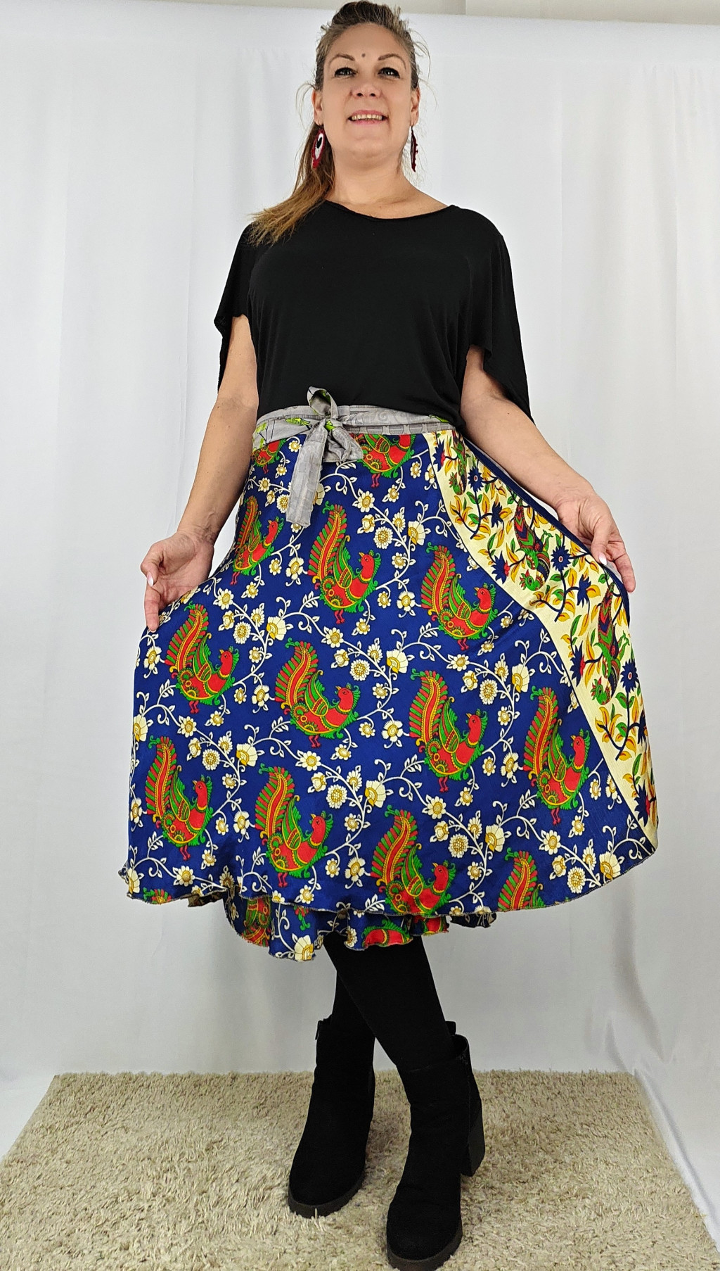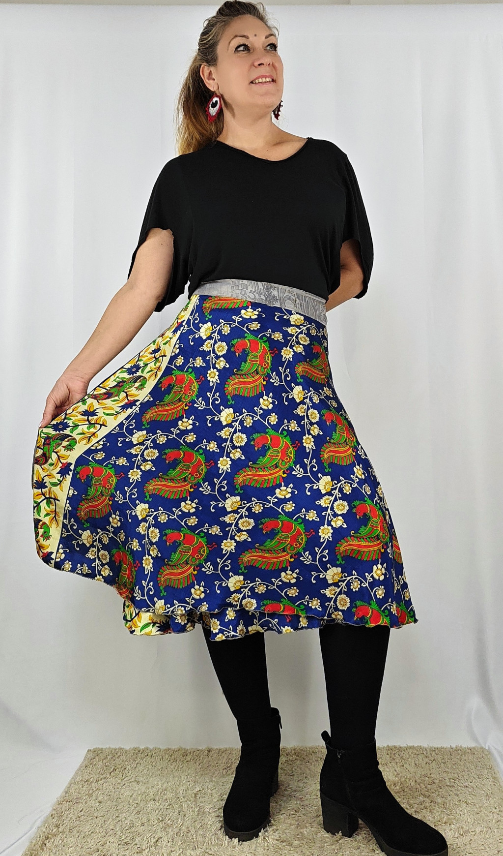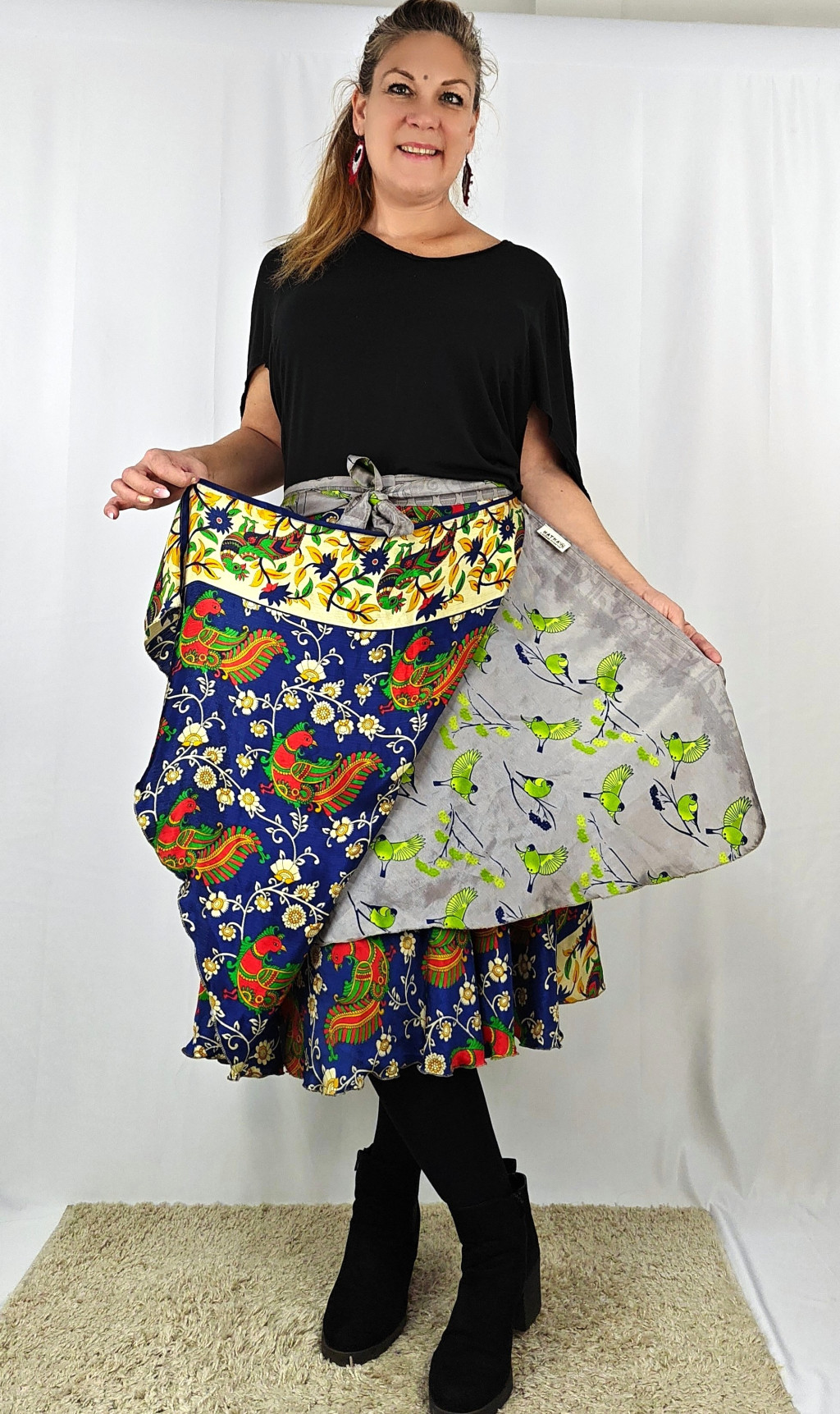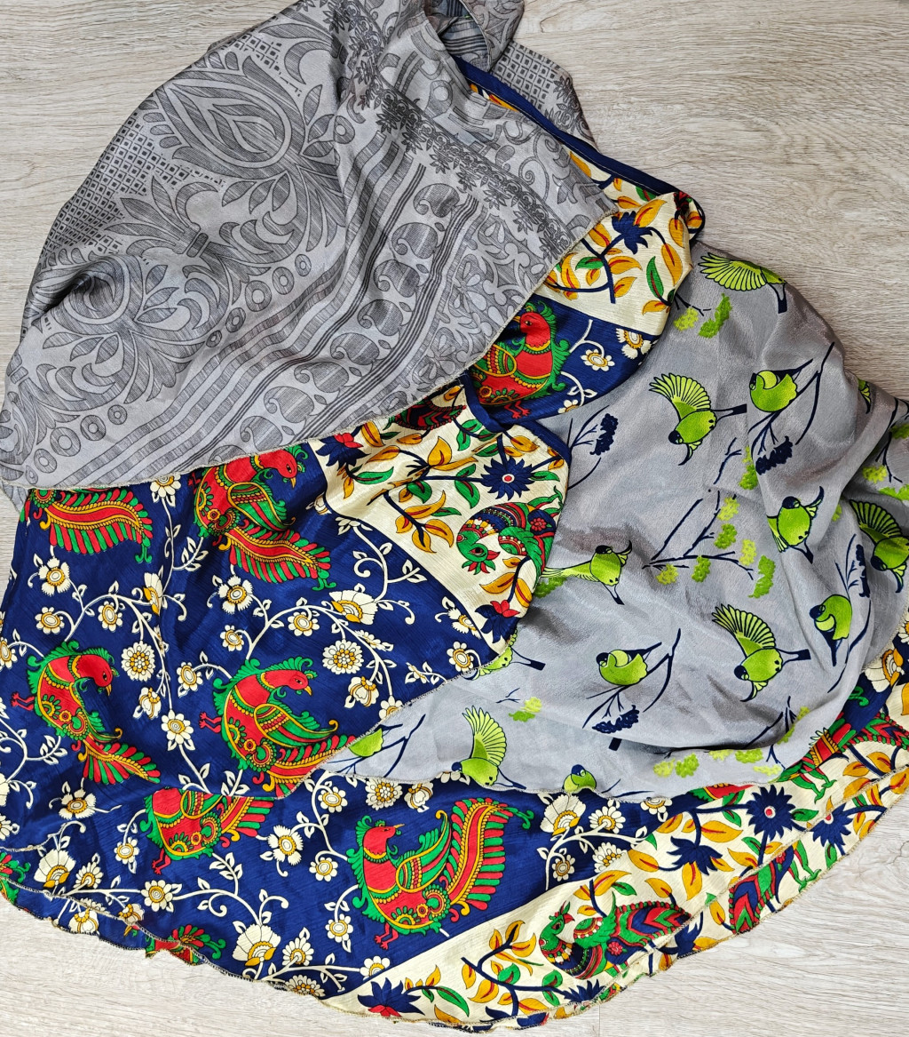 Lapszoknyáink újrahasznosított szárikból készülnek Indiában, egy hosszabb és egy rövidebb anyag derékban összevarrva! Két oldalú, kifordítható, mindkét oldala hordható, sokféleképpen köthető, variálható. Szoknyáinkból nincs két egyforma, mindegyikből csak EGY darab van, ha megtetszik, csapj le rá!