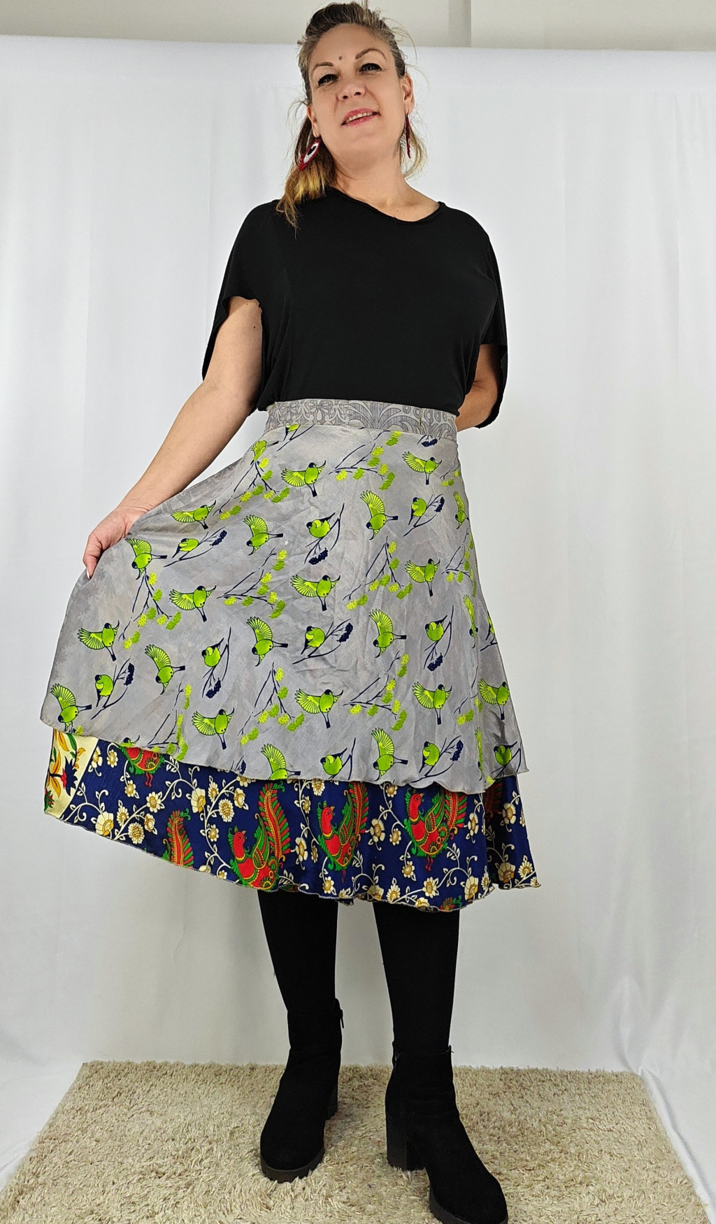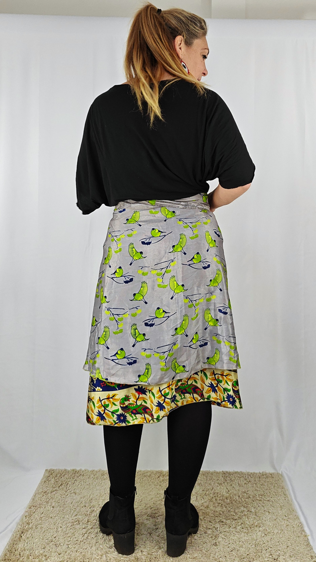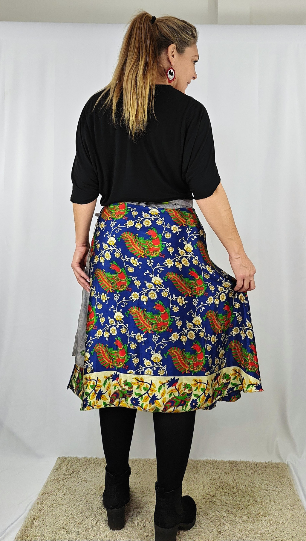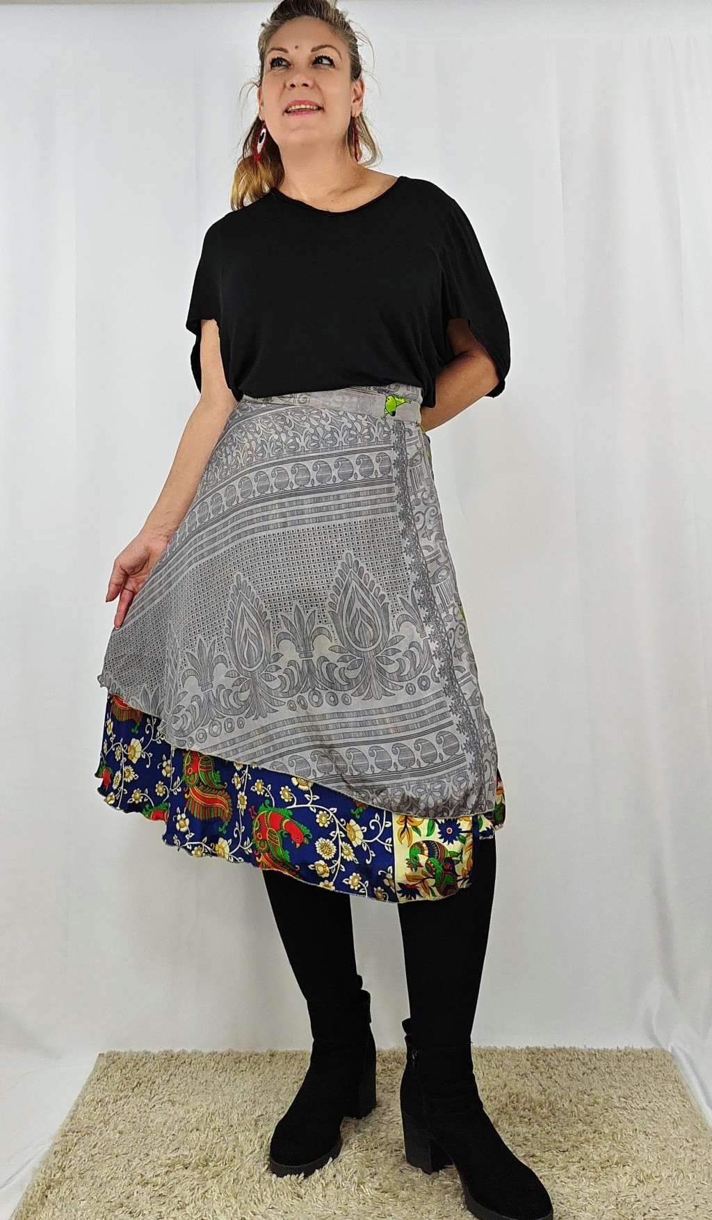 Lapszoknyáink újrahasznosított szárikból készülnek Indiában, egy hosszabb és egy rövidebb anyag derékban összevarrva! Két oldalú, kifordítható, mindkét oldala hordható, sokféleképpen köthető, variálható. Szoknyáinkból nincs két egyforma, mindegyikből csak EGY darab van, ha megtetszik, csapj le rá!