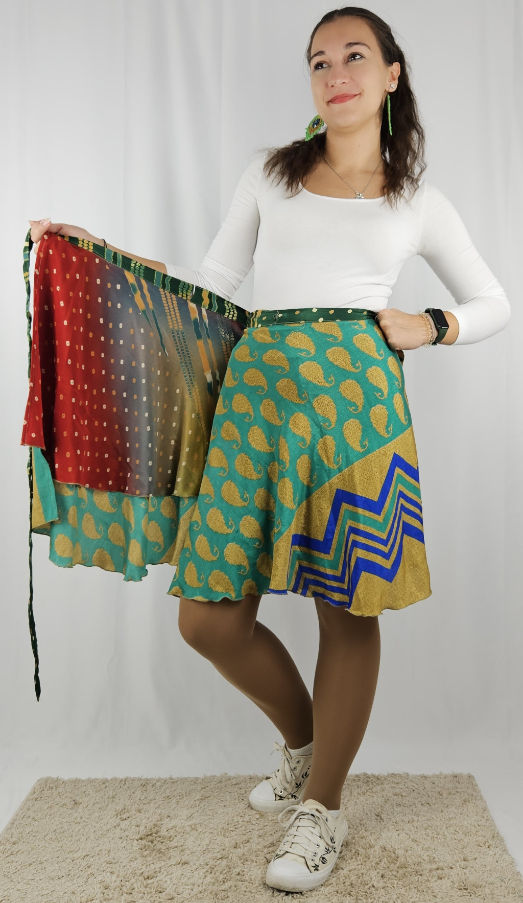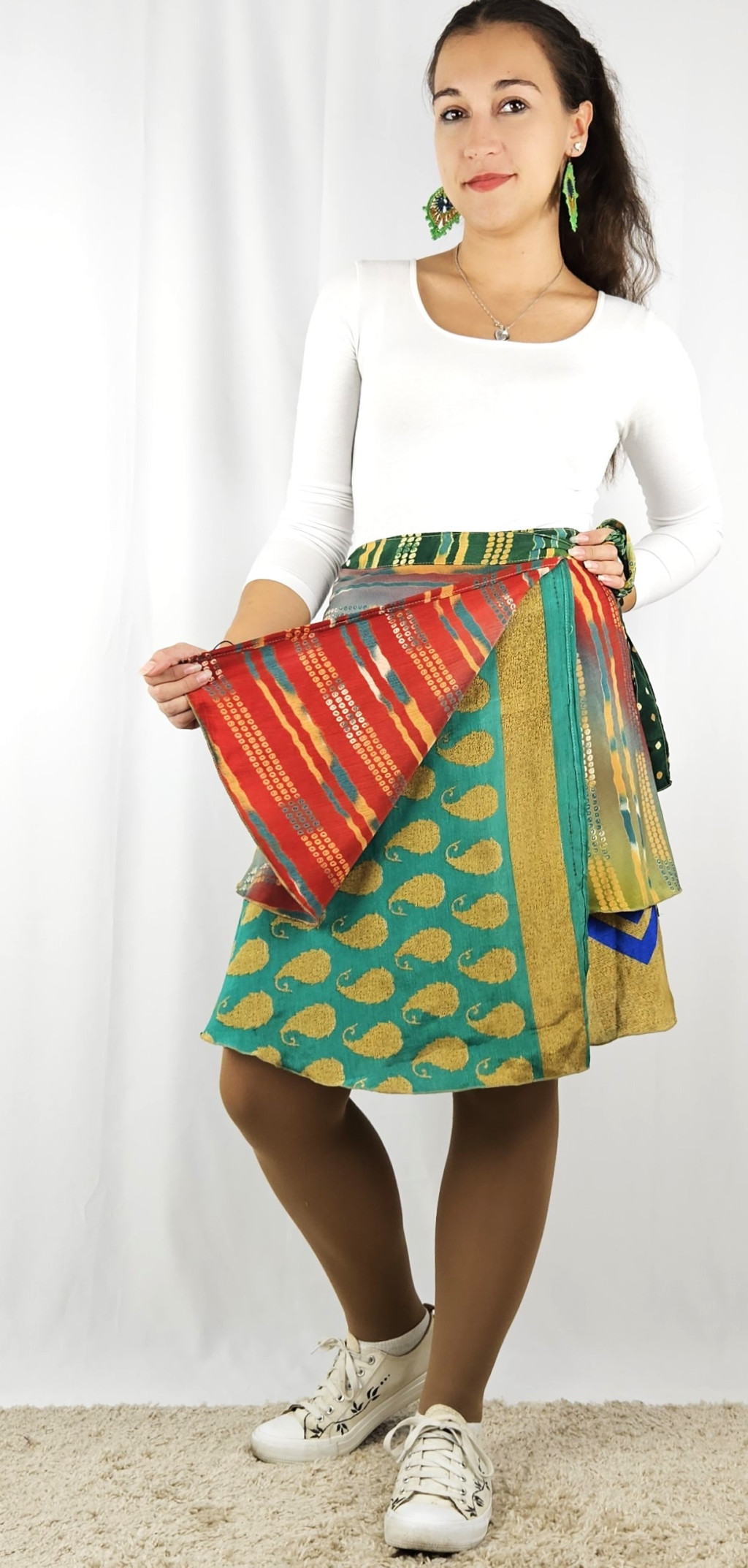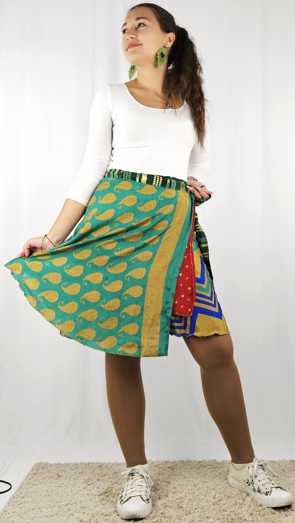 Lapszoknyáink újrahasznosított szárikból készülnek Indiában, egy hosszabb és egy rövidebb anyag derékban összevarrva! Kifordítható, mindkét oldala hordható, sokféleképpen köthető, variálható. Szoknyáinkból nincs két egyforma, mindegyikből csak EGY darab van, ha megtetszik, csapj le rá!