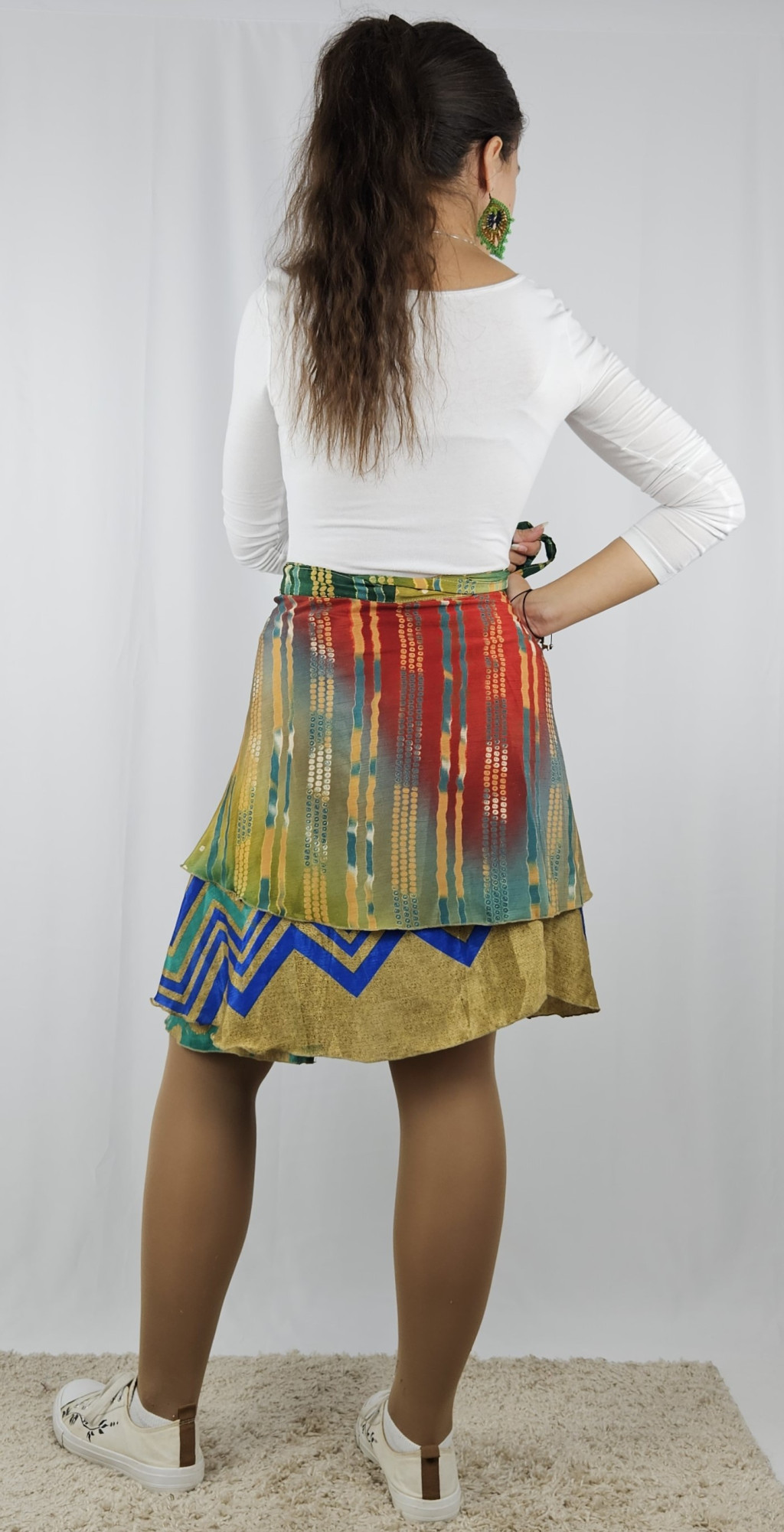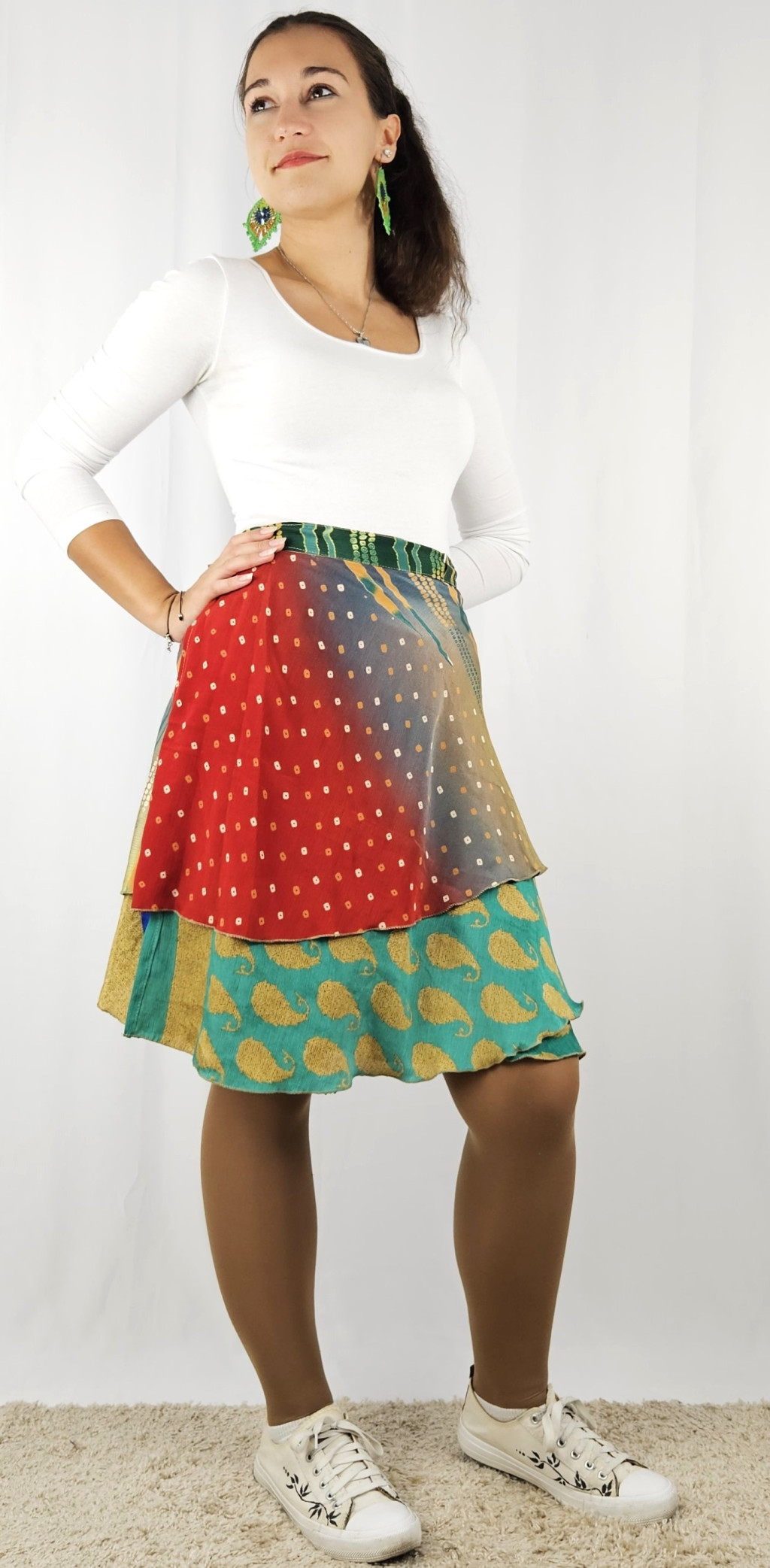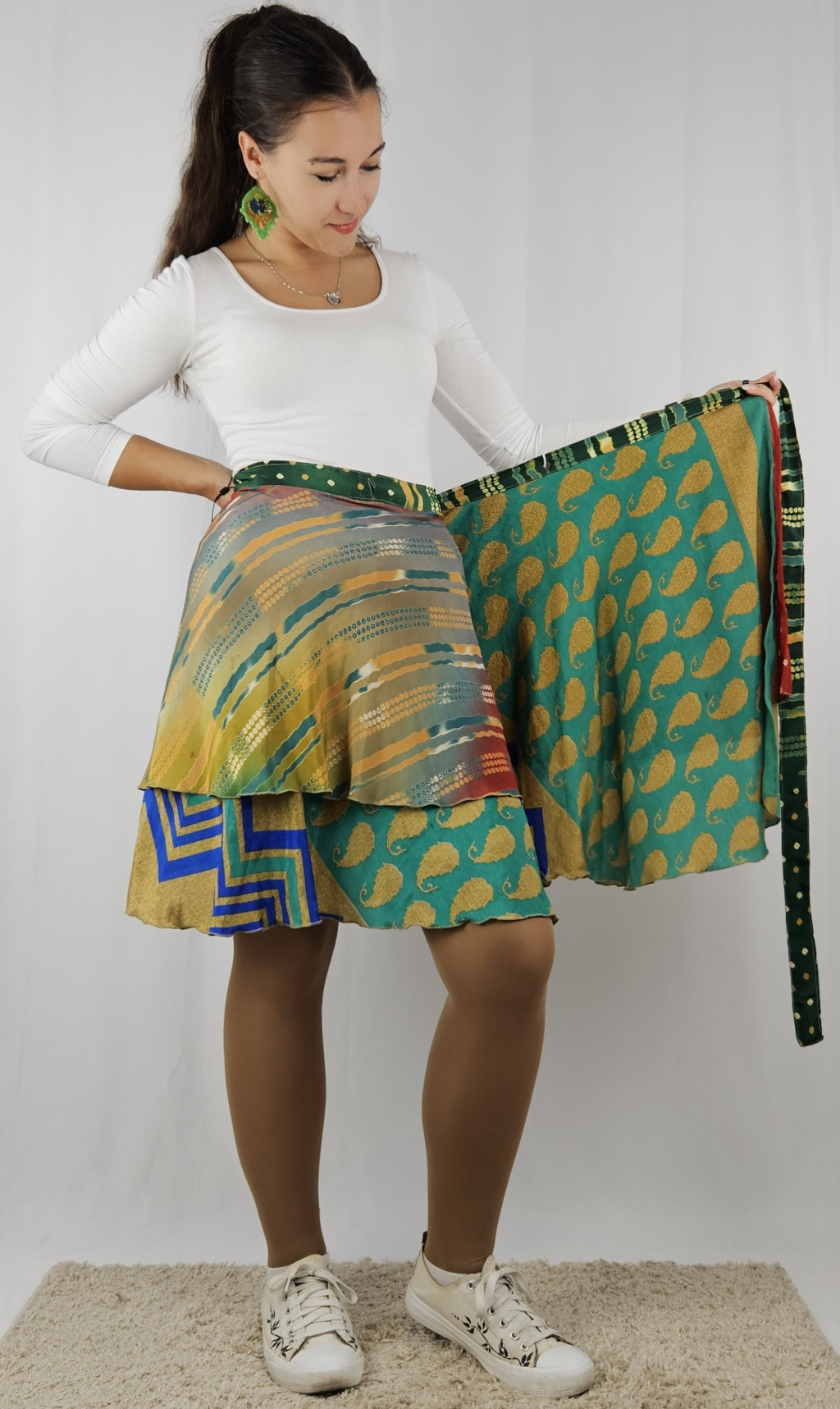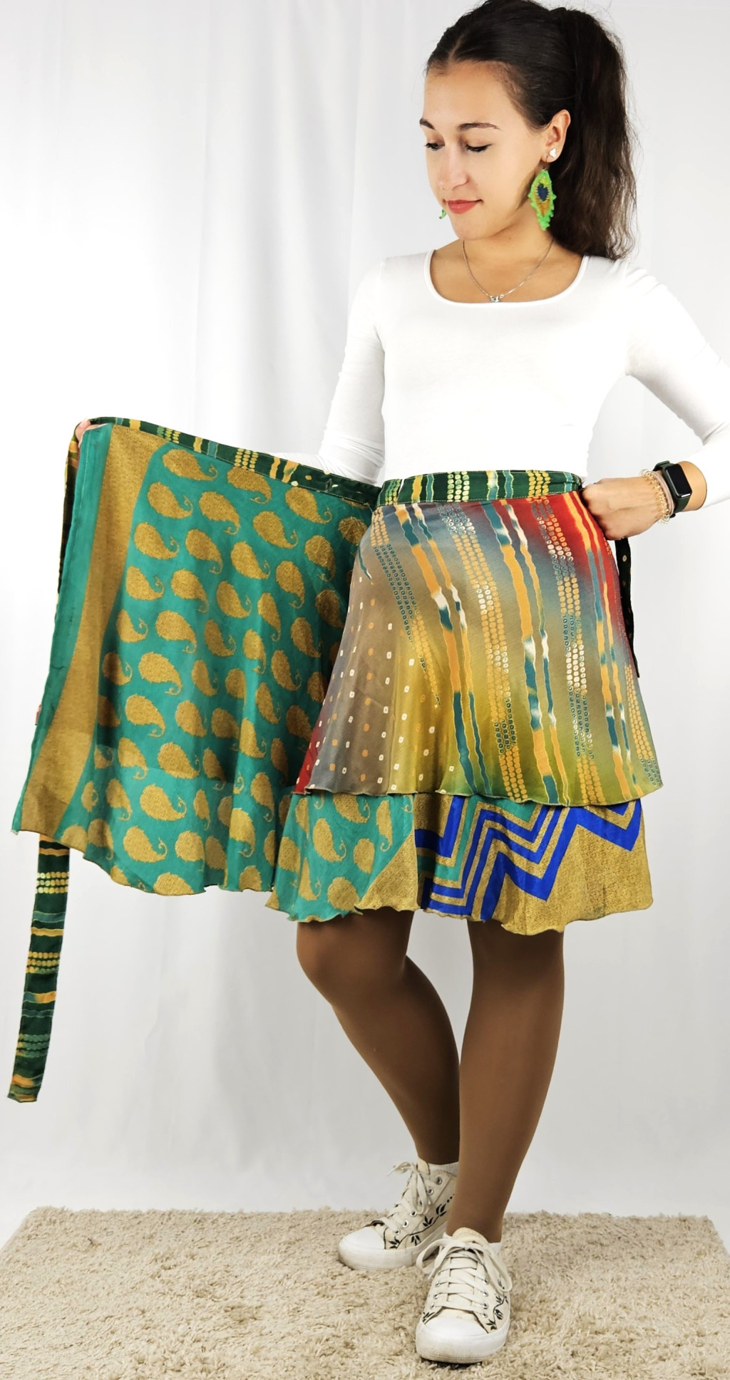 Lapszoknyáink újrahasznosított szárikból készülnek Indiában, egy hosszabb és egy rövidebb anyag derékban összevarrva! Kifordítható, mindkét oldala hordható, sokféleképpen köthető, variálható. Szoknyáinkból nincs két egyforma, mindegyikből csak EGY darab van, ha megtetszik, csapj le rá!