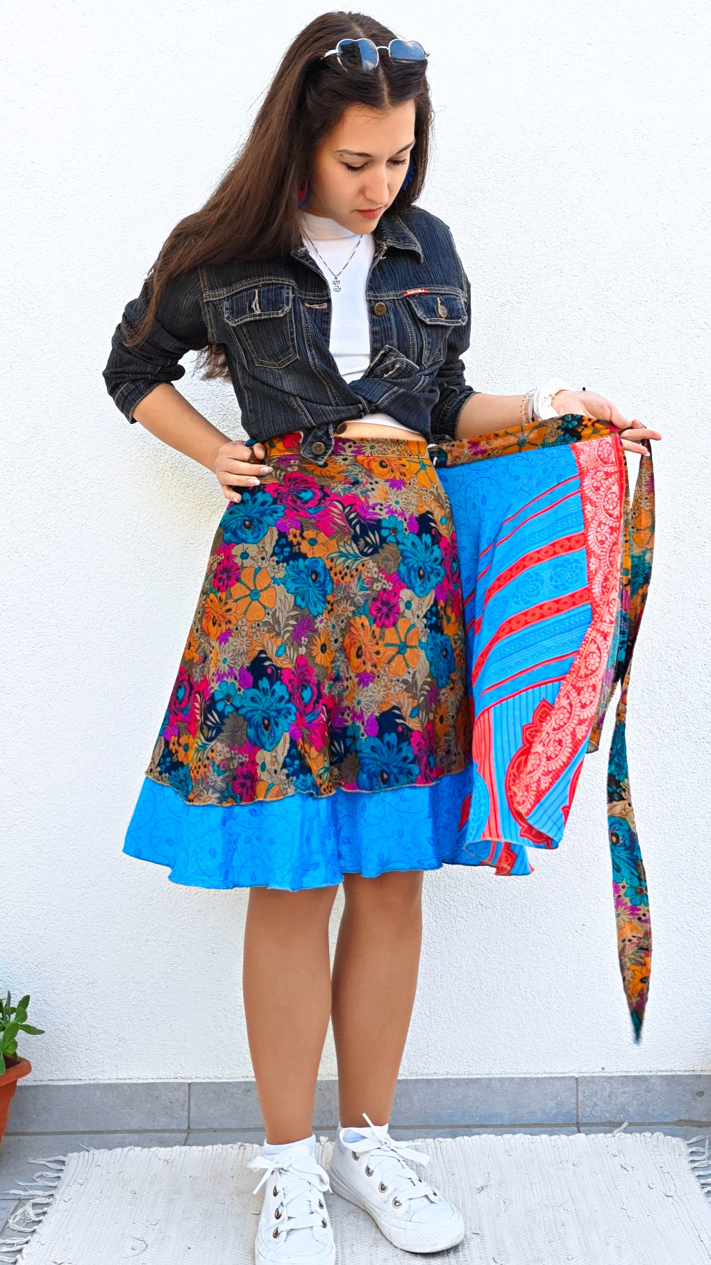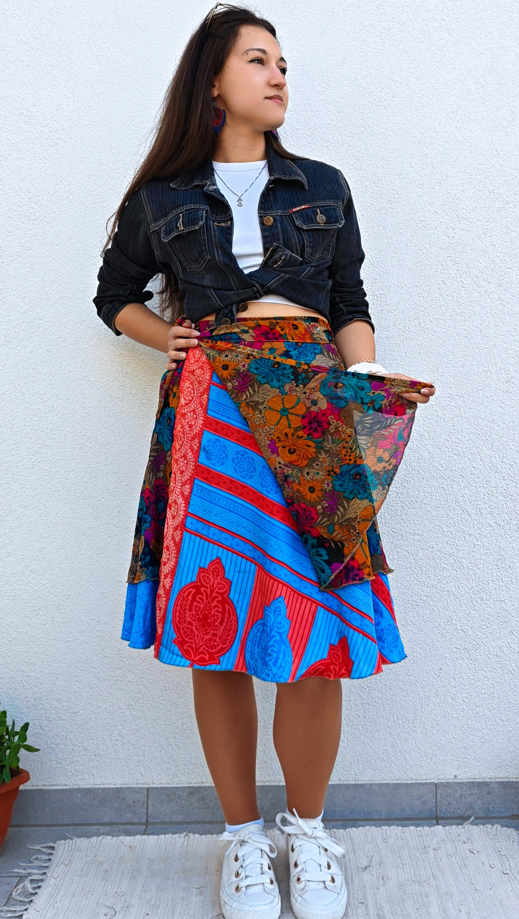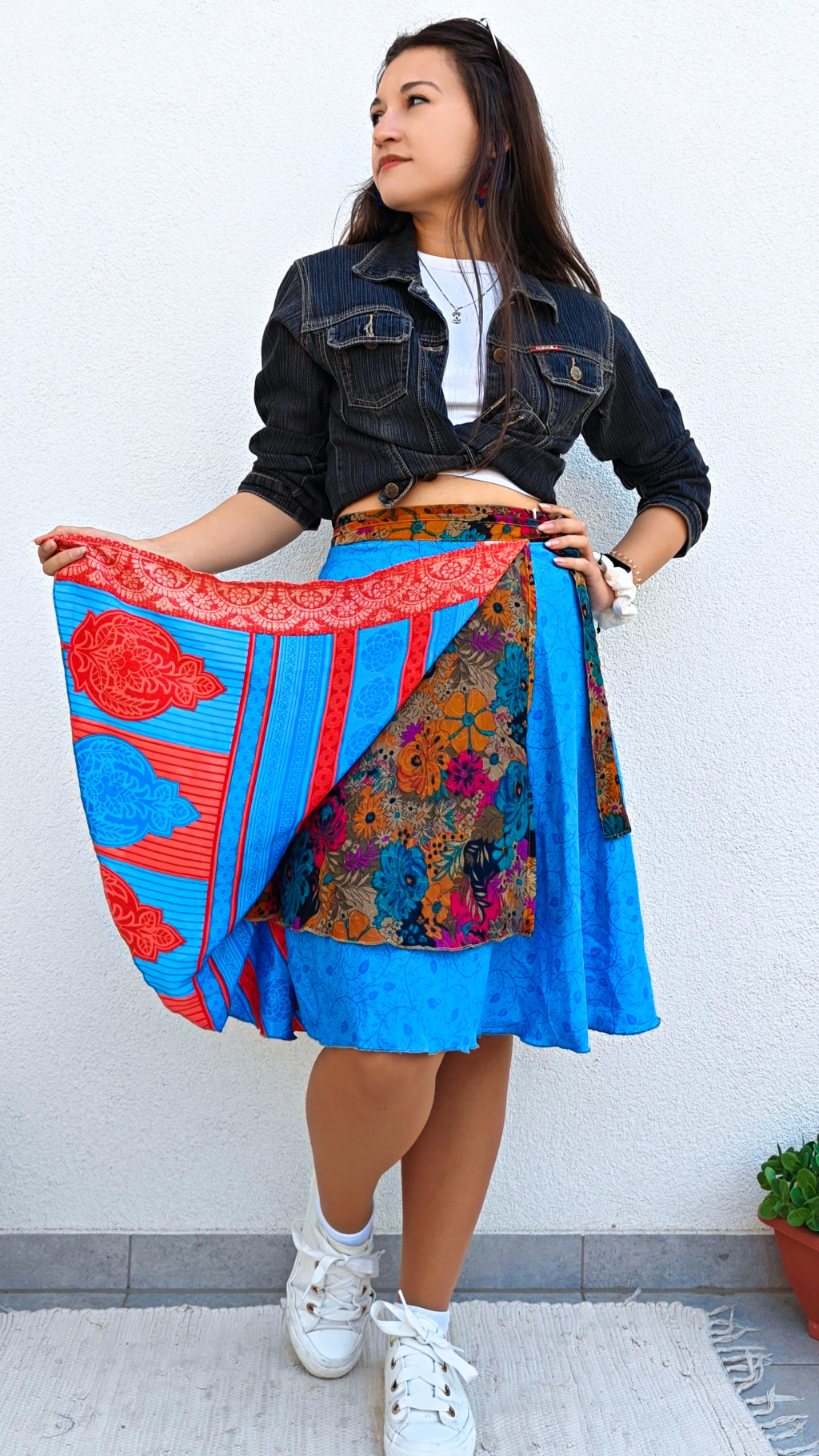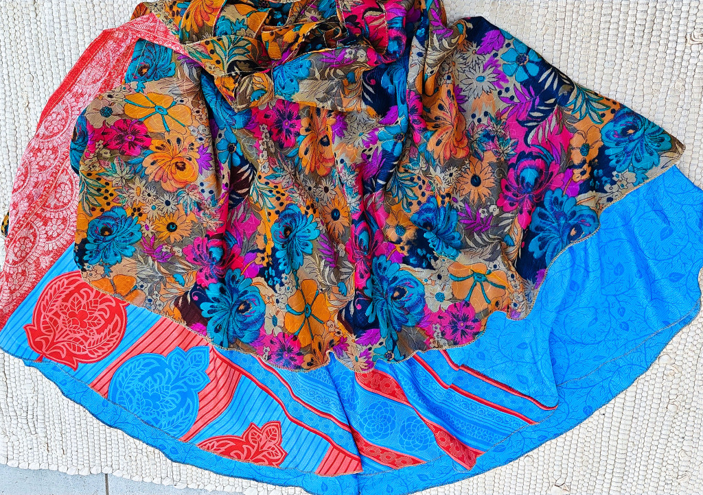 Lapszoknyáink újrahasznosított szárikból készülnek Indiában, egy hosszabb és egy rövidebb anyag derékban összevarrva! Két oldalú, kifordítható, mindkét oldala hordható, sokféleképpen köthető, variálható. Szoknyáinkból nincs két egyforma, mindegyikből csak EGY darab van, ha megtetszik, csapj le rá!