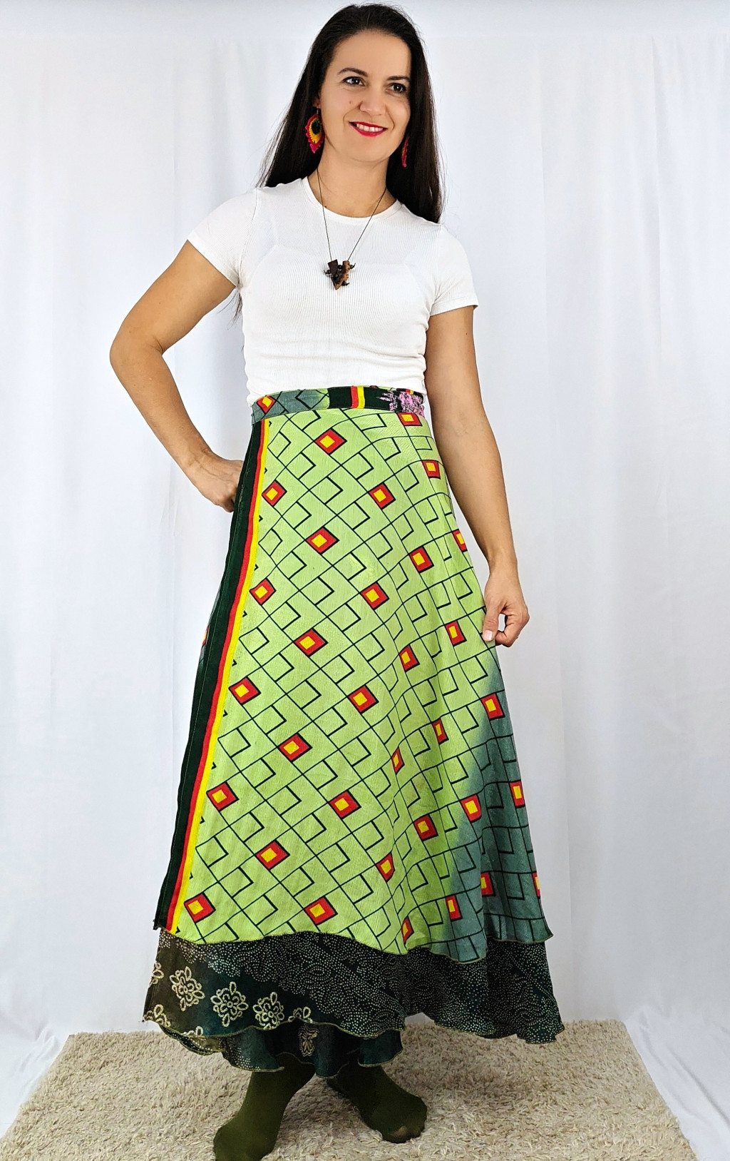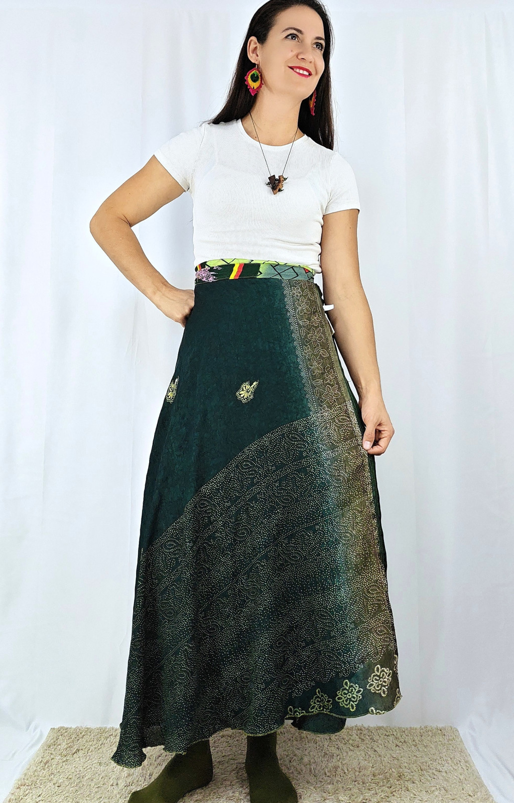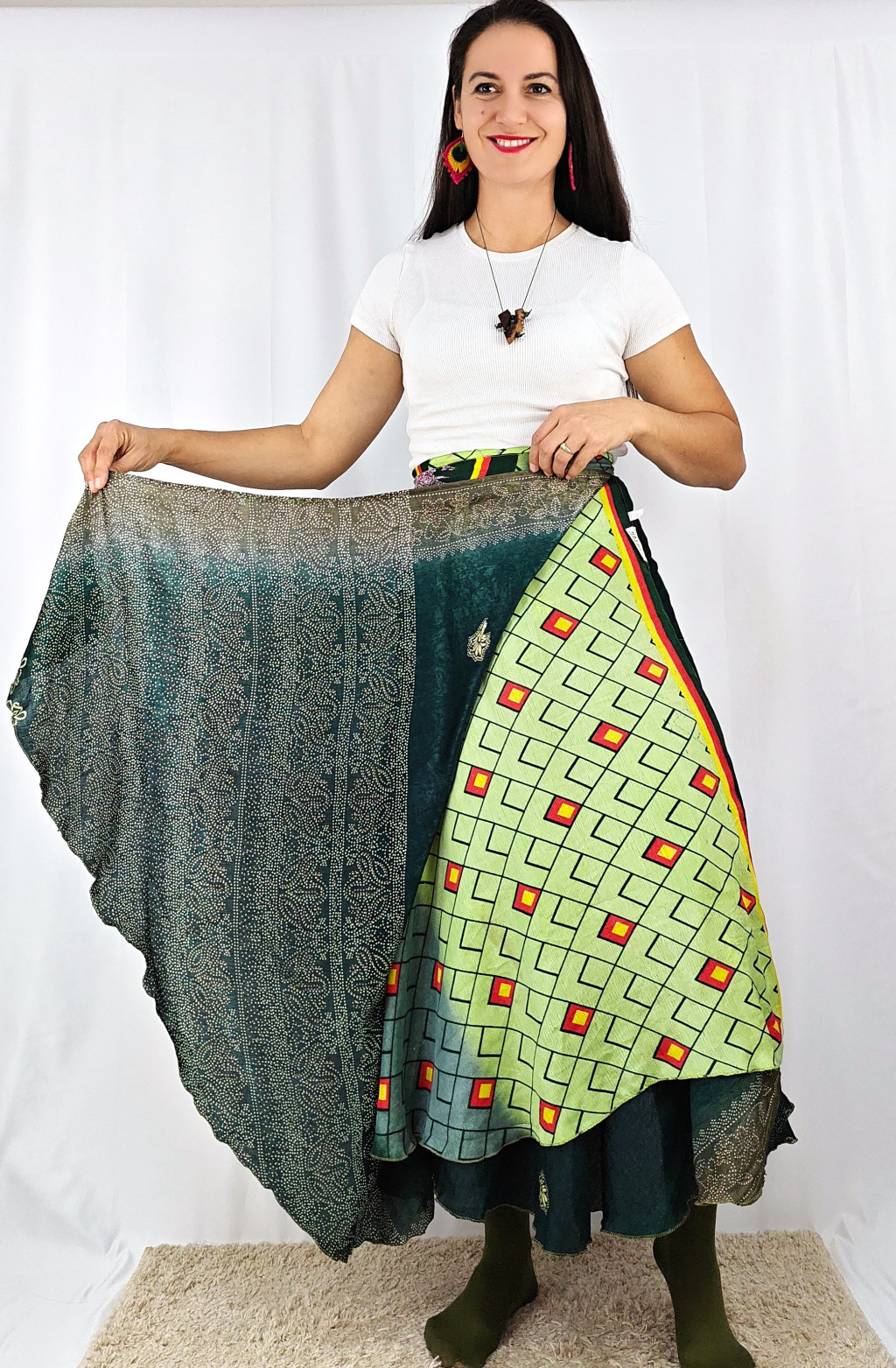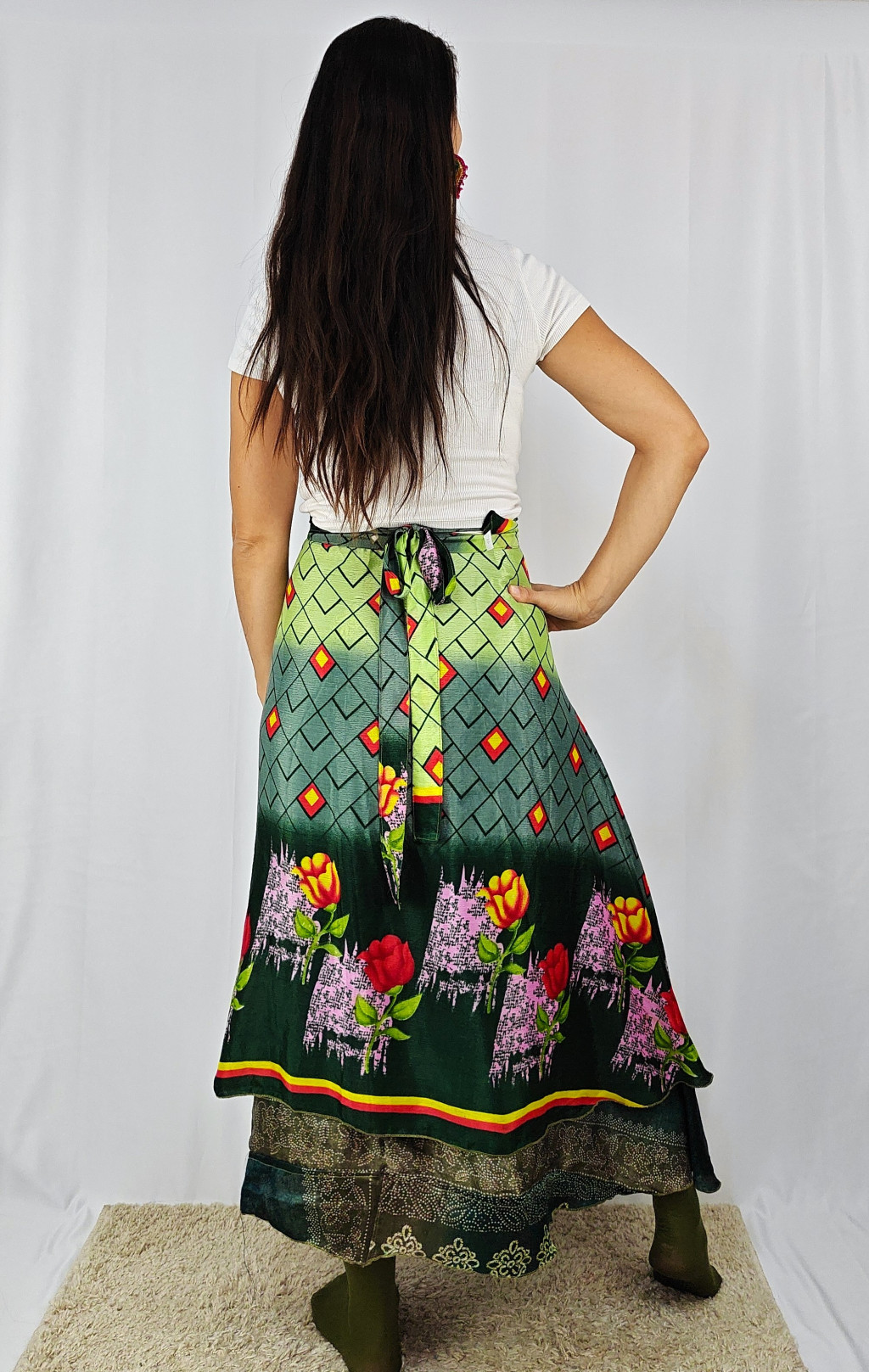 Lapszoknyáink újrahasznosított szárikból készülnek Indiában, egy hosszabb és egy rövidebb anyag derékban összevarrva! Két oldalú, kifordítható, mindkét oldala hordható, sokféleképpen köthető, variálható. Szoknyáinkból nincs két egyforma, mindegyikből csak EGY darab van, ha megtetszik, csapj le rá!