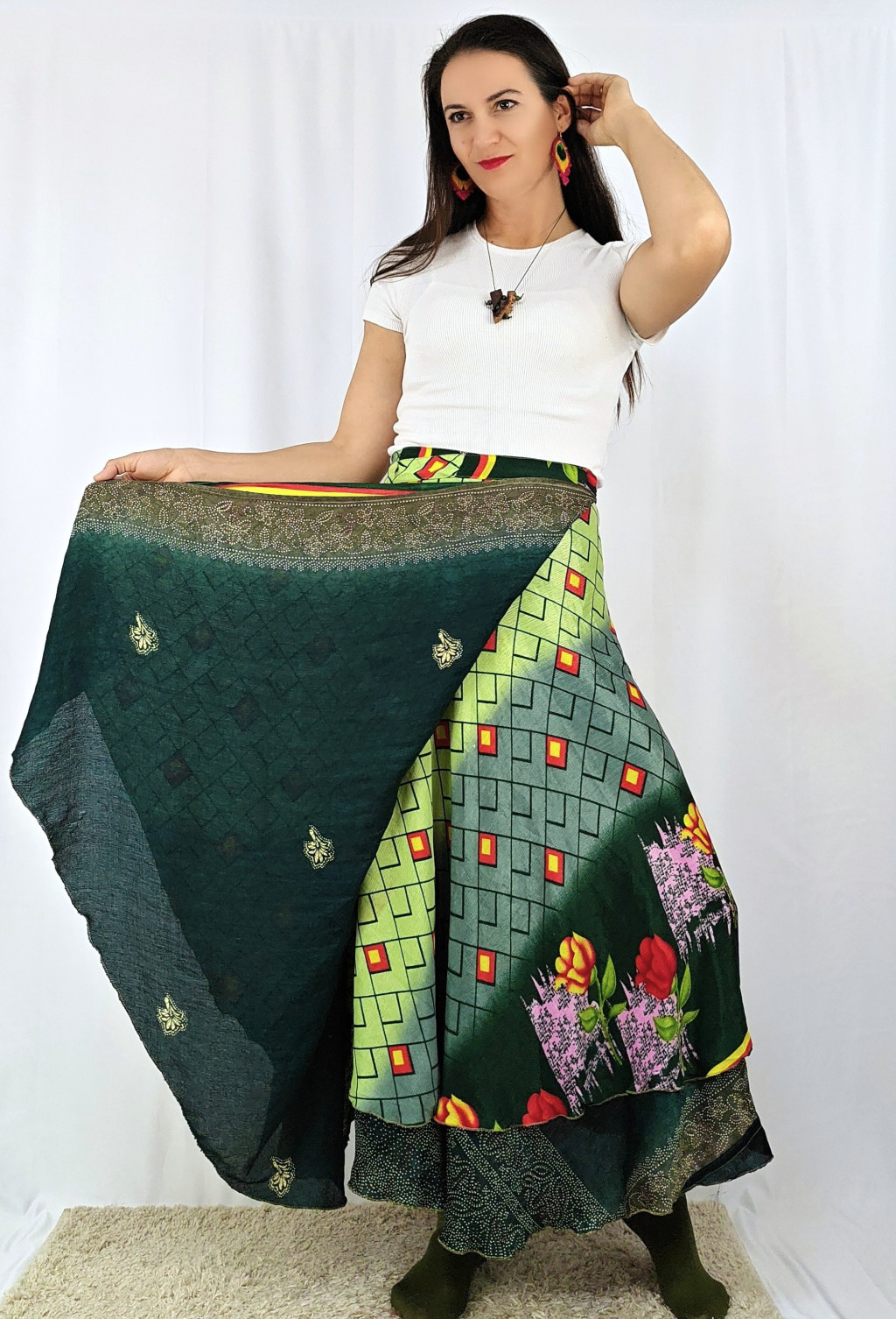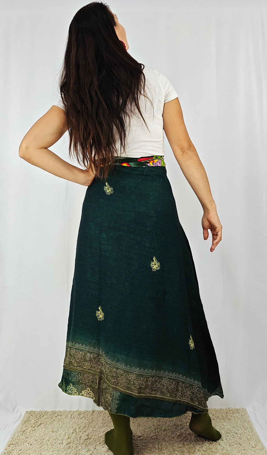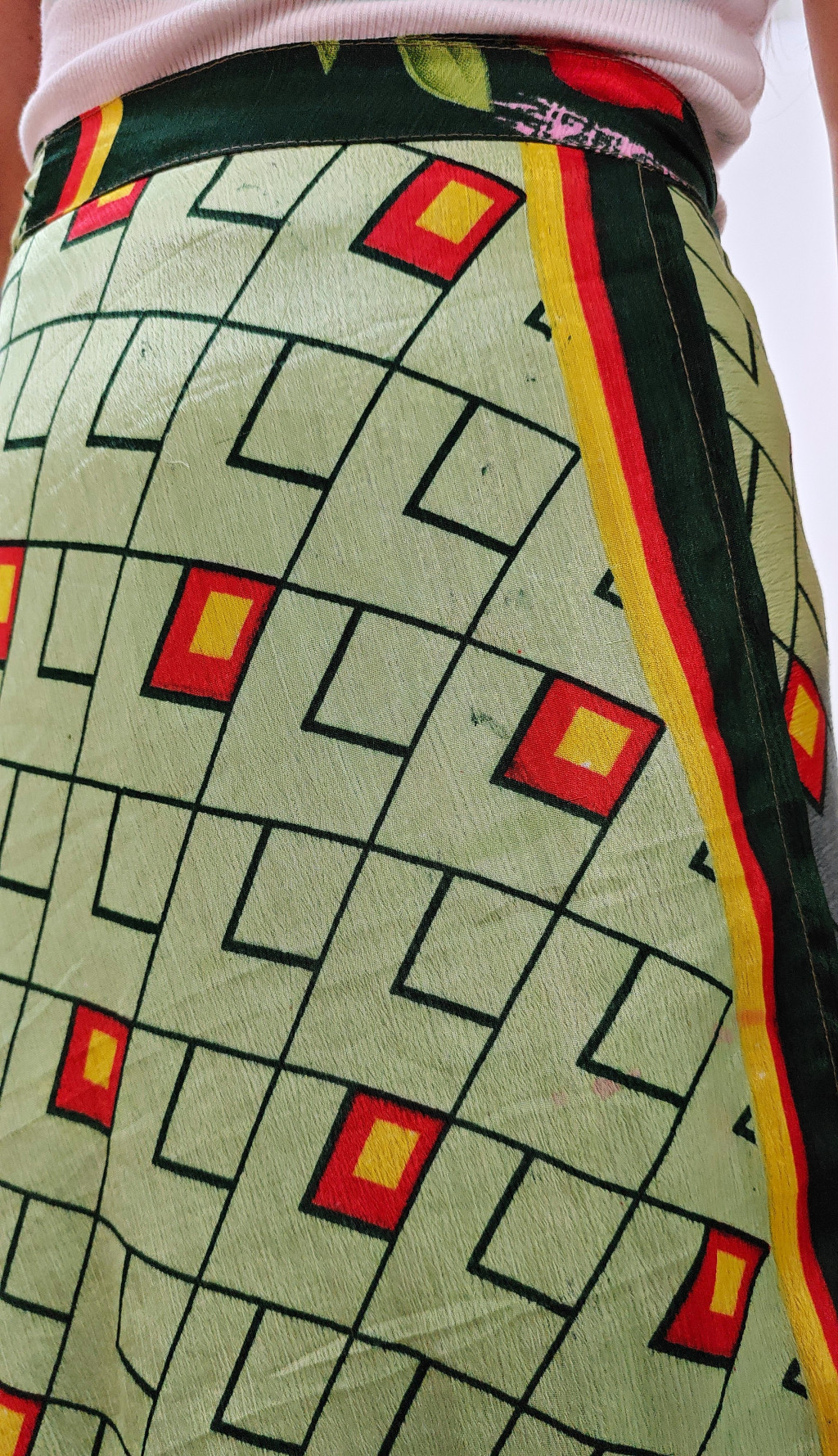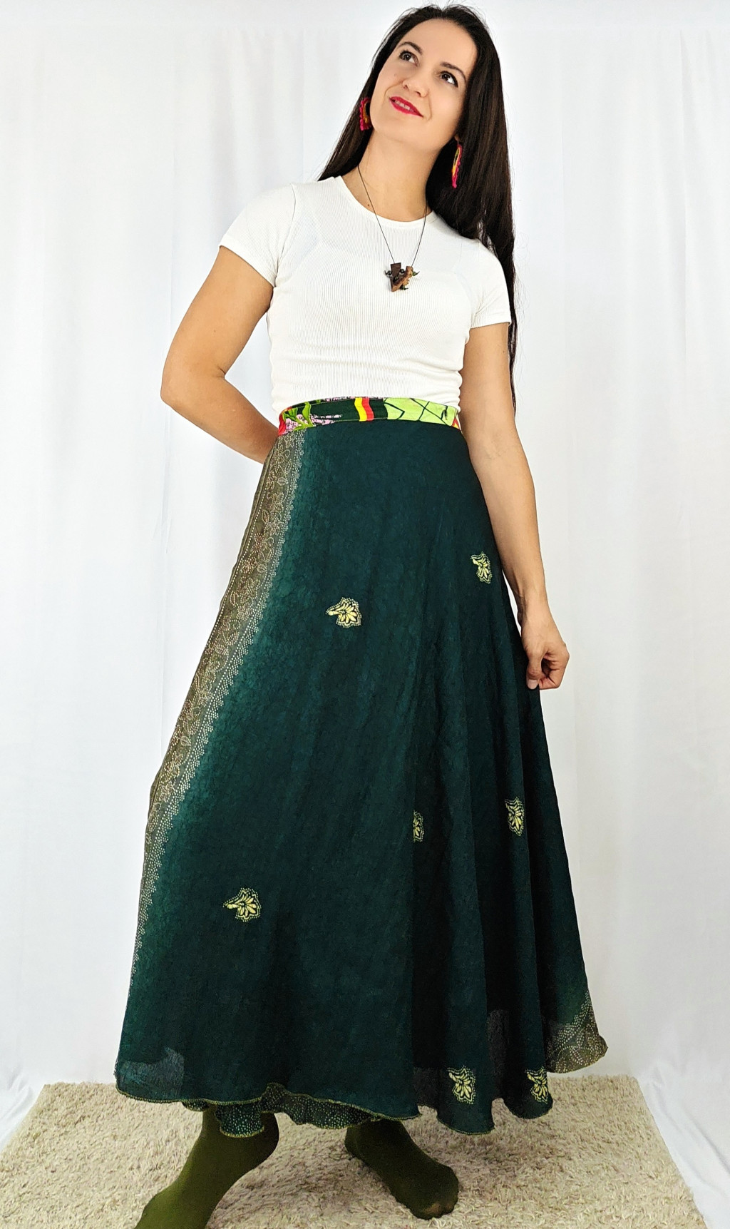 Lapszoknyáink újrahasznosított szárikból készülnek Indiában, egy hosszabb és egy rövidebb anyag derékban összevarrva! Két oldalú, kifordítható, mindkét oldala hordható, sokféleképpen köthető, variálható. Szoknyáinkból nincs két egyforma, mindegyikből csak EGY darab van, ha megtetszik, csapj le rá!