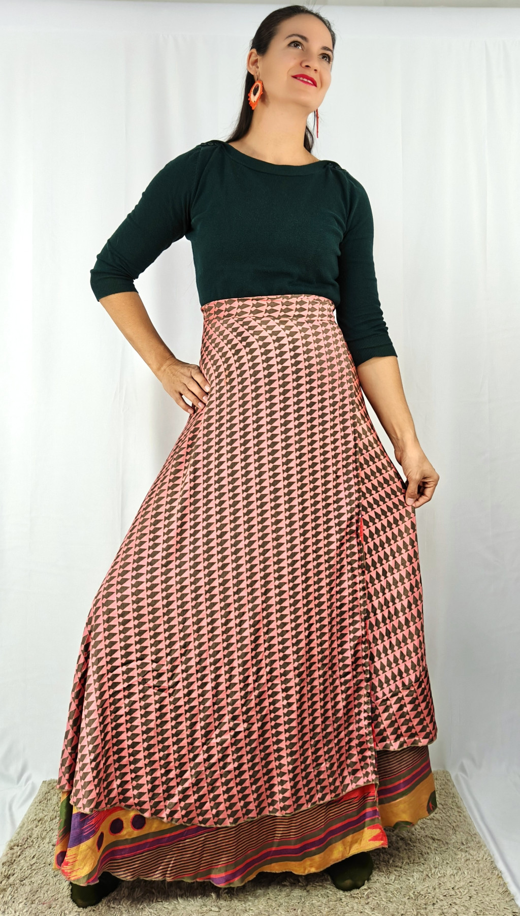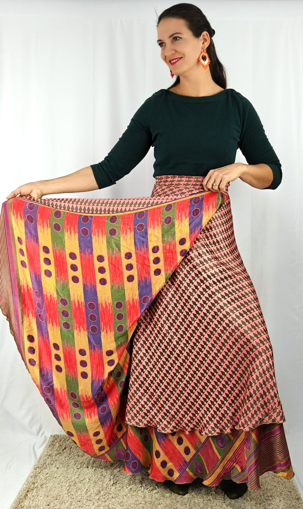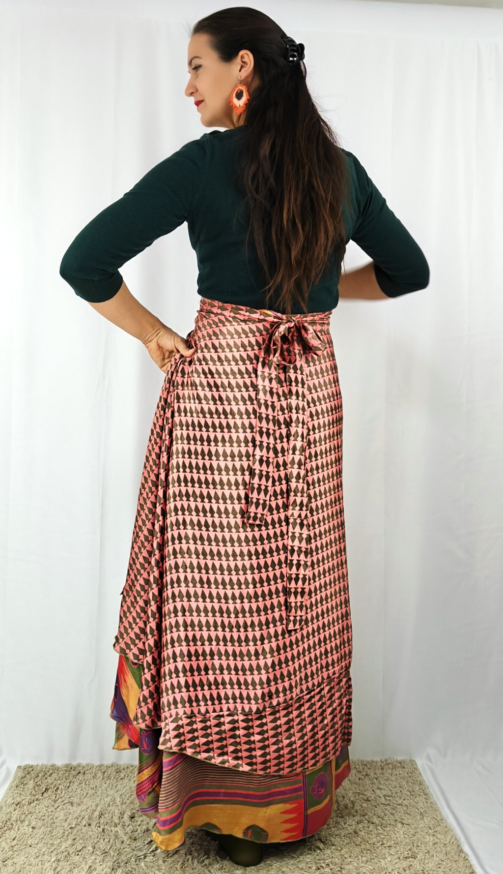 Lapszoknyáink újrahasznosított szárikból készülnek Indiában, egy hosszabb és egy rövidebb anyag derékban összevarrva! Két oldalú, kifordítható, mindkét oldala hordható, sokféleképpen köthető, variálható. Szoknyáinkból nincs két egyforma, mindegyikből csak EGY darab van, ha megtetszik, csapj le rá!