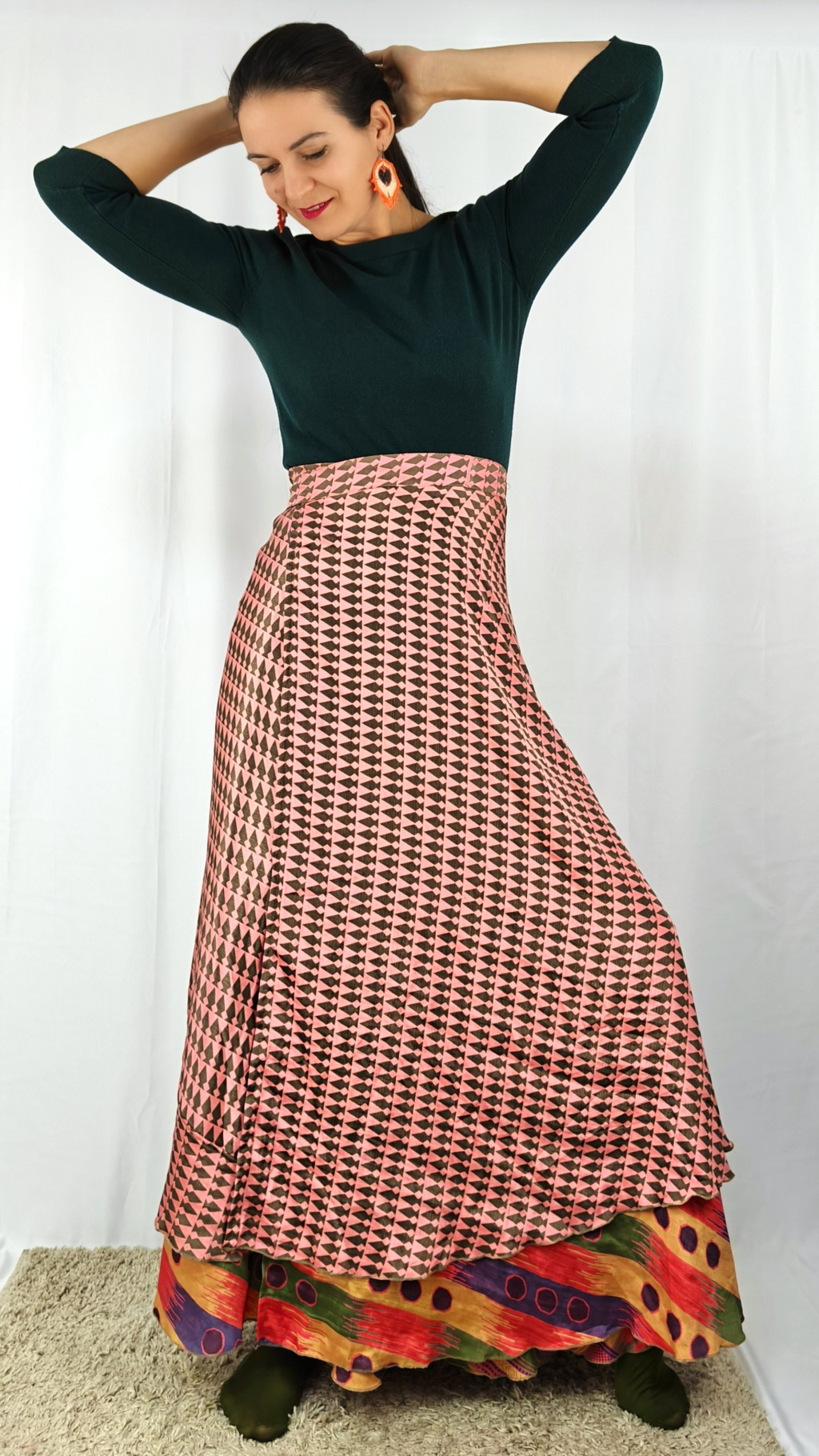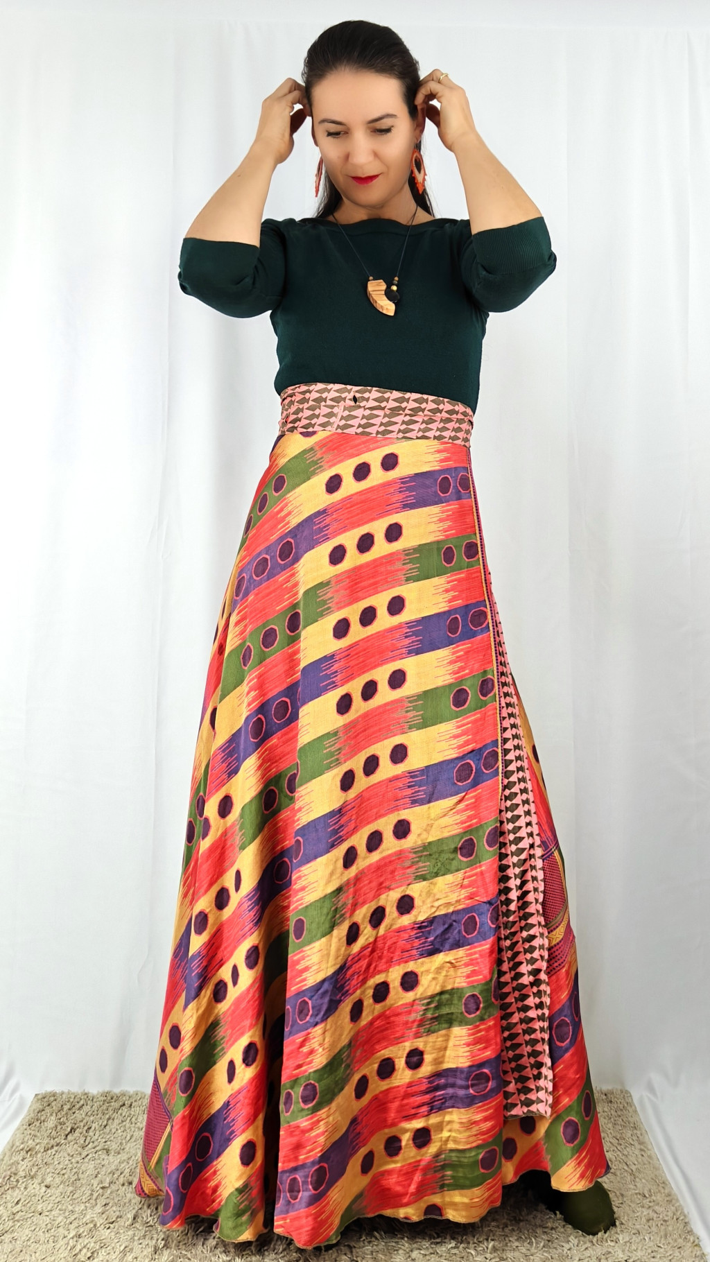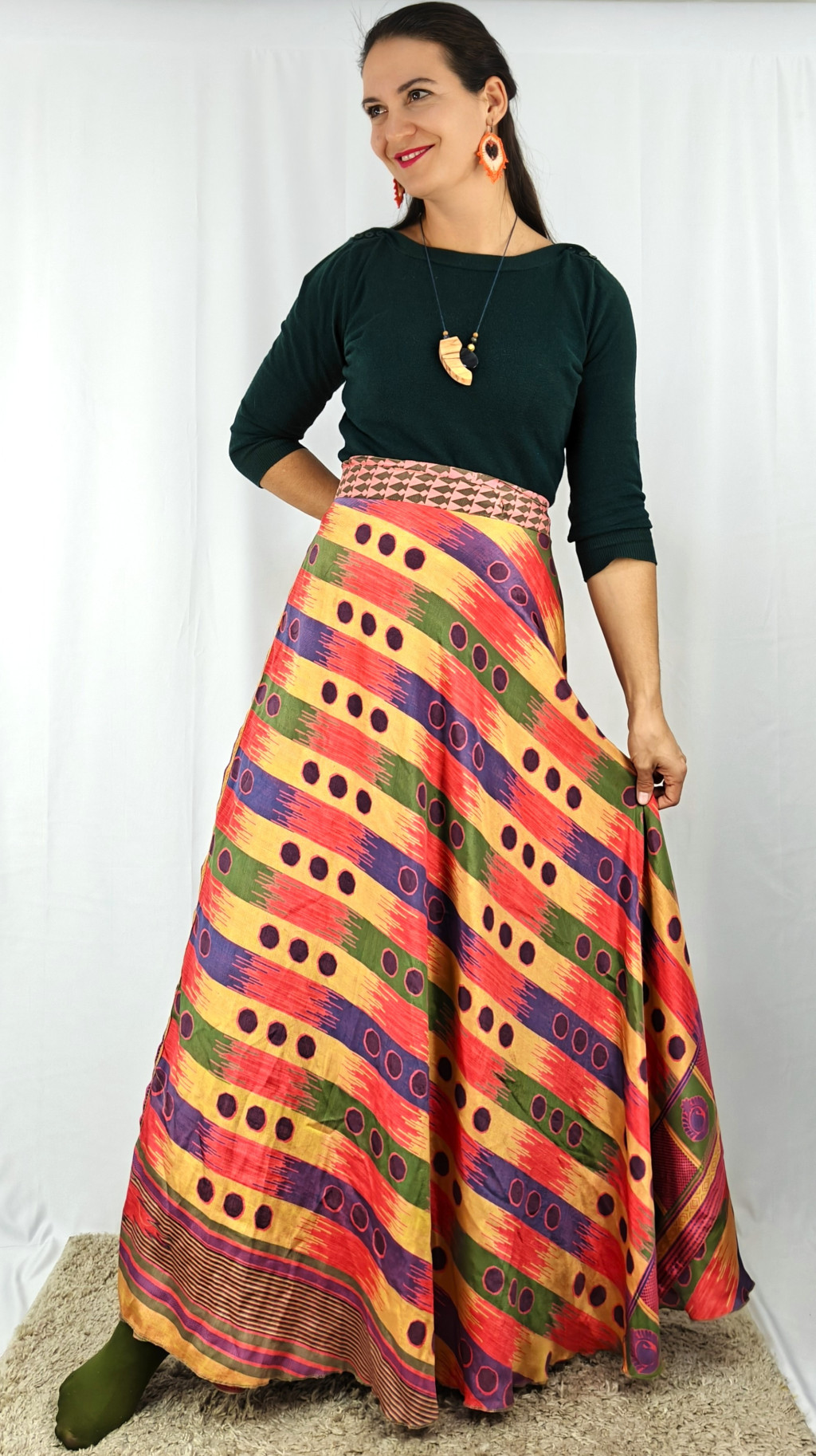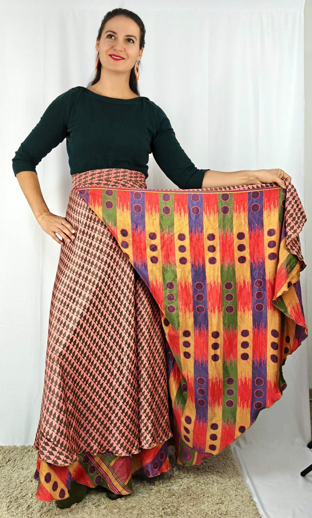 Lapszoknyáink újrahasznosított szárikból készülnek Indiában, egy hosszabb és egy rövidebb anyag derékban összevarrva! Két oldalú, kifordítható, mindkét oldala hordható, sokféleképpen köthető, variálható. Szoknyáinkból nincs két egyforma, mindegyikből csak EGY darab van, ha megtetszik, csapj le rá!