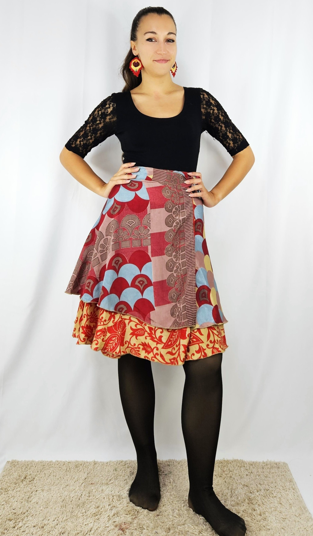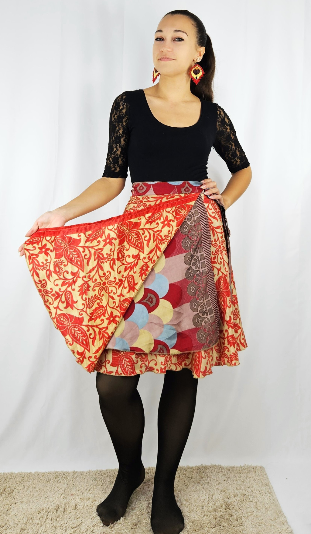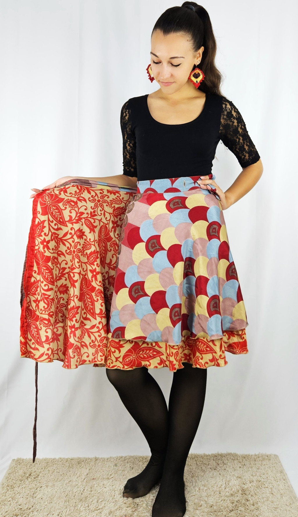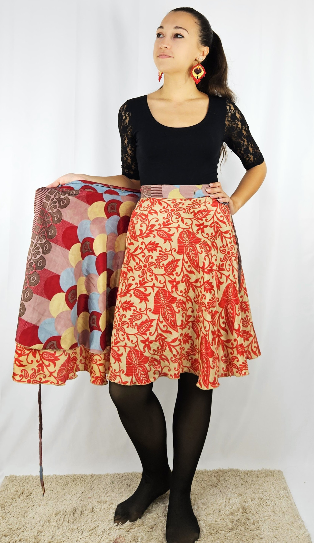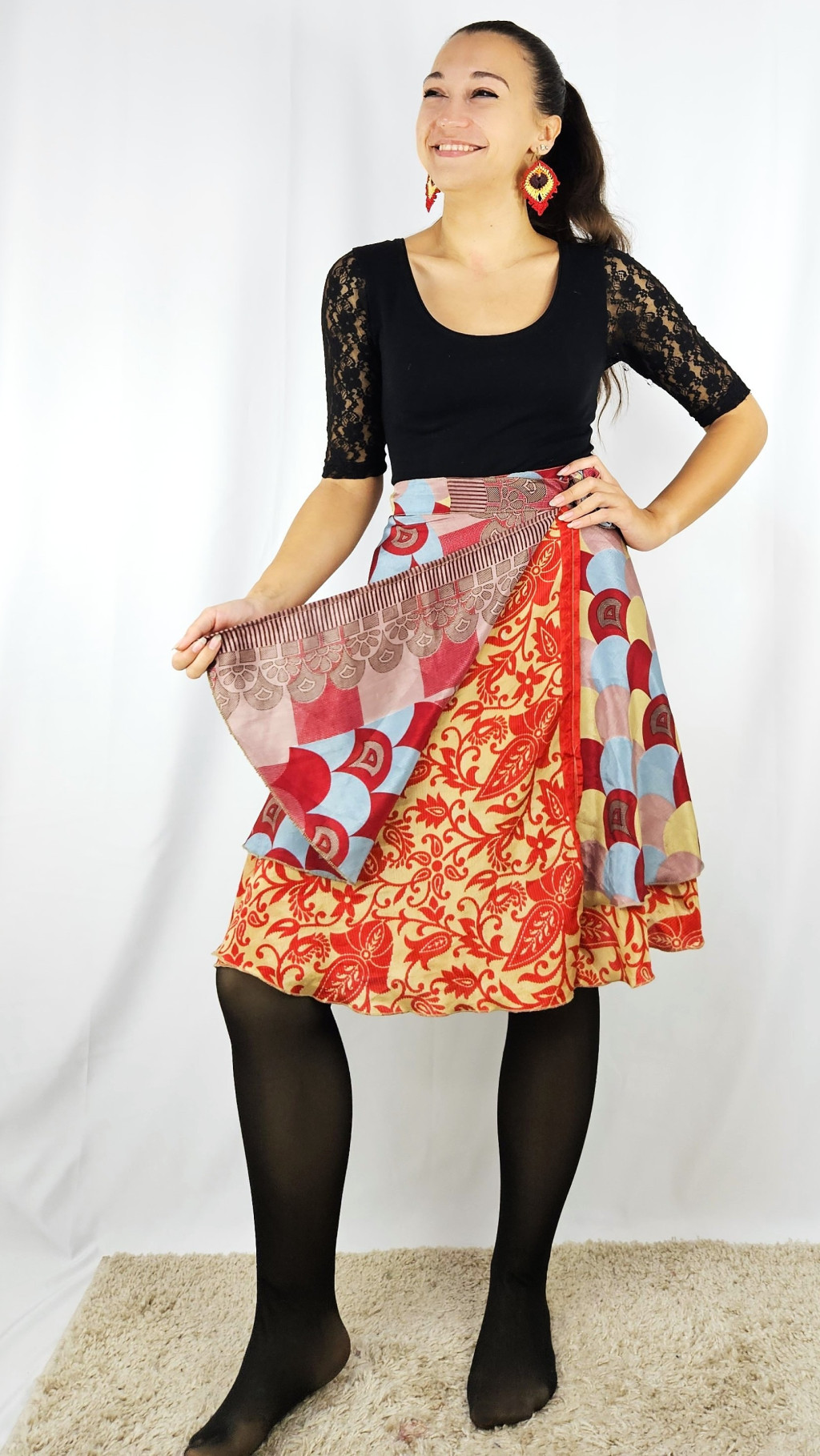 Lapszoknyáink újrahasznosított szárikból készülnek Indiában, egy hosszabb és egy rövidebb anyag derékban összevarrva! Két oldalú, kifordítható, mindkét oldala hordható, sokféleképpen köthető, variálható. Szoknyáinkból nincs két egyforma, mindegyikből csak EGY darab van, ha megtetszik, csapj le rá!