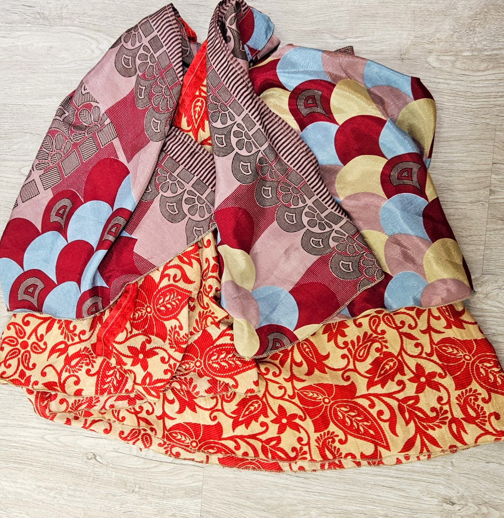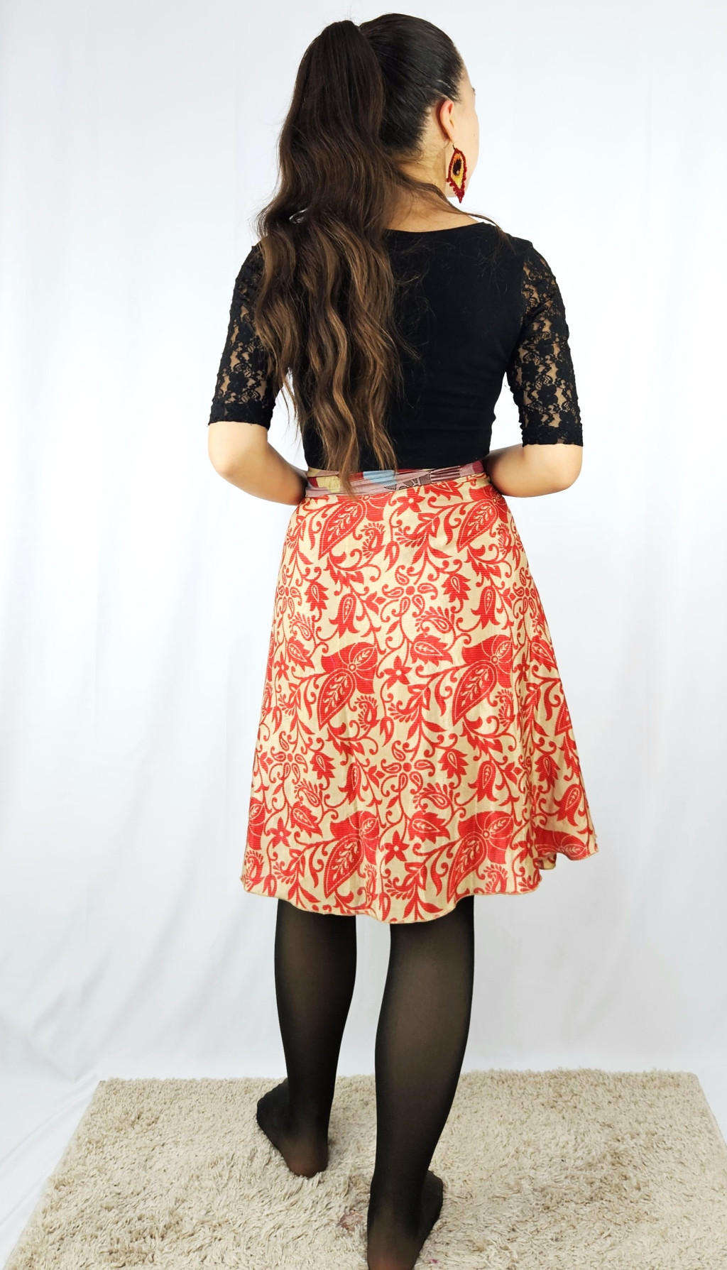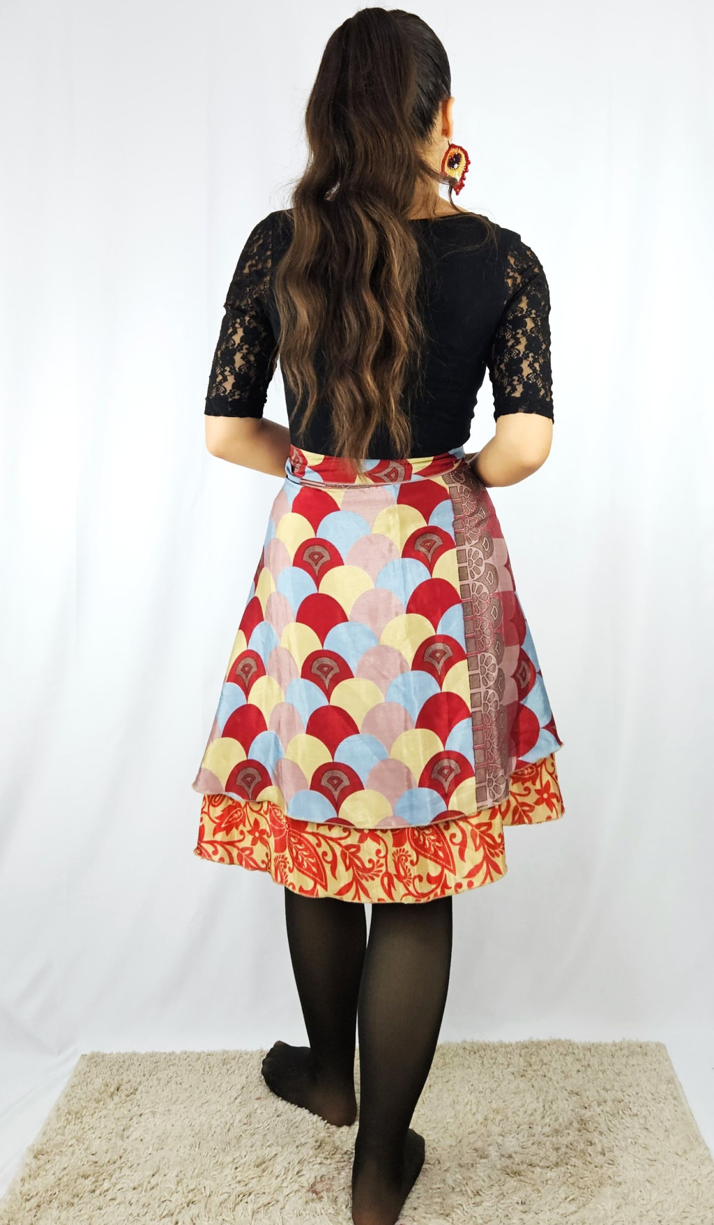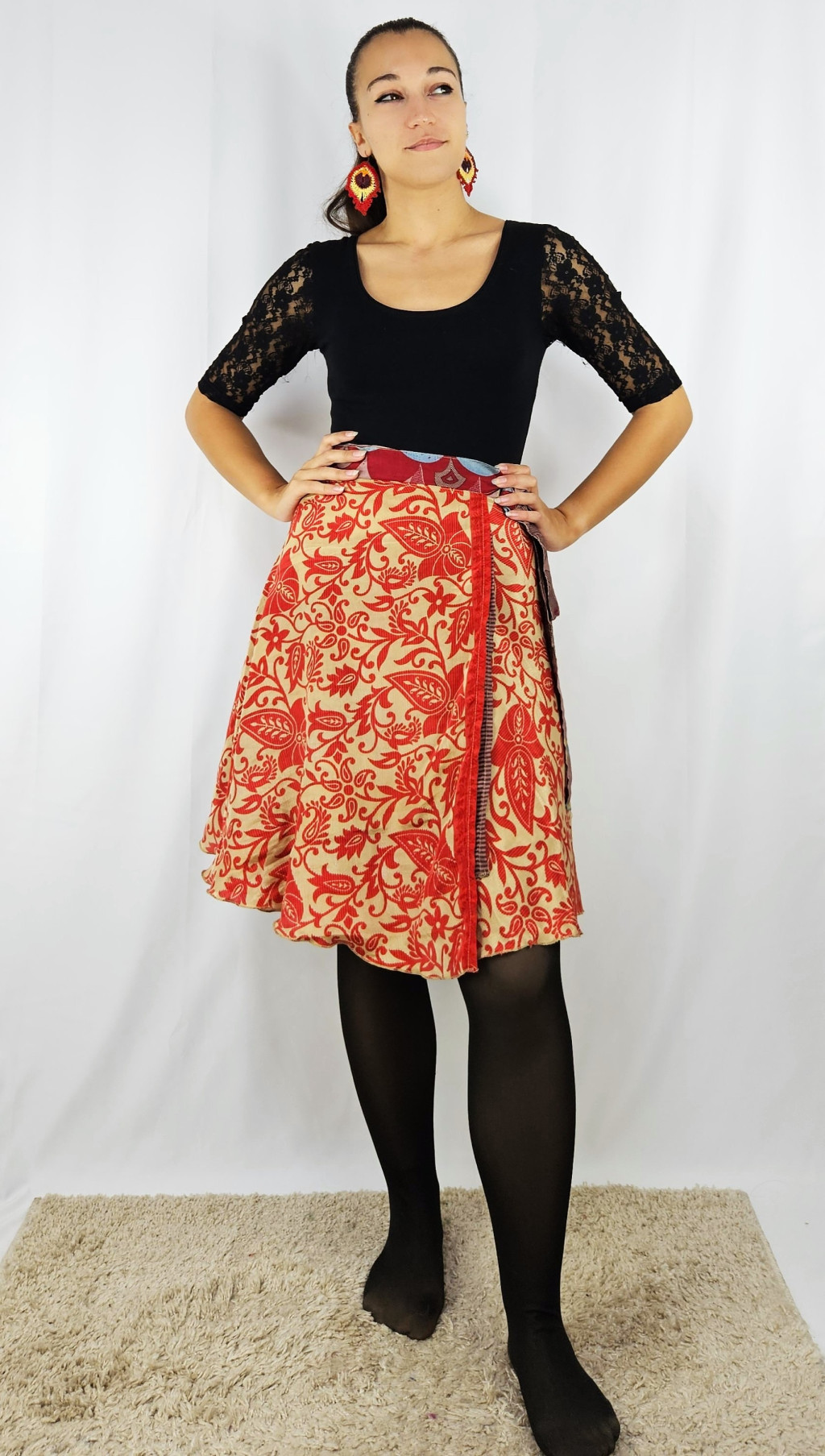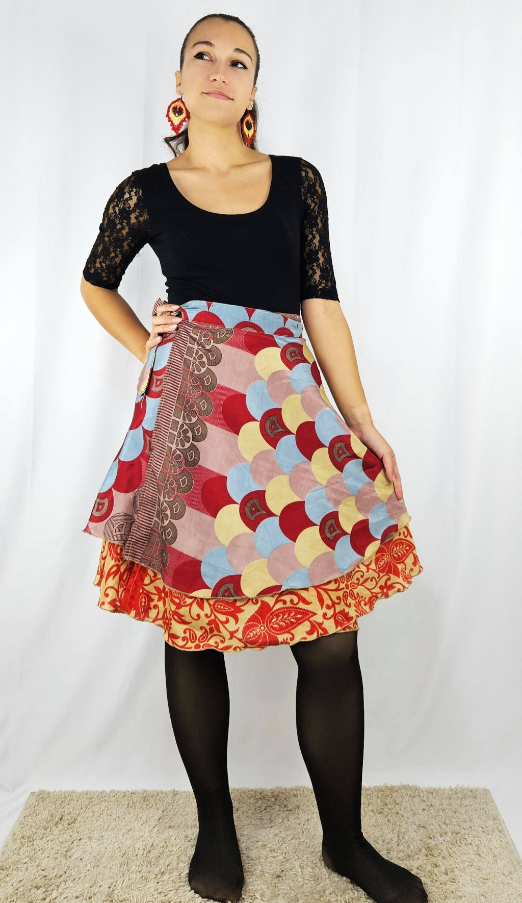 Lapszoknyáink újrahasznosított szárikból készülnek Indiában, egy hosszabb és egy rövidebb anyag derékban összevarrva! Két oldalú, kifordítható, mindkét oldala hordható, sokféleképpen köthető, variálható. Szoknyáinkból nincs két egyforma, mindegyikből csak EGY darab van, ha megtetszik, csapj le rá!