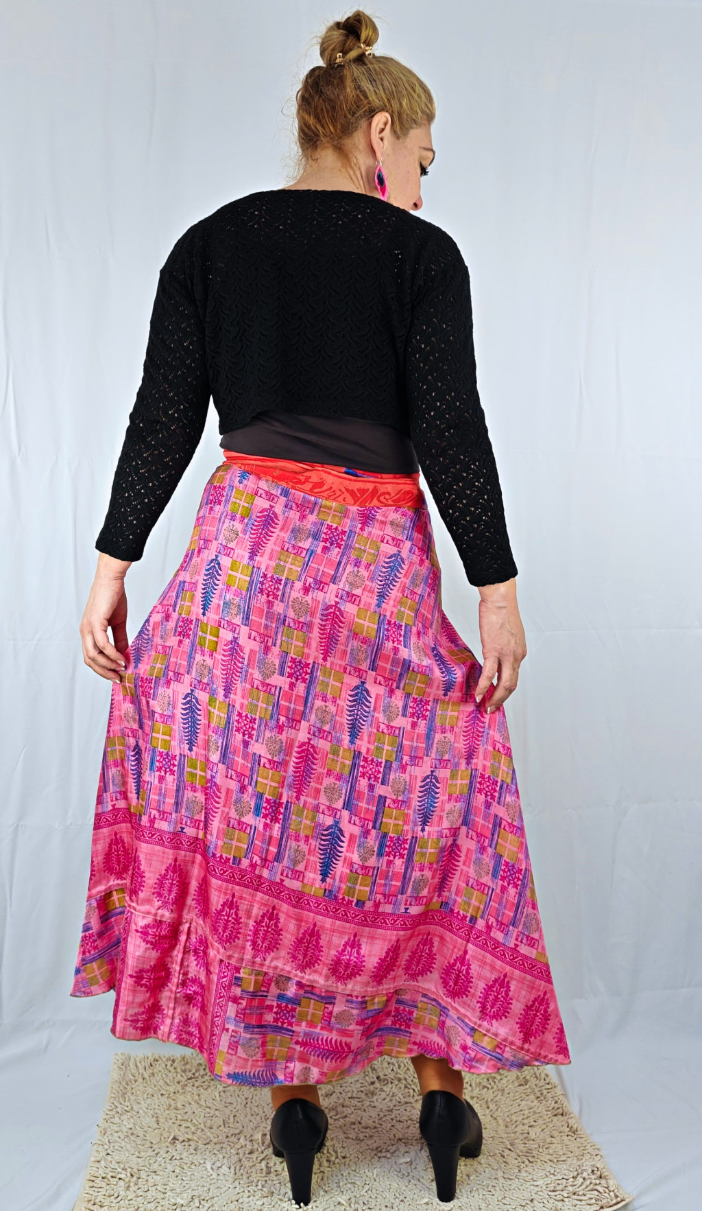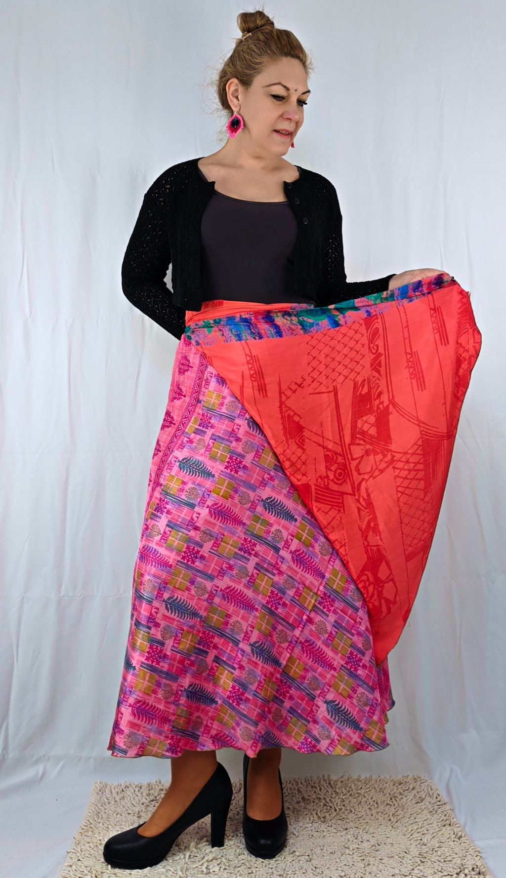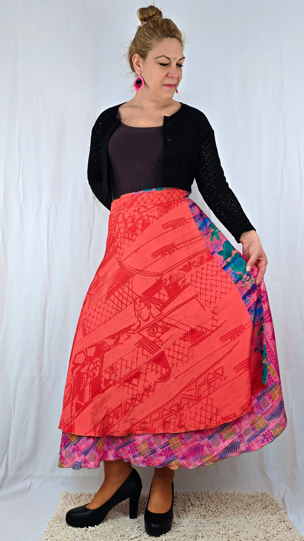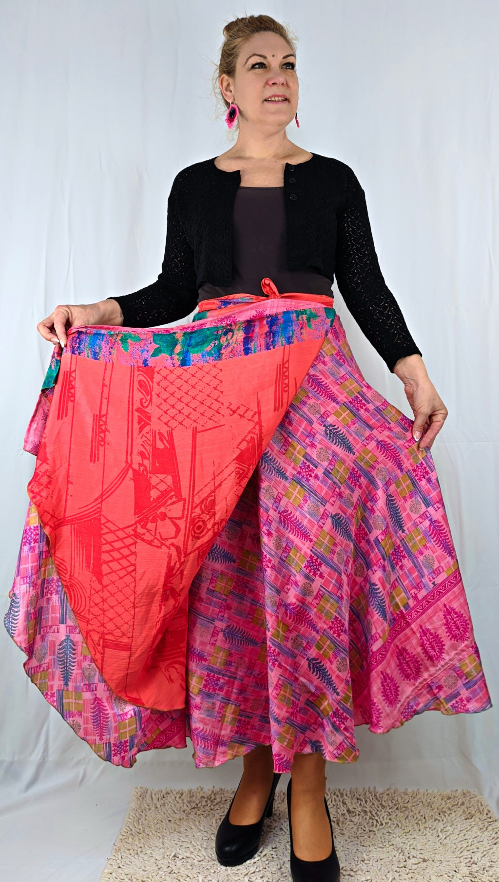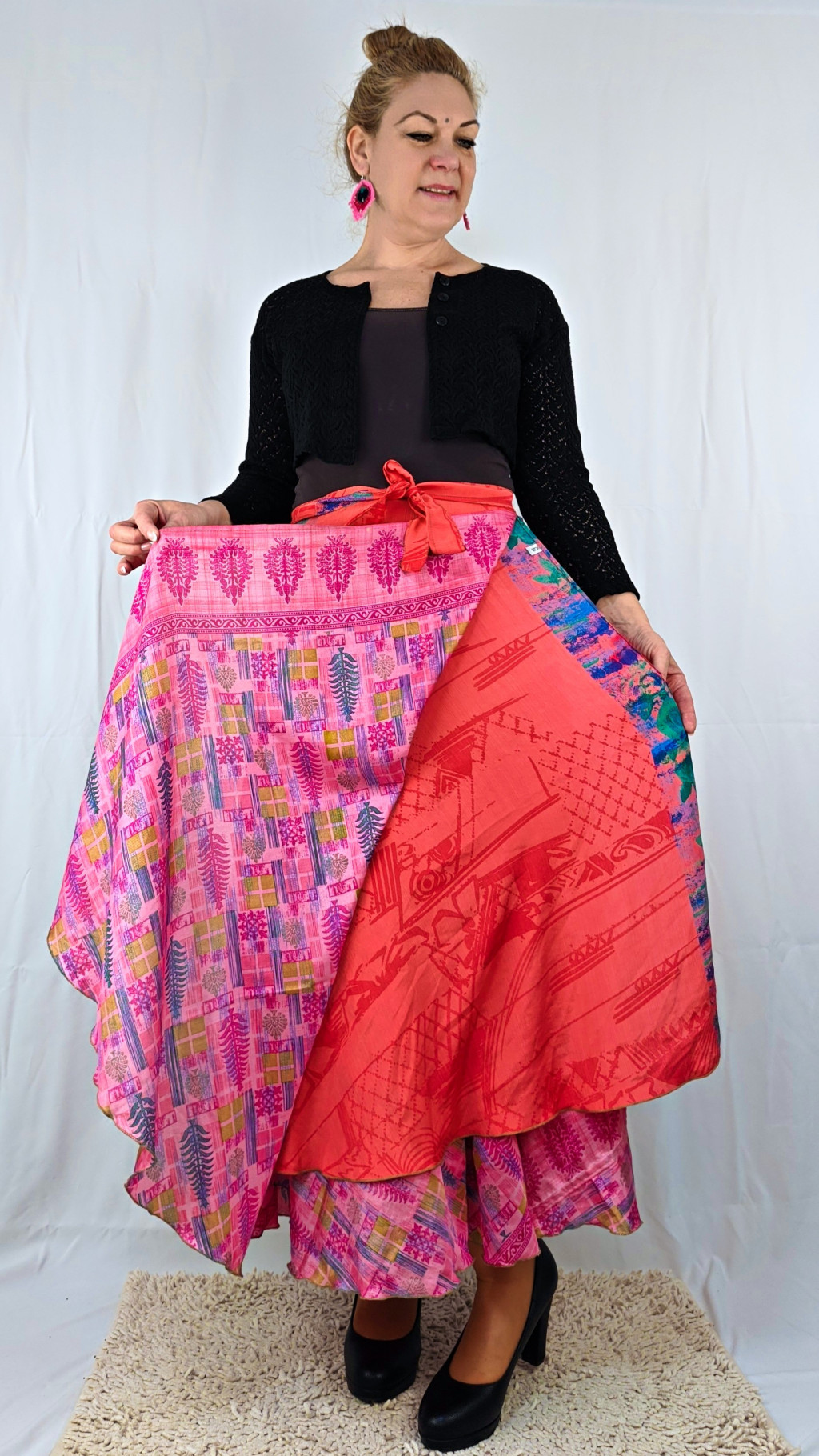 Lapszoknyáink újrahasznosított szárikból készülnek Indiában, egy hosszabb és egy rövidebb anyag derékban összevarrva! Két oldalú, kifordítható, mindkét oldala hordható, sokféleképpen köthető, variálható. Szoknyáinkból nincs két egyforma, mindegyikből csak EGY darab van, ha megtetszik, csapj le rá!