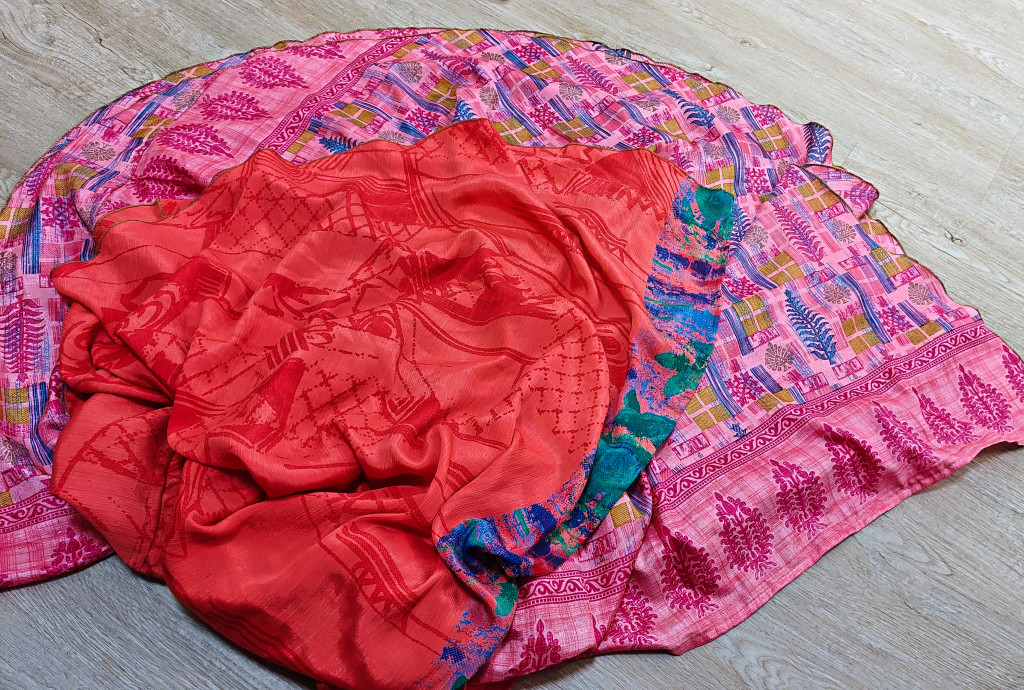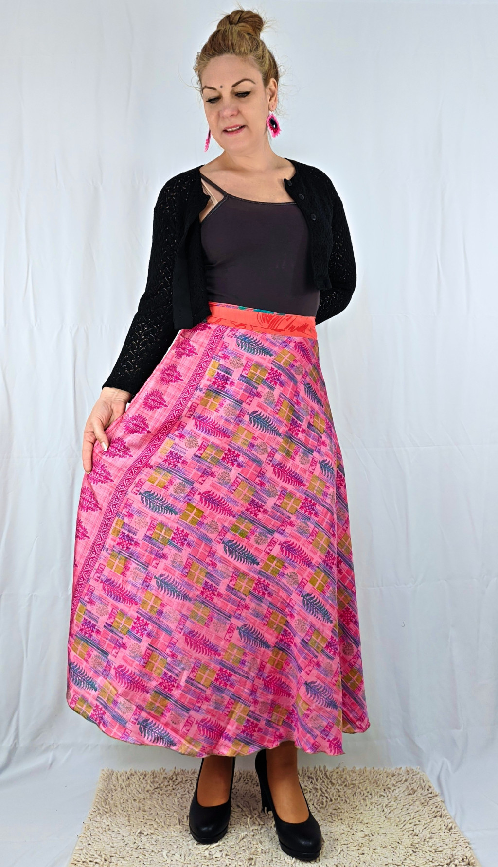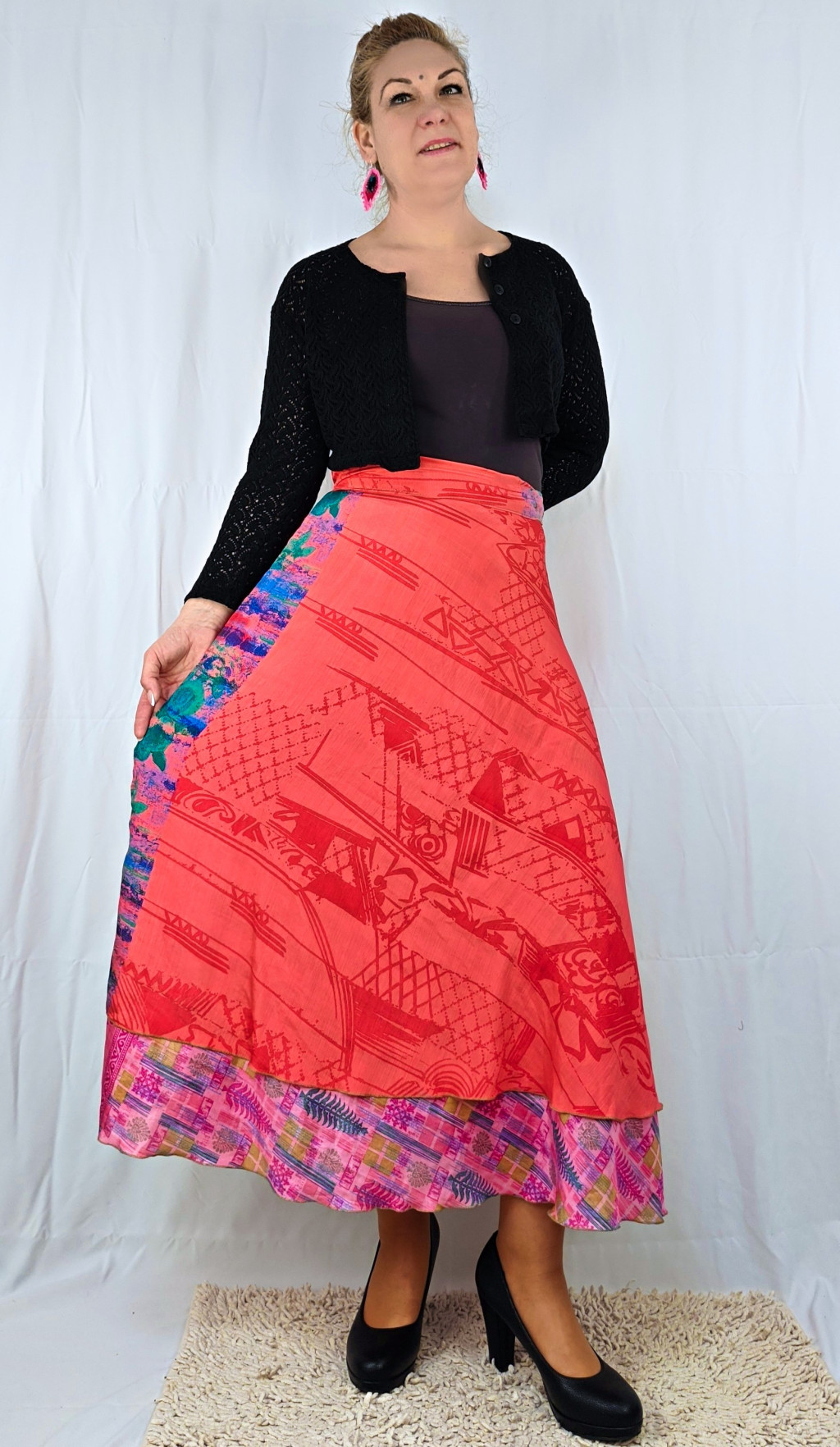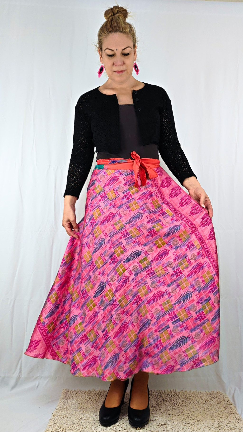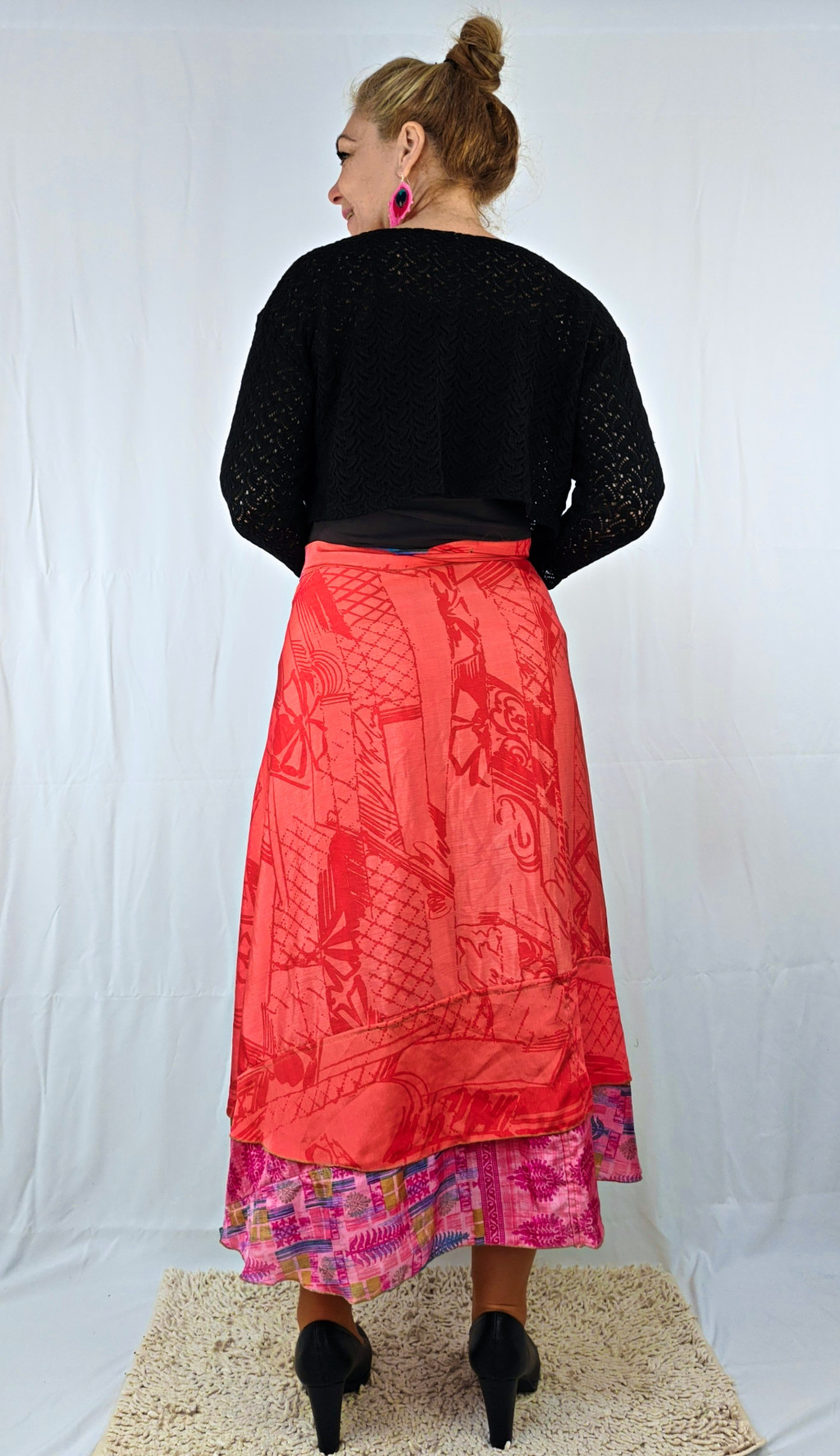 Lapszoknyáink újrahasznosított szárikból készülnek Indiában, egy hosszabb és egy rövidebb anyag derékban összevarrva! Két oldalú, kifordítható, mindkét oldala hordható, sokféleképpen köthető, variálható. Szoknyáinkból nincs két egyforma, mindegyikből csak EGY darab van, ha megtetszik, csapj le rá!