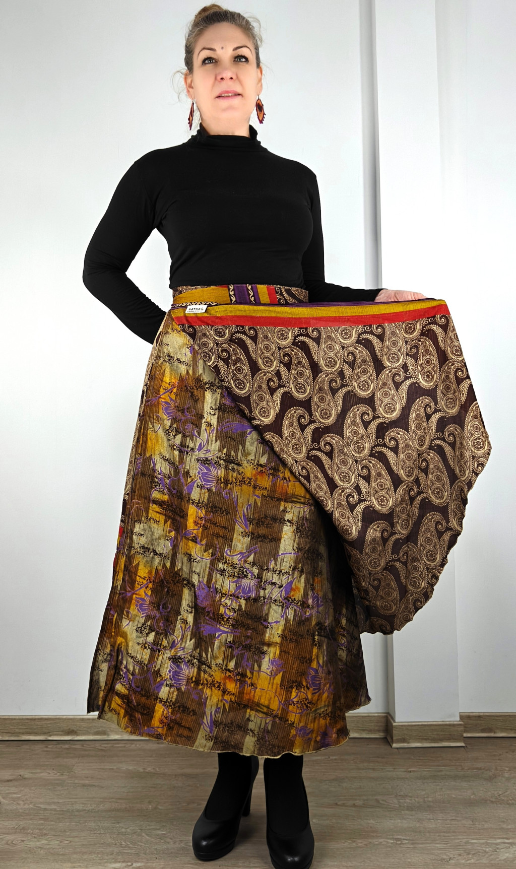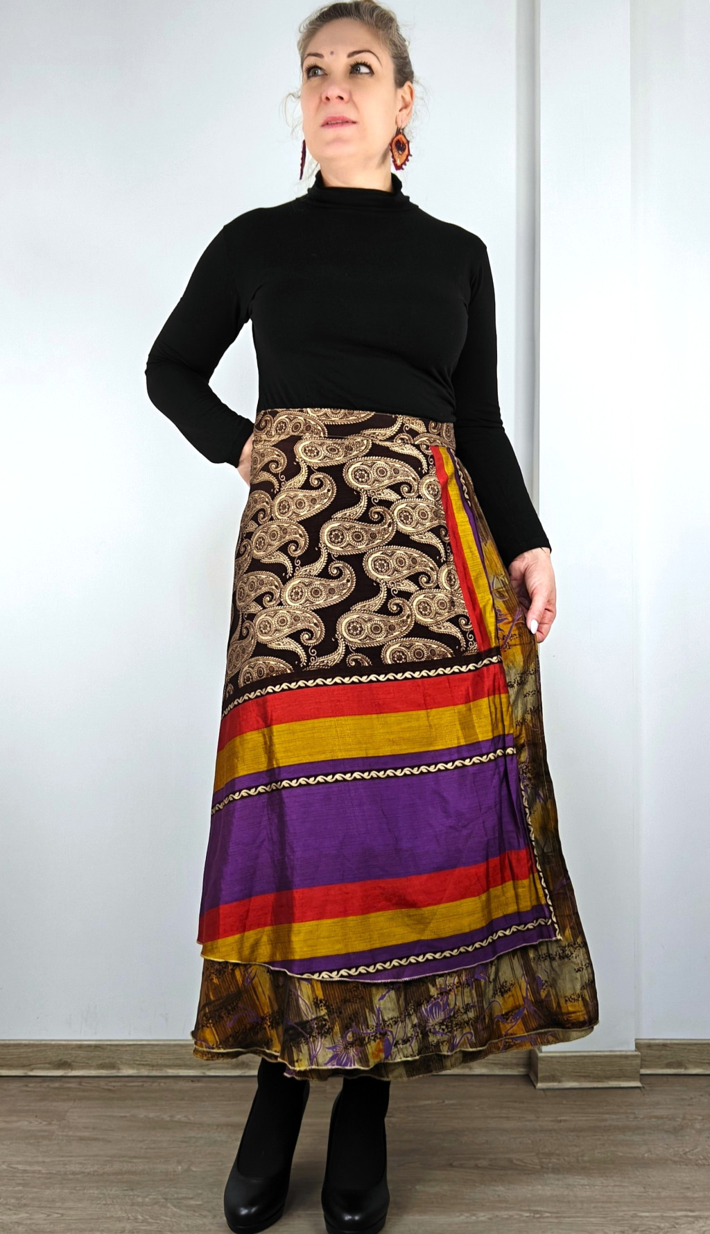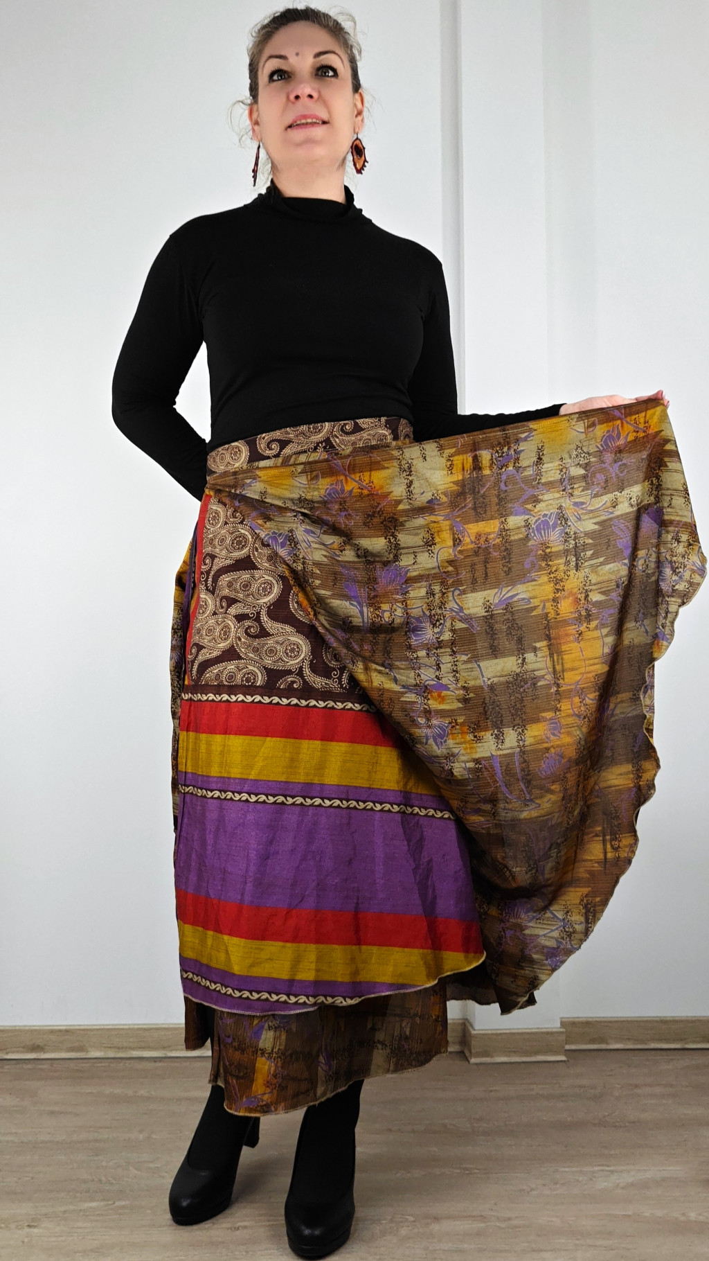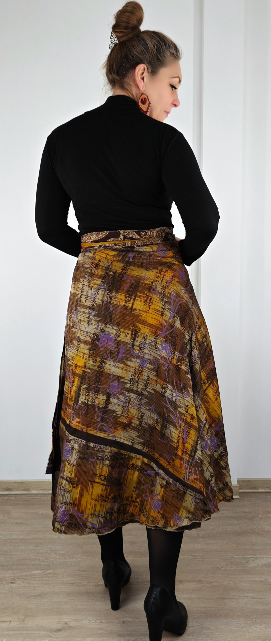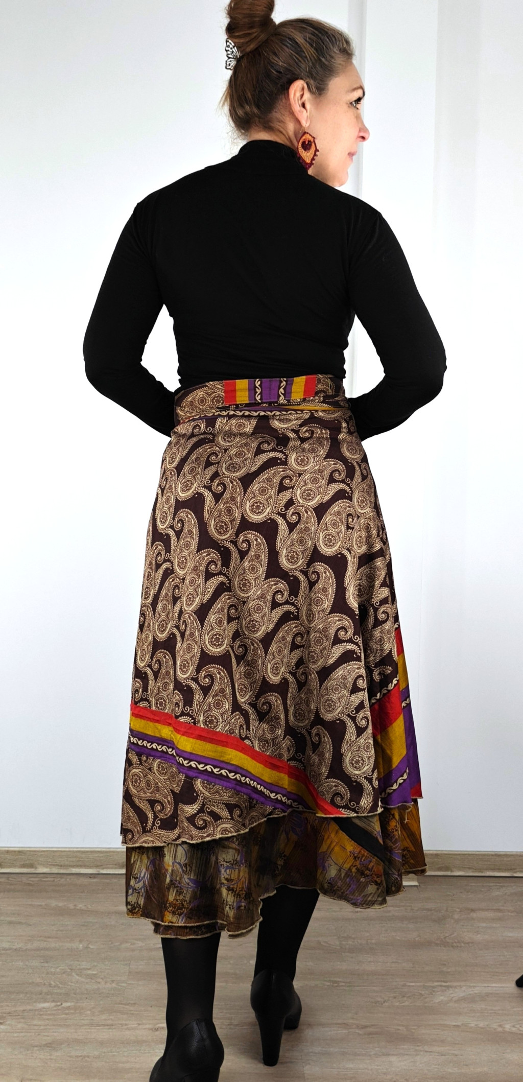 Lapszoknyáink újrahasznosított szárikból készülnek Indiában, egy hosszabb és egy rövidebb anyag derékban összevarrva! Két oldalú, kifordítható, mindkét oldala hordható, sokféleképpen köthető, variálható. Szoknyáinkból nincs két egyforma, mindegyikből csak EGY darab van, ha megtetszik, csapj le rá!