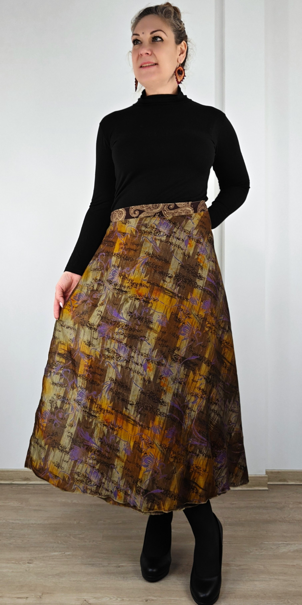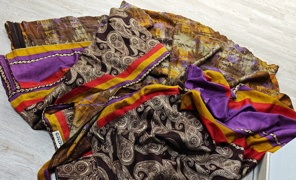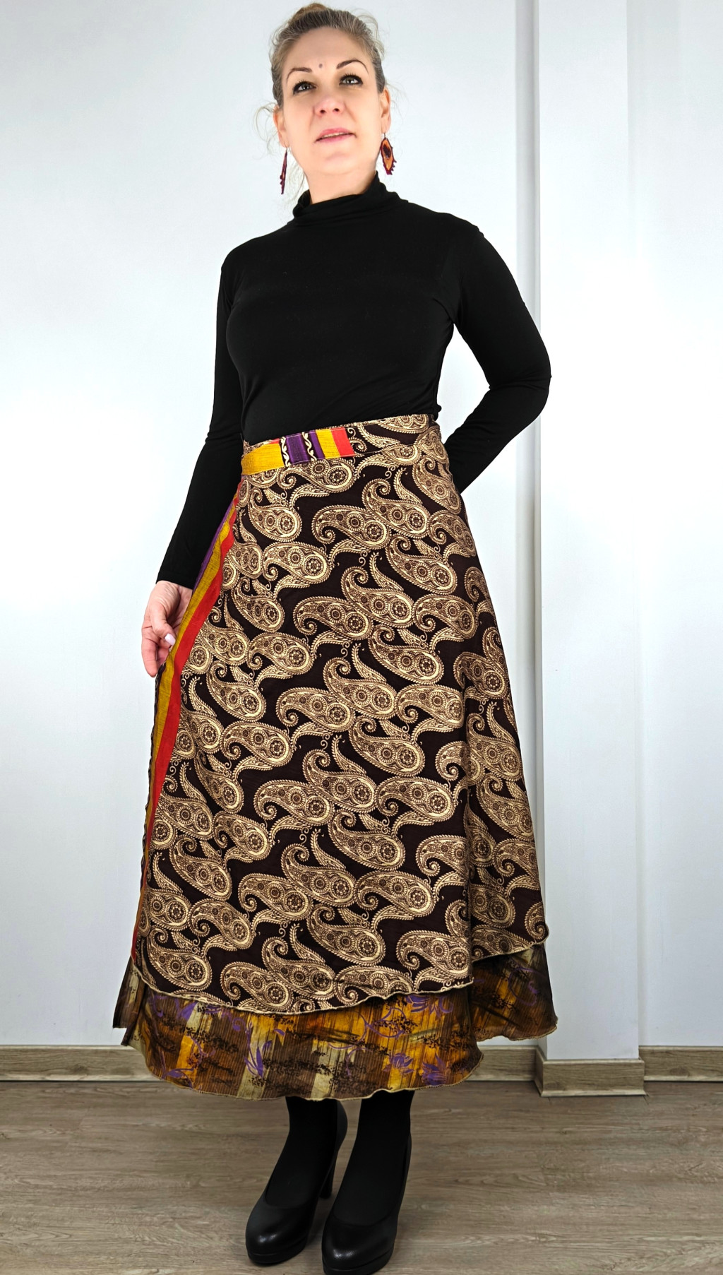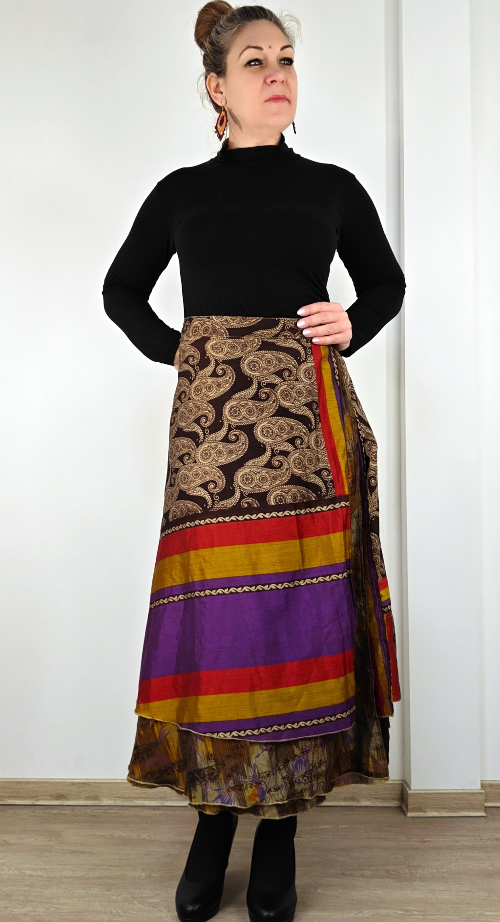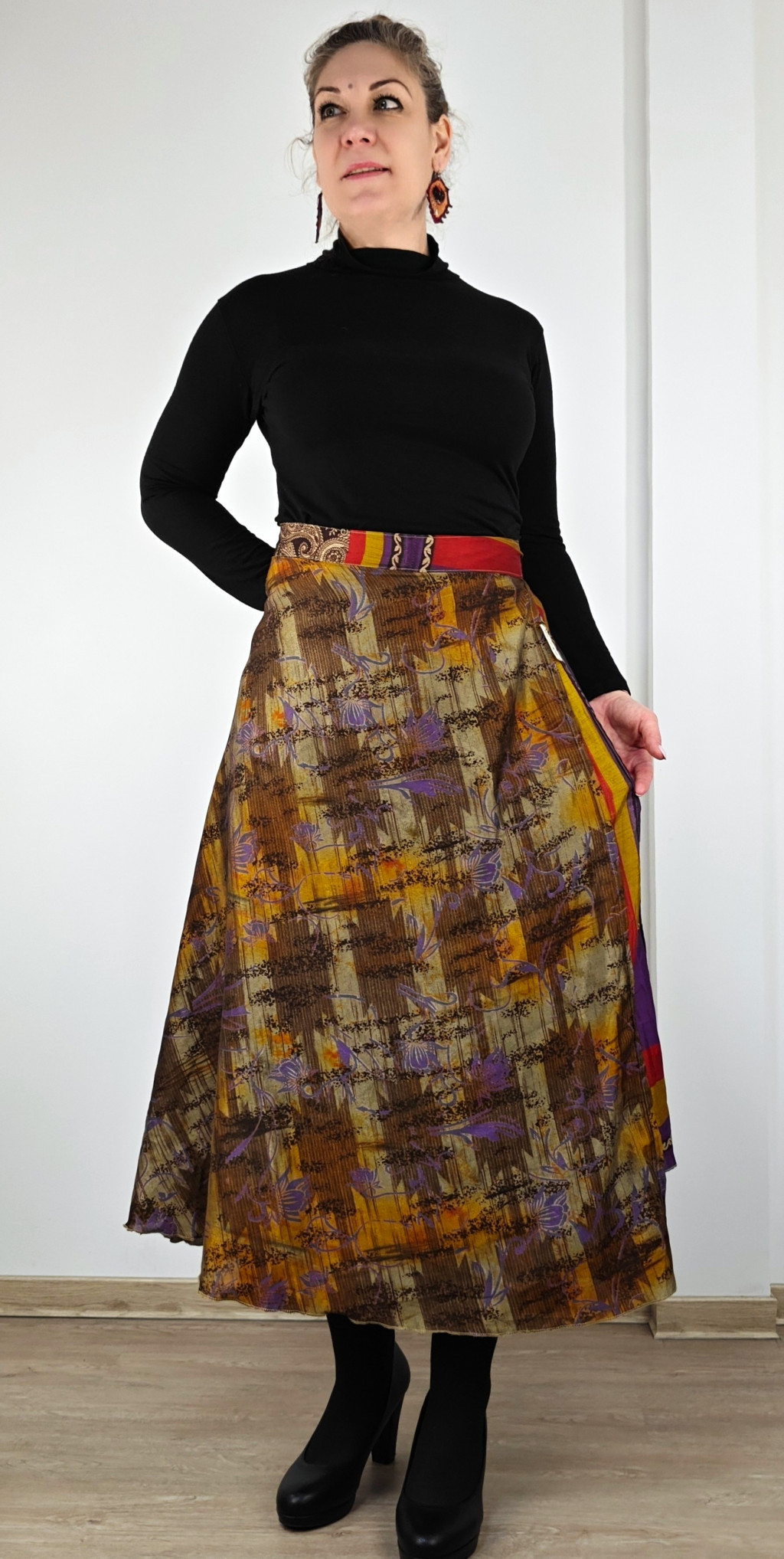 Lapszoknyáink újrahasznosított szárikból készülnek Indiában, egy hosszabb és egy rövidebb anyag derékban összevarrva! Két oldalú, kifordítható, mindkét oldala hordható, sokféleképpen köthető, variálható. Szoknyáinkból nincs két egyforma, mindegyikből csak EGY darab van, ha megtetszik, csapj le rá!