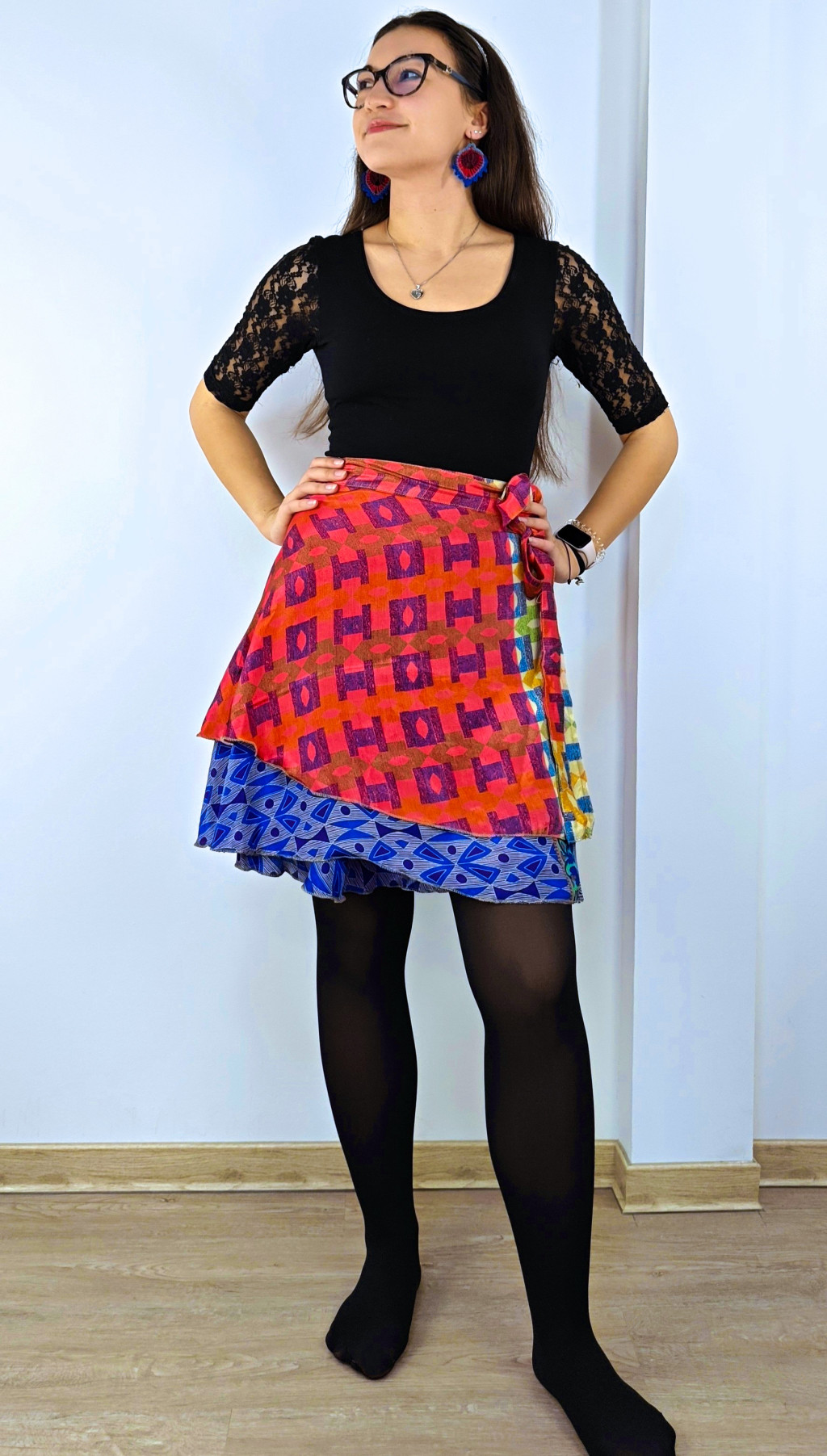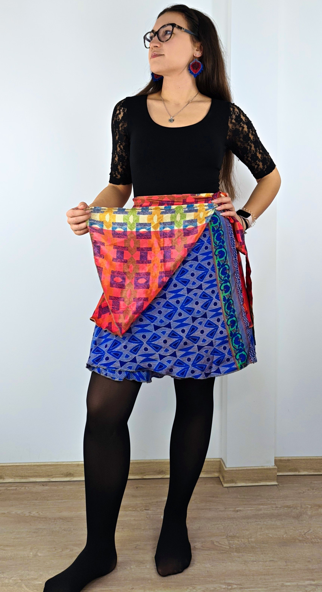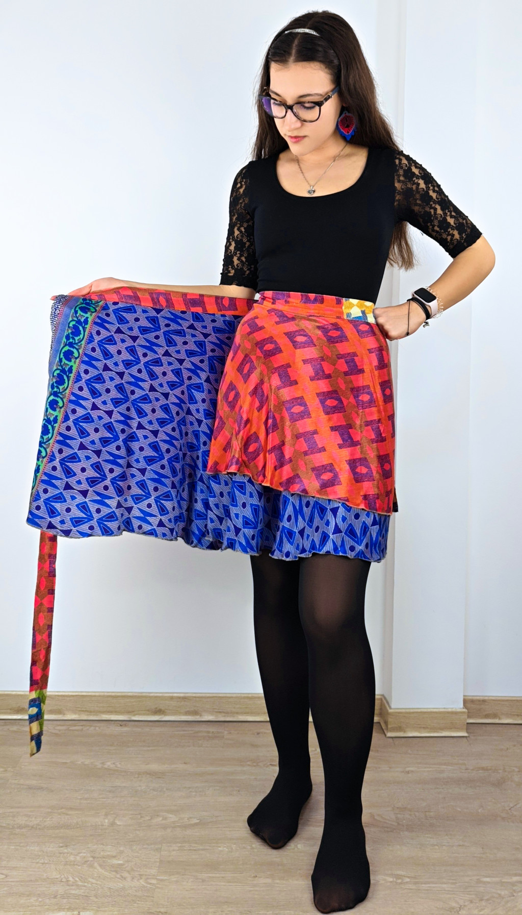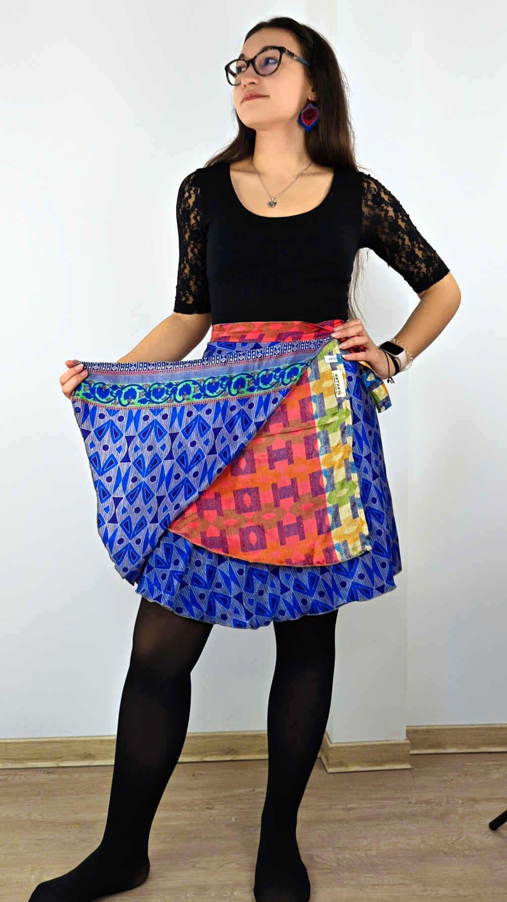 Lapszoknyáink újrahasznosított szárikból készülnek Indiában, egy hosszabb és egy rövidebb anyag derékban összevarrva! Két oldalú, kifordítható, mindkét oldala hordható, sokféleképpen köthető, variálható. Szoknyáinkból nincs két egyforma, mindegyikből csak EGY darab van, ha megtetszik, csapj le rá!