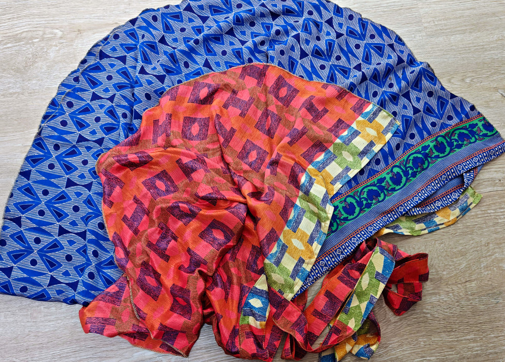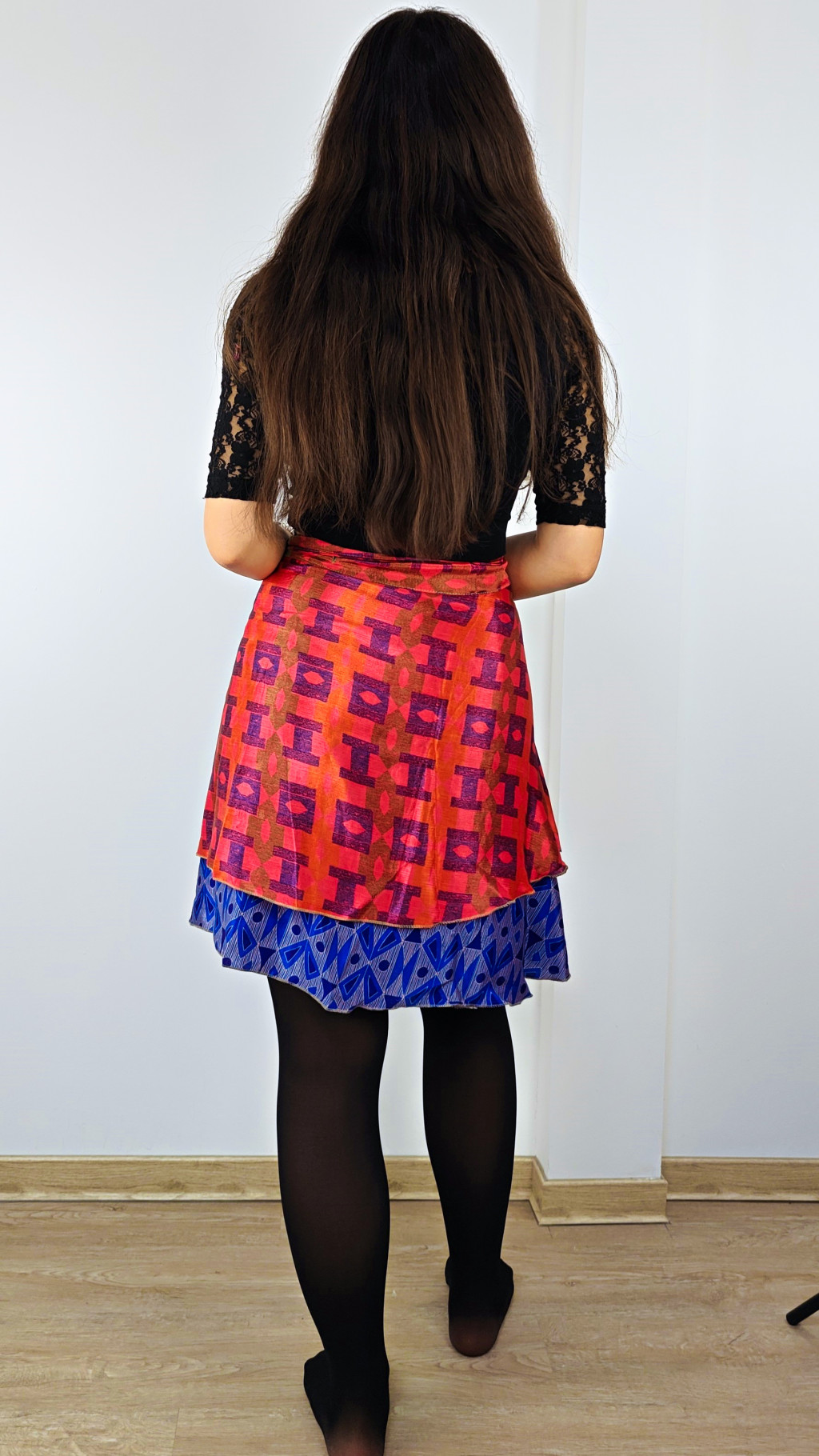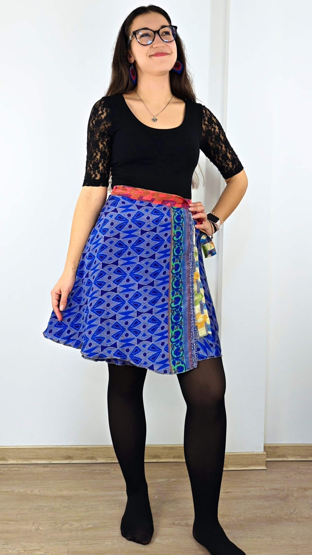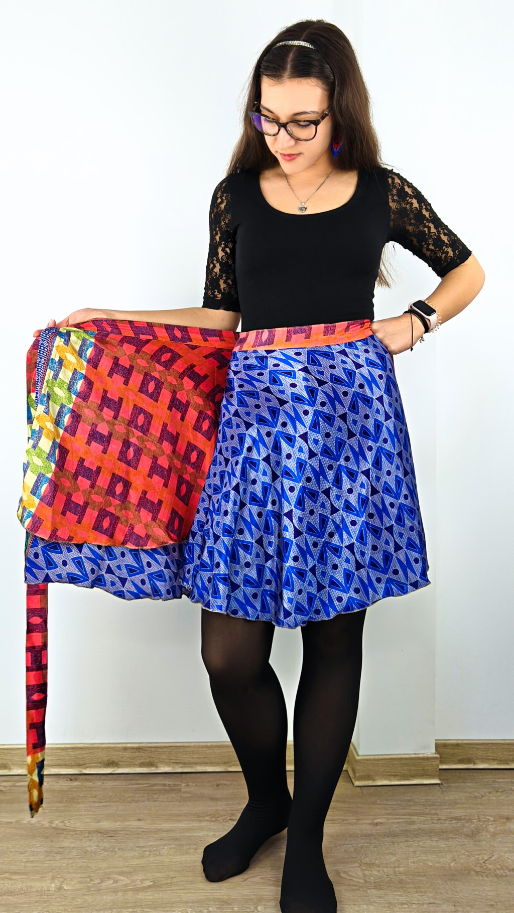 Lapszoknyáink újrahasznosított szárikból készülnek Indiában, egy hosszabb és egy rövidebb anyag derékban összevarrva! Két oldalú, kifordítható, mindkét oldala hordható, sokféleképpen köthető, variálható. Szoknyáinkból nincs két egyforma, mindegyikből csak EGY darab van, ha megtetszik, csapj le rá!
