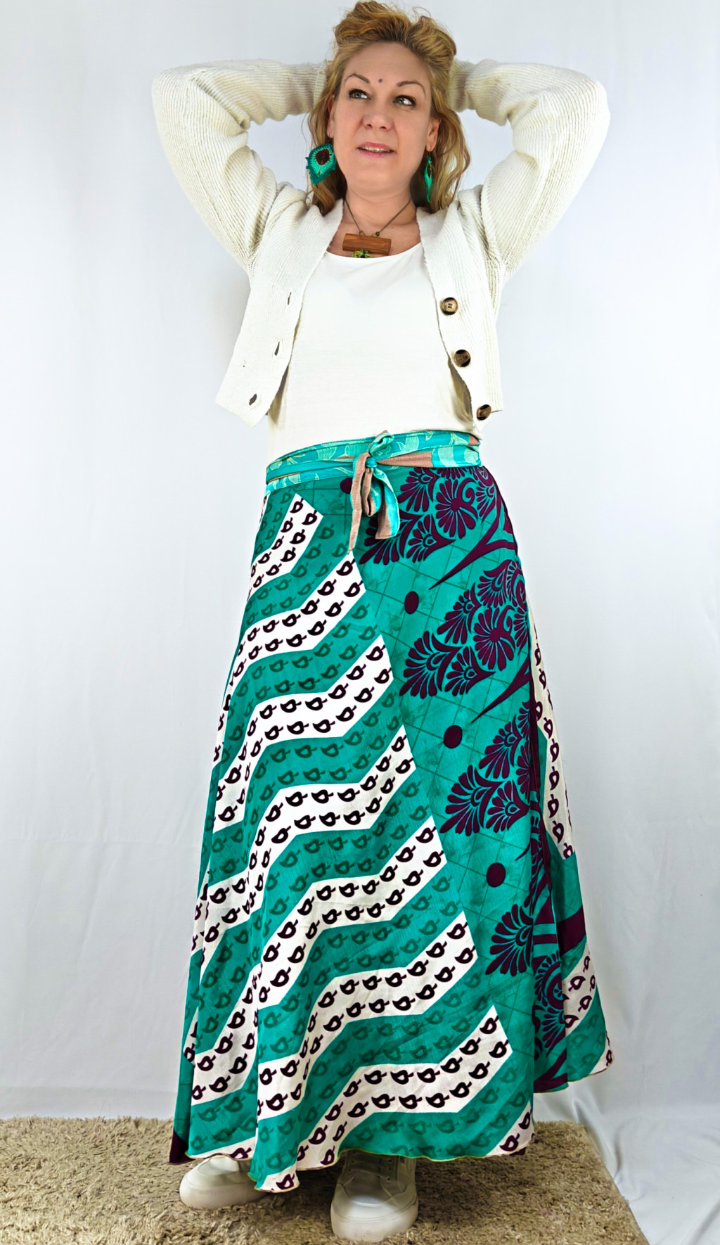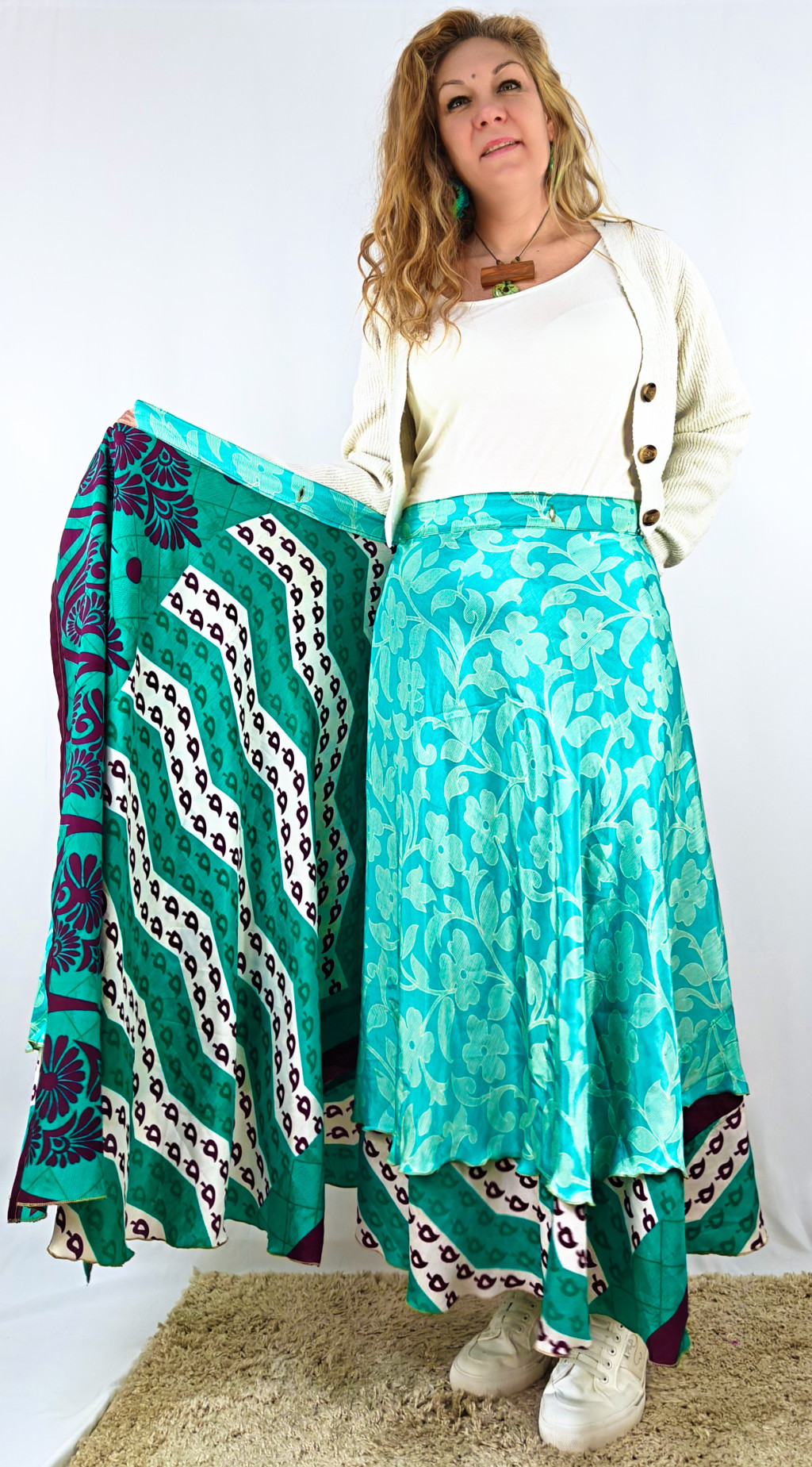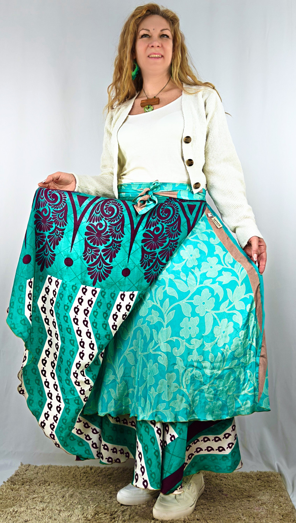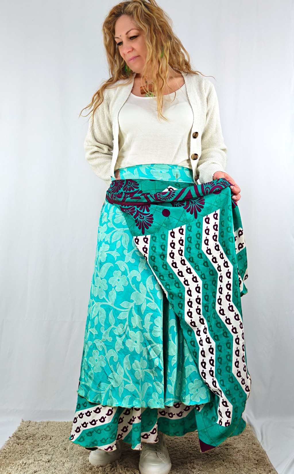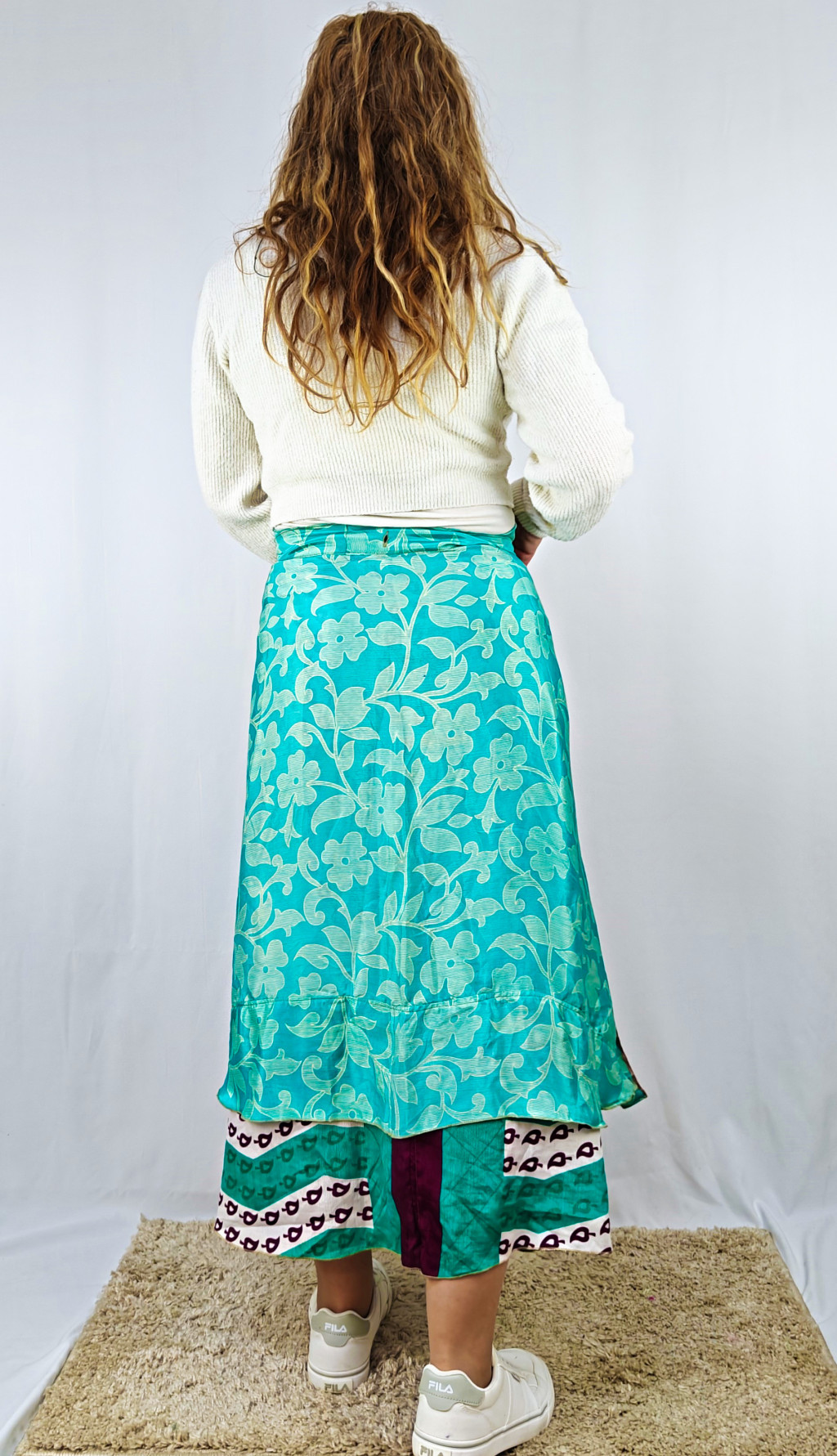 Lapszoknyáink újrahasznosított szárikból készülnek Indiában, egy hosszabb és egy rövidebb anyag derékban összevarrva! Két oldalú, kifordítható, mindkét oldala hordható, sokféleképpen köthető, variálható. Szoknyáinkból nincs két egyforma, mindegyikből csak EGY darab van, ha megtetszik, csapj le rá!