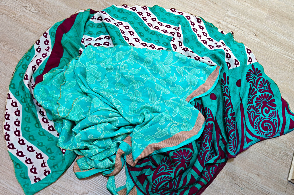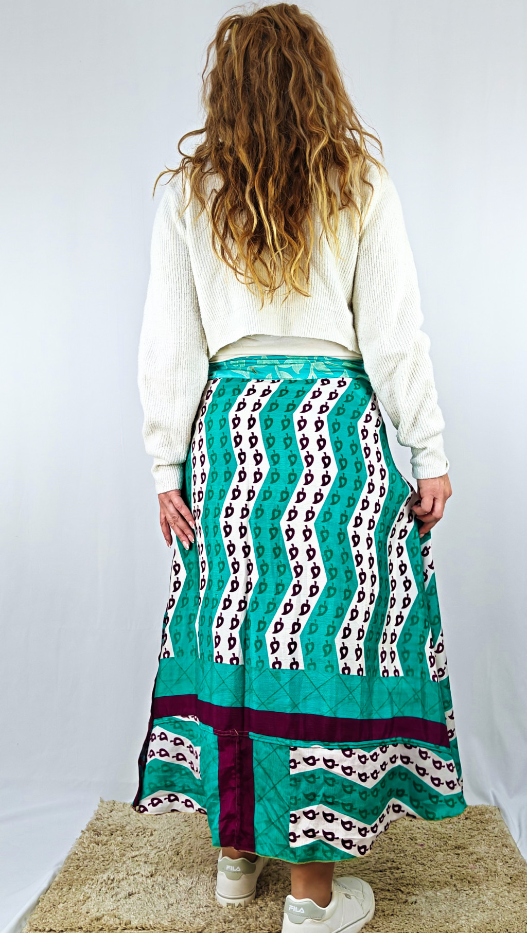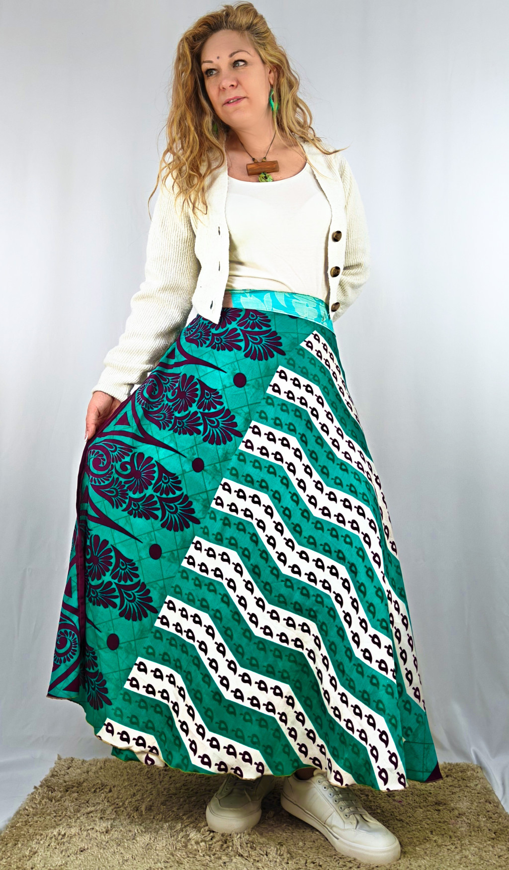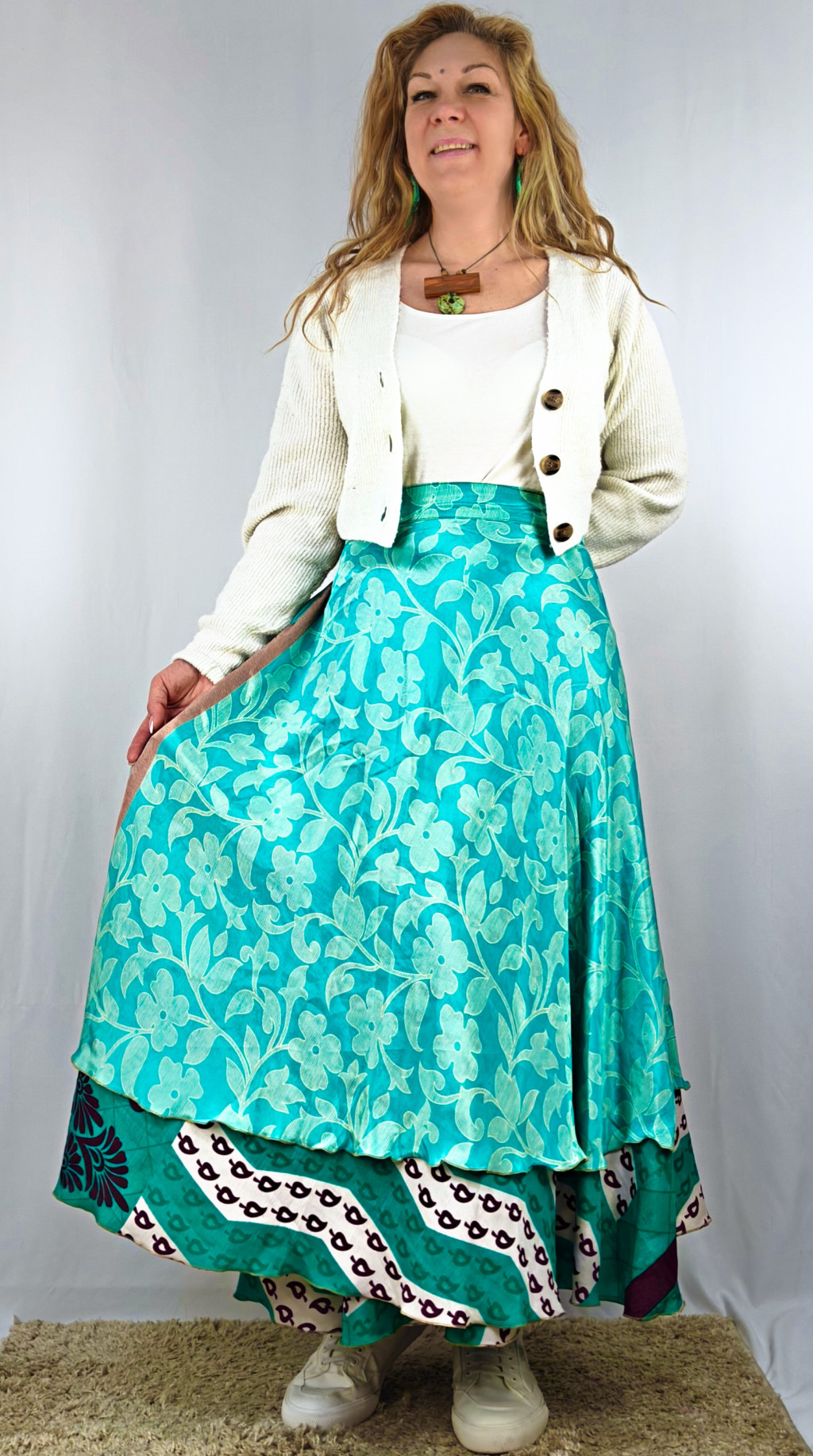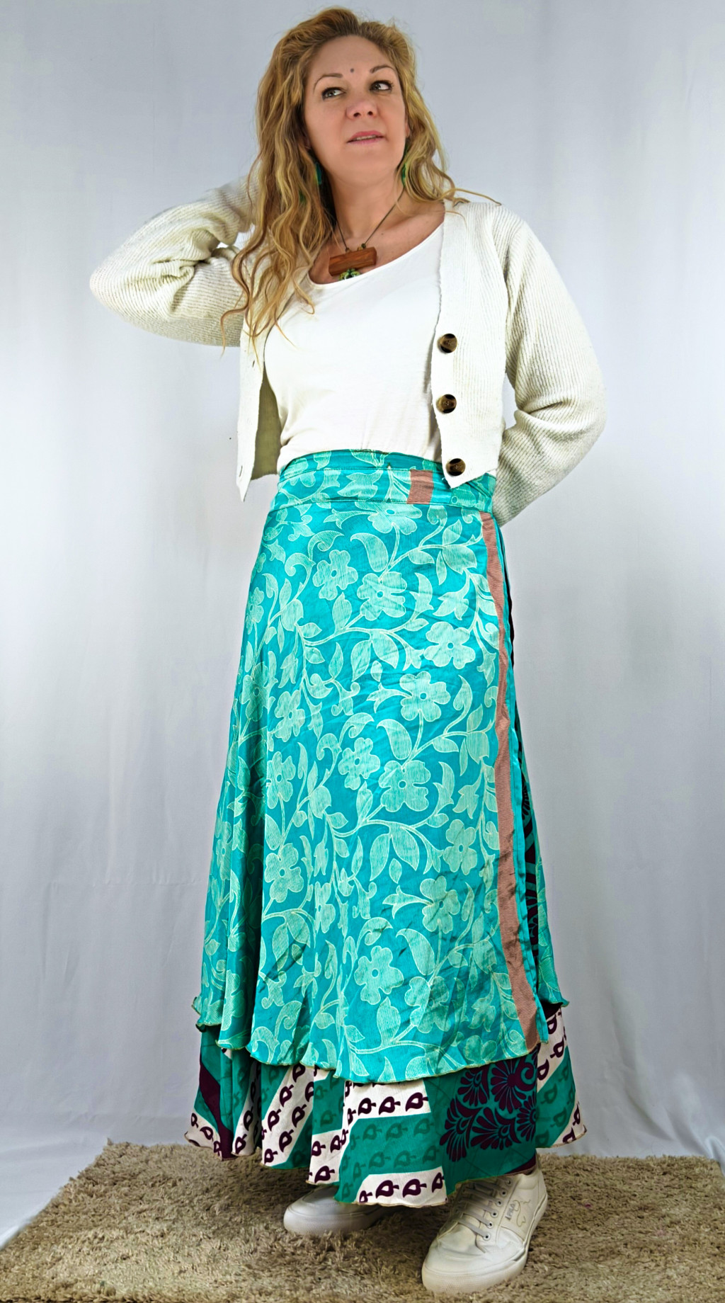 Lapszoknyáink újrahasznosított szárikból készülnek Indiában, egy hosszabb és egy rövidebb anyag derékban összevarrva! Két oldalú, kifordítható, mindkét oldala hordható, sokféleképpen köthető, variálható. Szoknyáinkból nincs két egyforma, mindegyikből csak EGY darab van, ha megtetszik, csapj le rá!