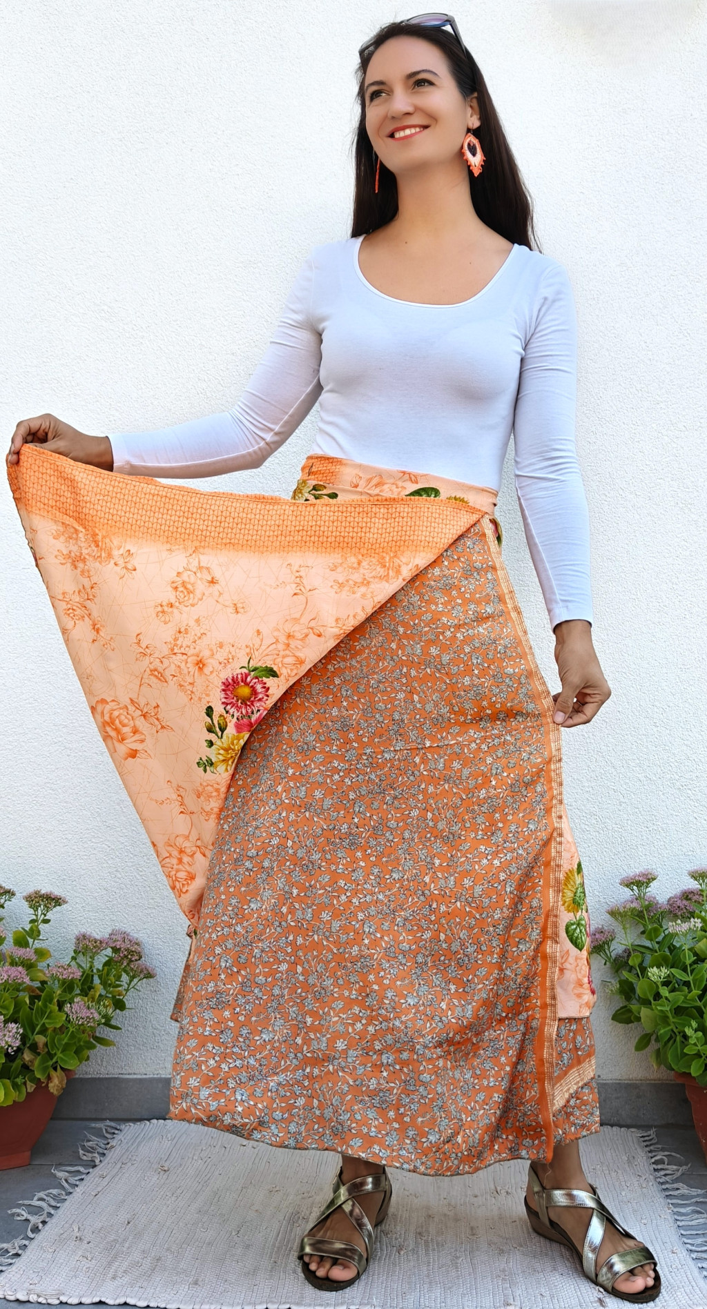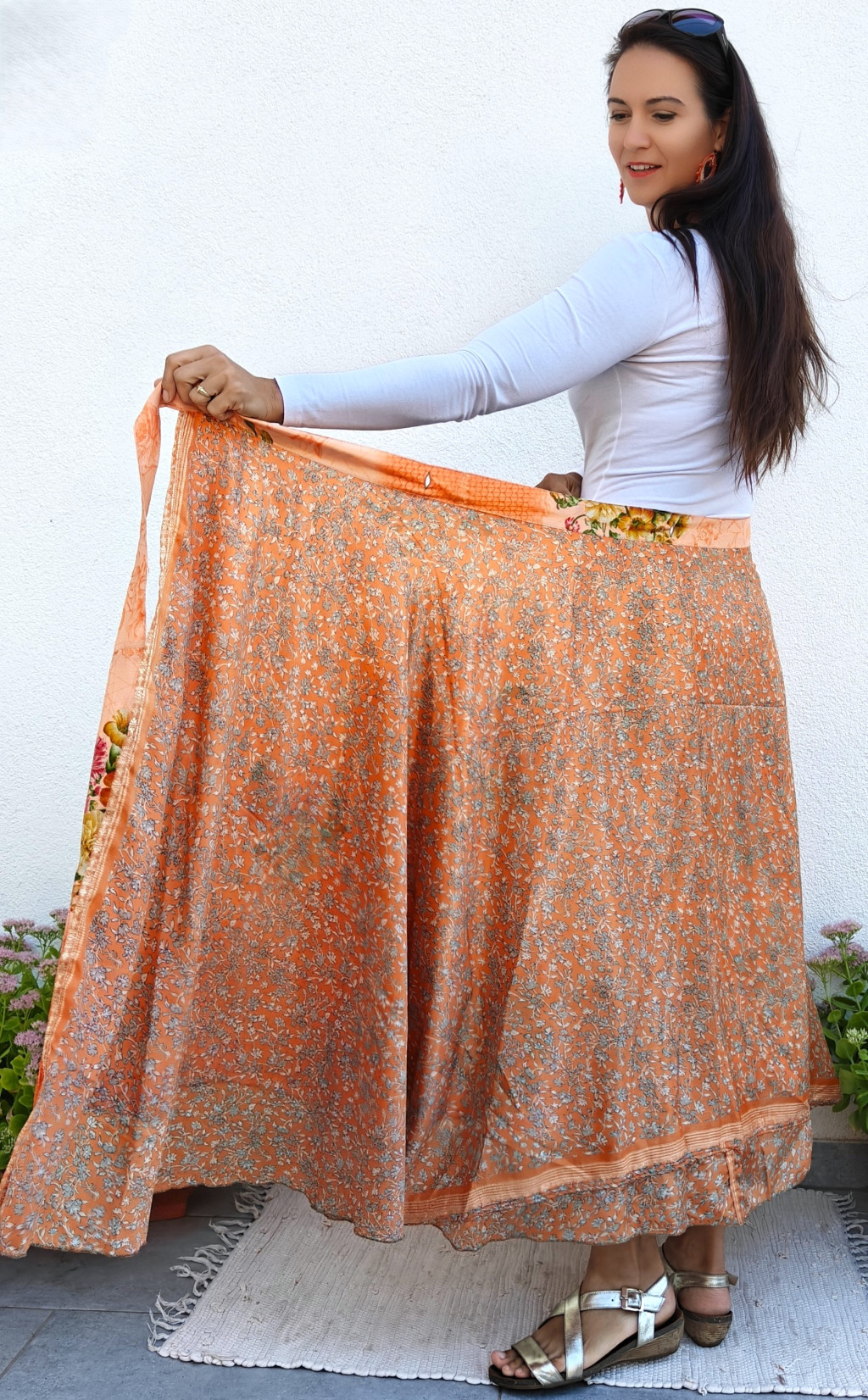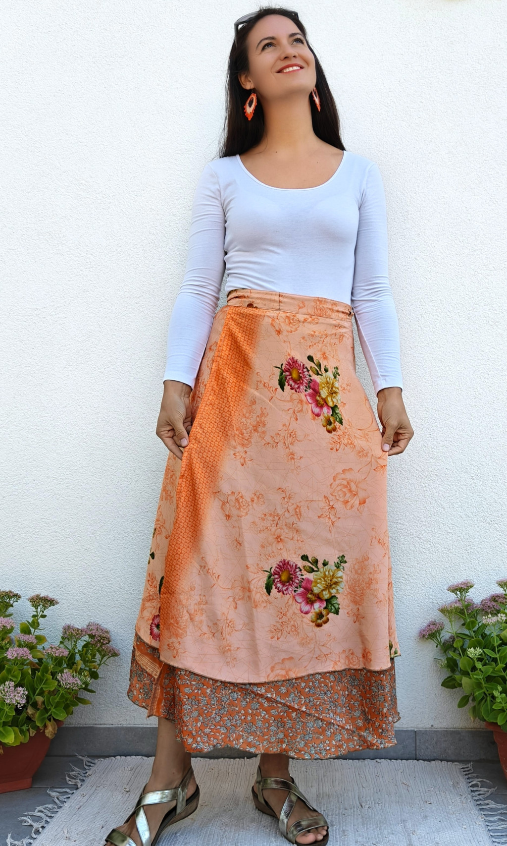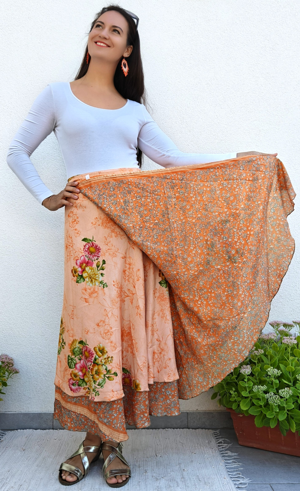 Lapszoknyáink újrahasznosított szárikból készülnek Indiában, egy hosszabb és egy rövidebb anyag derékban összevarrva! Két oldalú, kifordítható, mindkét oldala hordható, sokféleképpen köthető, variálható. Szoknyáinkból nincs két egyforma, mindegyikből csak EGY darab van, ha megtetszik, csapj le rá!
