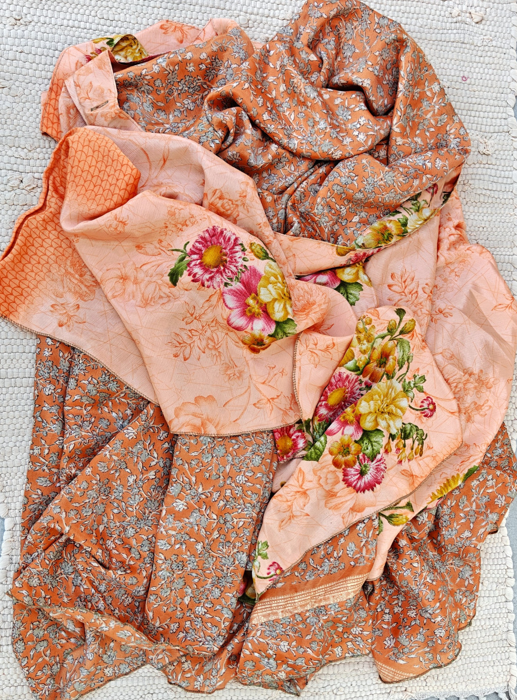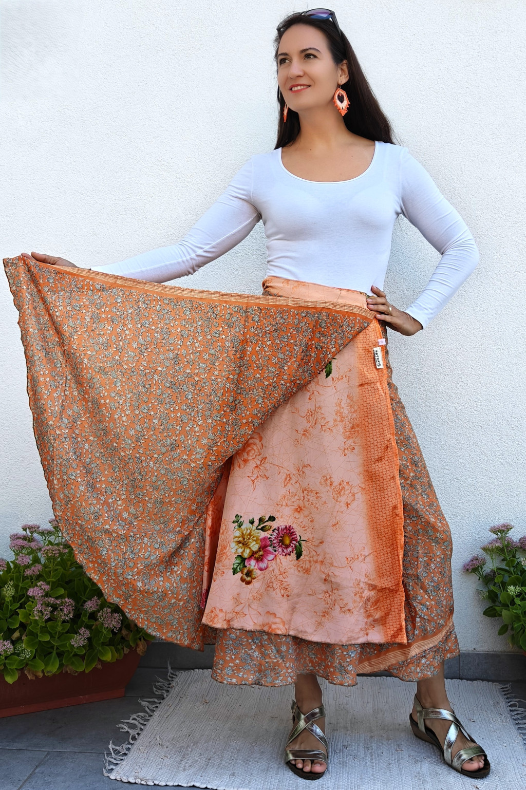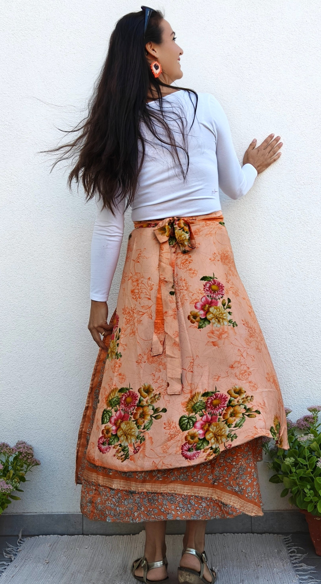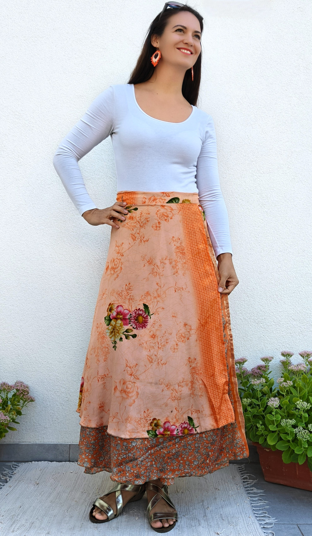 Lapszoknyáink újrahasznosított szárikból készülnek Indiában, egy hosszabb és egy rövidebb anyag derékban összevarrva! Két oldalú, kifordítható, mindkét oldala hordható, sokféleképpen köthető, variálható. Szoknyáinkból nincs két egyforma, mindegyikből csak EGY darab van, ha megtetszik, csapj le rá!