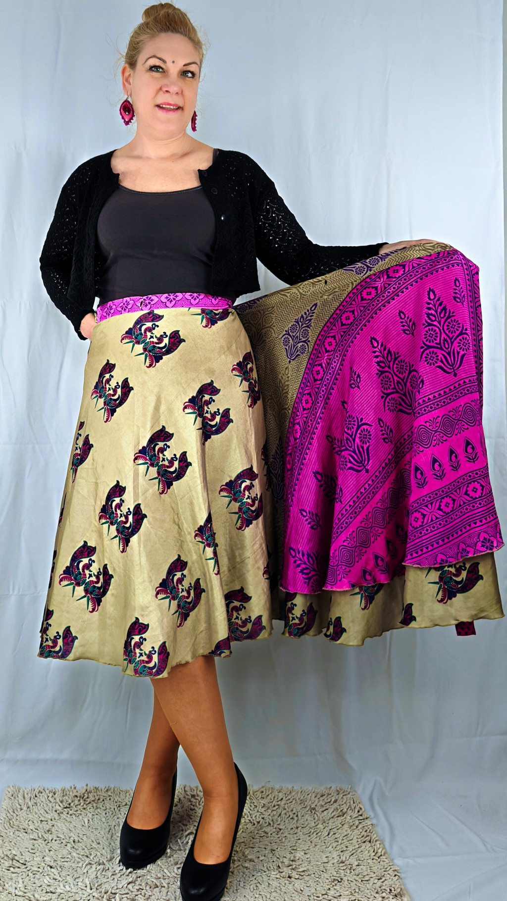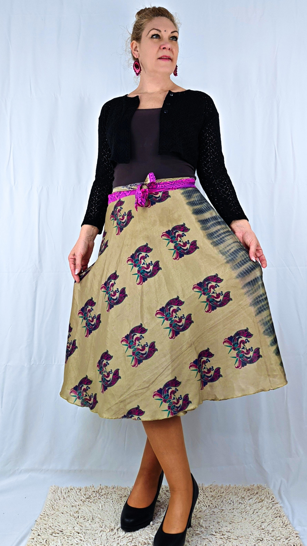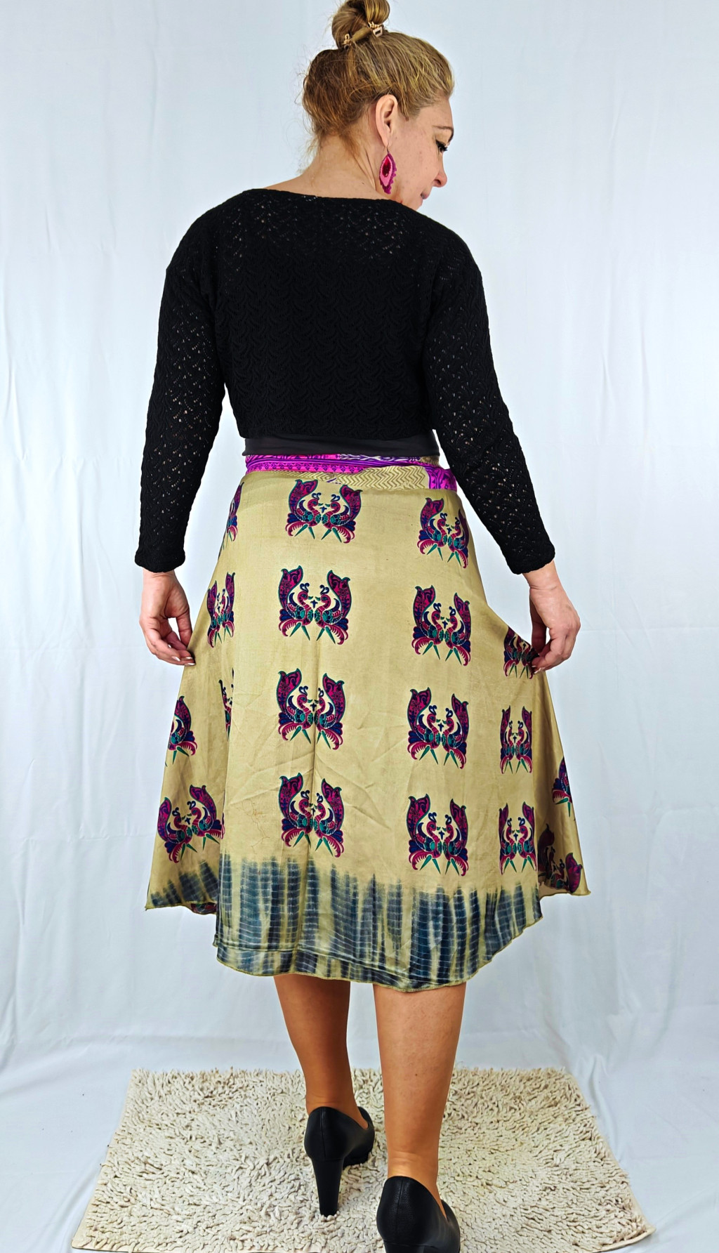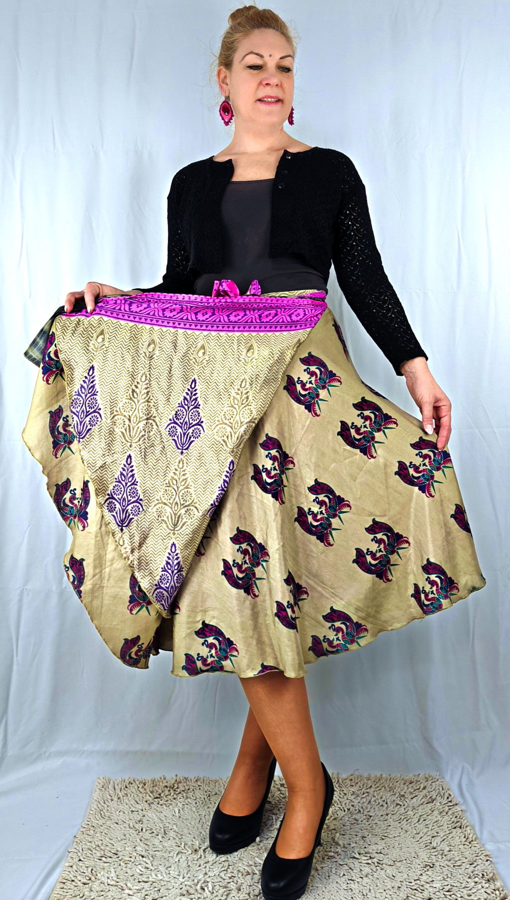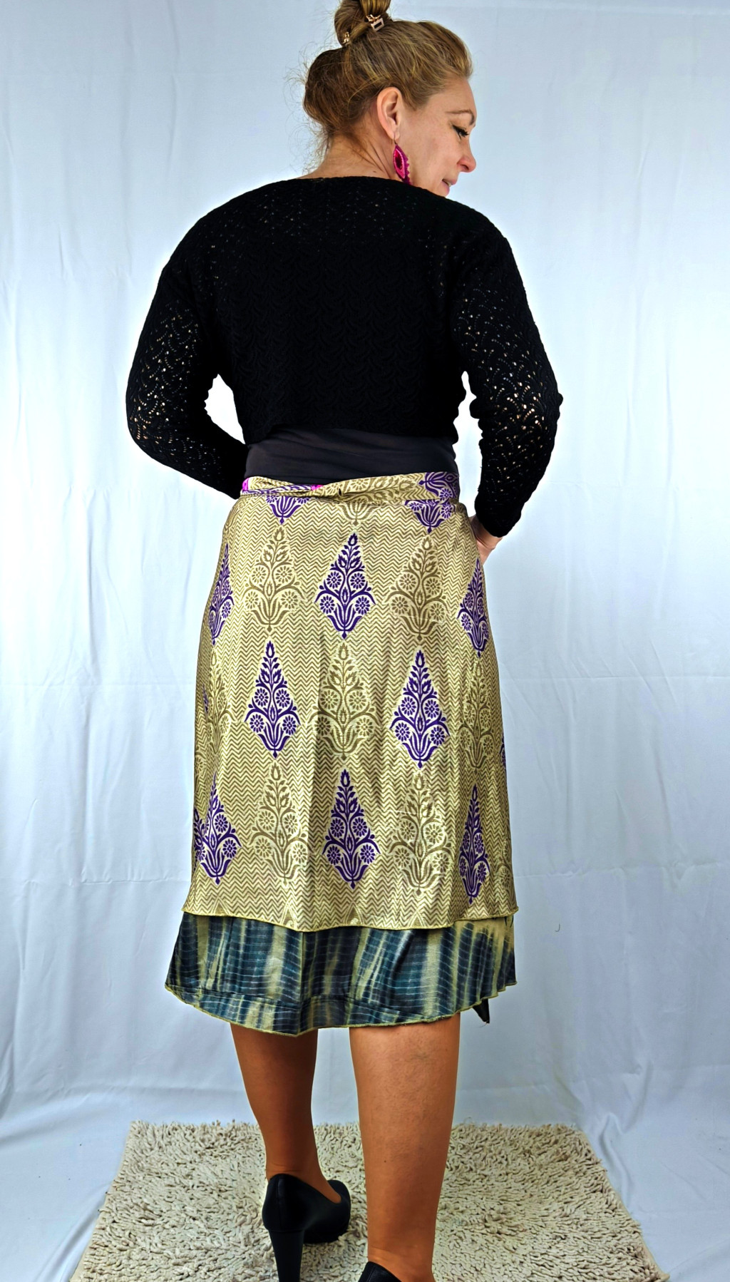 Lapszoknyáink újrahasznosított szárikból készülnek Indiában, egy hosszabb és egy rövidebb anyag derékban összevarrva! Két oldalú, kifordítható, mindkét oldala hordható, sokféleképpen köthető, variálható. Szoknyáinkból nincs két egyforma, mindegyikből csak EGY darab van, ha megtetszik, csapj le rá!