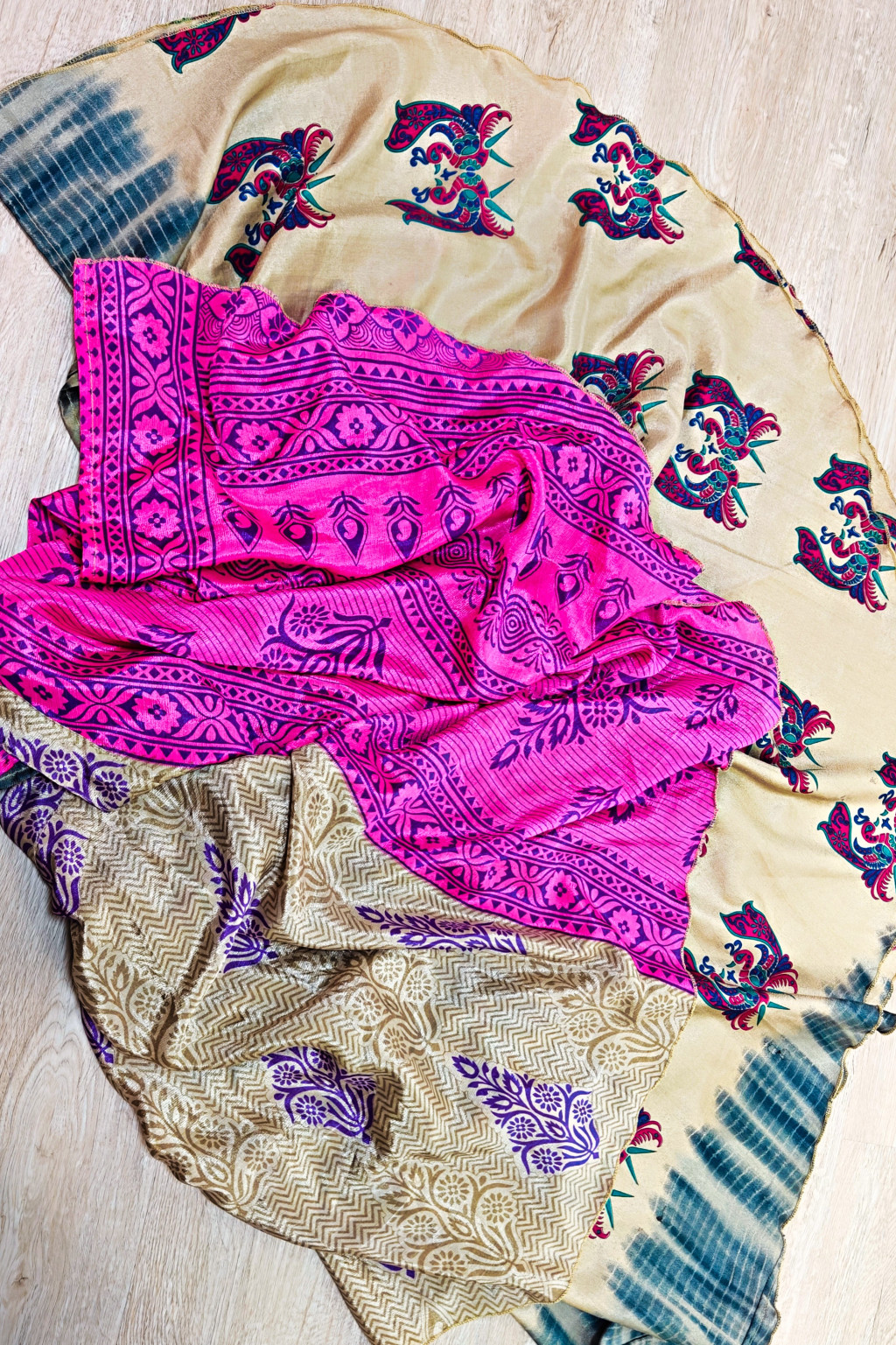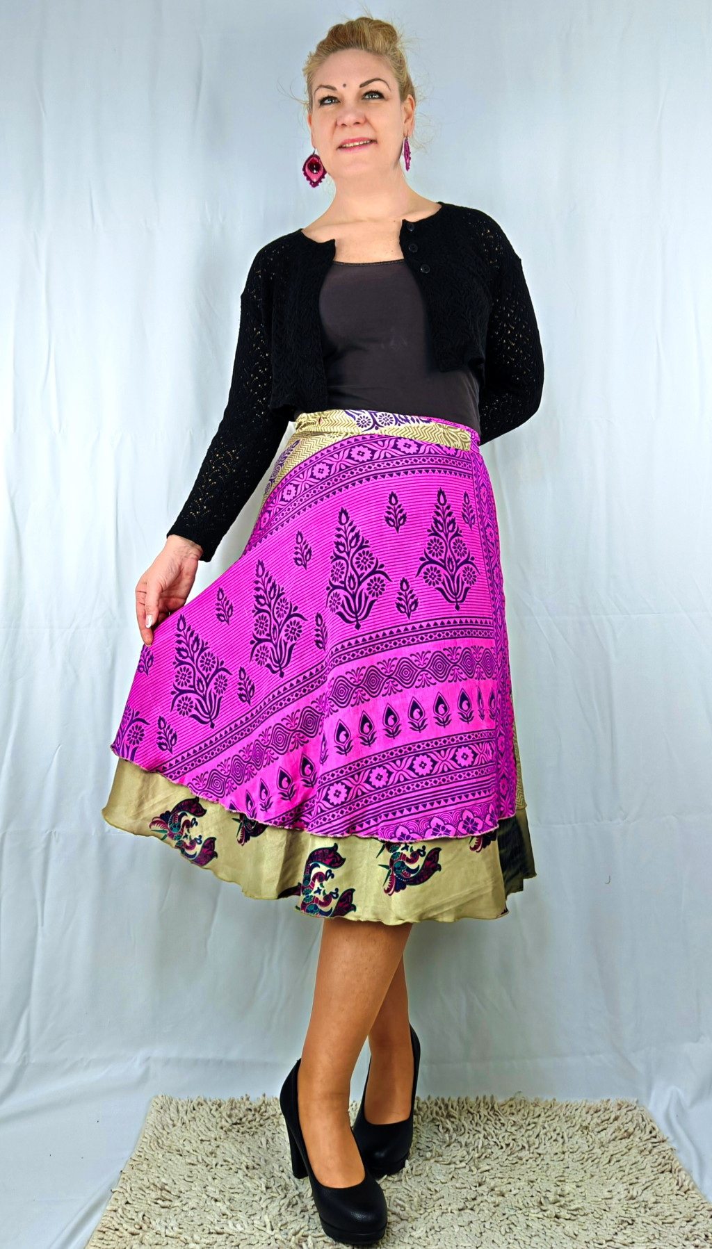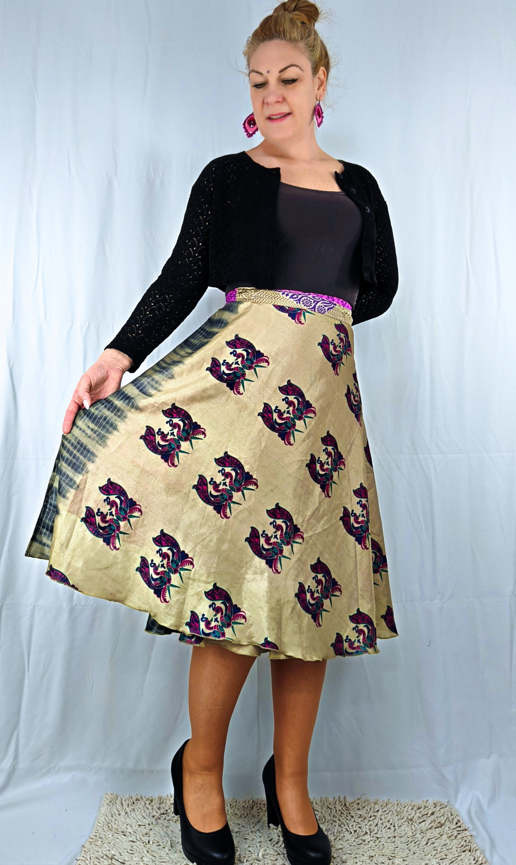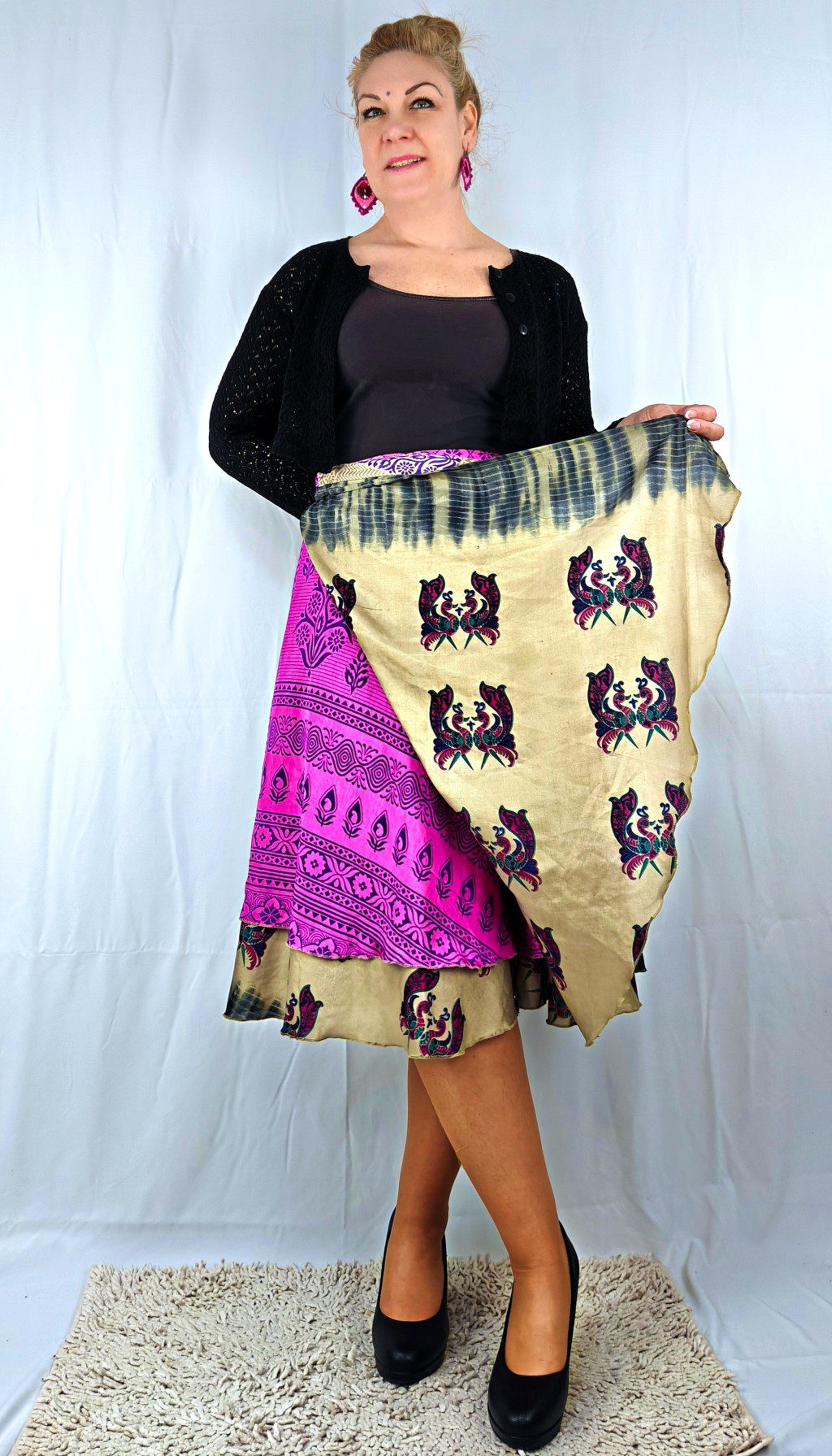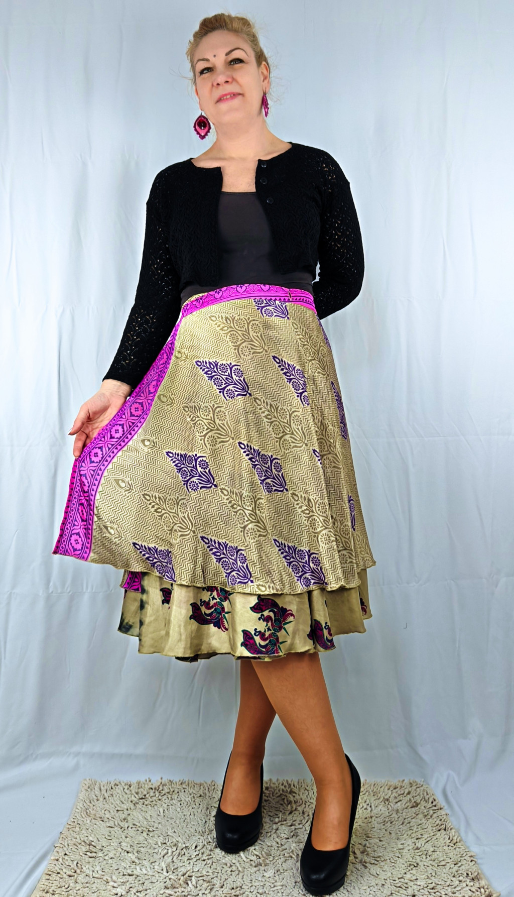 Lapszoknyáink újrahasznosított szárikból készülnek Indiában, egy hosszabb és egy rövidebb anyag derékban összevarrva! Két oldalú, kifordítható, mindkét oldala hordható, sokféleképpen köthető, variálható. Szoknyáinkból nincs két egyforma, mindegyikből csak EGY darab van, ha megtetszik, csapj le rá!